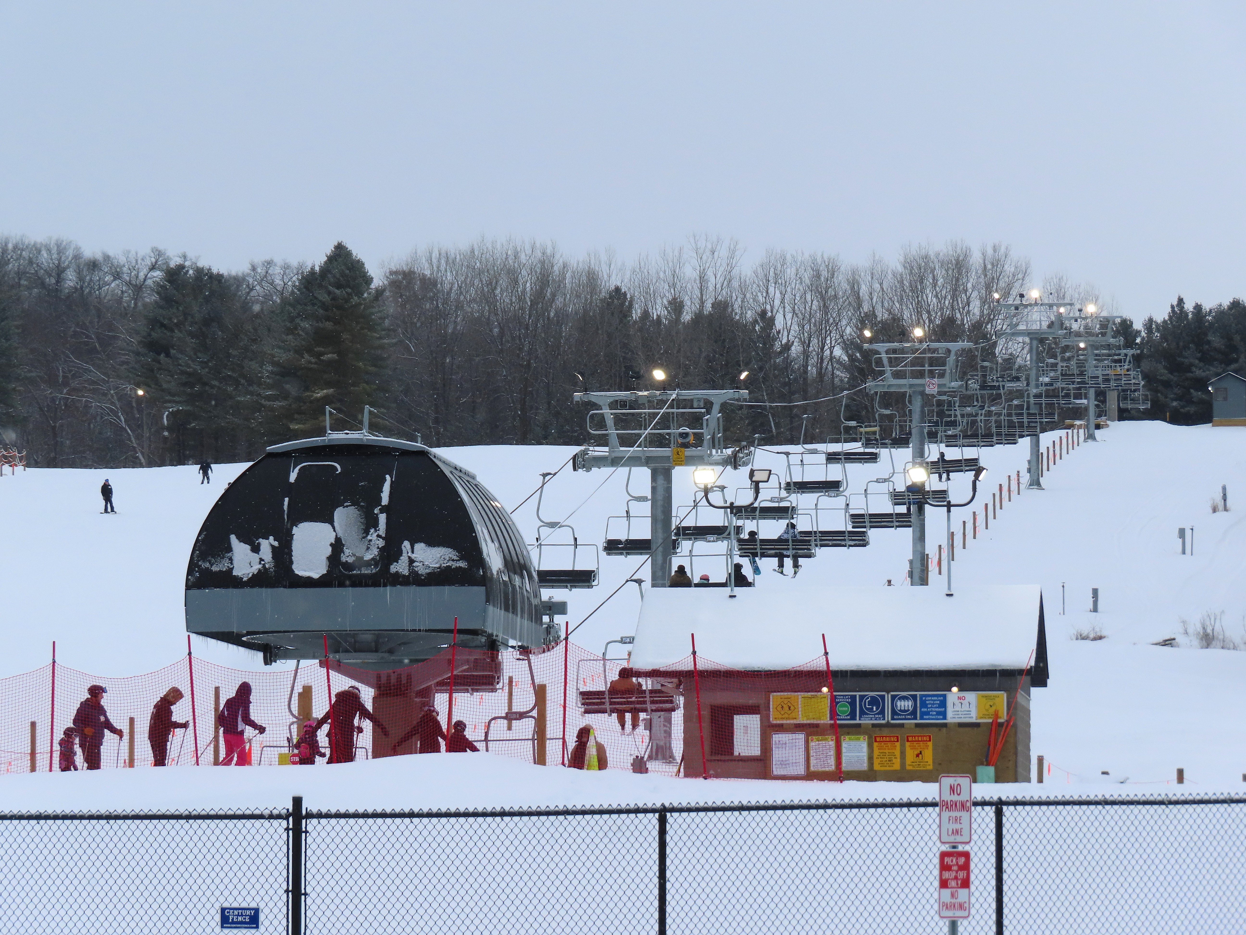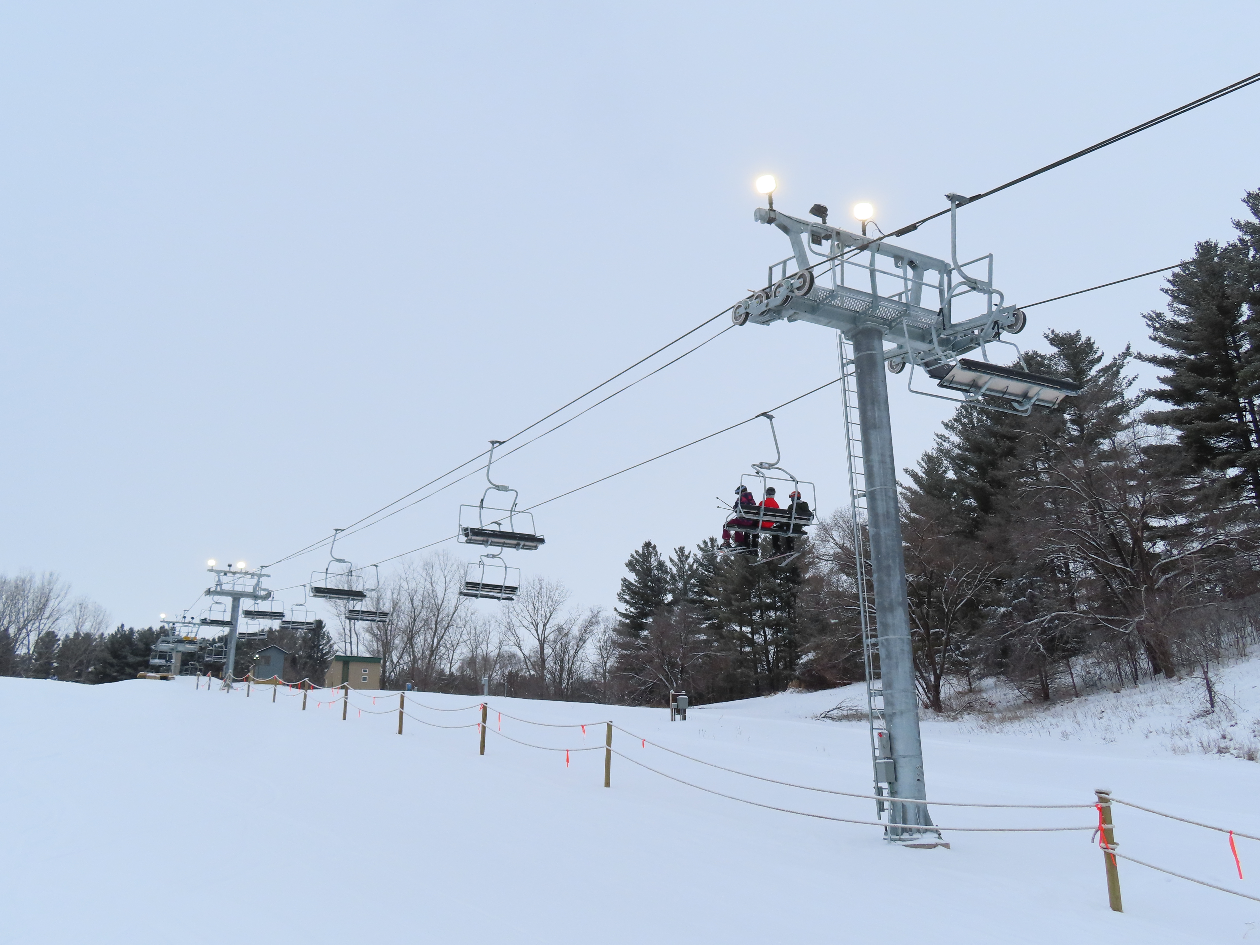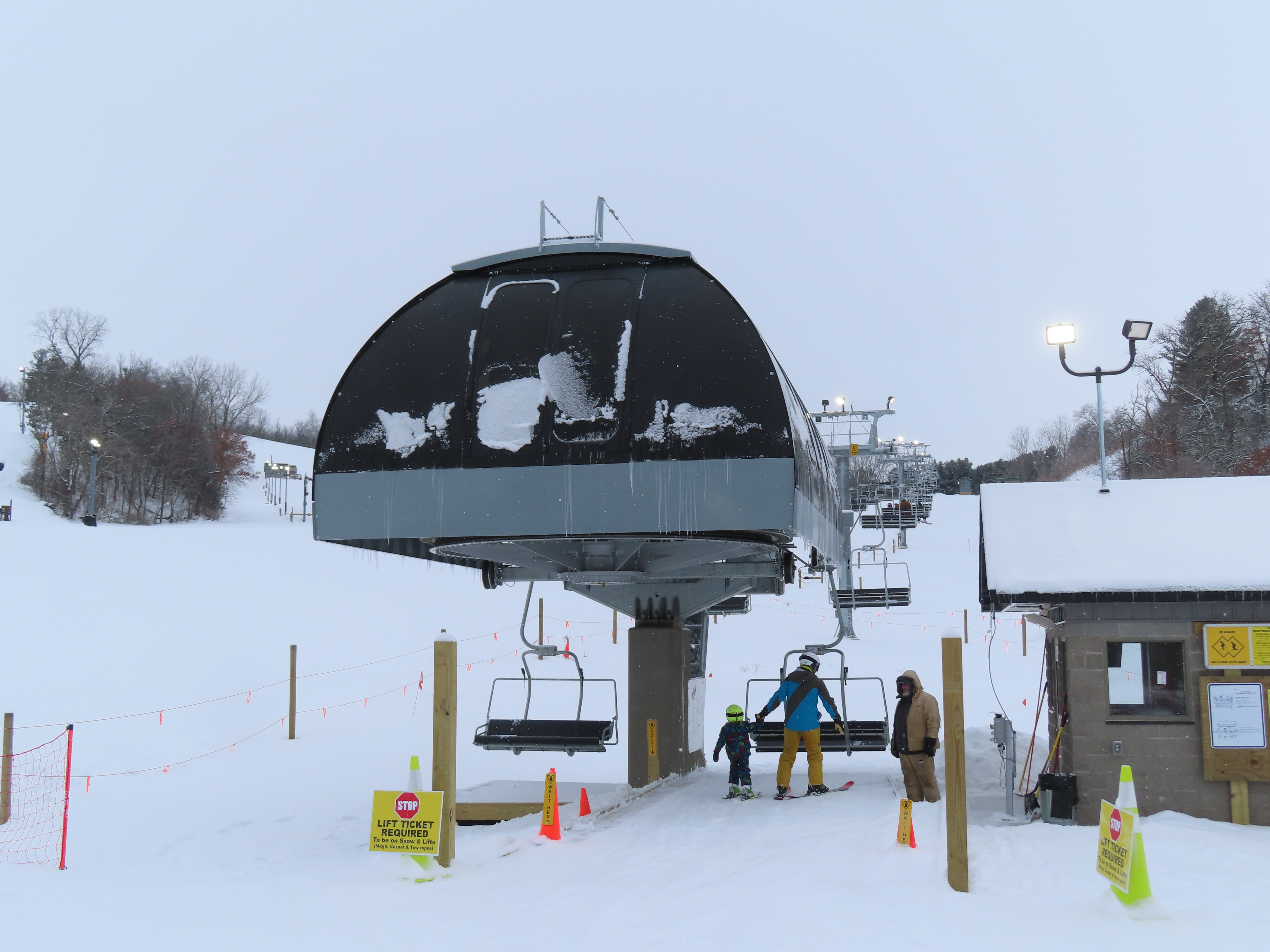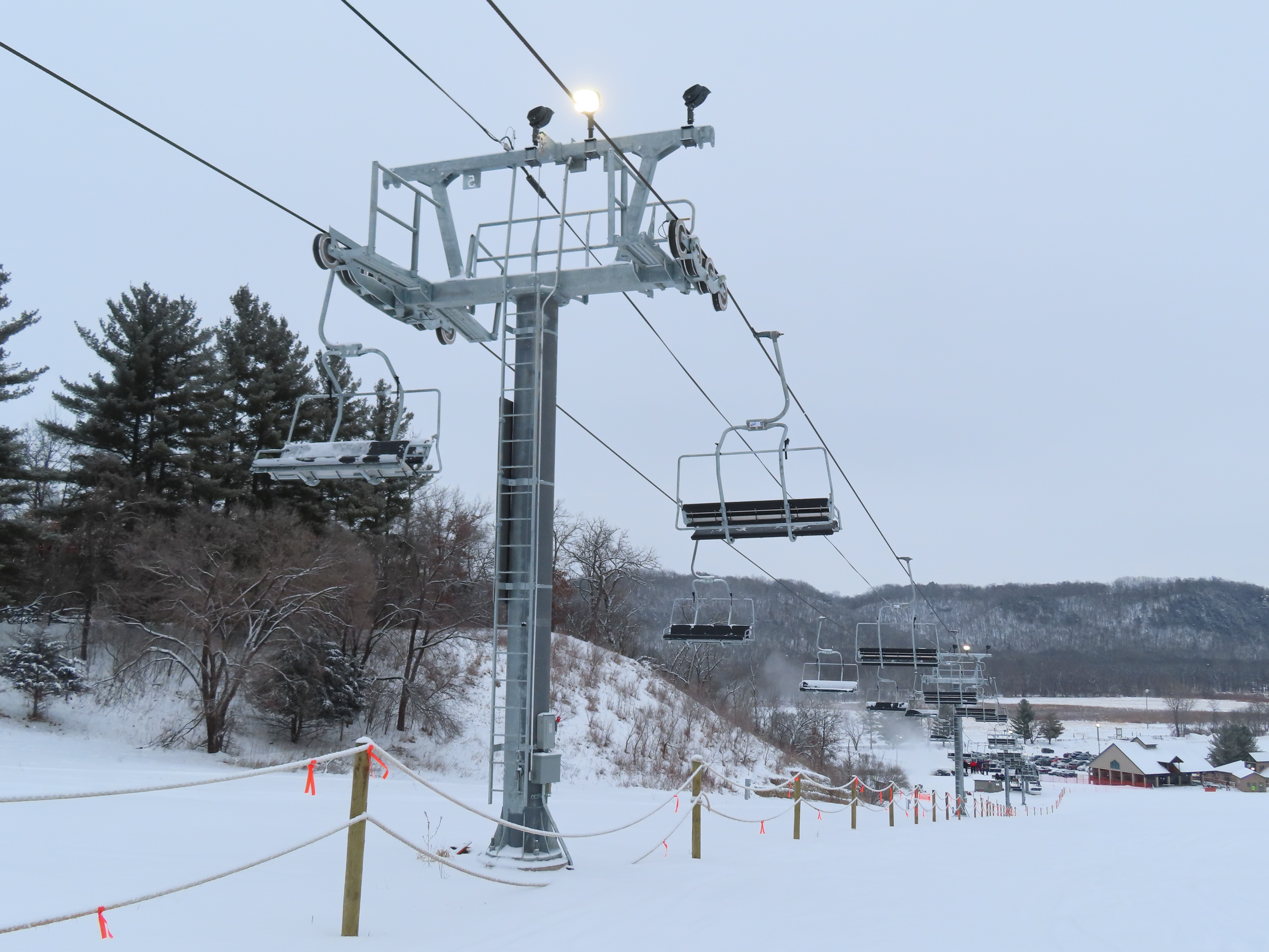 This lift anchors a new beginner area where a park and rope tow used to run.This is the first Skytrac for Welch, which also has Doppelmayr, Riblet and Doppelmayr CTEC fixed quads.View leaving the bottom terminal.Arriving at the top terminal location.Unload area with night lighting.Upper lift line overview.View down from tower 5.The top few towers with no ski under clearance.Lower lift line.Another view of the drive-tension station.Looking up the line from the magic carpet lift.Tower 2.Loading area.Side view of the Monarch station.