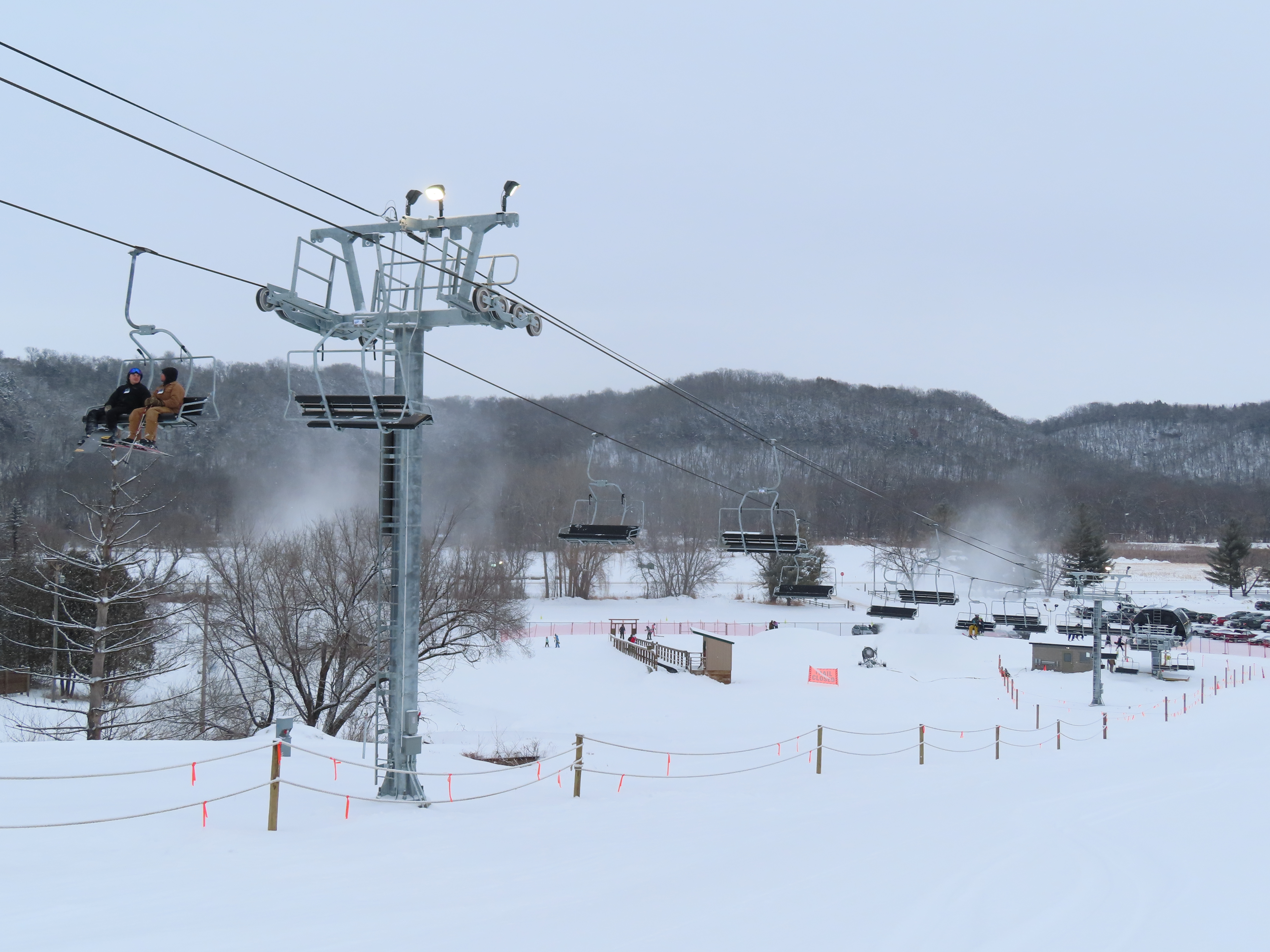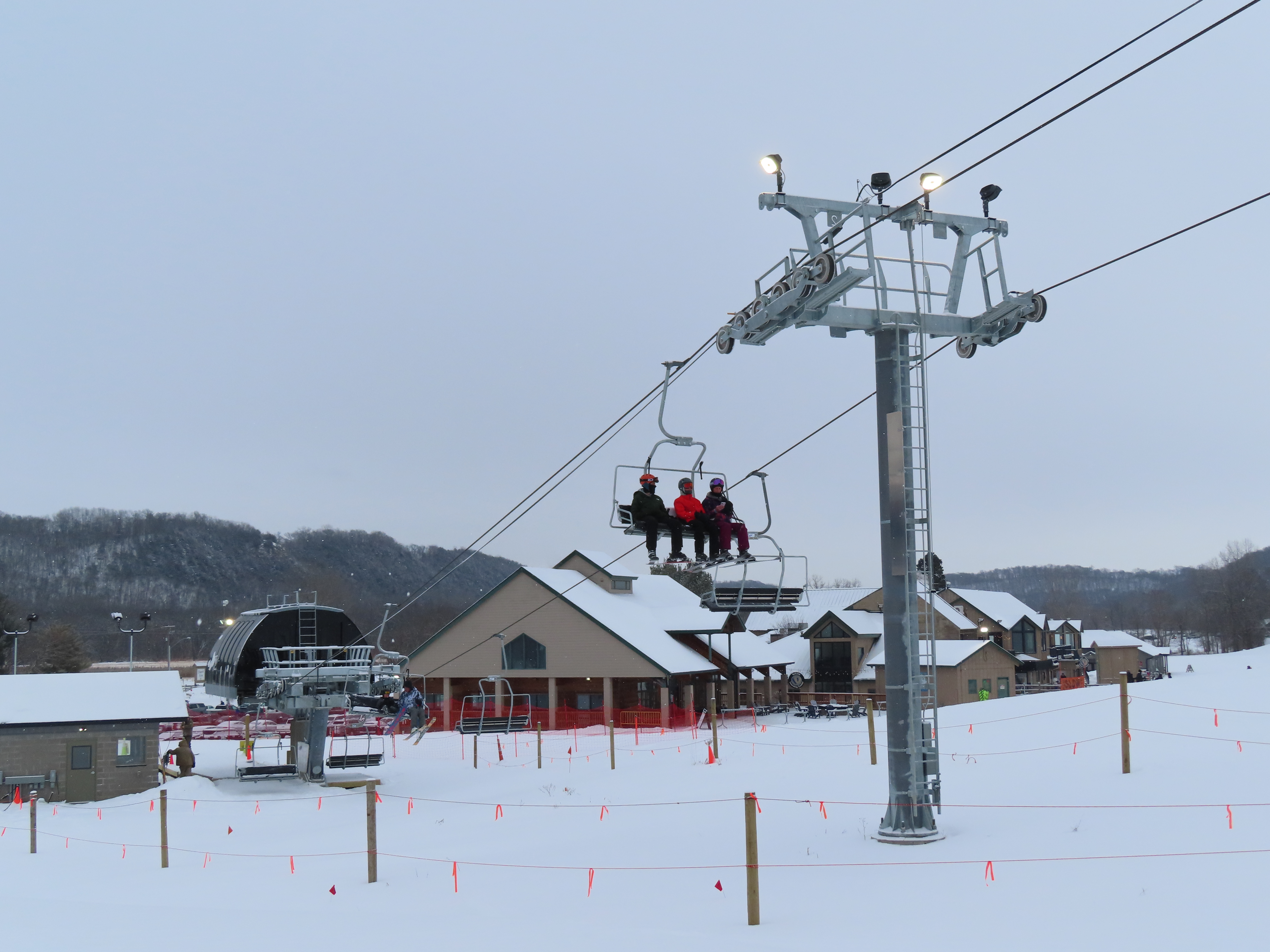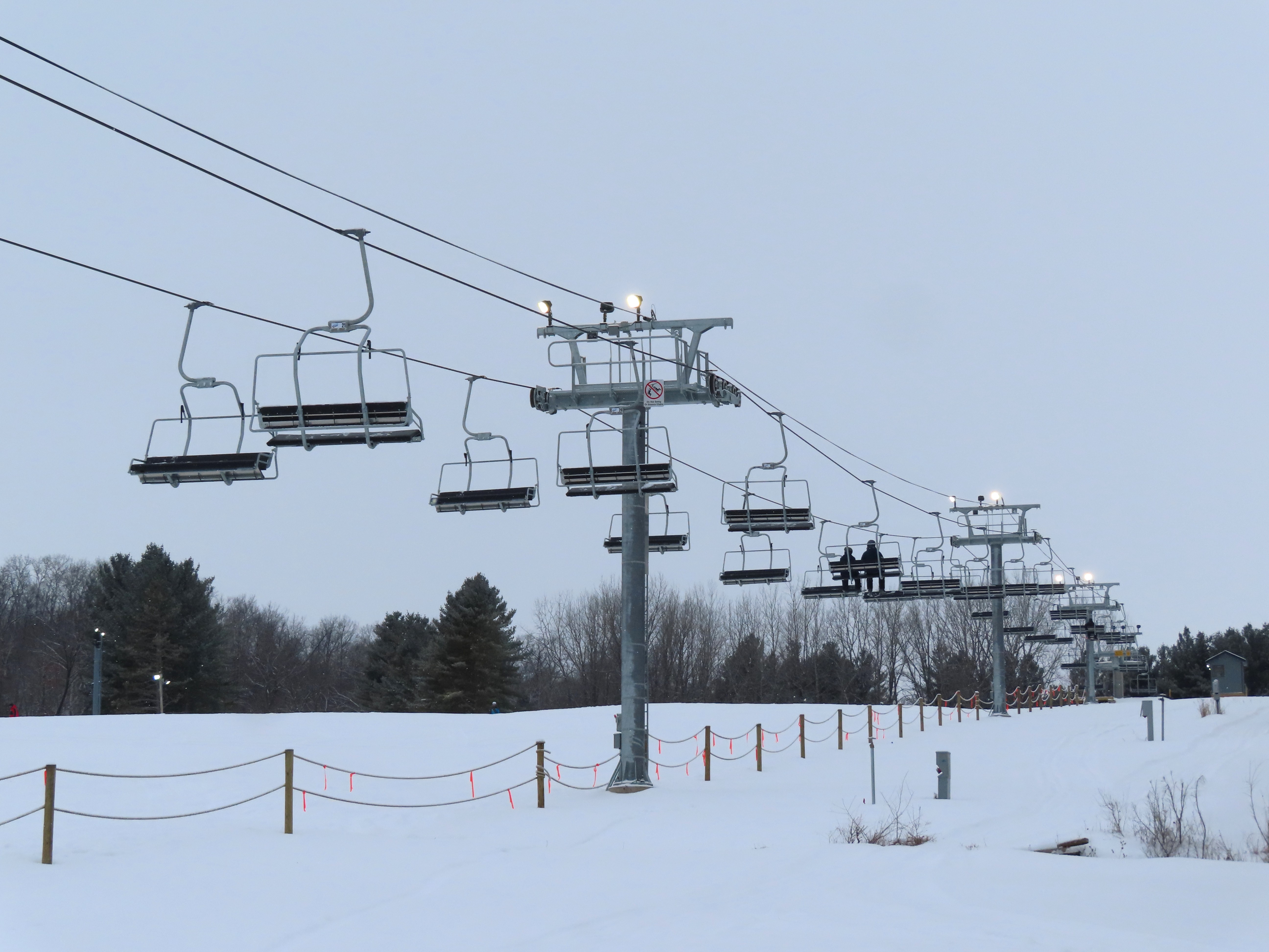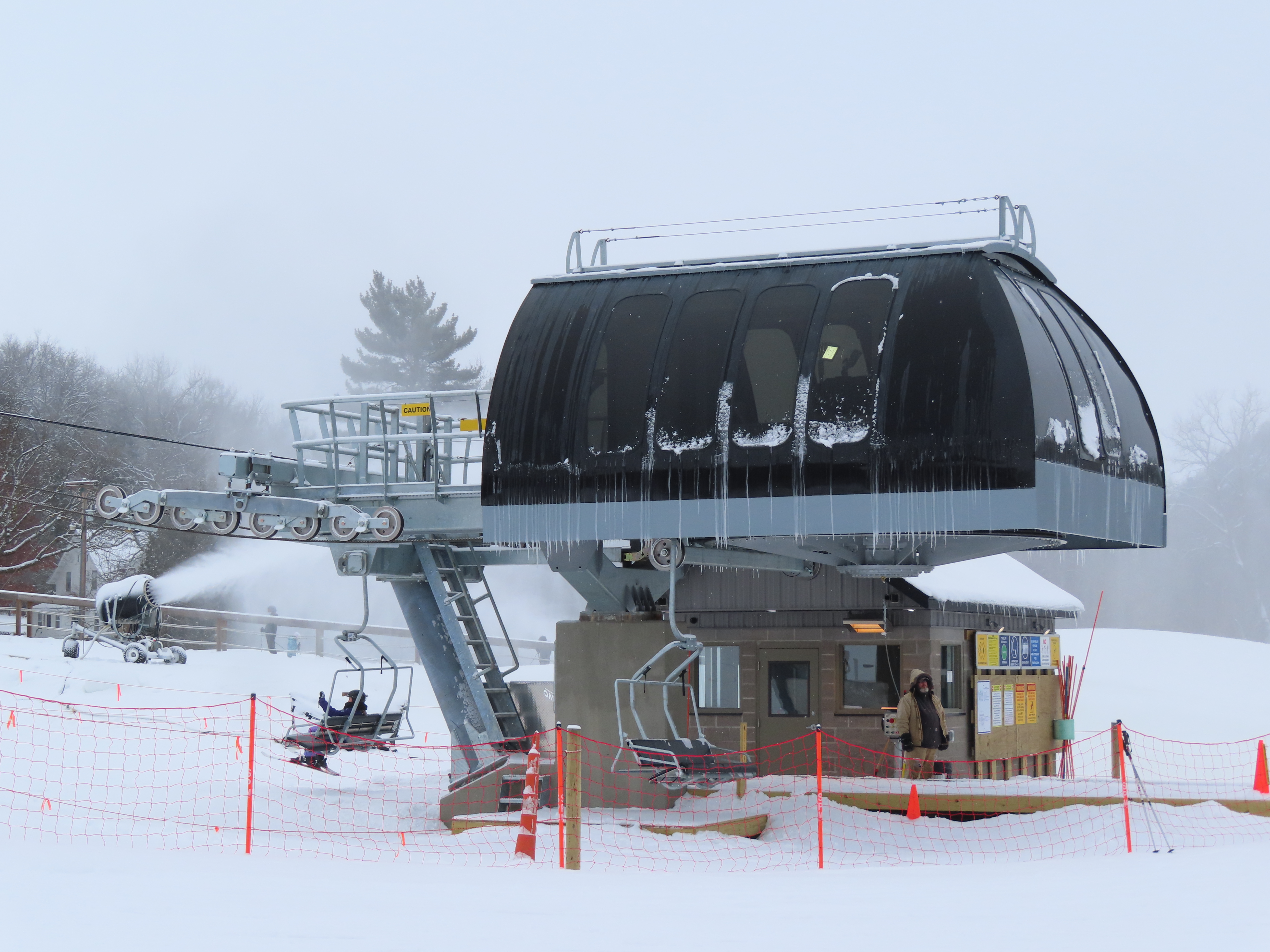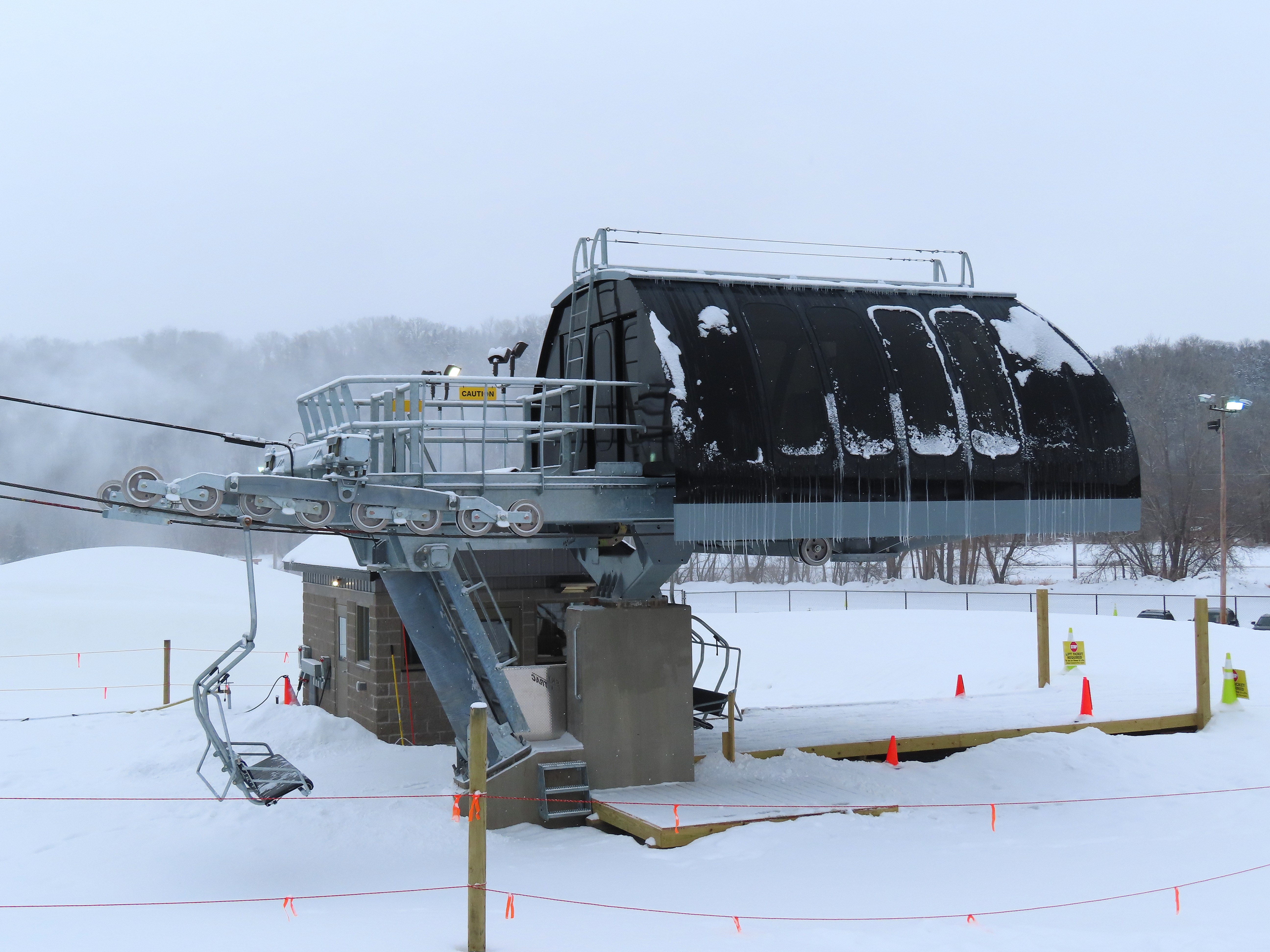 This lift anchors a new beginner area where a park and rope tow used to run.This is the first Skytrac for Welch, which also has Doppelmayr, Riblet and Doppelmayr CTEC fixed quads.View leaving the bottom terminal.Arriving at the top terminal location.Unload area with night lighting.Upper lift line overview.View down from tower 5.The top few towers with no ski under clearance.Lower lift line.Another view of the drive-tension station.Looking up the line from the magic carpet lift.Tower 2.Loading area.Side view of the Monarch station.