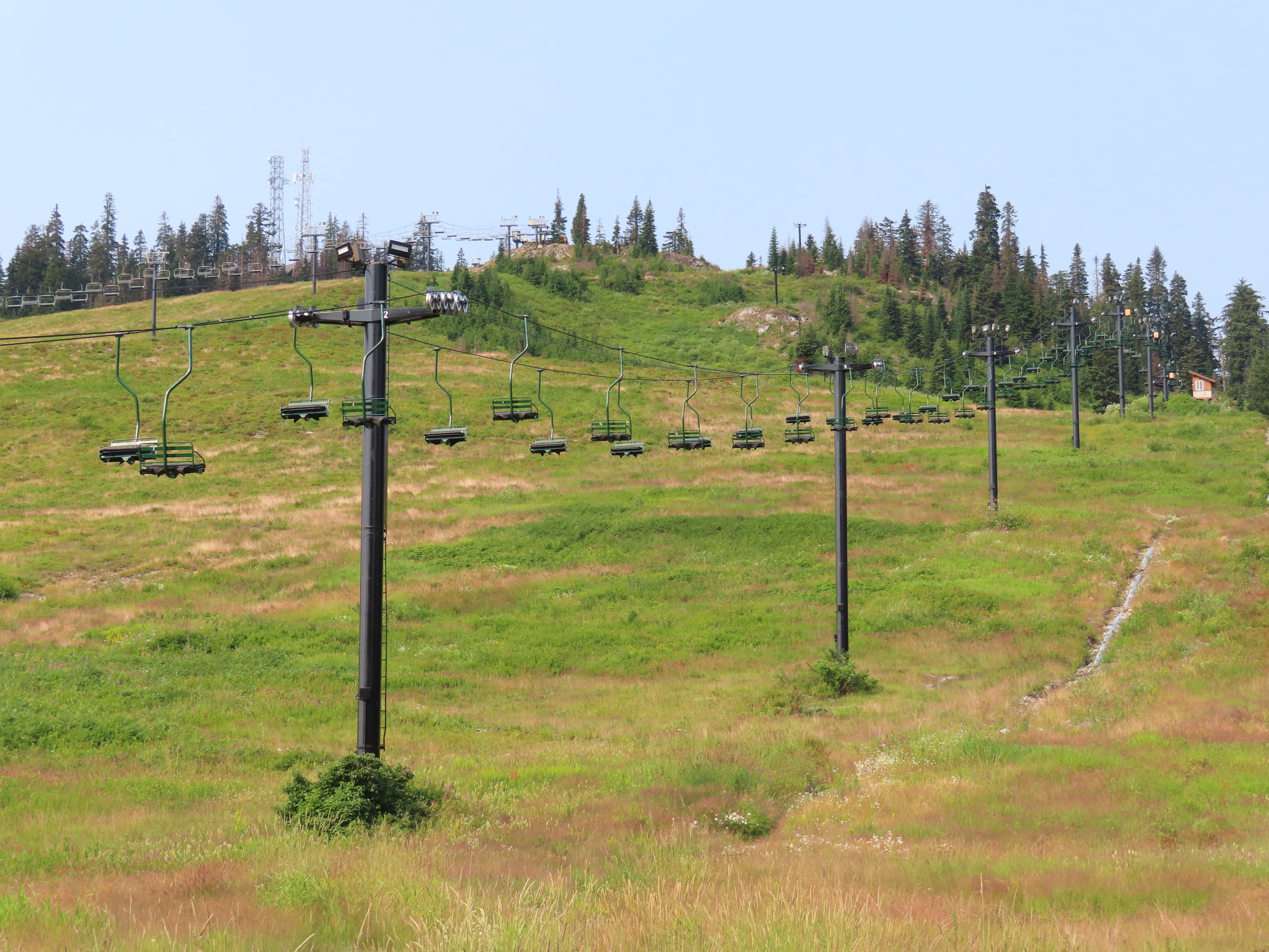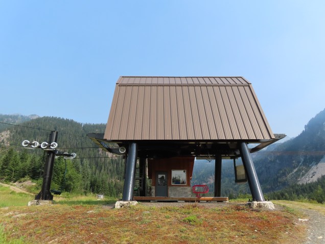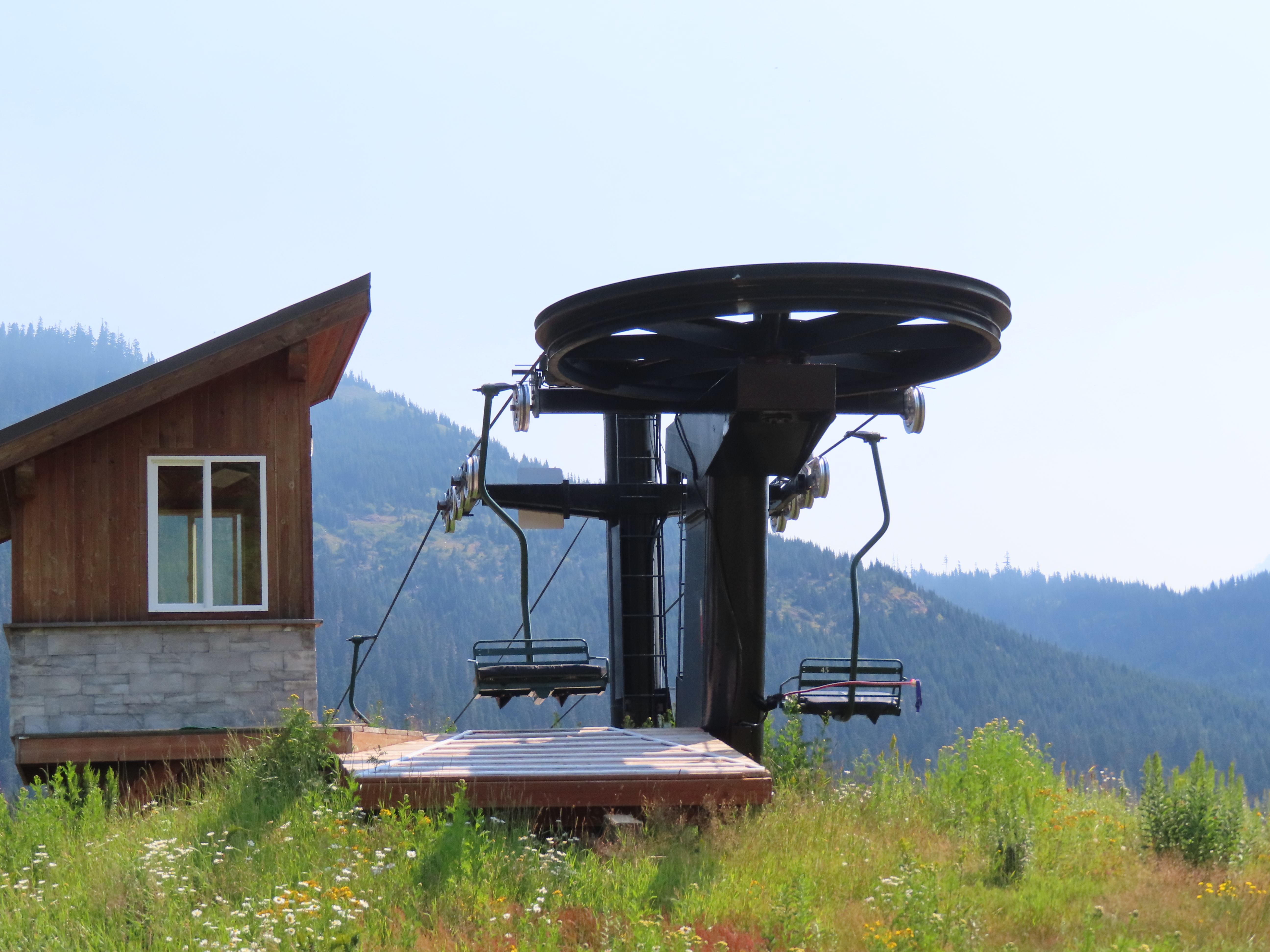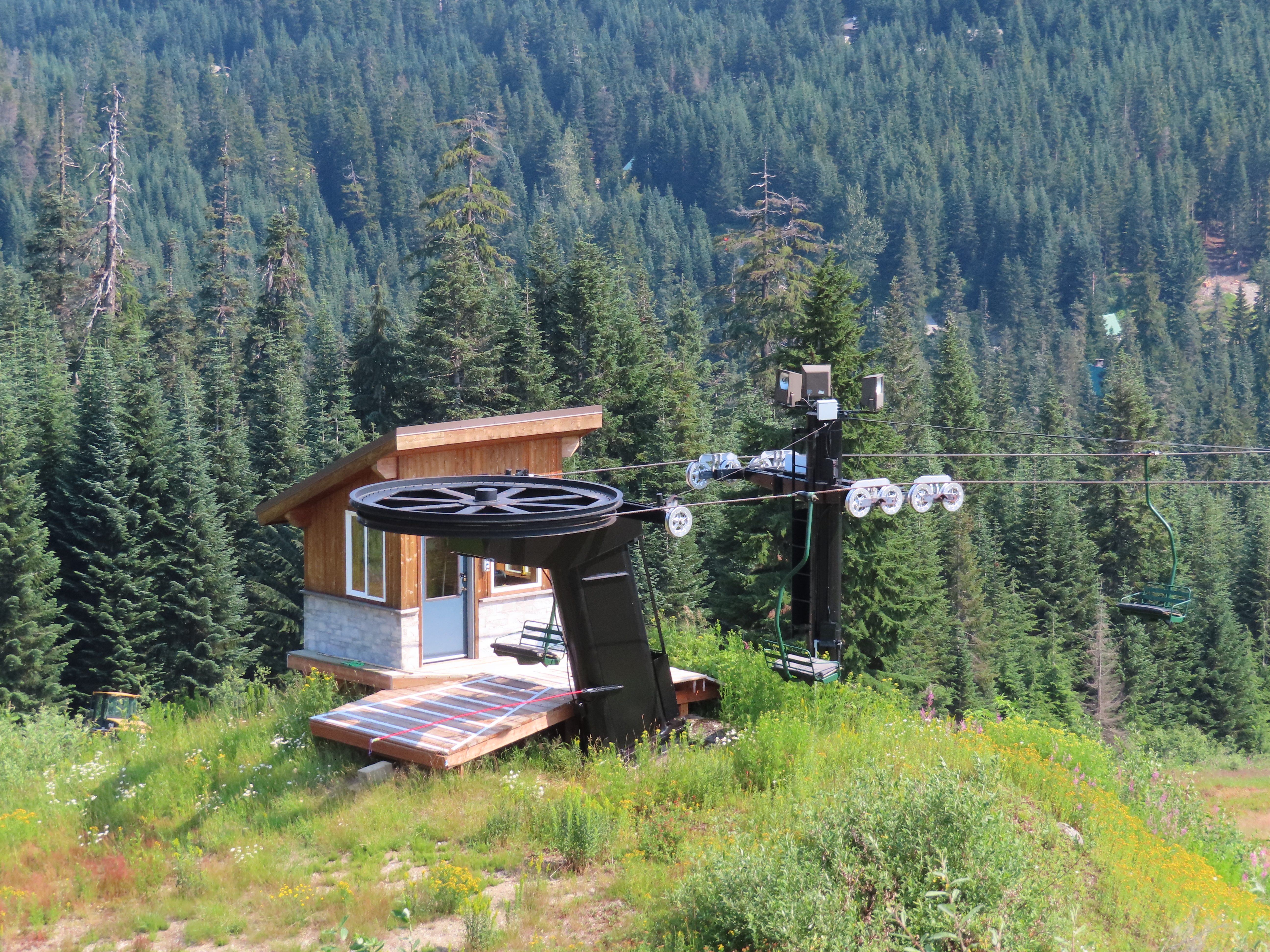 This beginner lift is the last remaining Thiokol at Snoqualmie.Counterweight hut.Side view of the open air drive station.Top terminal overview.View from the summit.Unloading area.Lower lift line in the Summit West base area.Lower station overview.Lift overview.