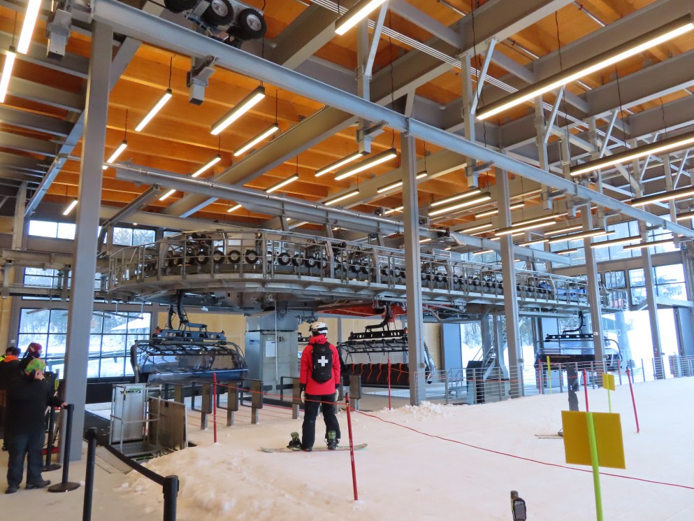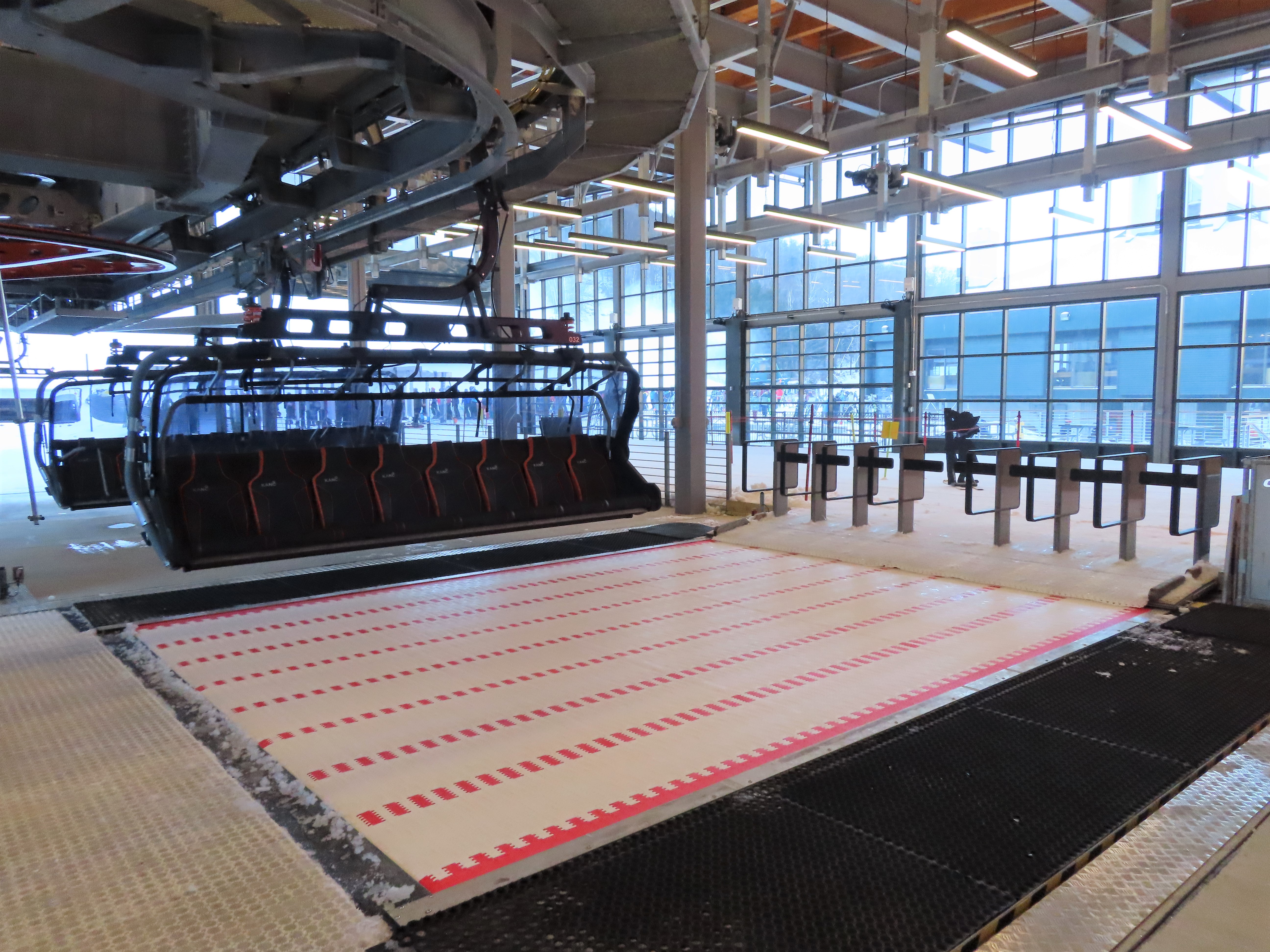 I have to disagree about your loading issue however. Loon has made use of the extra room “behind” the loading area, and bikers load in-line with the departure side using marked sections on the floor to assist with lining up. Rather than loading over the carpet (like in winter configuration & thus mid-way through the turnaround), that area is covered and blocked off by the other half of the chairs parked. There is a ramp up to the extra space from the entry side, you slowly make a 180 degree turn in line to get to the load point, going in between the control room and the control pedestal near the carpet (basically exactly where photo 6 was taken. Imagine the entire left side being a wooden ramp for loading, with in-line loading happening at a 90 degree angle to the photo). I did see some people lifting their bike too early, before the carrier had completed the turn but both the clips and the terminal speed were forgiving enough that the lift didn’t have to stop to correct any issues. In fact, it was quite rare to see the lift stopped for bike operations.