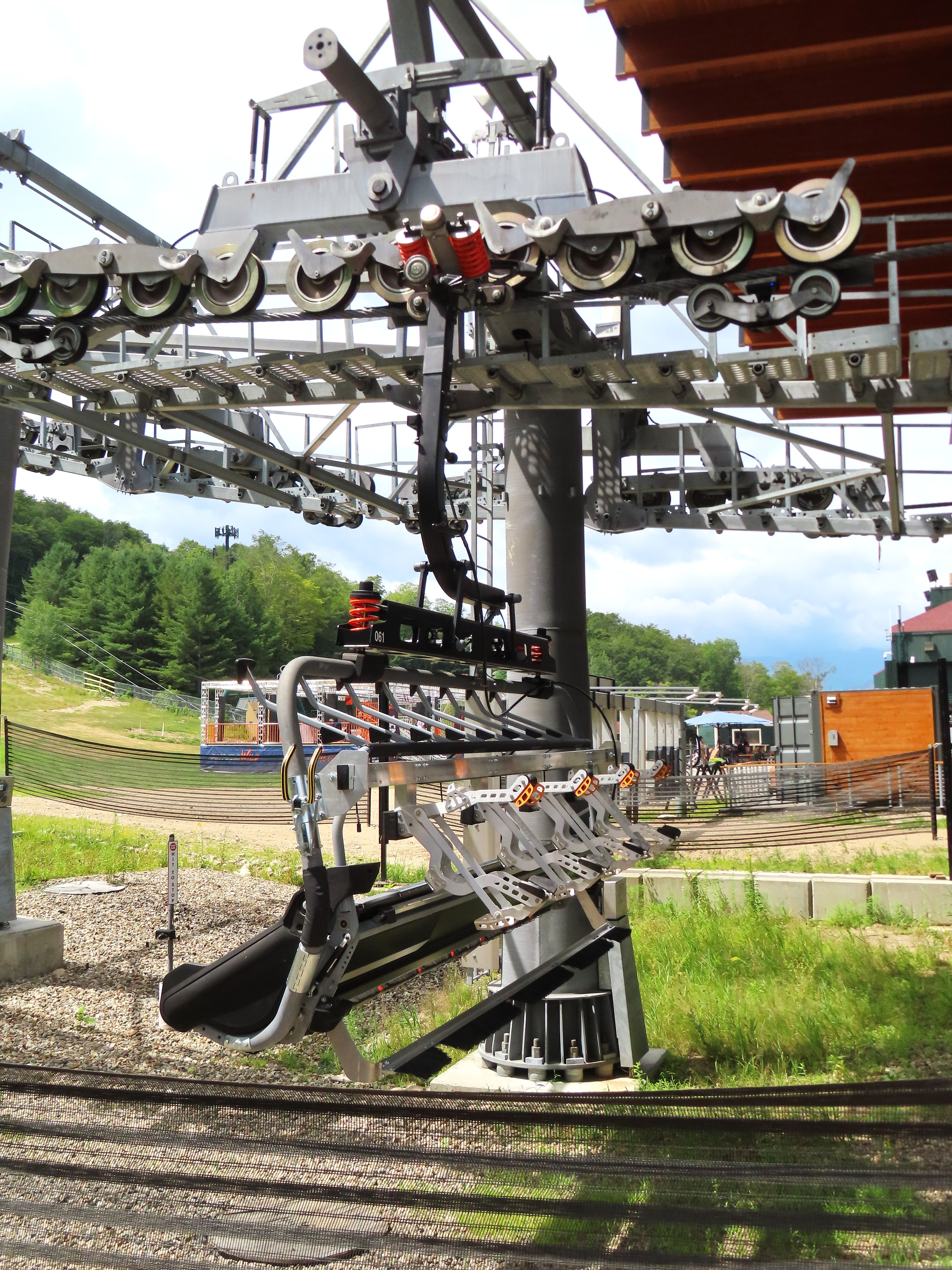 This lift was the very first eight passenger chairlift built on the East Coast and the project included a large bottom terminal building.Doppelmayr Connect controls.Custom upholstered eight place chair.Lower terminal overview.Side view of the bottom station.Another view of the drive station.Loading conveyor.D-Line bullwheel.The top terminal features a standard D-Line skin rather than being enclosed by a building.Terminal underside.View down at tower 11.Conical towers brought over from Europe.The alignment is not that long with a ride time of just 4.5 minutes.View from above at the building.Hold down assemblies on towers 1 and 2.The parking area doubles as maze space during the day.Riding up the line.Tower 7.Tower 9.Upper station overview.Turnaround area.A chair with bubble down.Tower 12 and the top terminal.T11.Another view of the summit.A chair with the bubble open.Middle part of the lift line.Lower lift line.View uphill.The building entrance.Kanc 8 plaza.Backside of the building.Most of the lift line seen from the resort entrance.Indoor chair parking.Chairs feature different back graphics in winter and summer.European style bike racks.Carrier with space for five bikes.