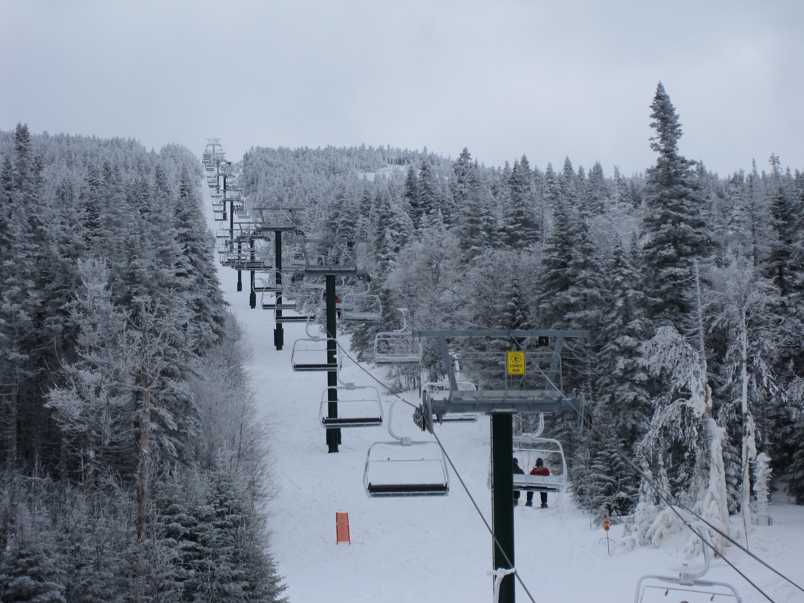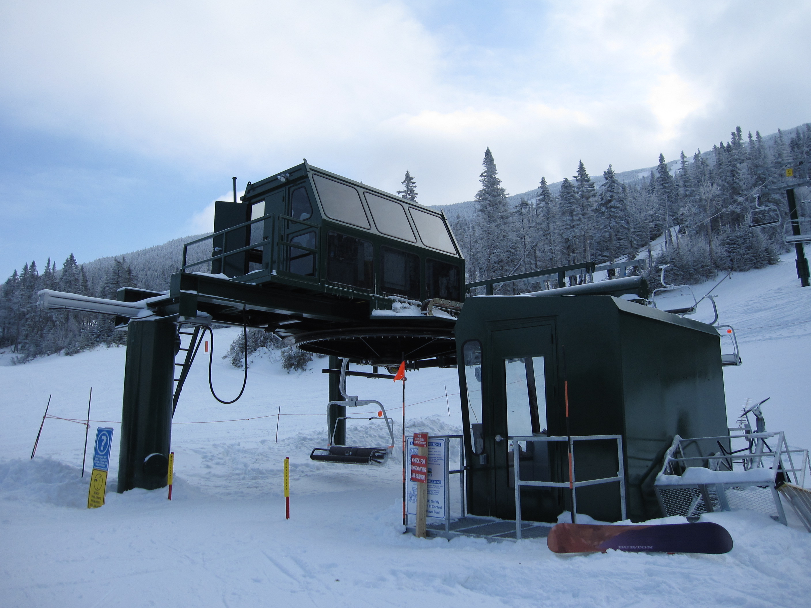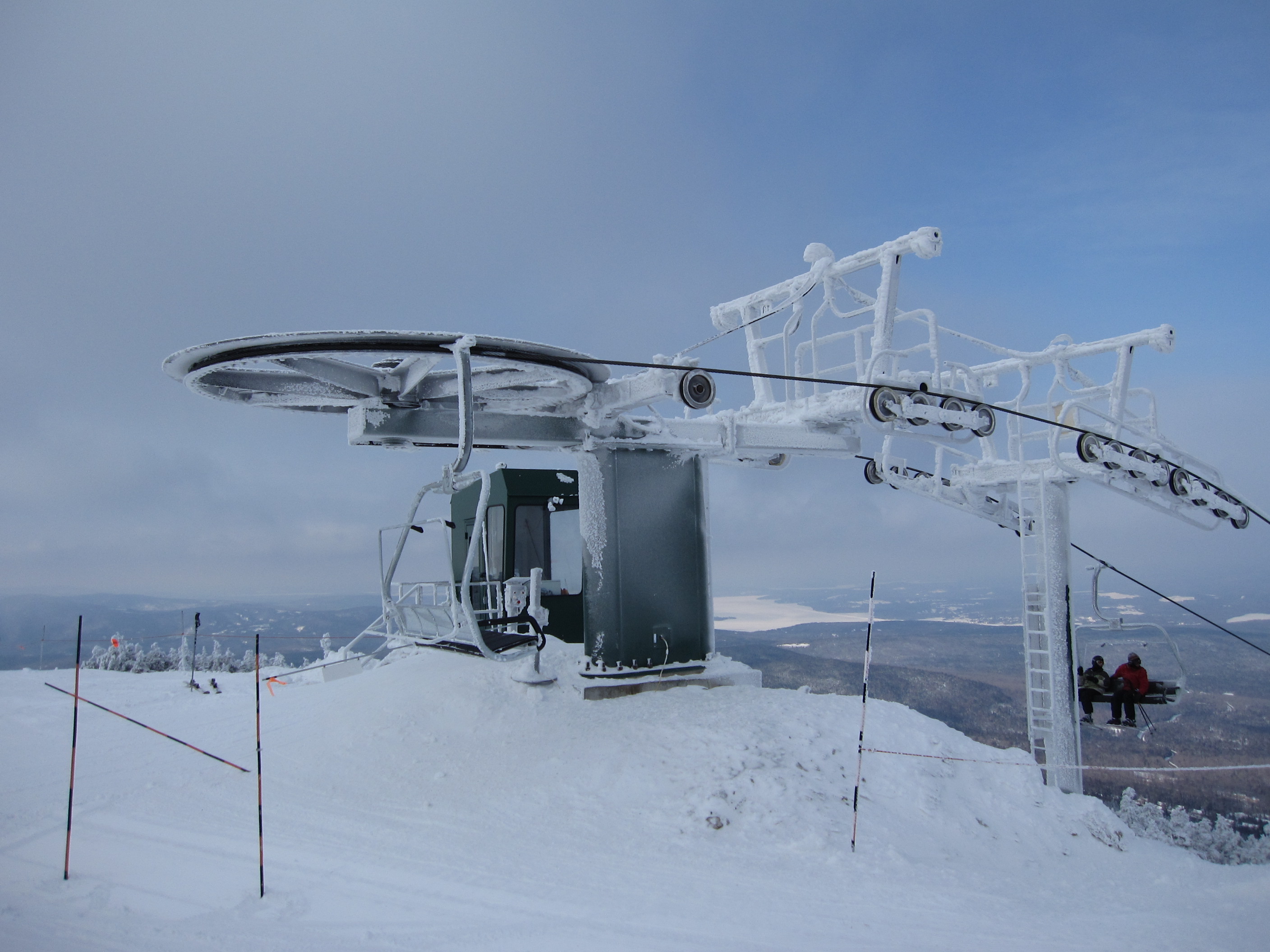Bottom terminal and towers 1-2.Doppelmayr CTEC Sprint drive terminal.Base terminal and lift line.Combo assemblies on tower 7.Top bullwheel and lift shack.Another view of the return.Bottom station.View up the lift line from the base.Looking down the line.Upper lift line.Lower lift line.Breakover towers with a nice coat of rime.