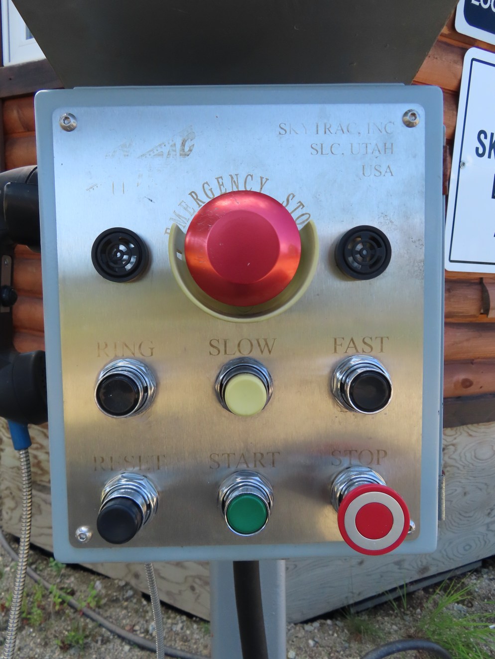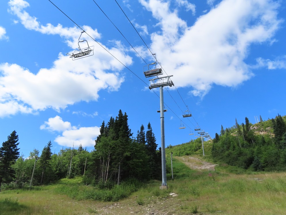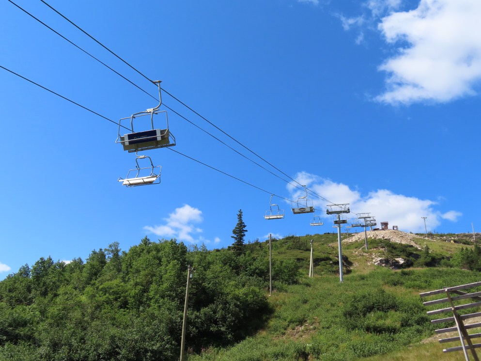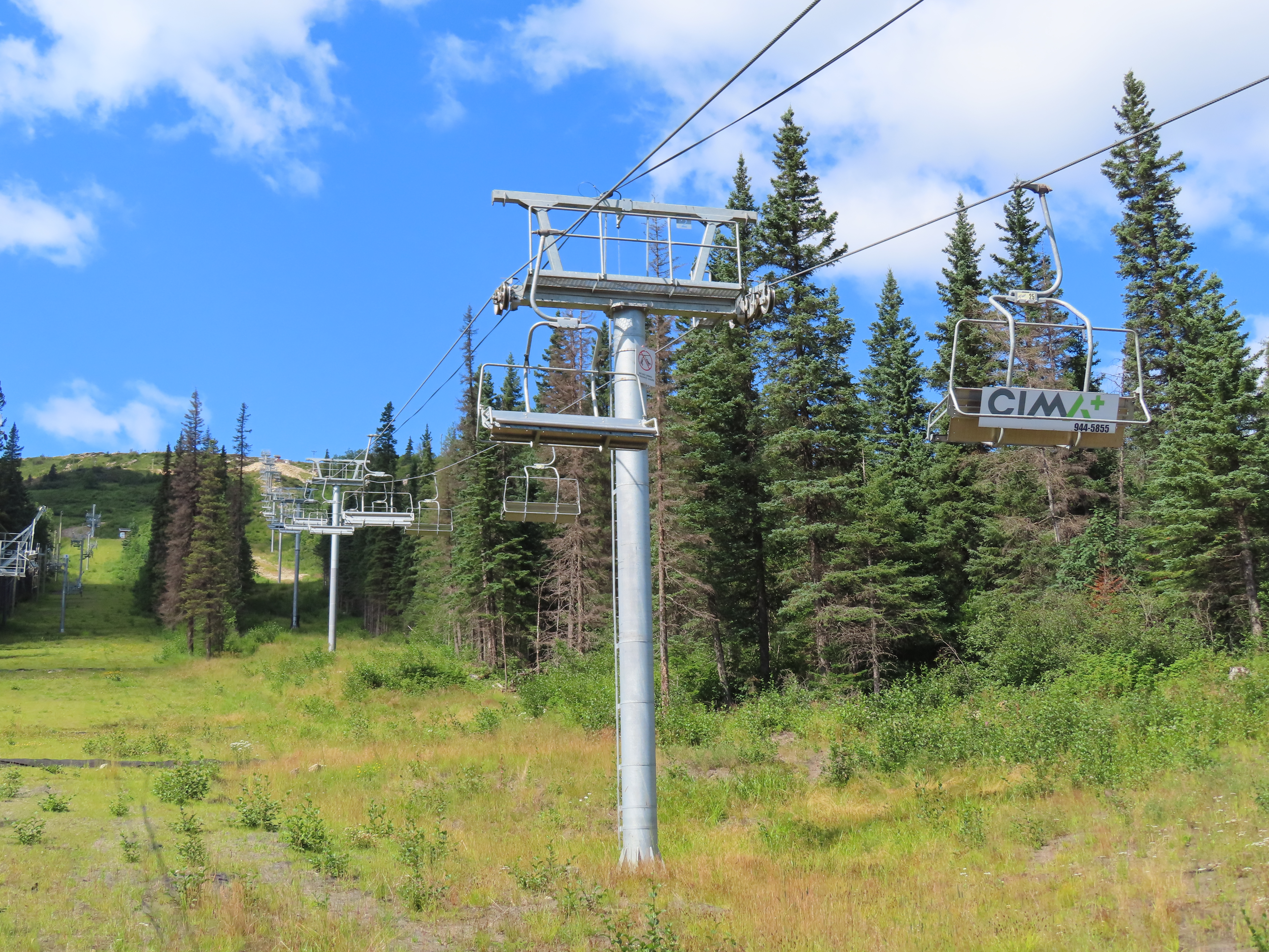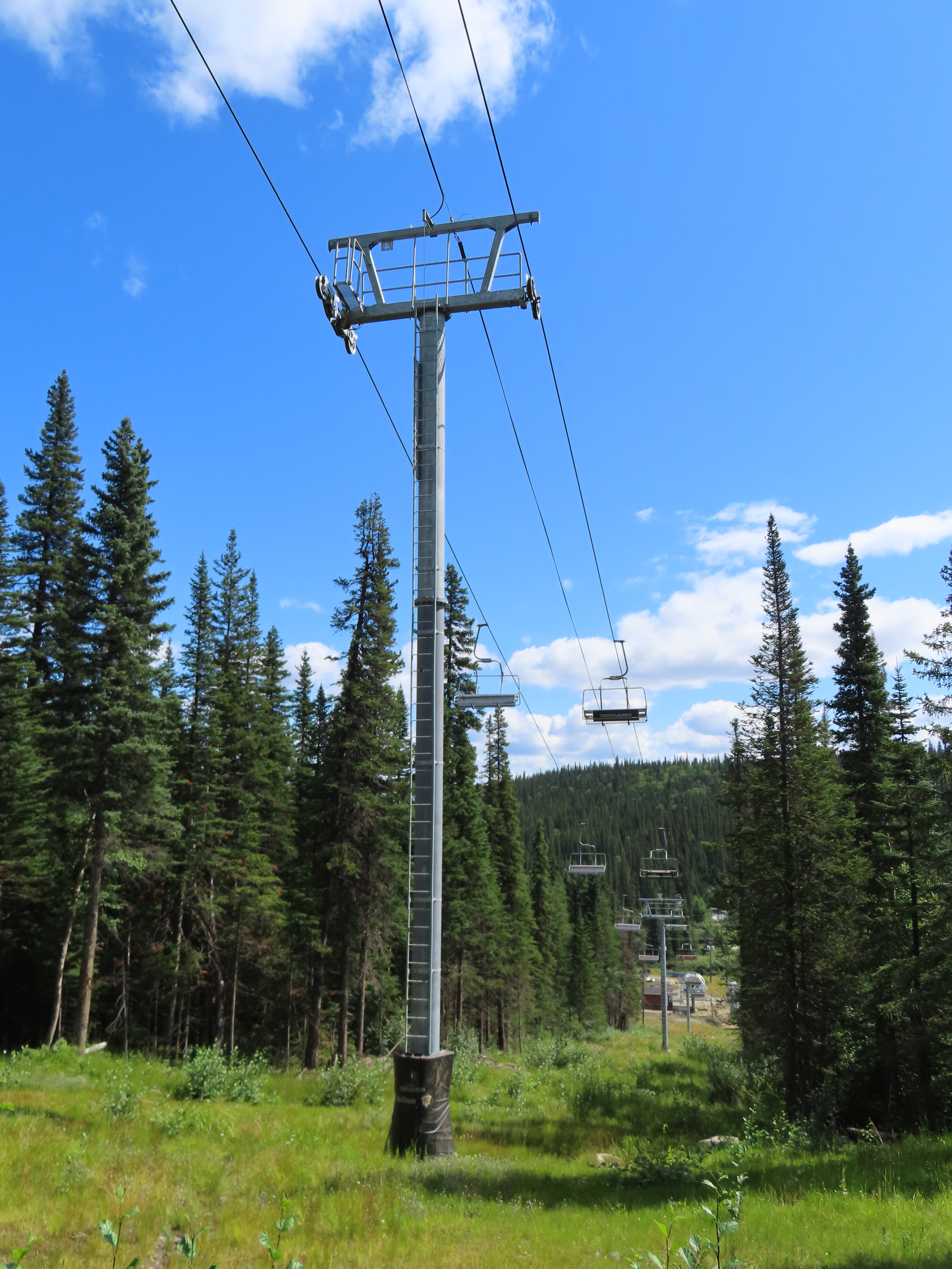 This lift is the only Skytrac quad in Canada.View up the lift line, which used to host a Poma double chair.Lower lift line in the base area.Tall tower.Middle section of the lift line.View down the line.Tower 6 of 11.A tower with combination assemblies.Upper part of the lift line.Steep middle section of the line.The upper station sits lower than the old lift to protect it from mine blasts on the back side of the mountain.View from the summit.Top terminal seen from the old double unload point.Side view of the summit.Lift overview.Uphill end of the Monarch drive station.Skytrac outside controls.