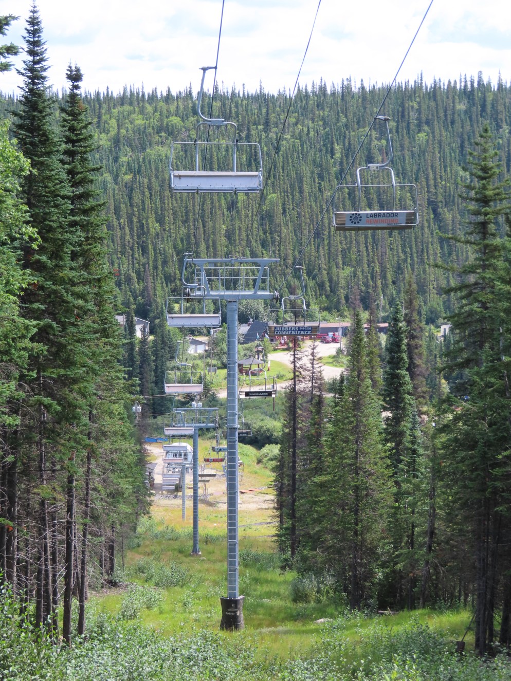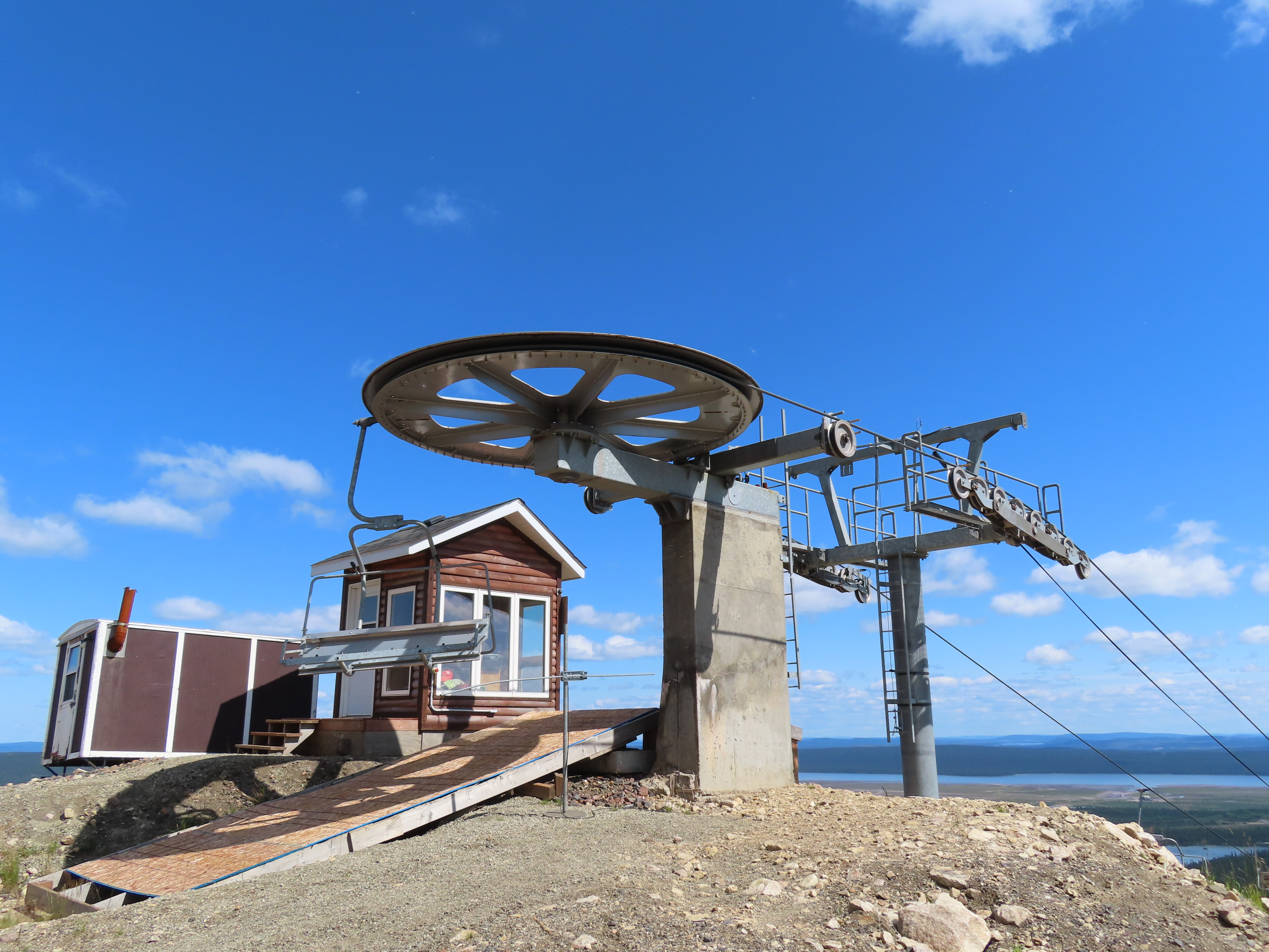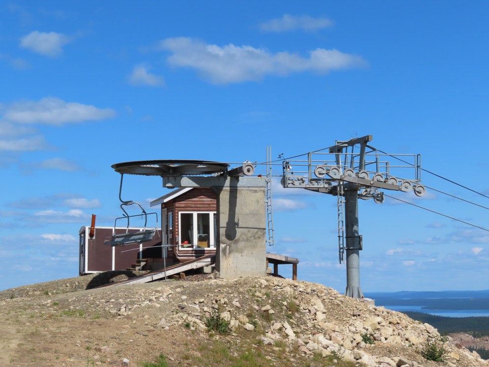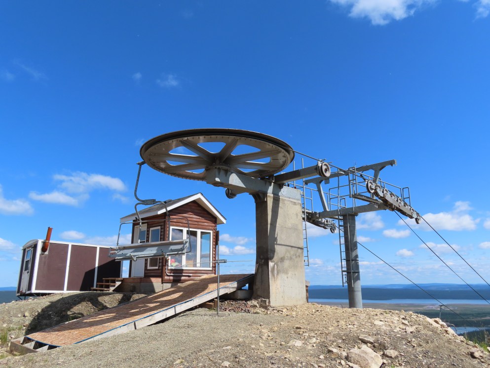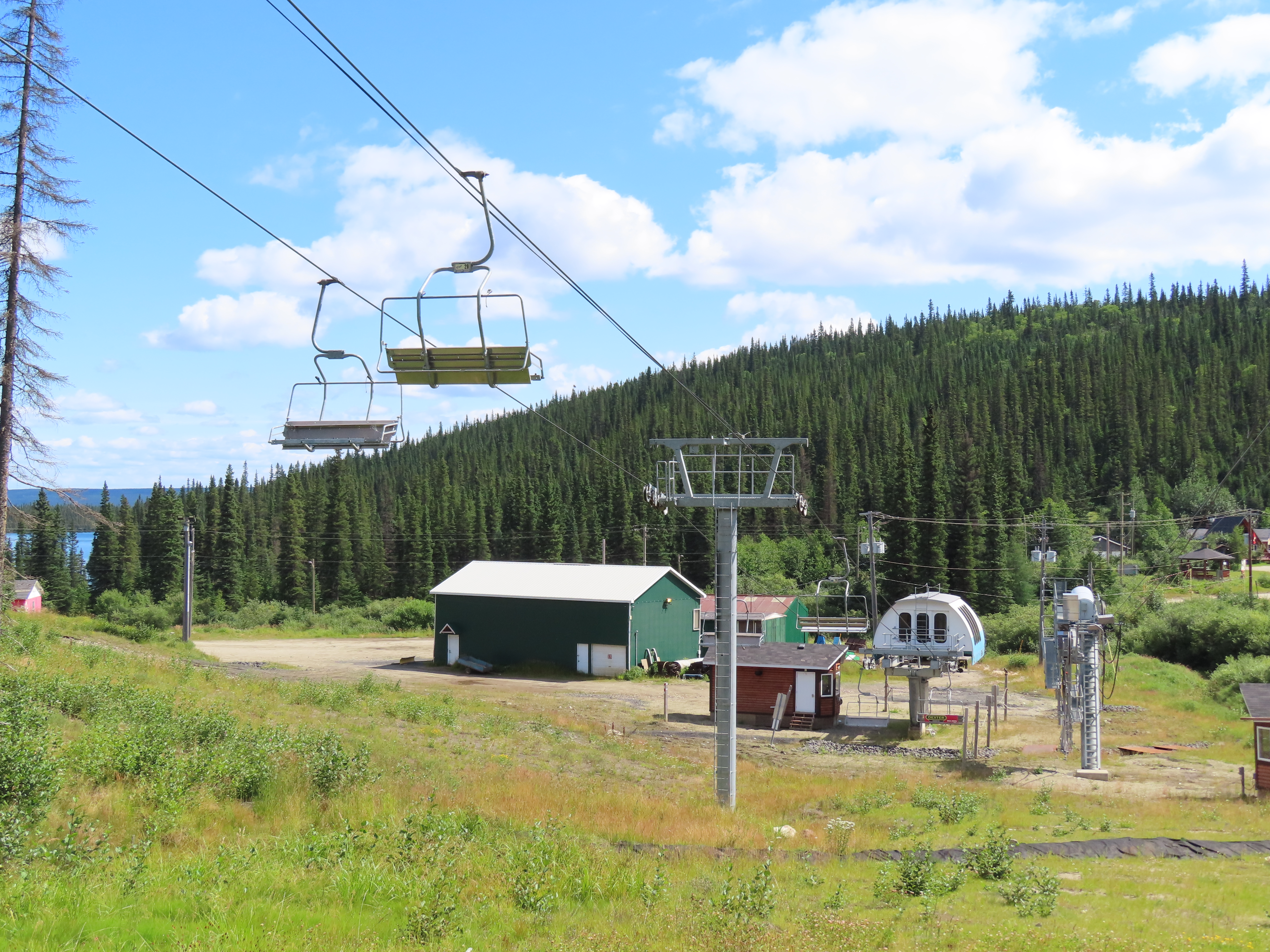 This lift is the only Skytrac quad in Canada.View up the lift line, which used to host a Poma double chair.Lower lift line in the base area.Tall tower.Middle section of the lift line.View down the line.Tower 6 of 11.A tower with combination assemblies.Upper part of the lift line.Steep middle section of the line.The upper station sits lower than the old lift to protect it from mine blasts on the back side of the mountain.View from the summit.Top terminal seen from the old double unload point.Side view of the summit.Lift overview.Uphill end of the Monarch drive station.Skytrac outside controls.