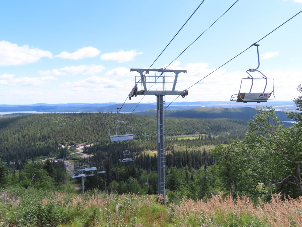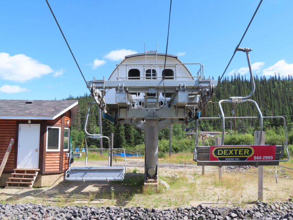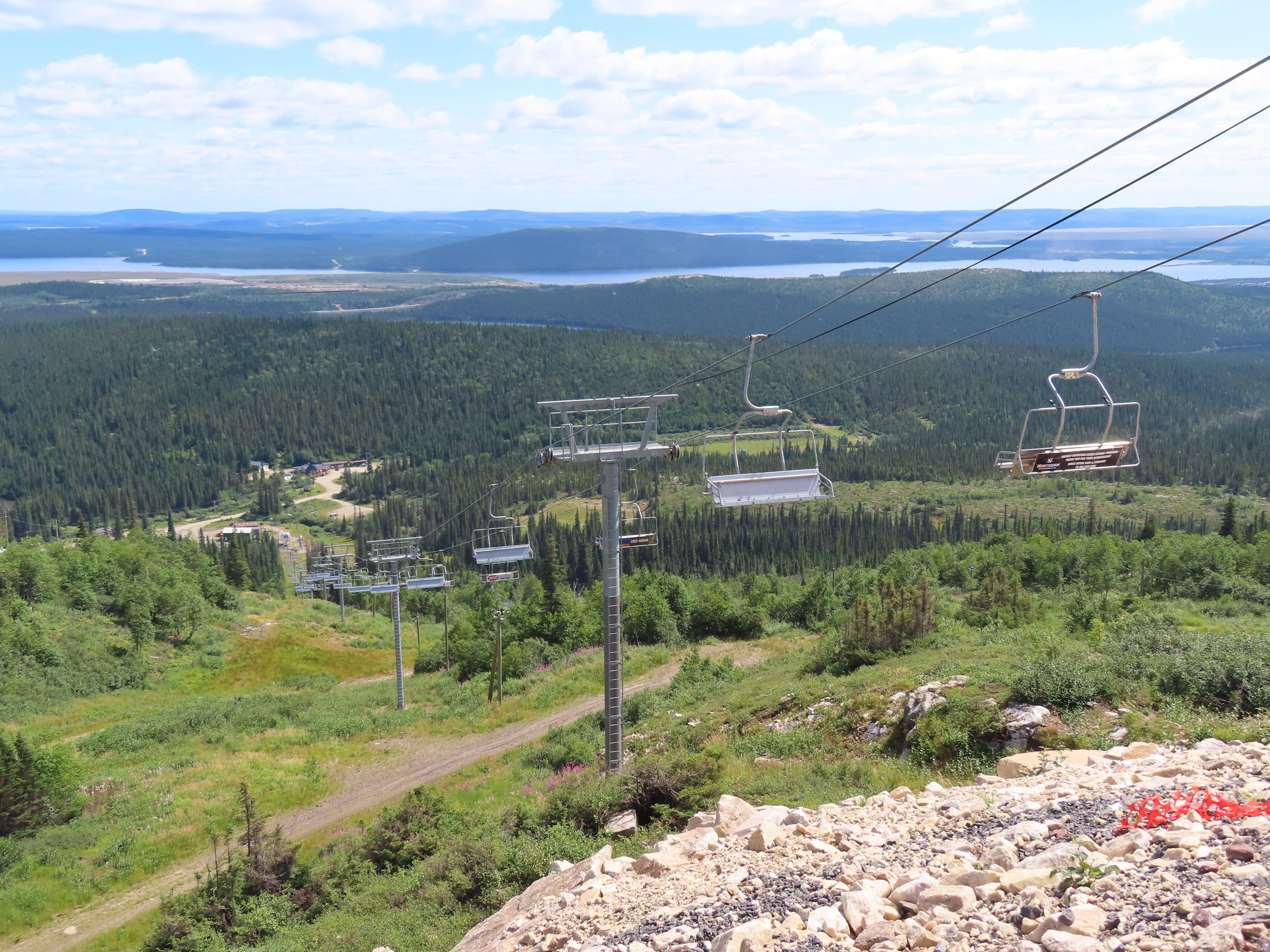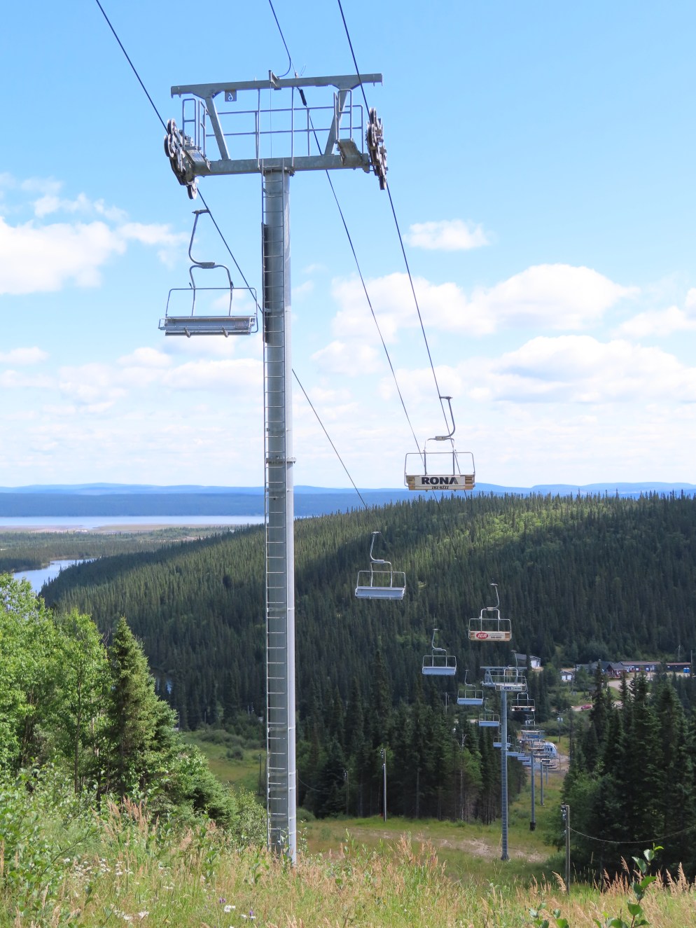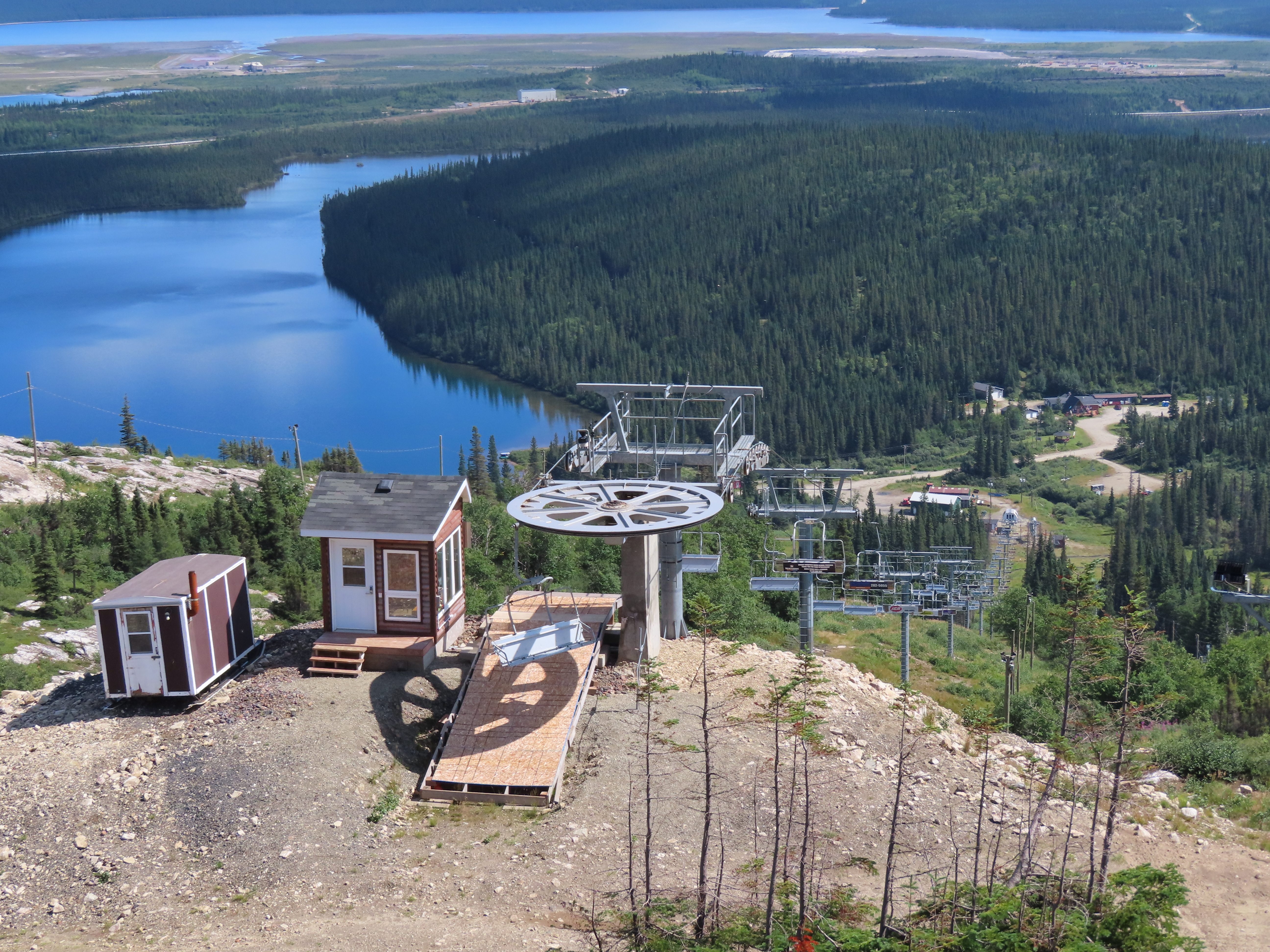 This lift is the only Skytrac quad in Canada.View up the lift line, which used to host a Poma double chair.Lower lift line in the base area.Tall tower.Middle section of the lift line.View down the line.Tower 6 of 11.A tower with combination assemblies.Upper part of the lift line.Steep middle section of the line.The upper station sits lower than the old lift to protect it from mine blasts on the back side of the mountain.View from the summit.Top terminal seen from the old double unload point.Side view of the summit.Lift overview.Uphill end of the Monarch drive station.Skytrac outside controls.
