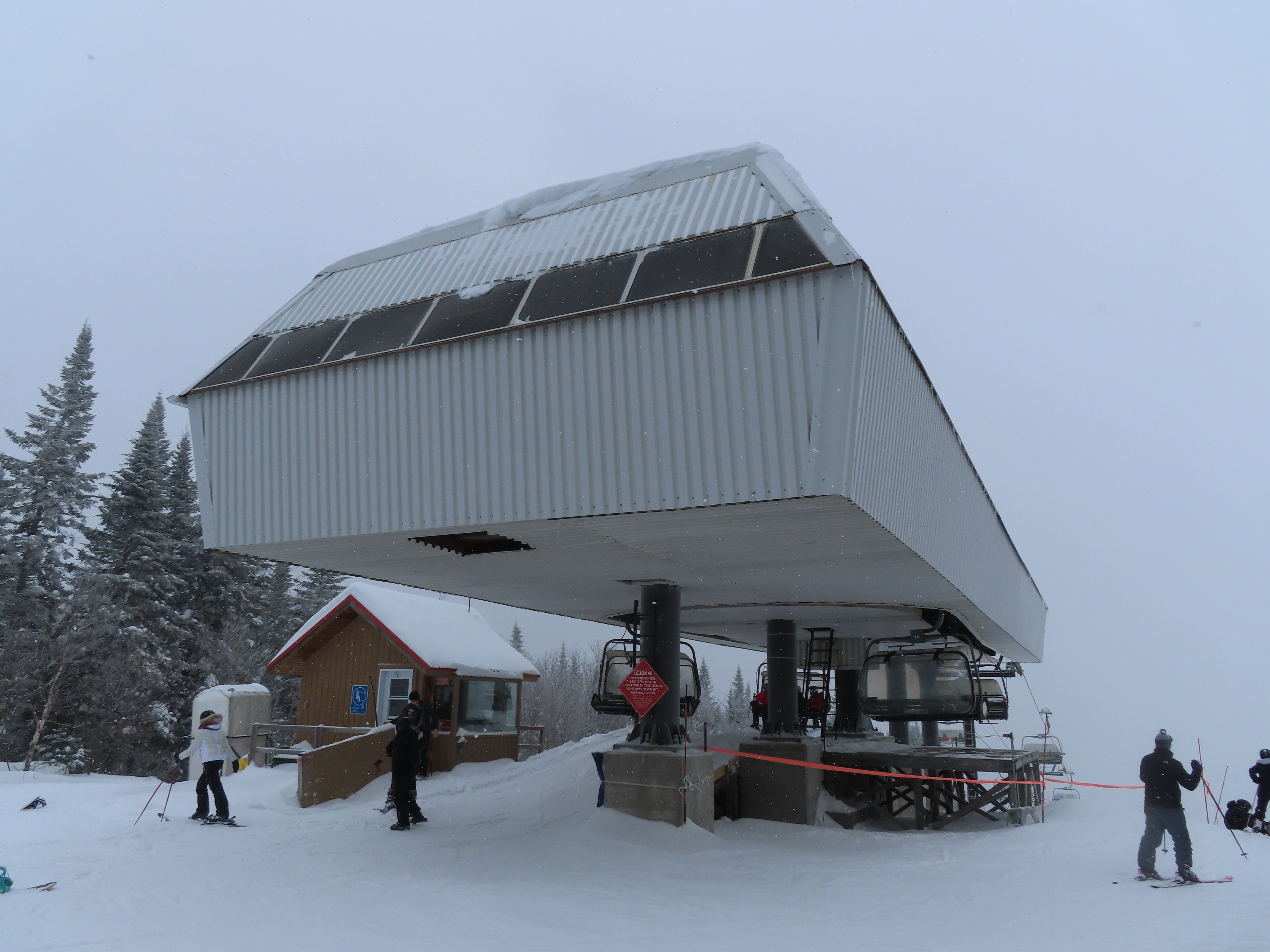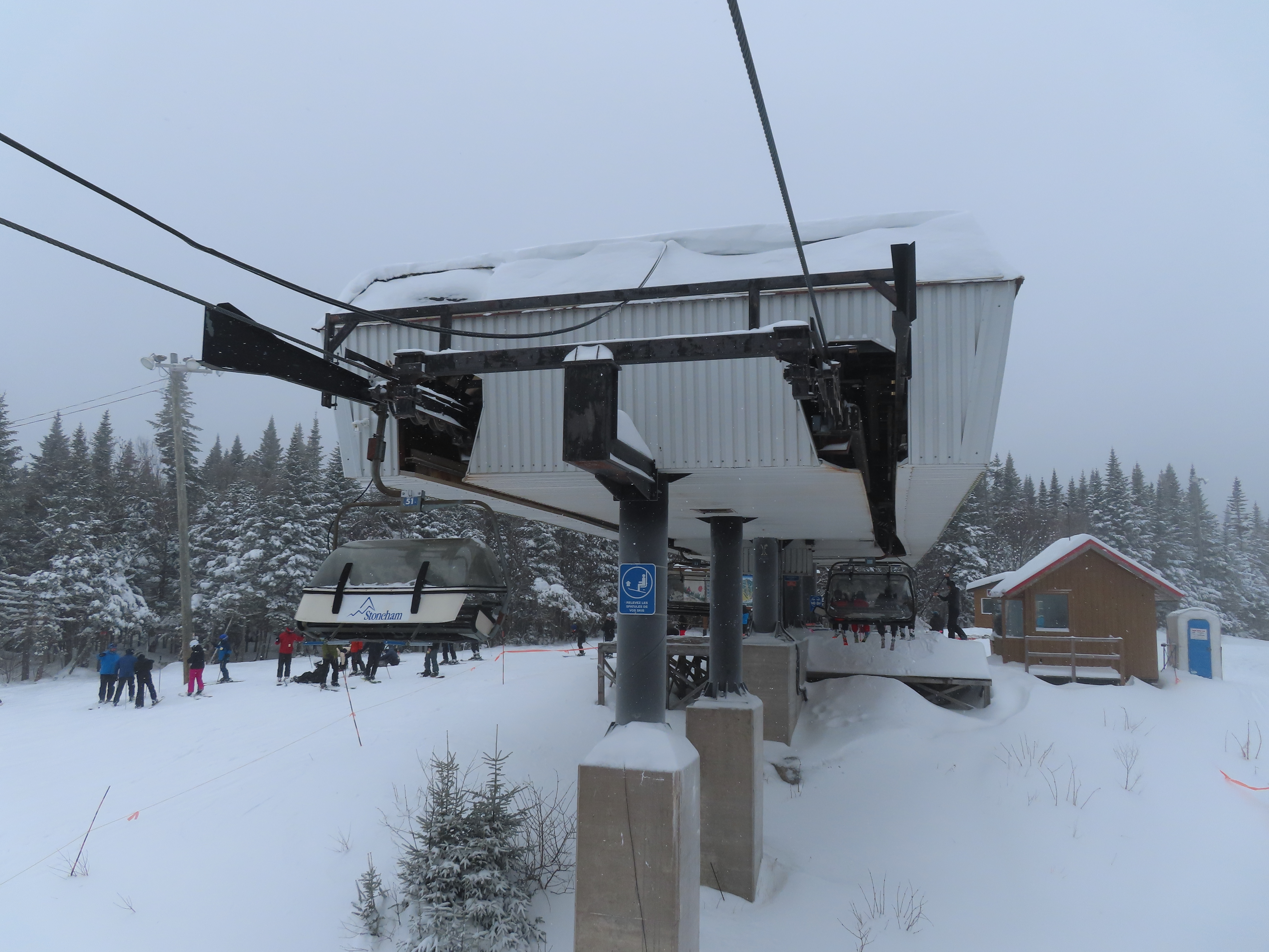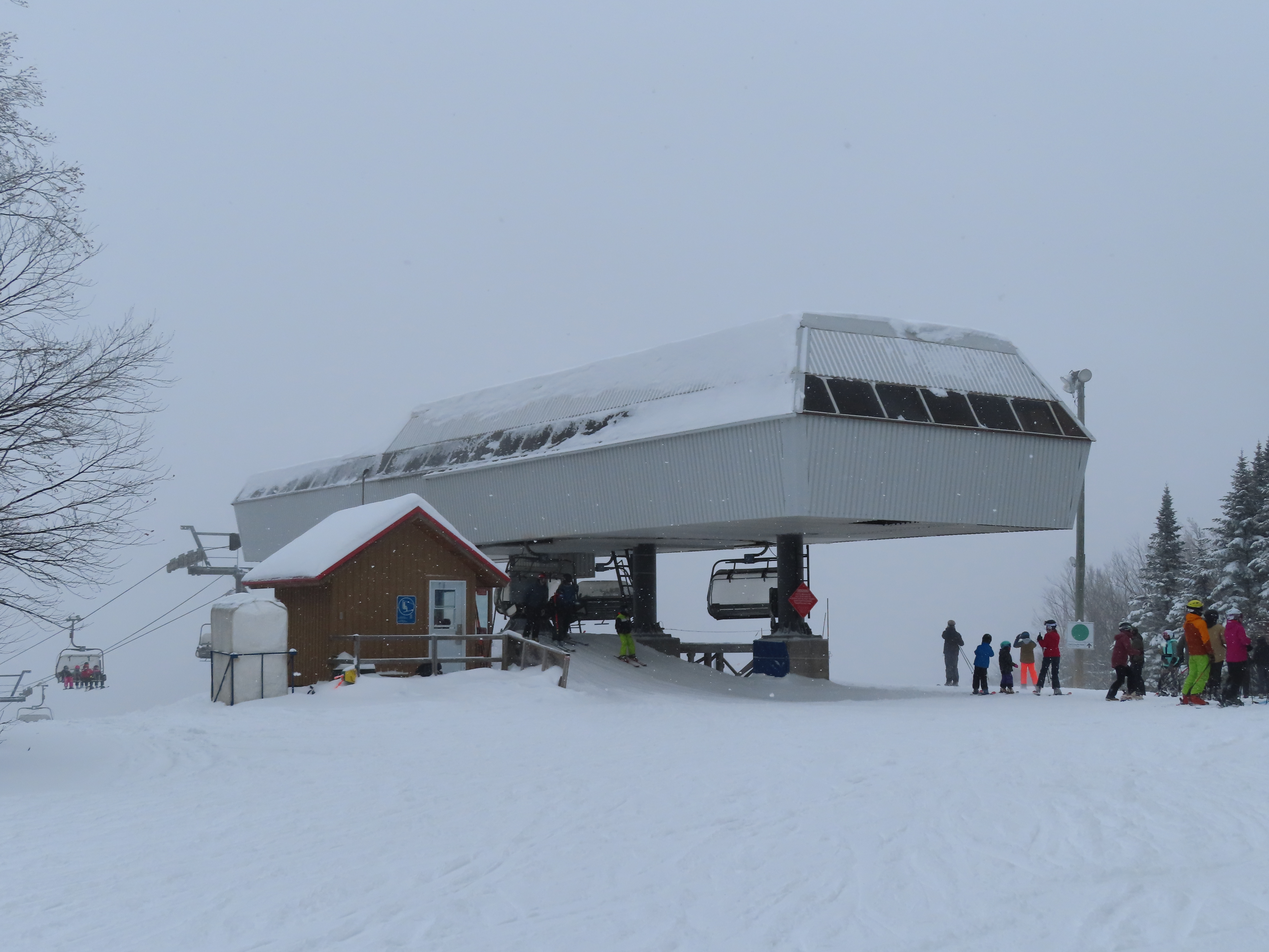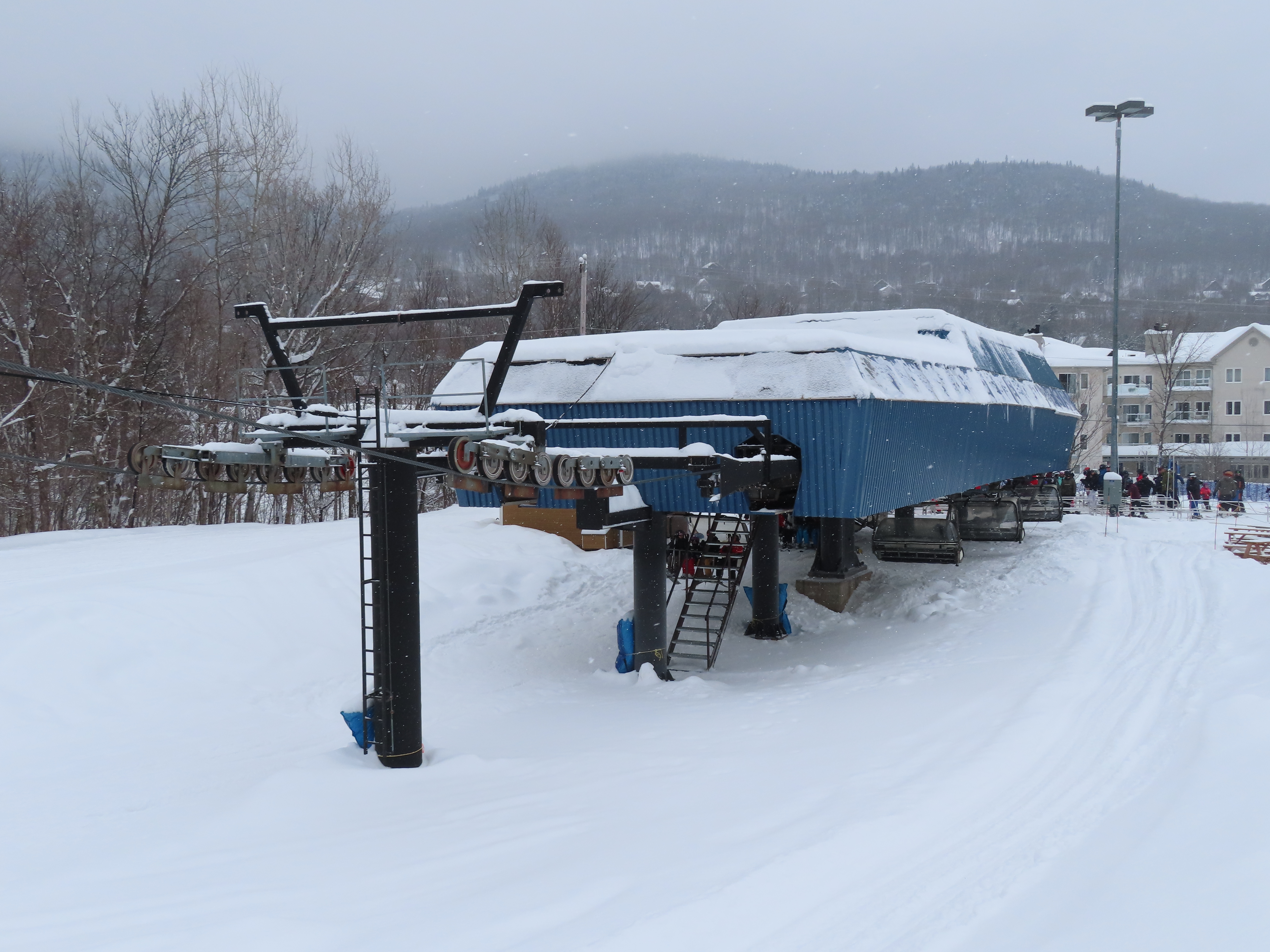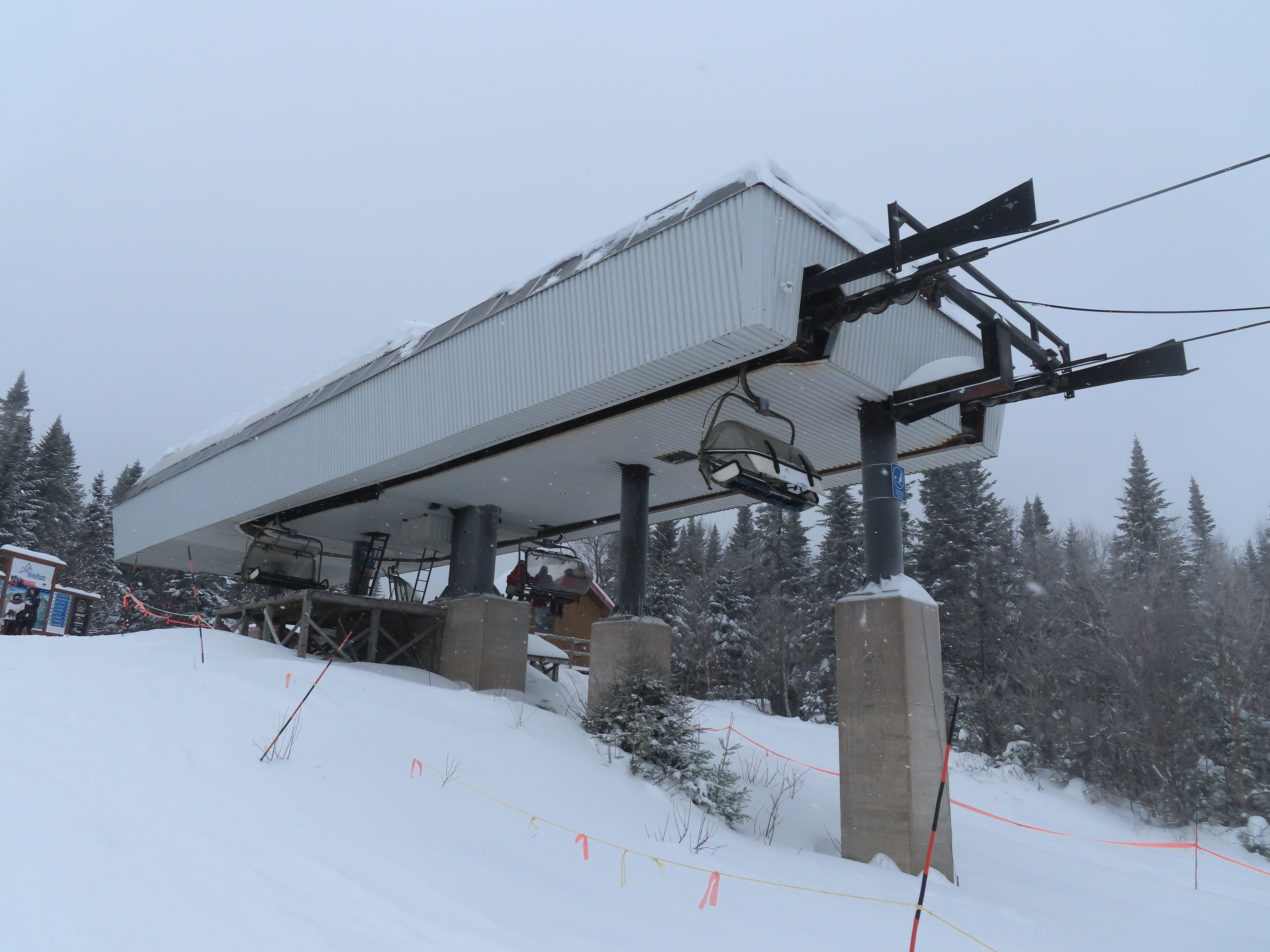 This bubble quad services the center part of the mountain and opened in 1988.Loading area.Riding up the line.There is one half tower along the line.Classic EJ bubble chair.Arriving at the top terminal.This enclosure is unique and was not used elsewhere in Canada.Side view of the upper terminal.View down near the summit.Upper part of the lift line.Looking up around half way.The lower part of the line is steeper than the upper.View towards the main village.The half tower.Towers 1 and 2.Drive terminal and tower 1.CLD-260 station.Chain-driven station.Unloading area up top.