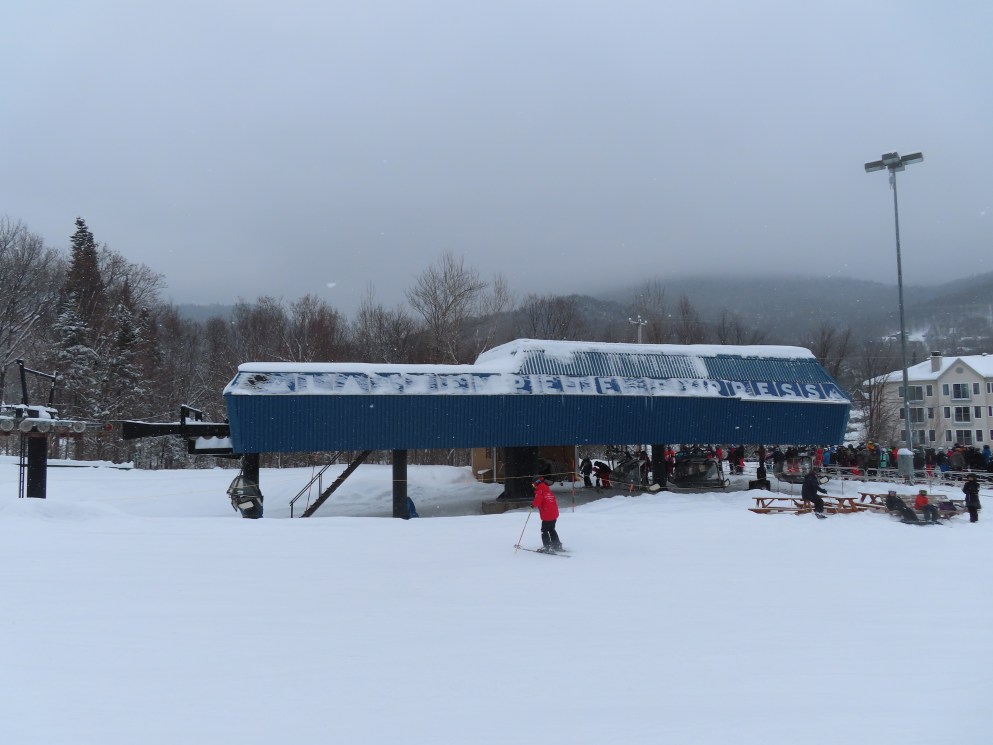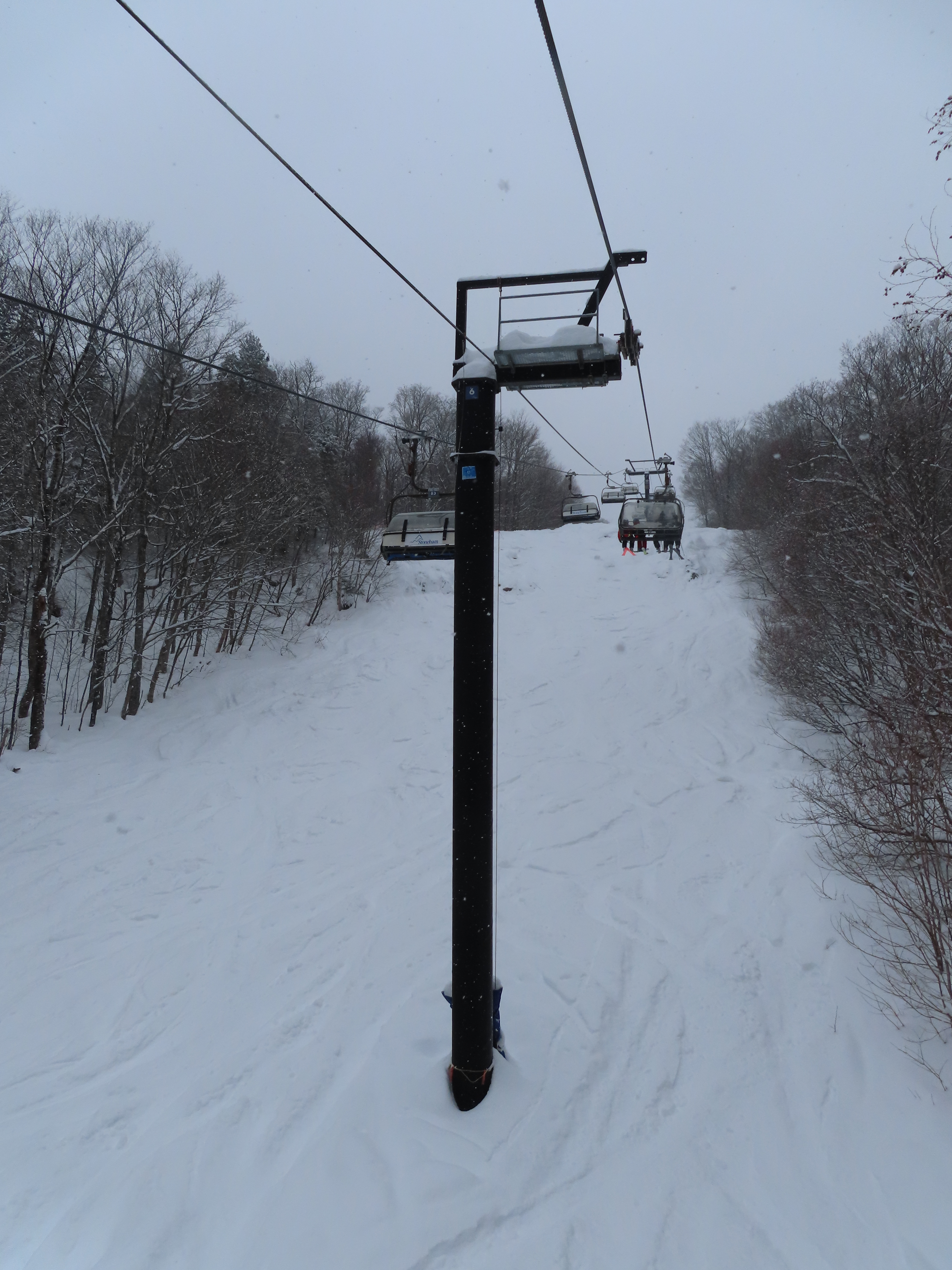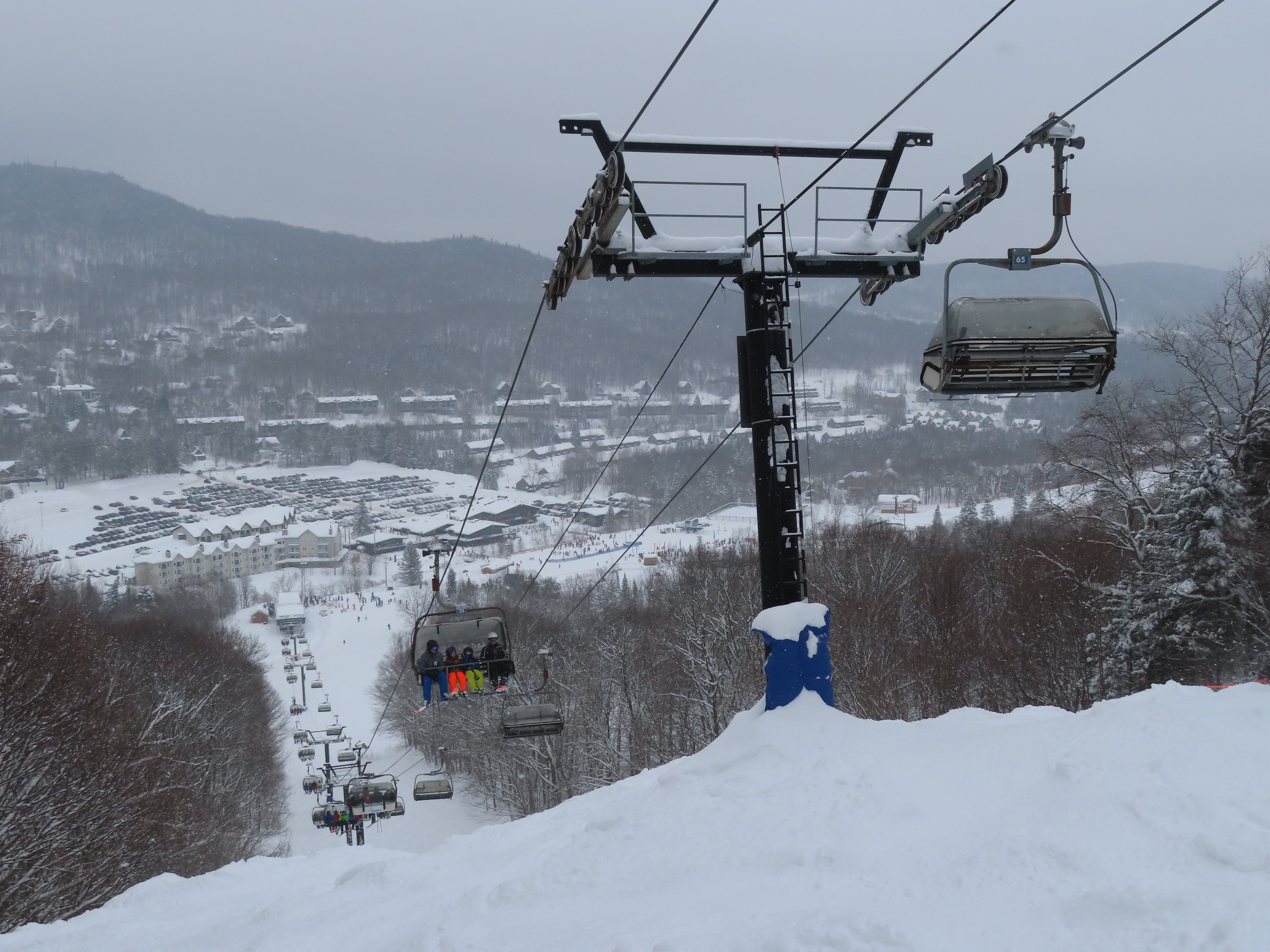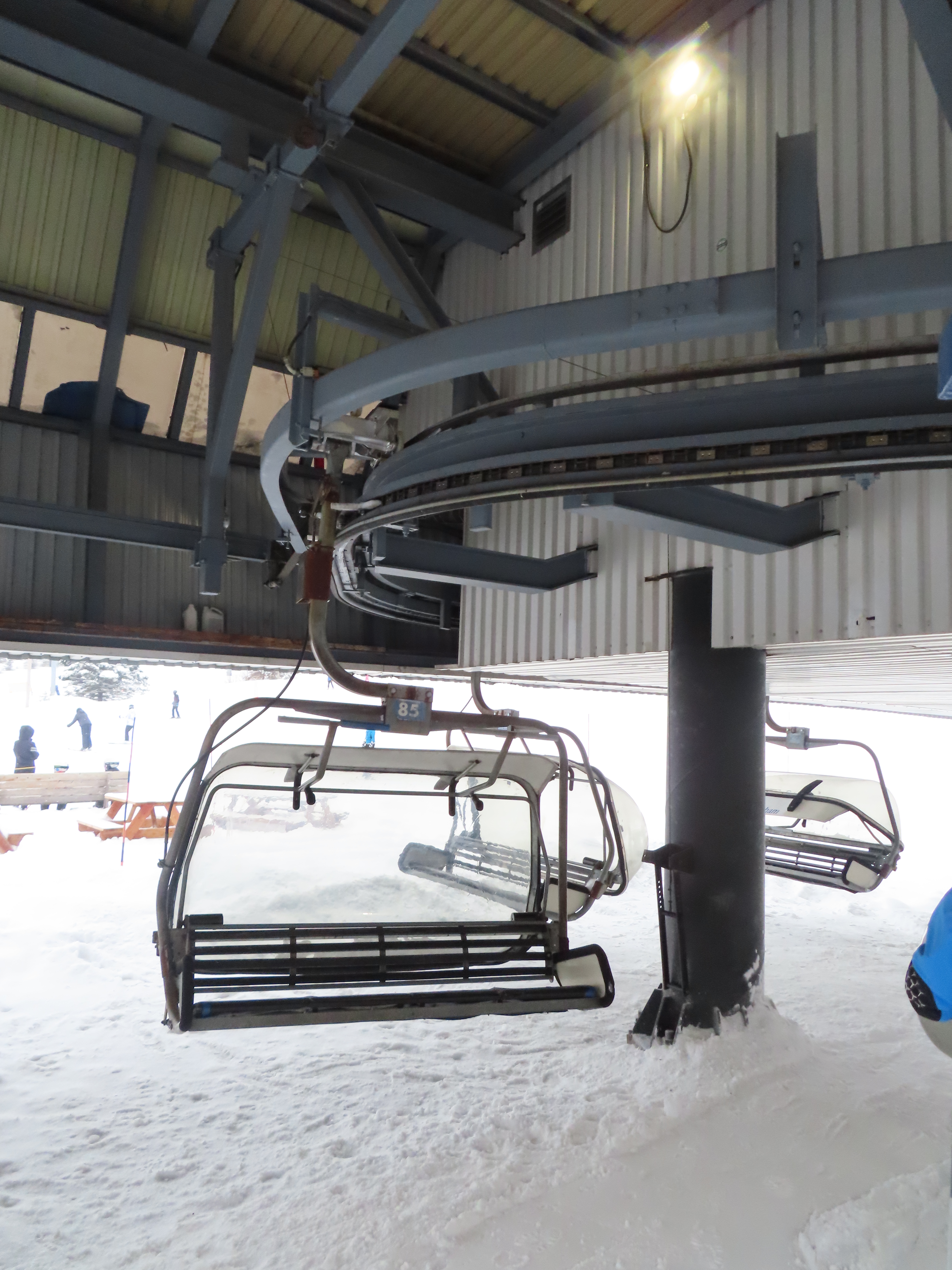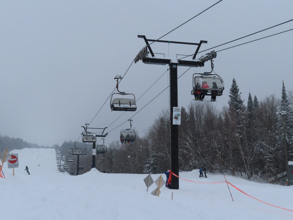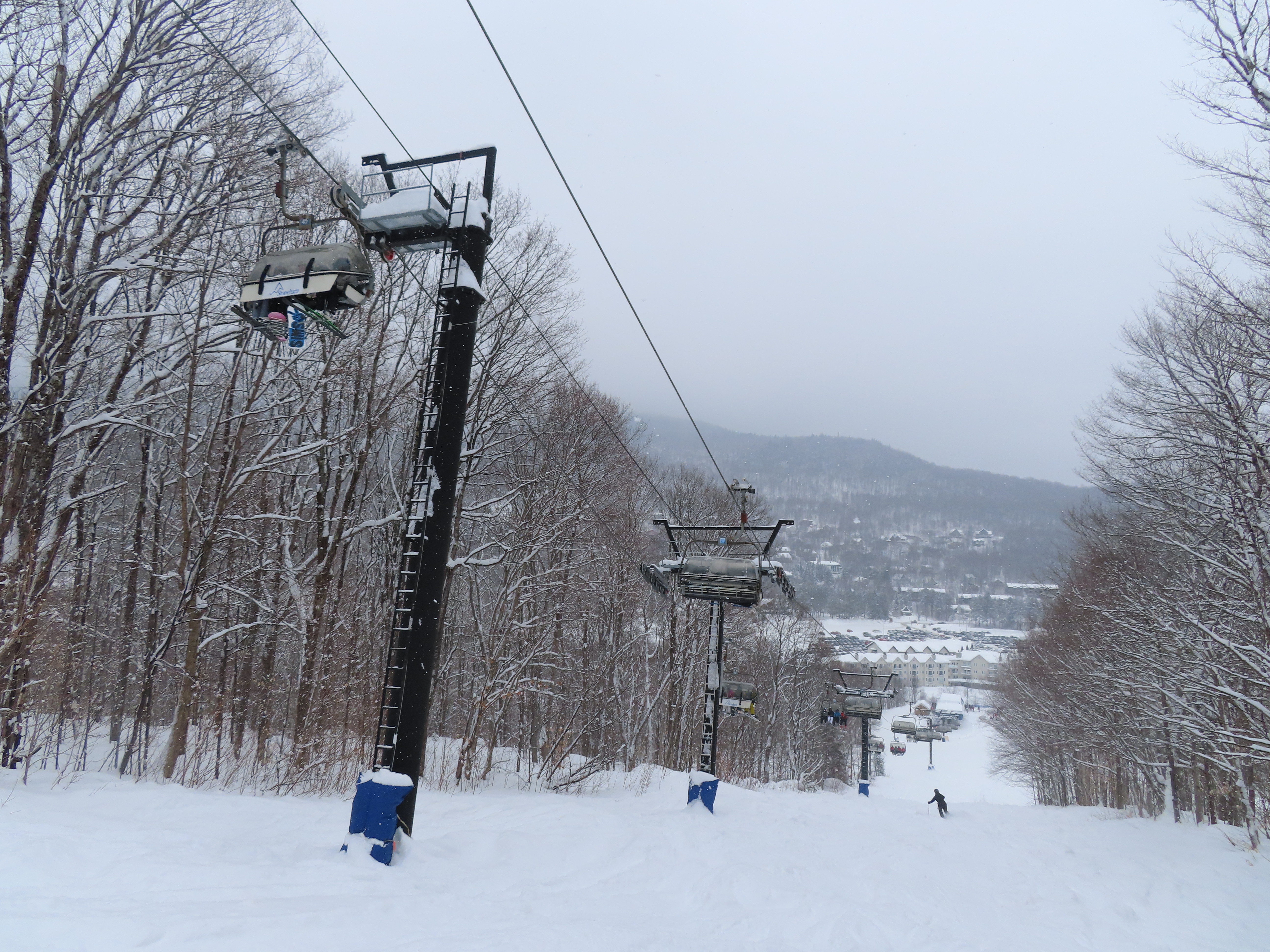 This bubble quad services the center part of the mountain and opened in 1988.Loading area.Riding up the line.There is one half tower along the line.Classic EJ bubble chair.Arriving at the top terminal.This enclosure is unique and was not used elsewhere in Canada.Side view of the upper terminal.View down near the summit.Upper part of the lift line.Looking up around half way.The lower part of the line is steeper than the upper.View towards the main village.The half tower.Towers 1 and 2.Drive terminal and tower 1.CLD-260 station.Chain-driven station.Unloading area up top.