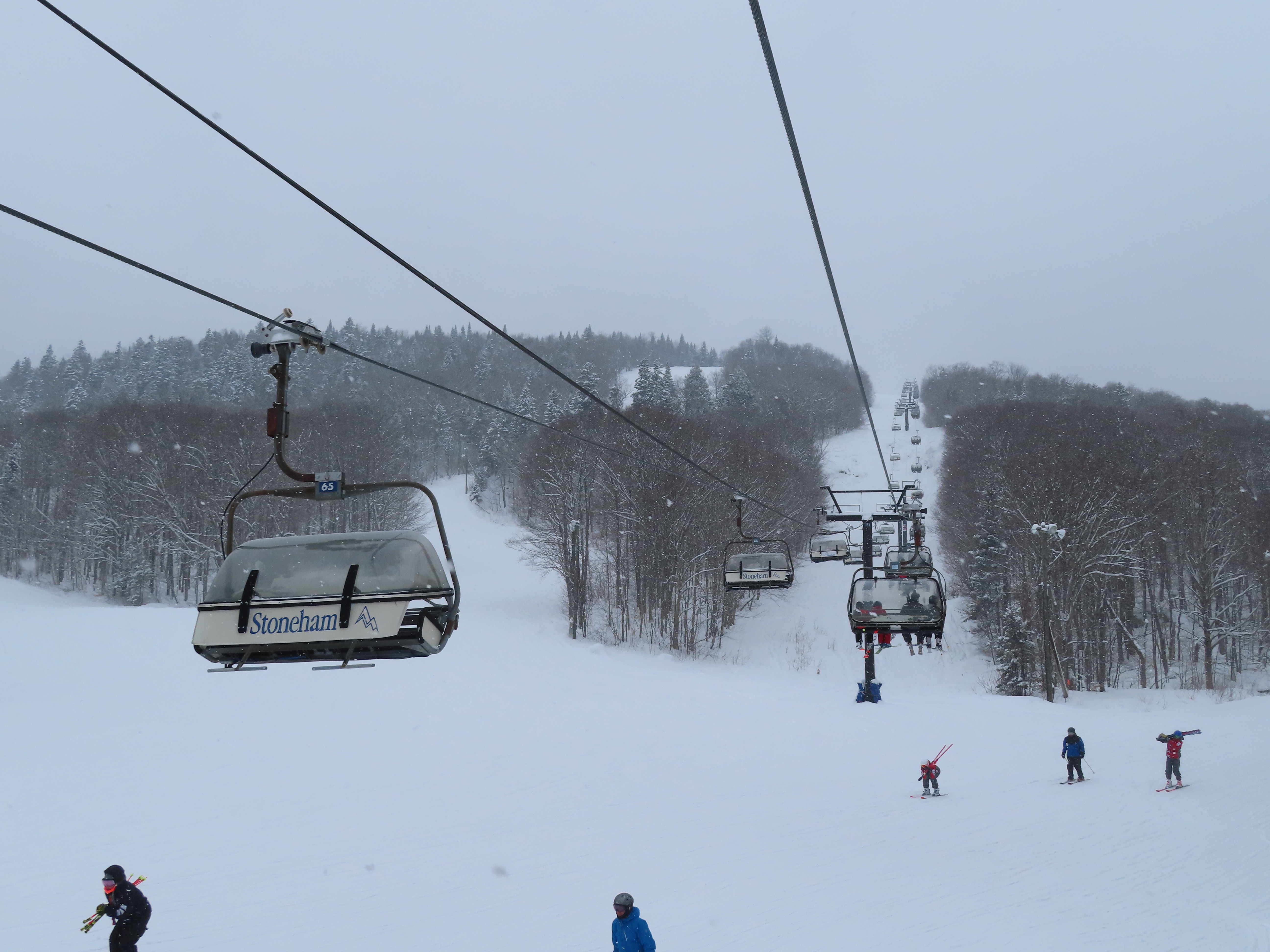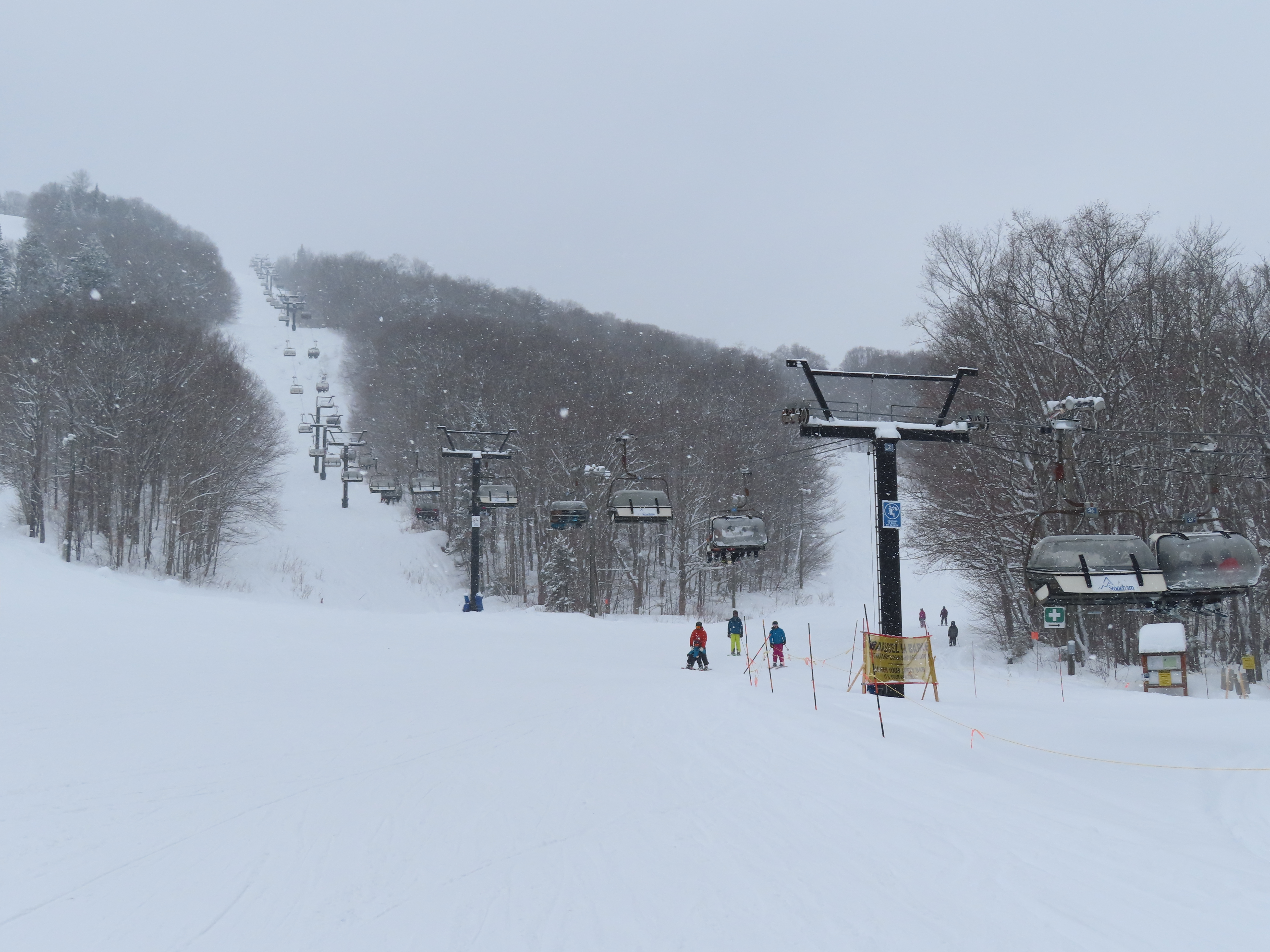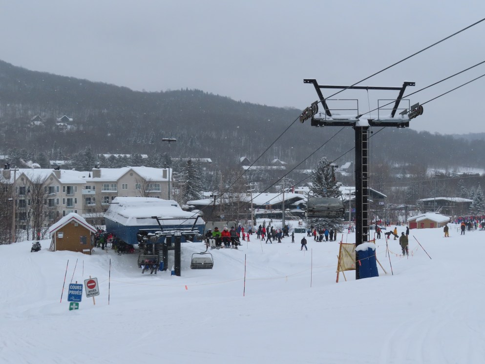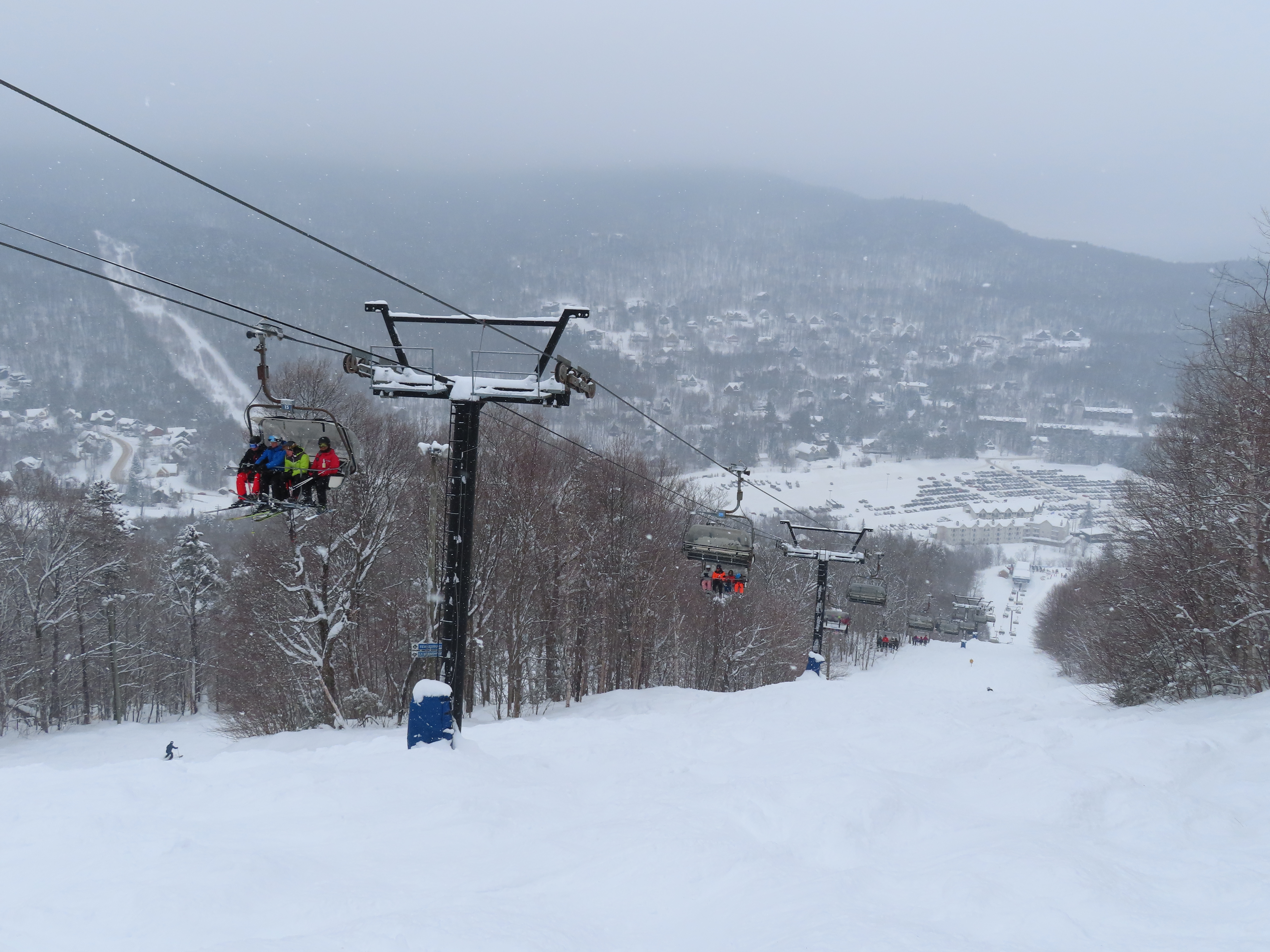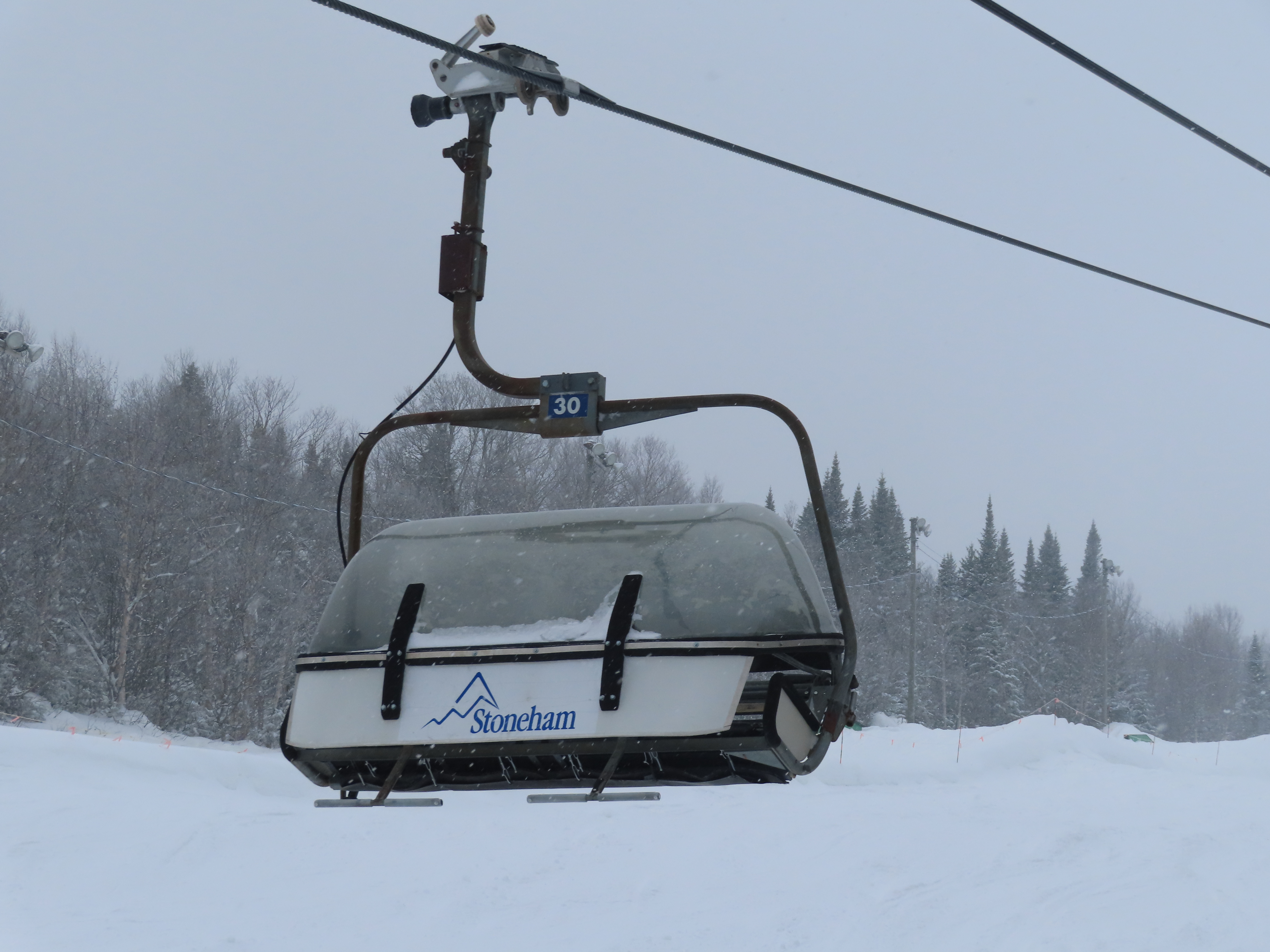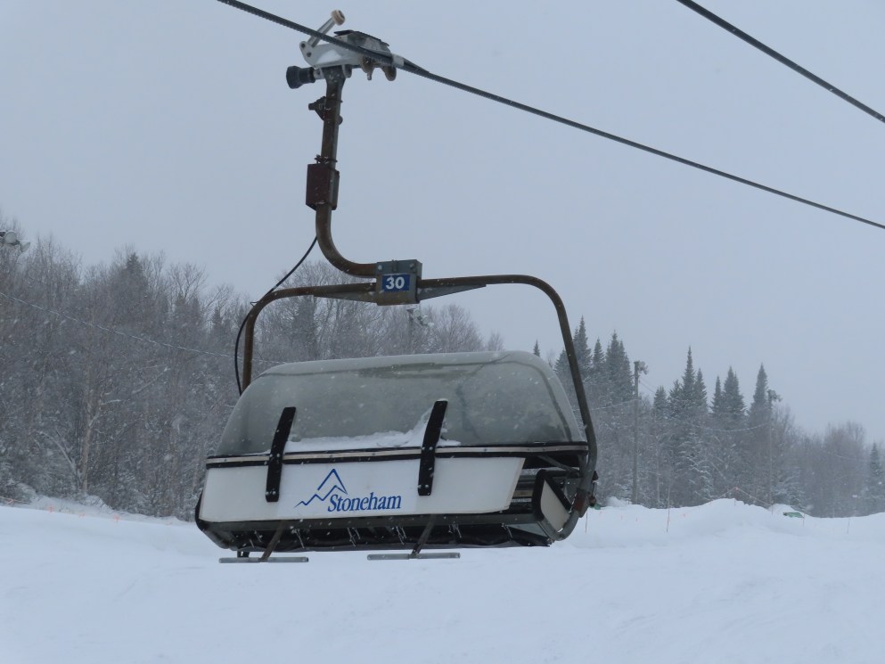 This bubble quad services the center part of the mountain and opened in 1988.Loading area.Riding up the line.There is one half tower along the line.Classic EJ bubble chair.Arriving at the top terminal.This enclosure is unique and was not used elsewhere in Canada.Side view of the upper terminal.View down near the summit.Upper part of the lift line.Looking up around half way.The lower part of the line is steeper than the upper.View towards the main village.The half tower.Towers 1 and 2.Drive terminal and tower 1.CLD-260 station.Chain-driven station.Unloading area up top.
