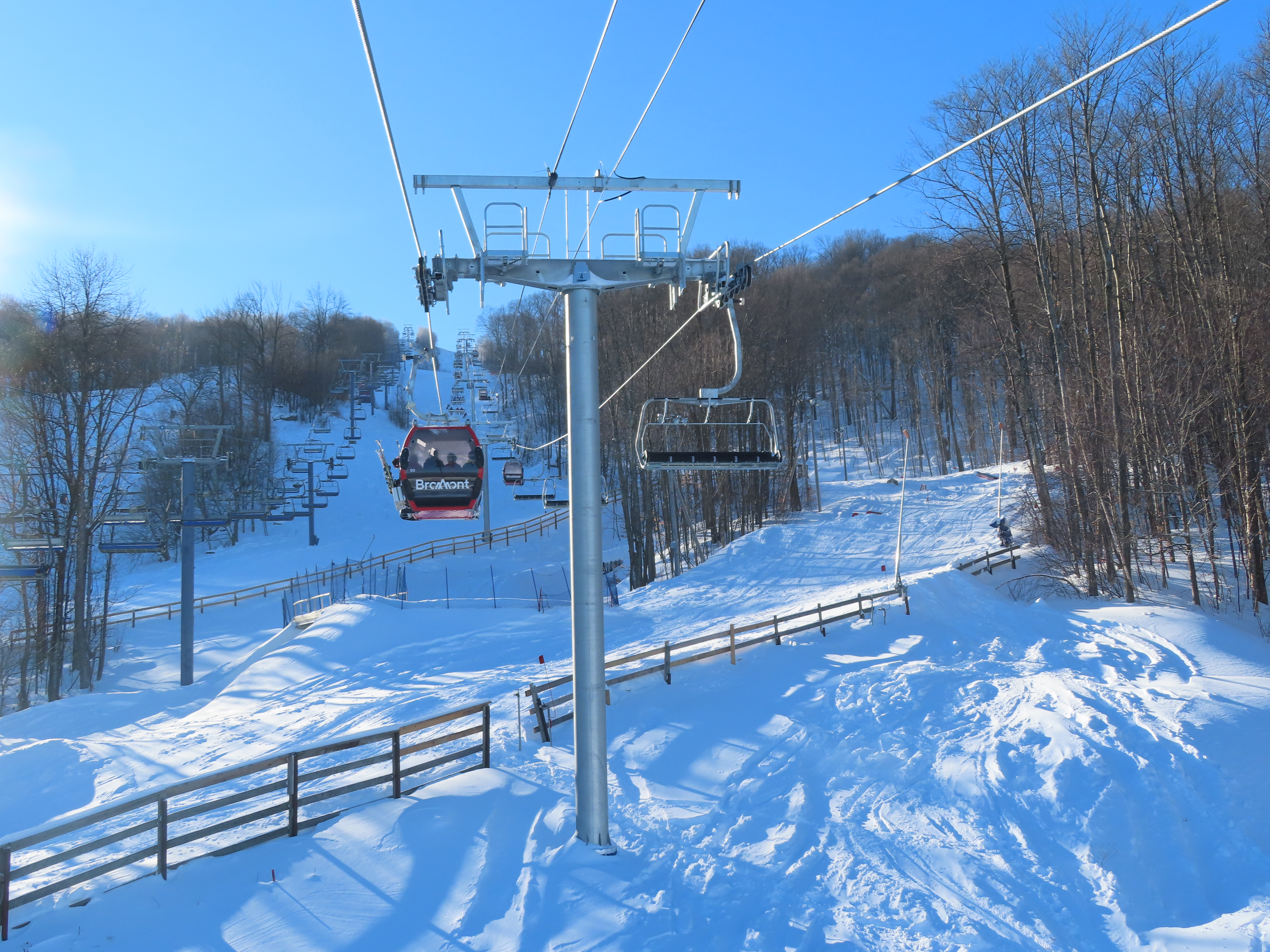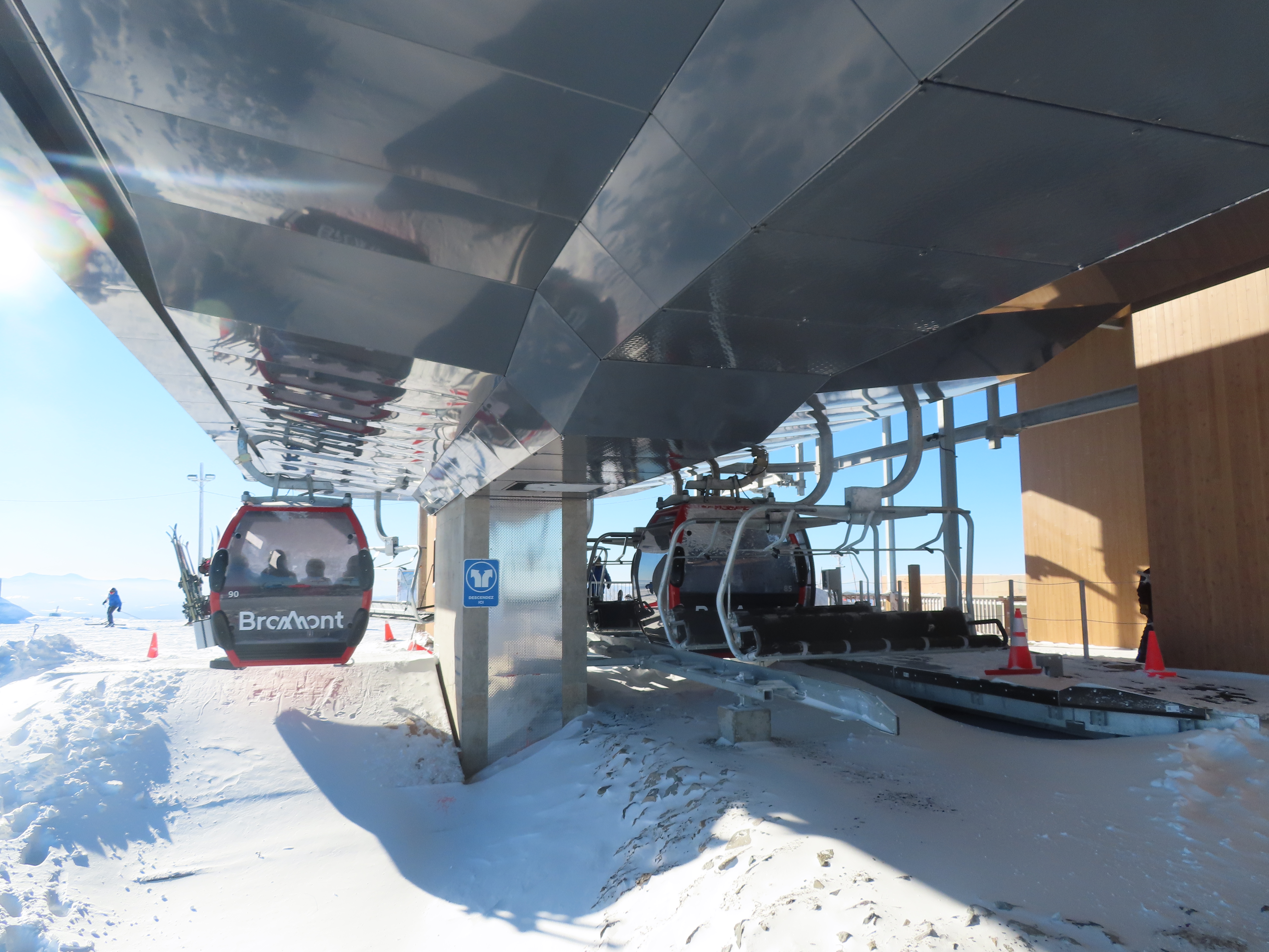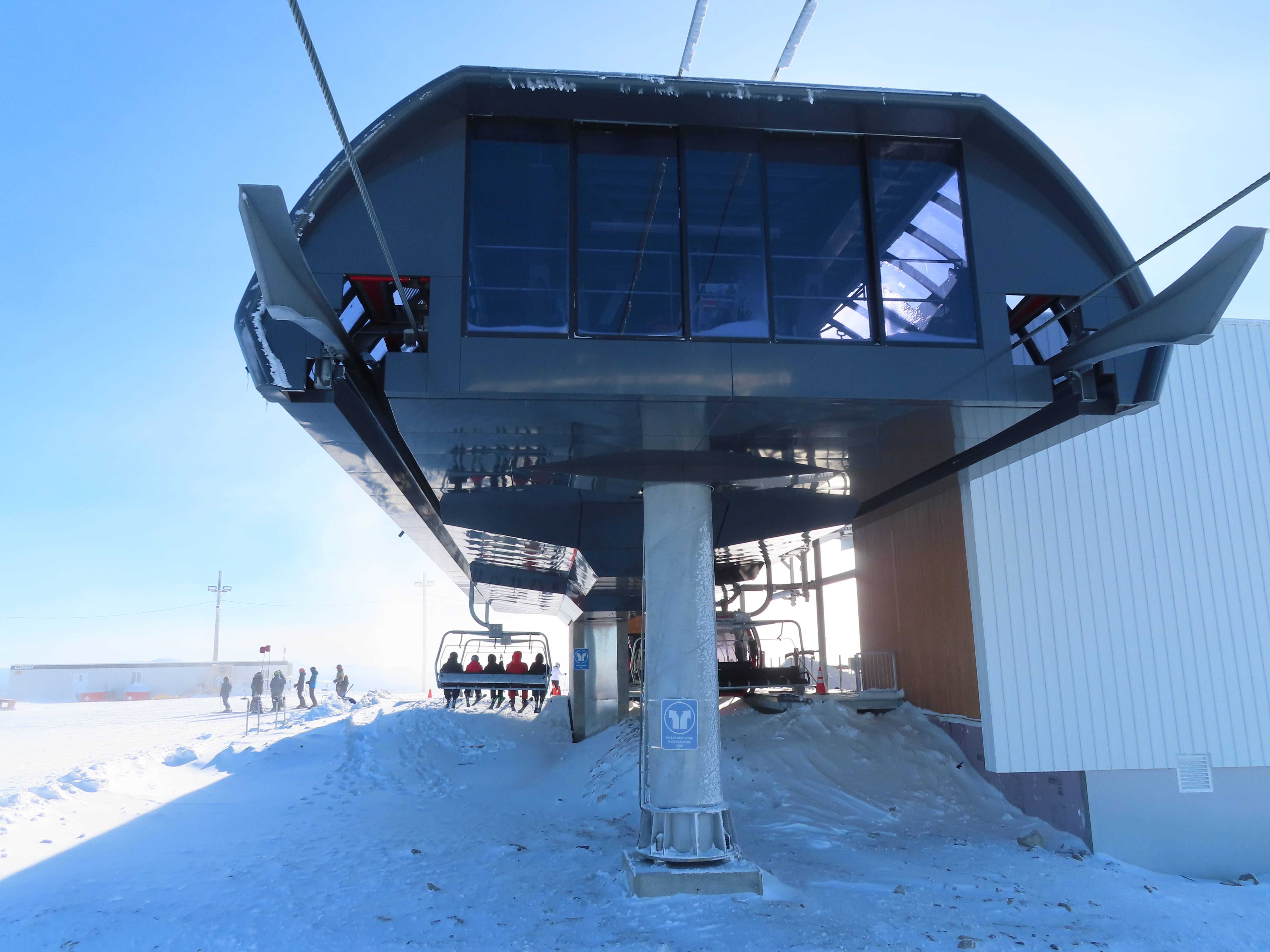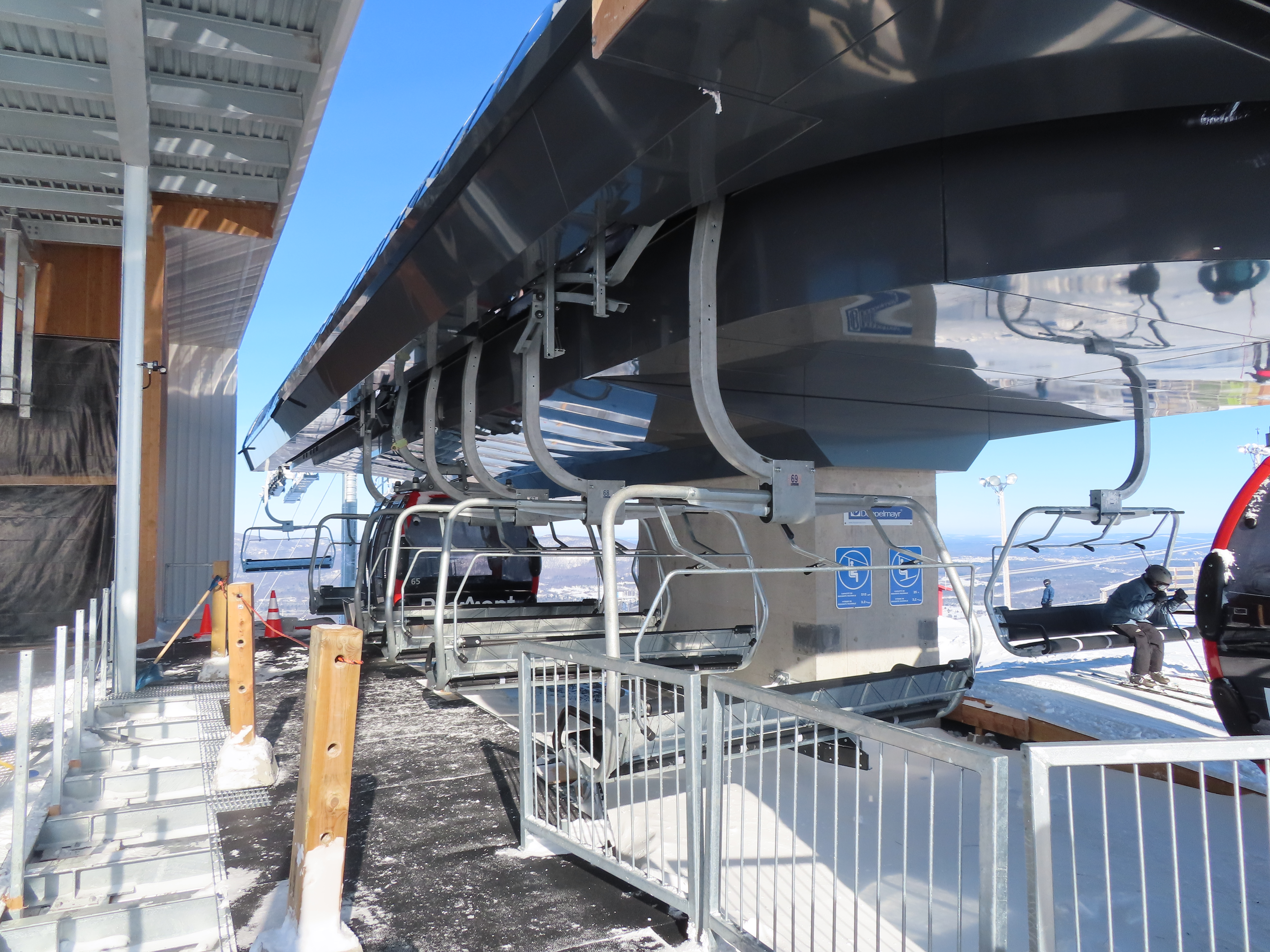 The lifting frames used on this lift (also Massif Express, the Gondola at Silverstar, Blackcomb Gondola) are the same as those used by Doppelmayr of France. Considering 3 of the 4 lifts I named were built this year, it would seem that Doppelmayr USA (at least in Canada) has phased out the Dopplemayr of Europe ones (such as those found on Powder Seeker and Ramcharger 8). Other combined lifts built by Doppelmayr USA (Beaver Creek, Mont Orford, Sunday River, Northstar) all use the Doppelmayr of Europe lifting frames – this is the first combined lift to use the Doppelmayr of France one.