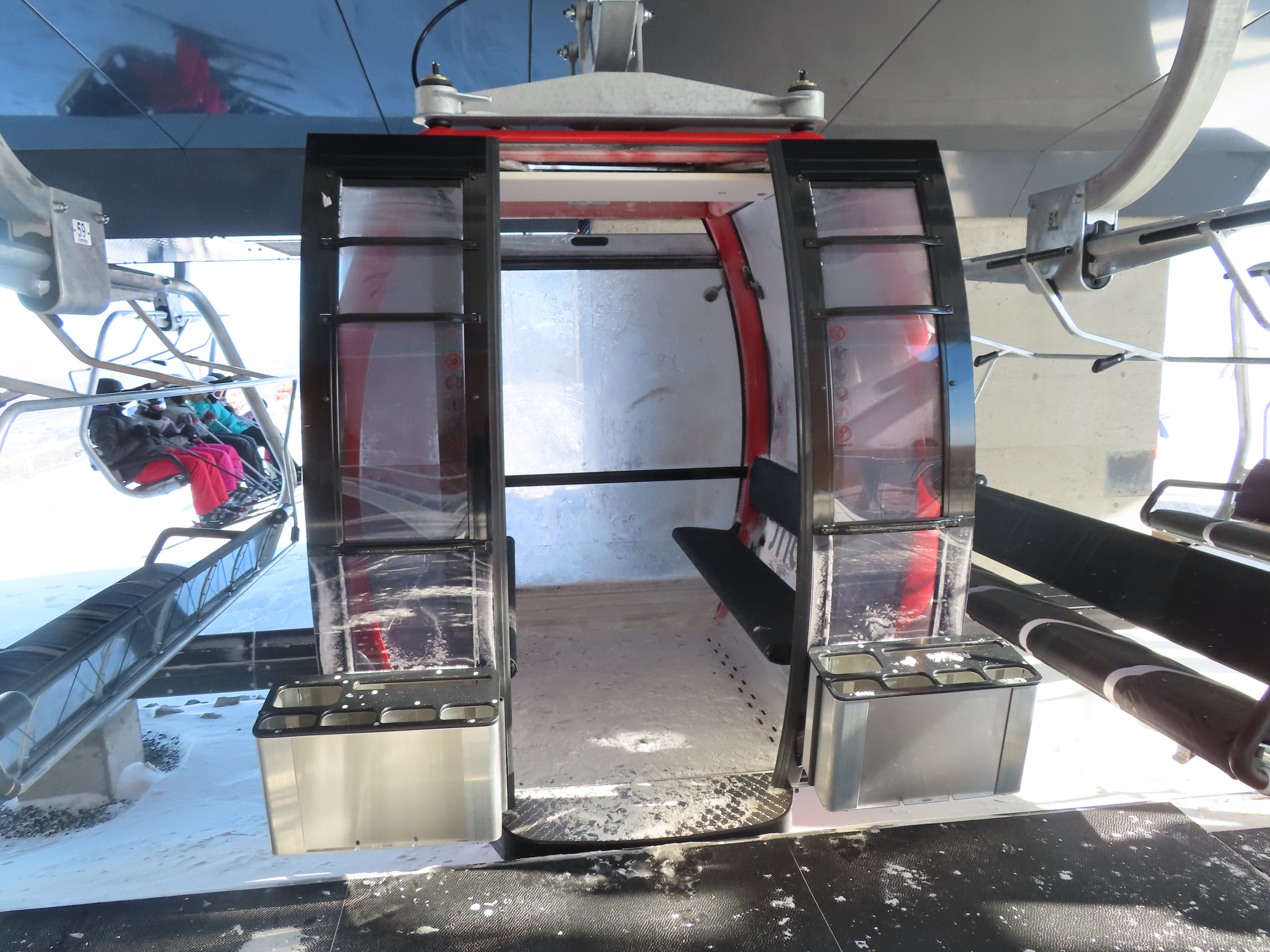 This high capacity combination lift replaced a very early model Poma high speed quad in 2018.The chair loading side has queuing gates but no loading carpet.Riding up the line.Both terminals are extremely long UNI G models to accommodate two loading/unloading areas.Side view of the drive station.There are 90 carriers total with gondolas between every four chairs.Middle part of the relatively short lift line.These tower lifting frames are relatively rare on Doppelmayr lifts.View up the line.Side view of the bottom station.The last carrier on the line. Cabin 90.Another tower.At the top, chairs unload first, followed by gondolas.Another view of the drive terminal up top.Downhill side at the return.Cabin loading area.CWA Omega IV 8 LWI cabin.Small maintenance area up top.Cabin unloading area next to a new lodge.Turnaround on the summit.Tower 12.Aerial view of the lower station.Cabin loading at the base area.The terminal is incredibly long.Chairs approaching the loading zone in the bottom terminal.View of both load zones.Tower 1.T3.Arriving at the top.Another section of the lift line.Lift overview.