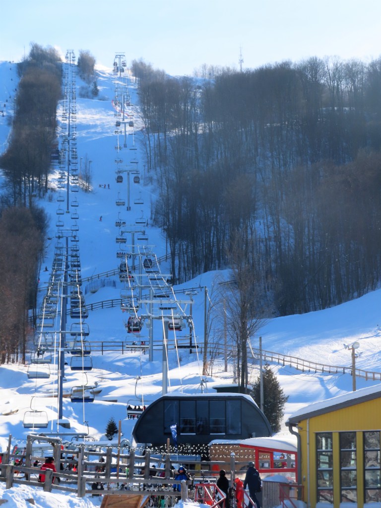 This high capacity combination lift replaced a very early model Poma high speed quad in 2018.The chair loading side has queuing gates but no loading carpet.Riding up the line.Both terminals are extremely long UNI G models to accommodate two loading/unloading areas.Side view of the drive station.There are 90 carriers total with gondolas between every four chairs.Middle part of the relatively short lift line.These tower lifting frames are relatively rare on Doppelmayr lifts.View up the line.Side view of the bottom station.The last carrier on the line. Cabin 90.Another tower.At the top, chairs unload first, followed by gondolas.Another view of the drive terminal up top.Downhill side at the return.Cabin loading area.CWA Omega IV 8 LWI cabin.Small maintenance area up top.Cabin unloading area next to a new lodge.Turnaround on the summit.Tower 12.Aerial view of the lower station.Cabin loading at the base area.The terminal is incredibly long.Chairs approaching the loading zone in the bottom terminal.View of both load zones.Tower 1.T3.Arriving at the top.Another section of the lift line.Lift overview.