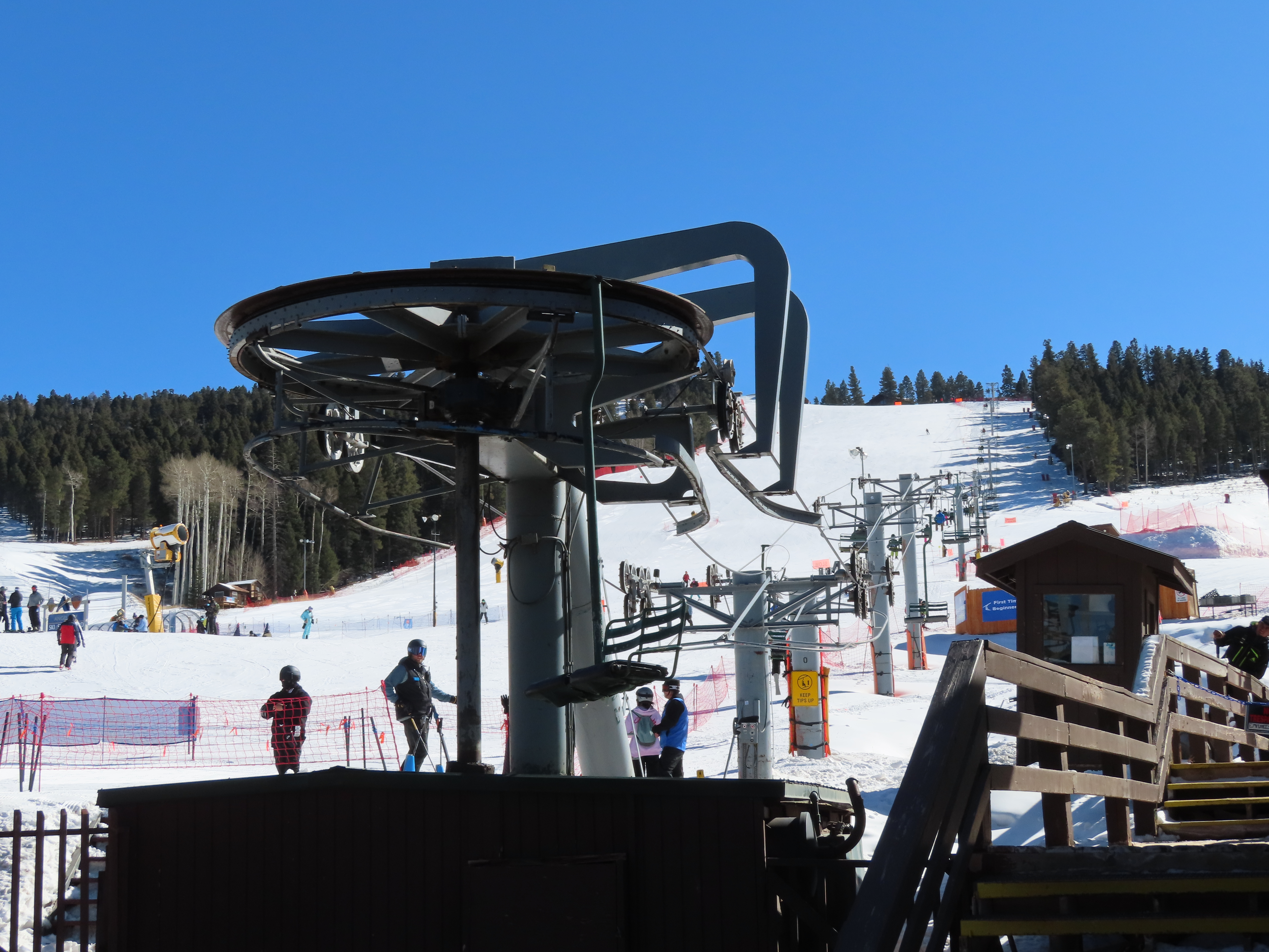 Lift 2 is one of the original lifts from Angel Fire’s opening season, which included a total of five lifts.View up the lift line.Tower 2.Vault drive.Side view of the bottom bullwheel.Arriving at the unload ramp.Like many early Riblets, the top bullwheel is well above the unload point.View down the line.Middle part of the lift.Another view of the lift line.Lift overview during this lift’s last season.