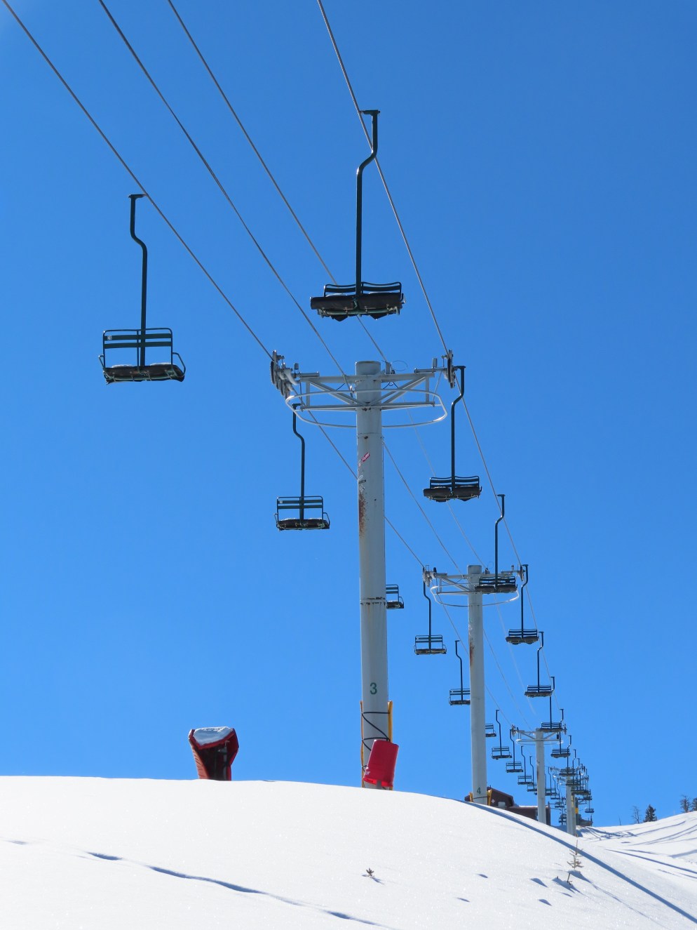 This Riblet double used to be part of a required two lift ride out of the backside of the mountain. Now, it is a dedicated terrain park lift.