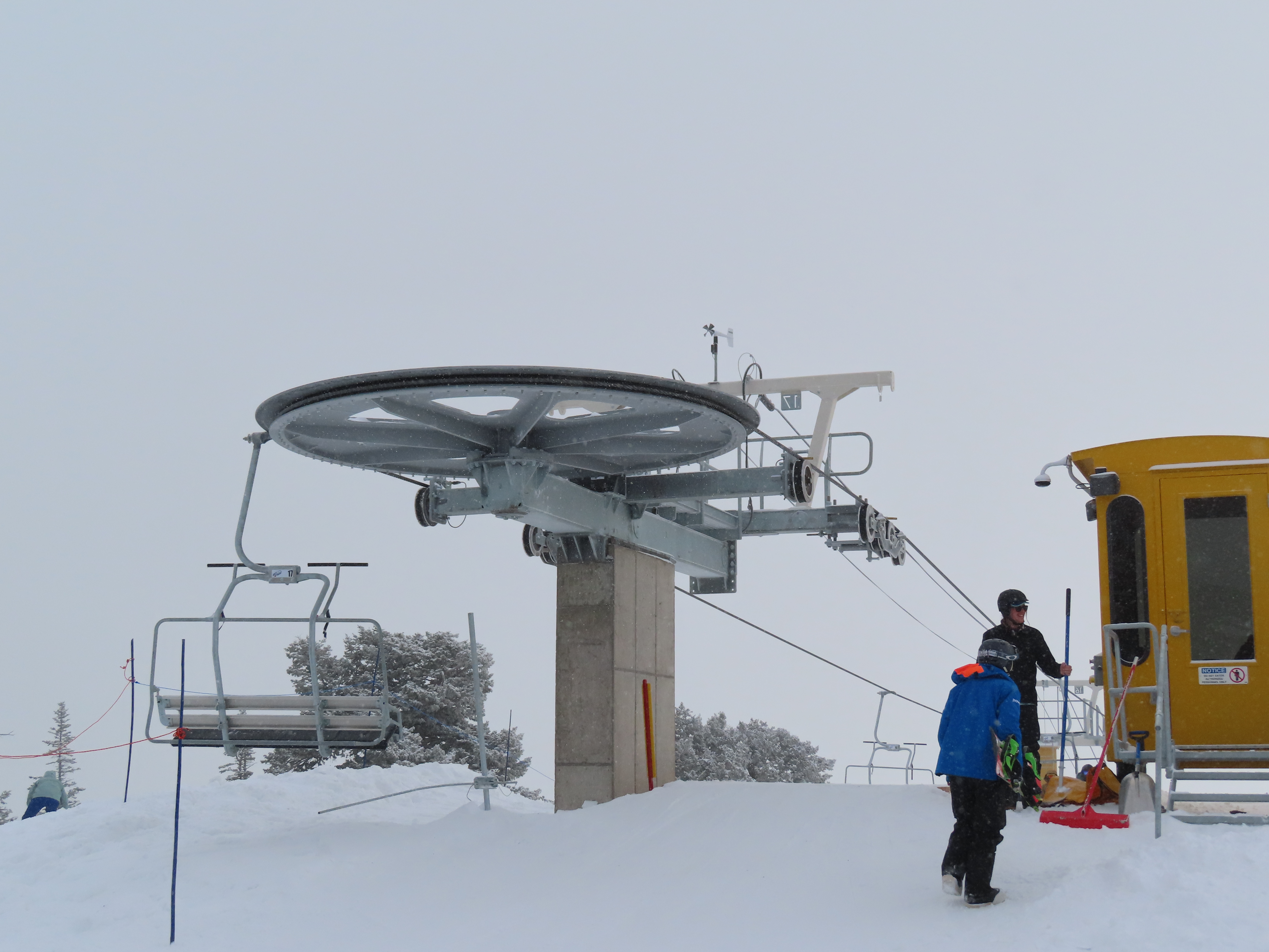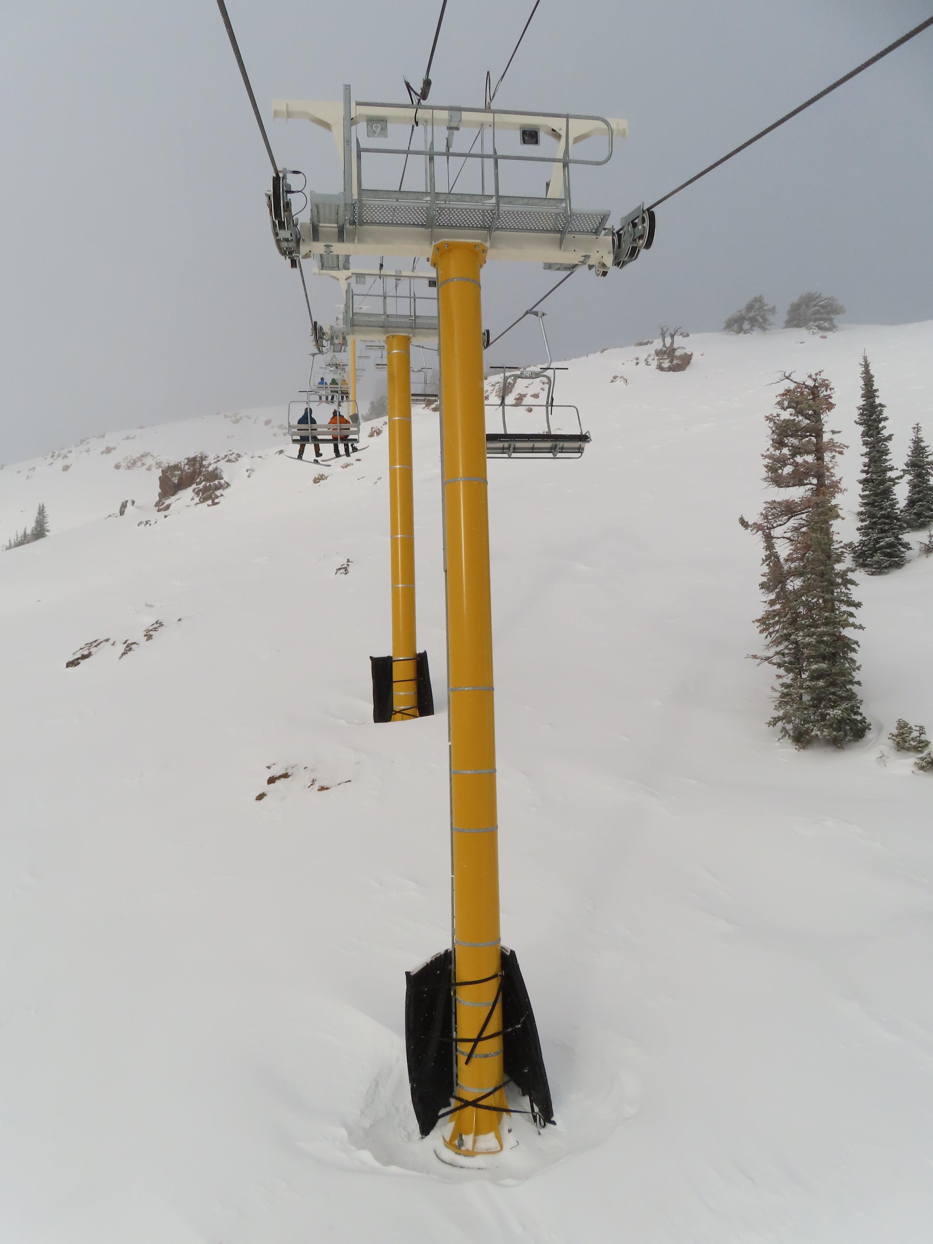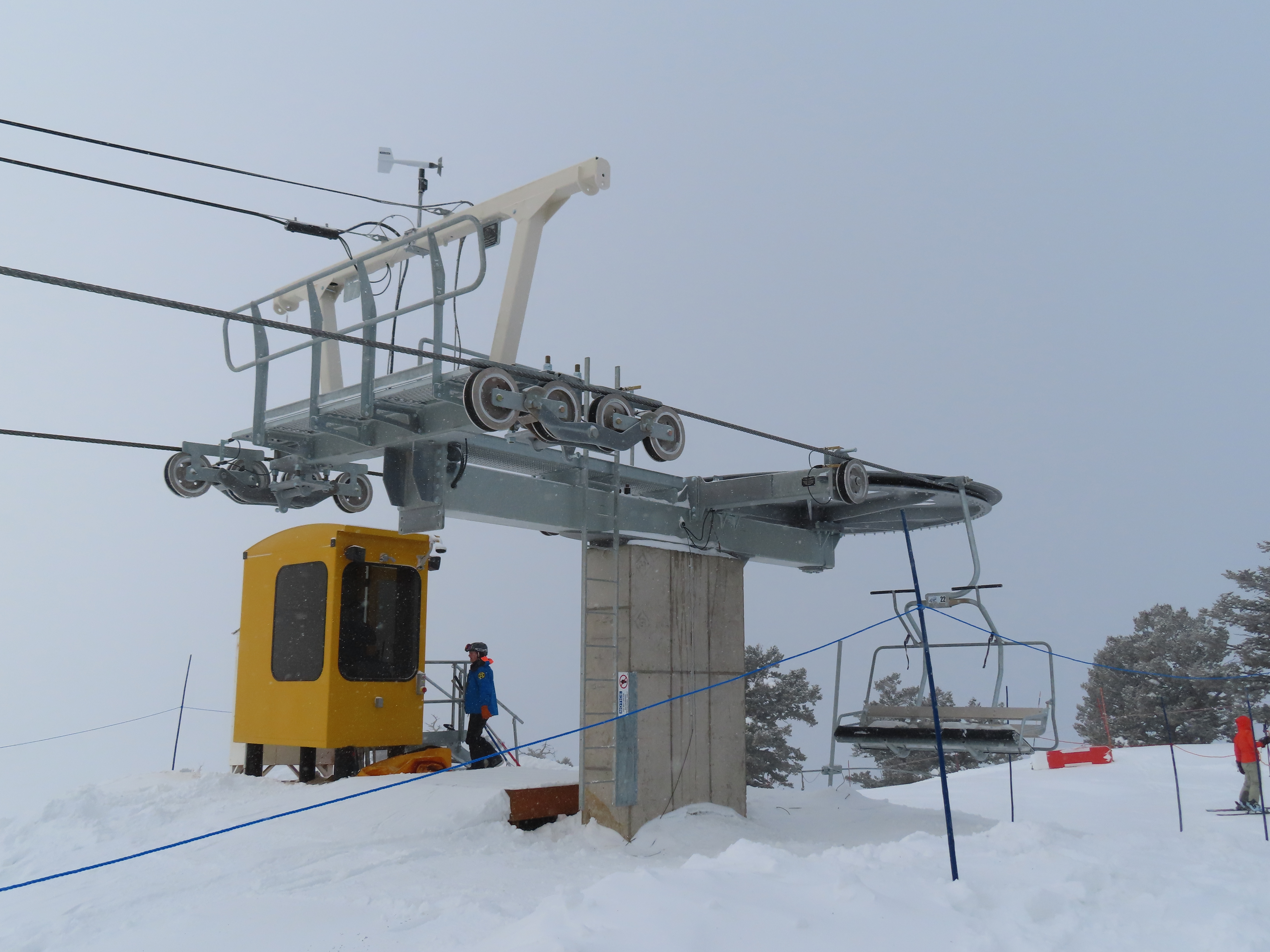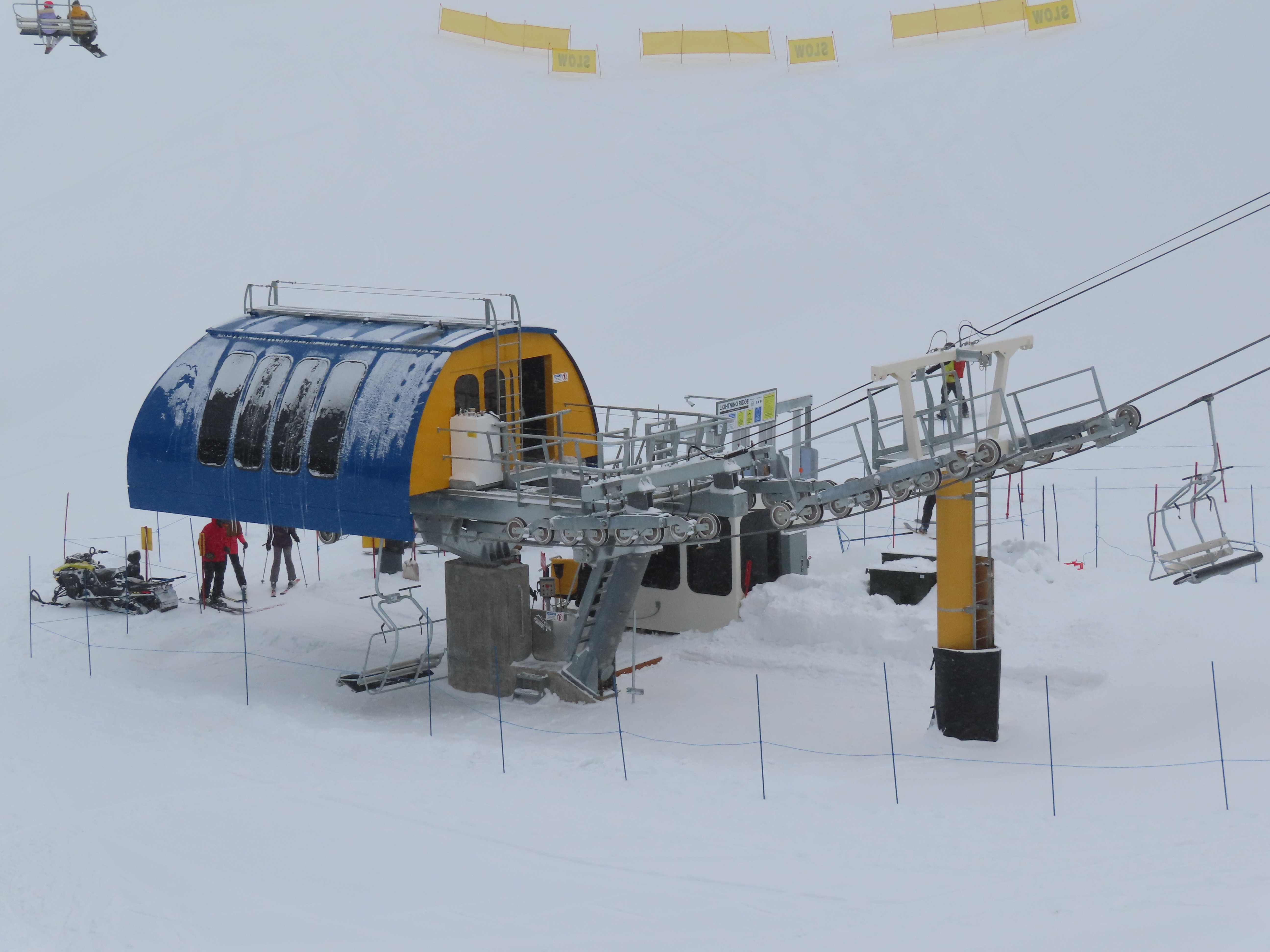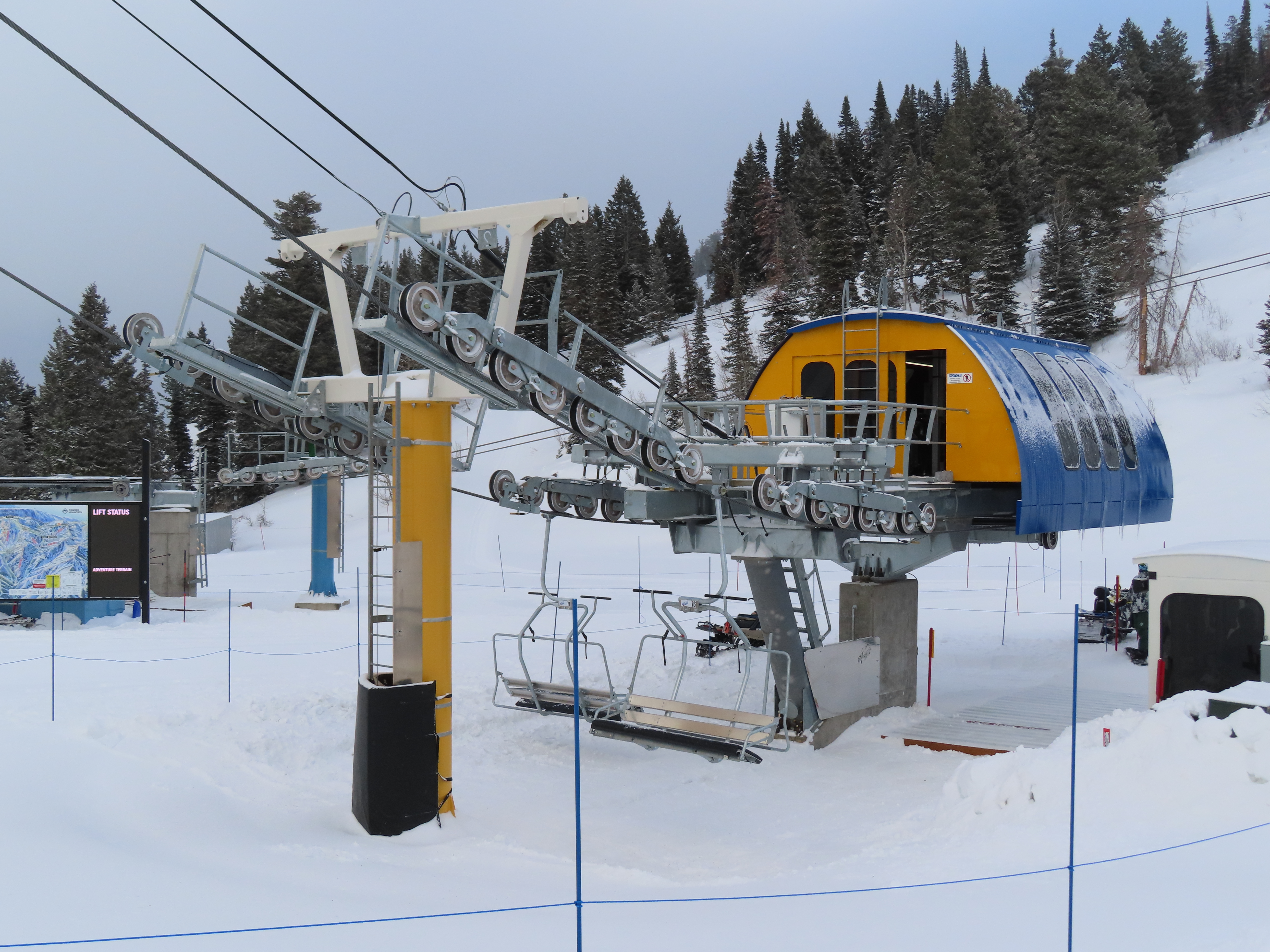 This lift services previously hike-to terrain and was one of four new lifts to open for the 2024-25 season at Powder Mountain.Unlike most lifts at PowMow, this one is bottom drive.Drive bullwheel and loading ramp.As part of new owner Reed Hastings’ art initiative, this lift was painted blue, yellow and white.White tower head.Breakover towers on Lightning Ridge.Fixed top bullwheel.Upper station overview.View from the summit.Looking down the steep lift line.Upper lift line.Lower lift line.The first few towers.Drive station seen from above.Lift overview.Arriving at the top station.View near the summit.Middle section of the line.Upper lift line.The entire lift seen from across the valley.