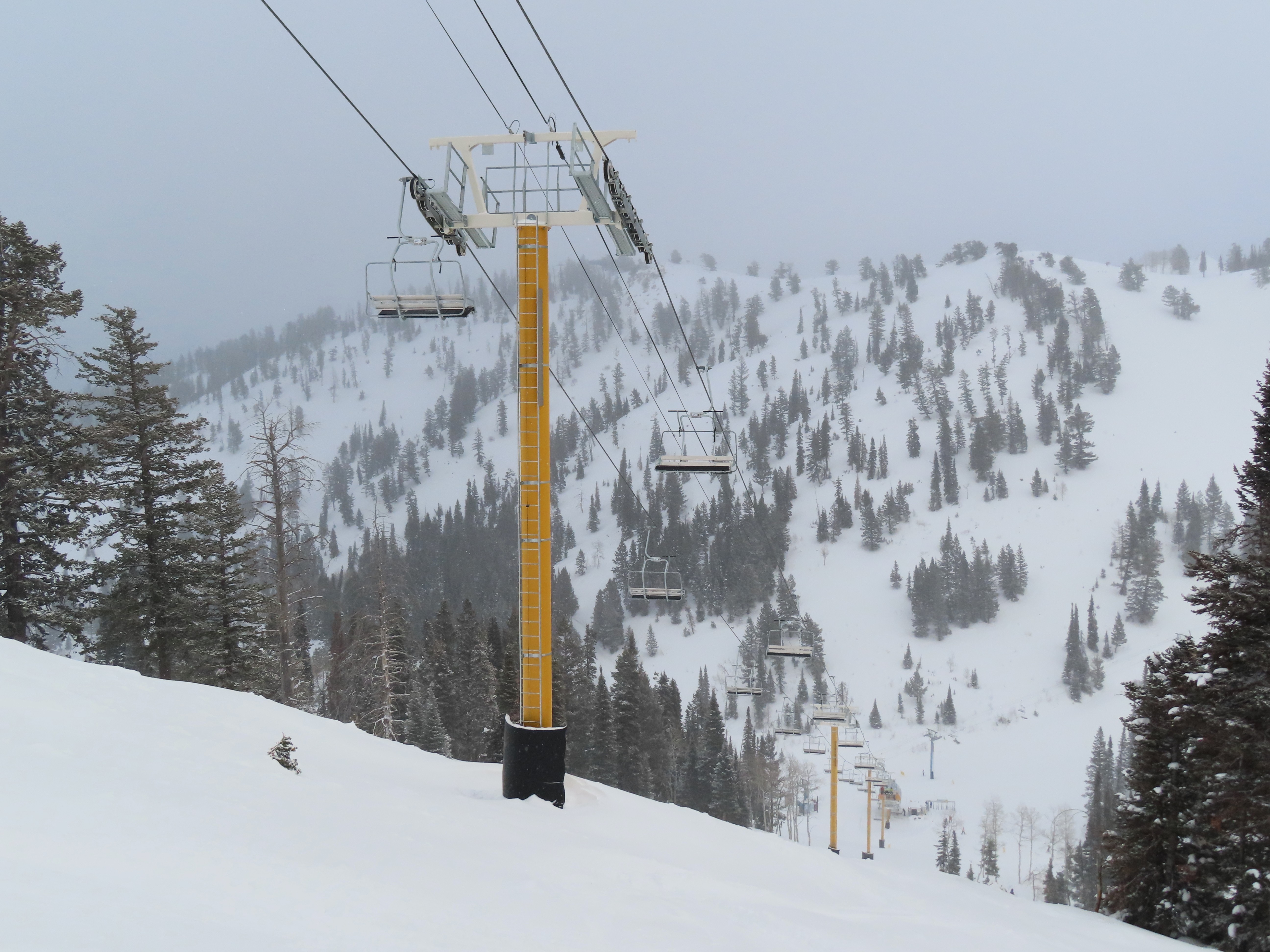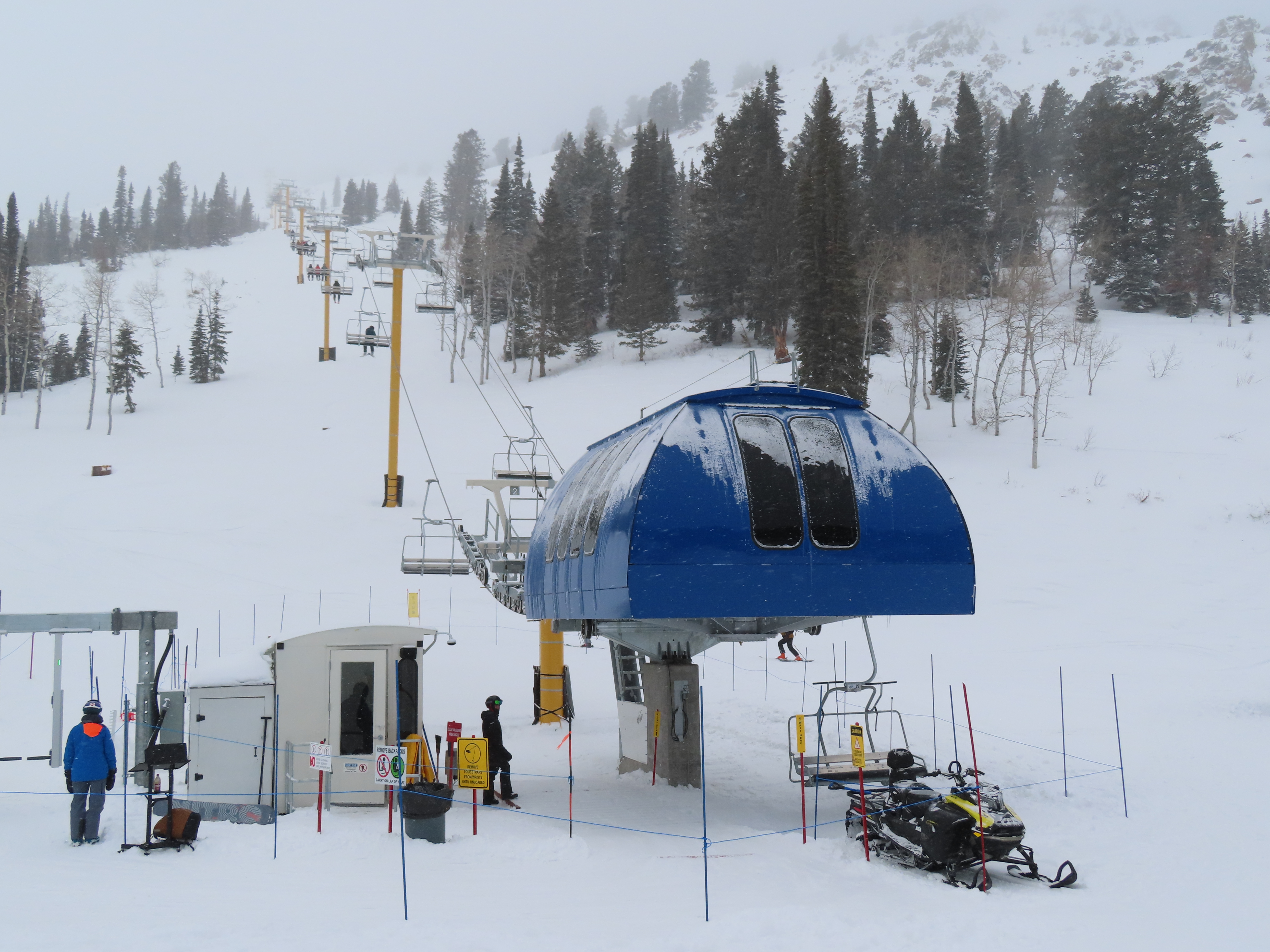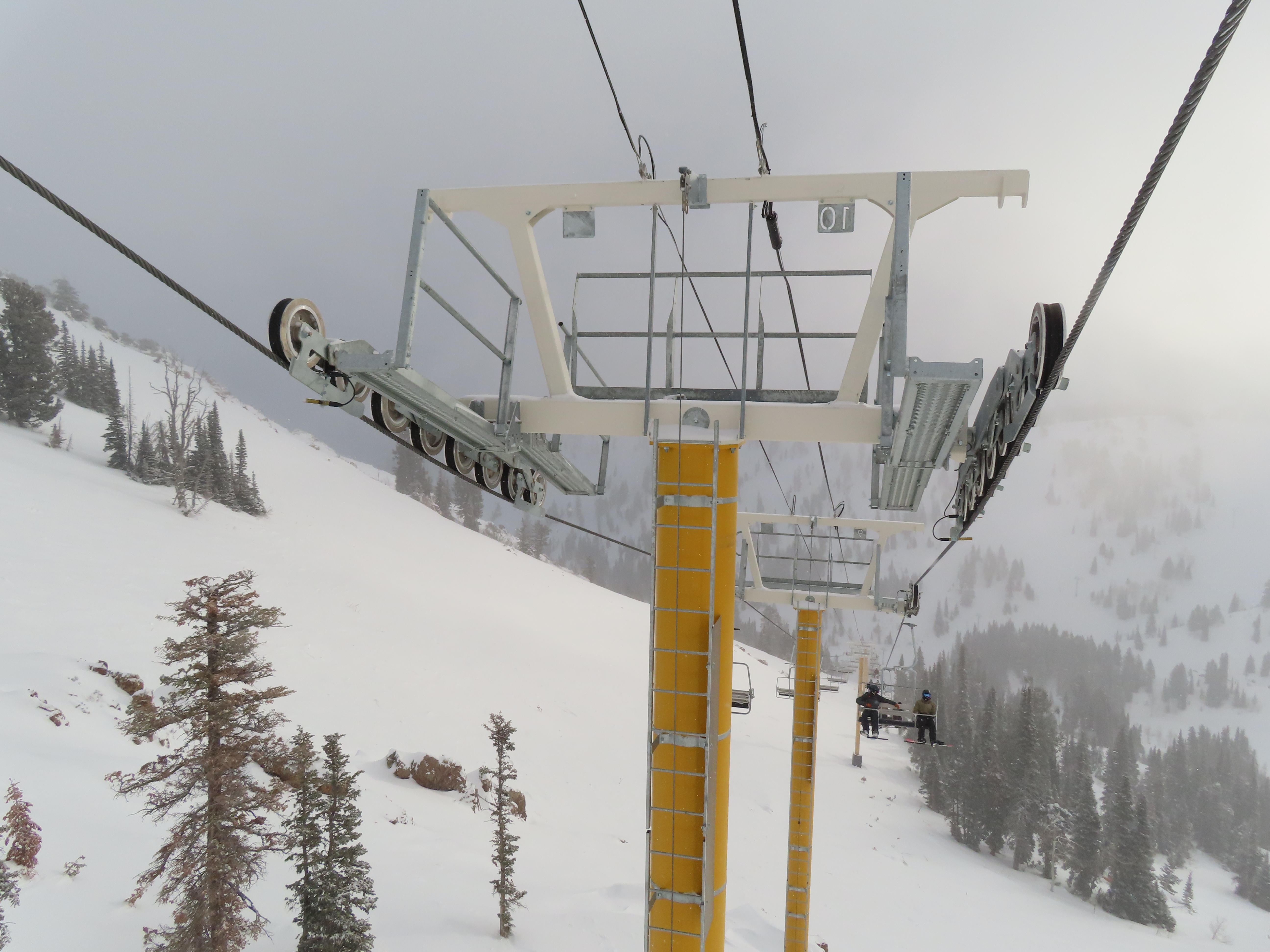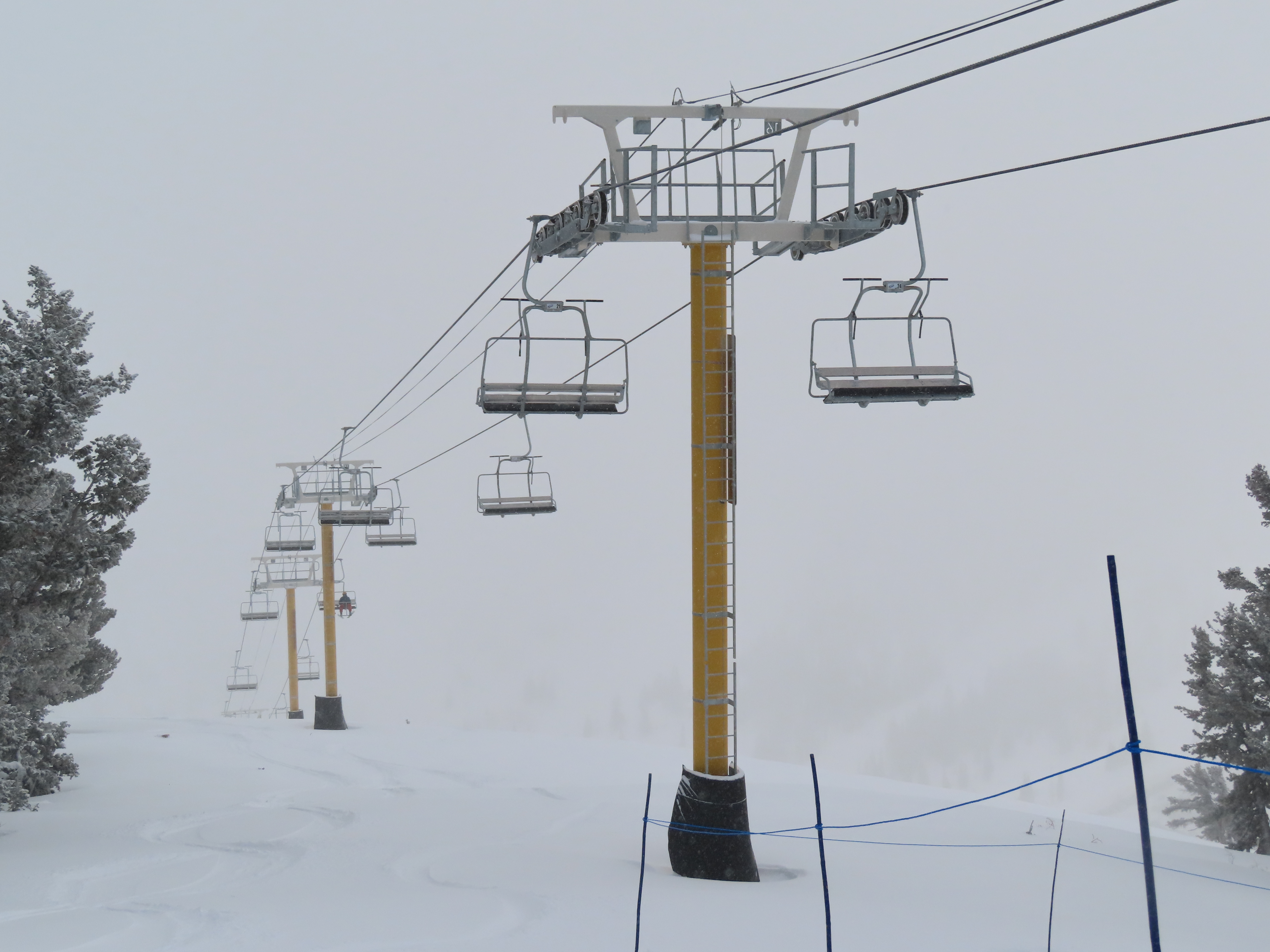 This lift services previously hike-to terrain and was one of four new lifts to open for the 2024-25 season at Powder Mountain.Unlike most lifts at PowMow, this one is bottom drive.Drive bullwheel and loading ramp.As part of new owner Reed Hastings’ art initiative, this lift was painted blue, yellow and white.White tower head.Breakover towers on Lightning Ridge.Fixed top bullwheel.Upper station overview.View from the summit.Looking down the steep lift line.Upper lift line.Lower lift line.The first few towers.Drive station seen from above.Lift overview.Arriving at the top station.View near the summit.Middle section of the line.Upper lift line.The entire lift seen from across the valley.