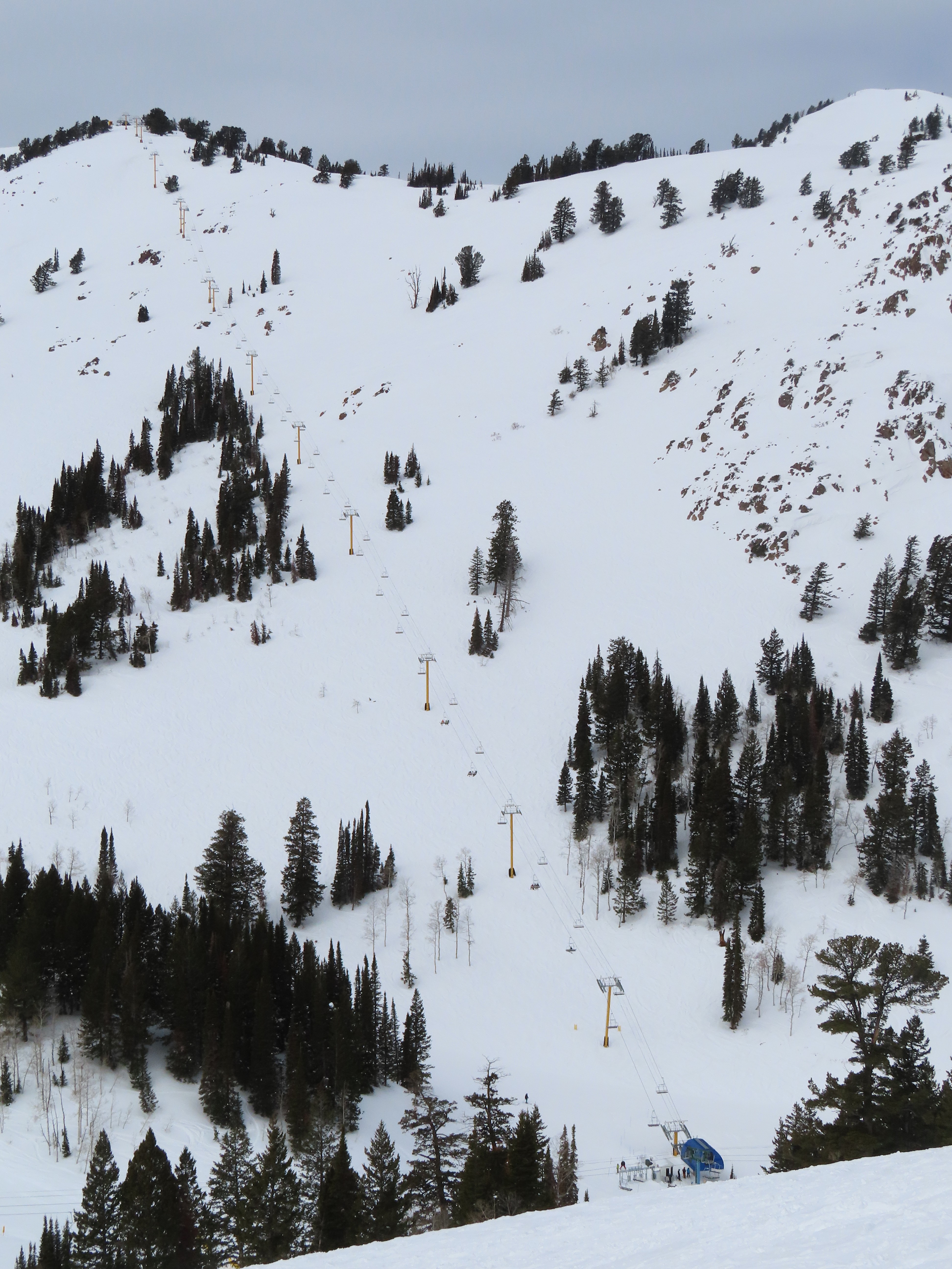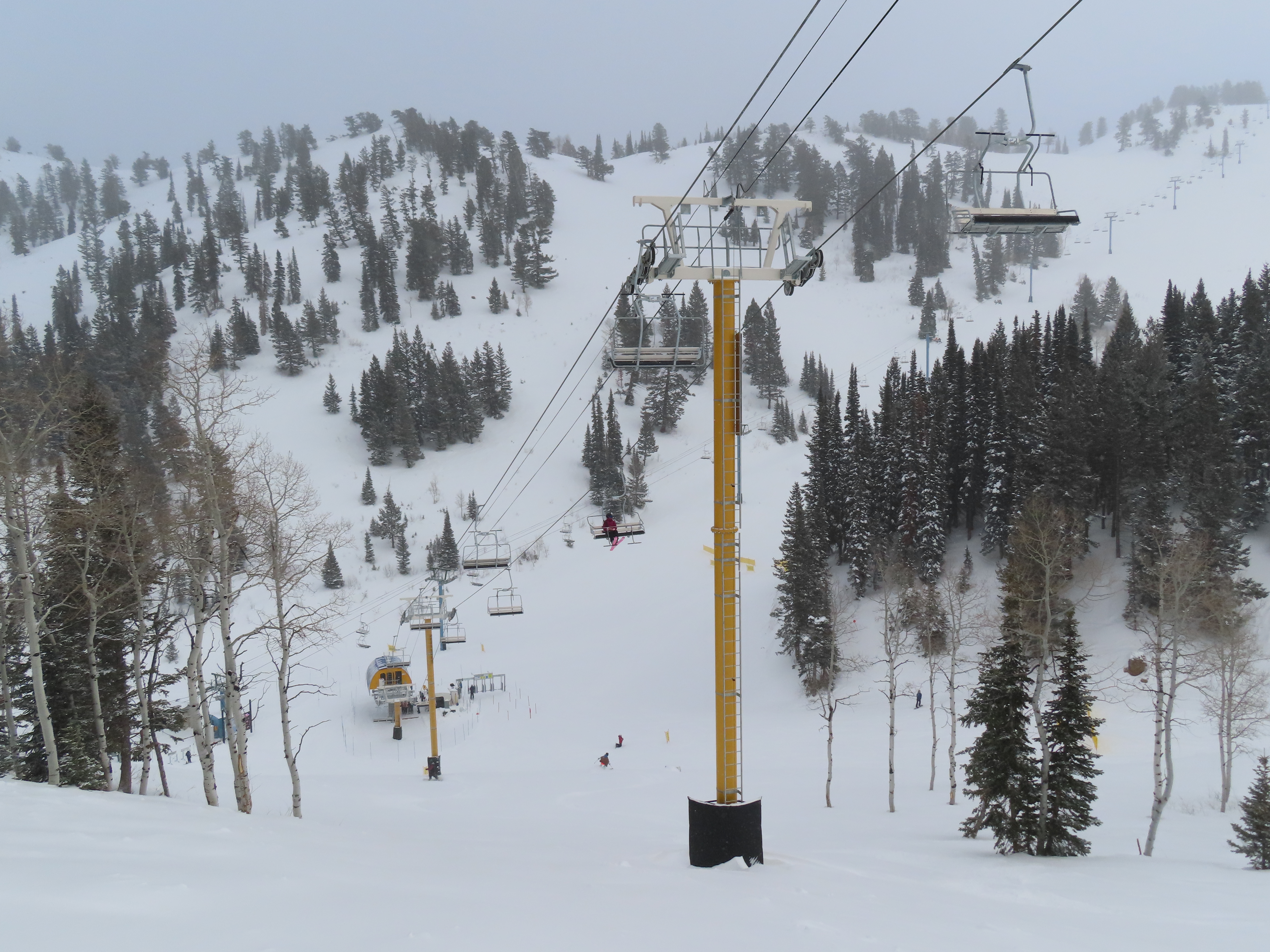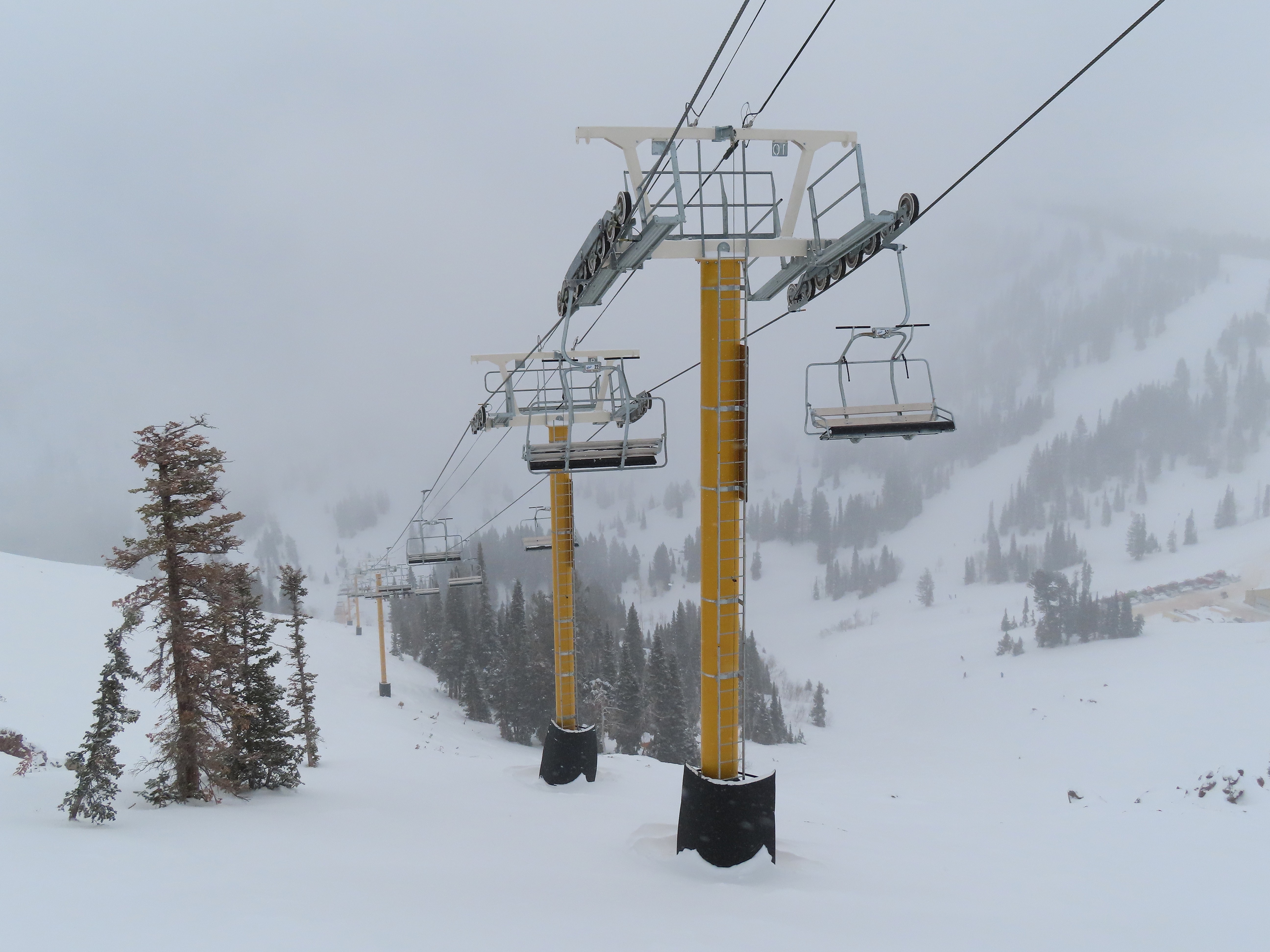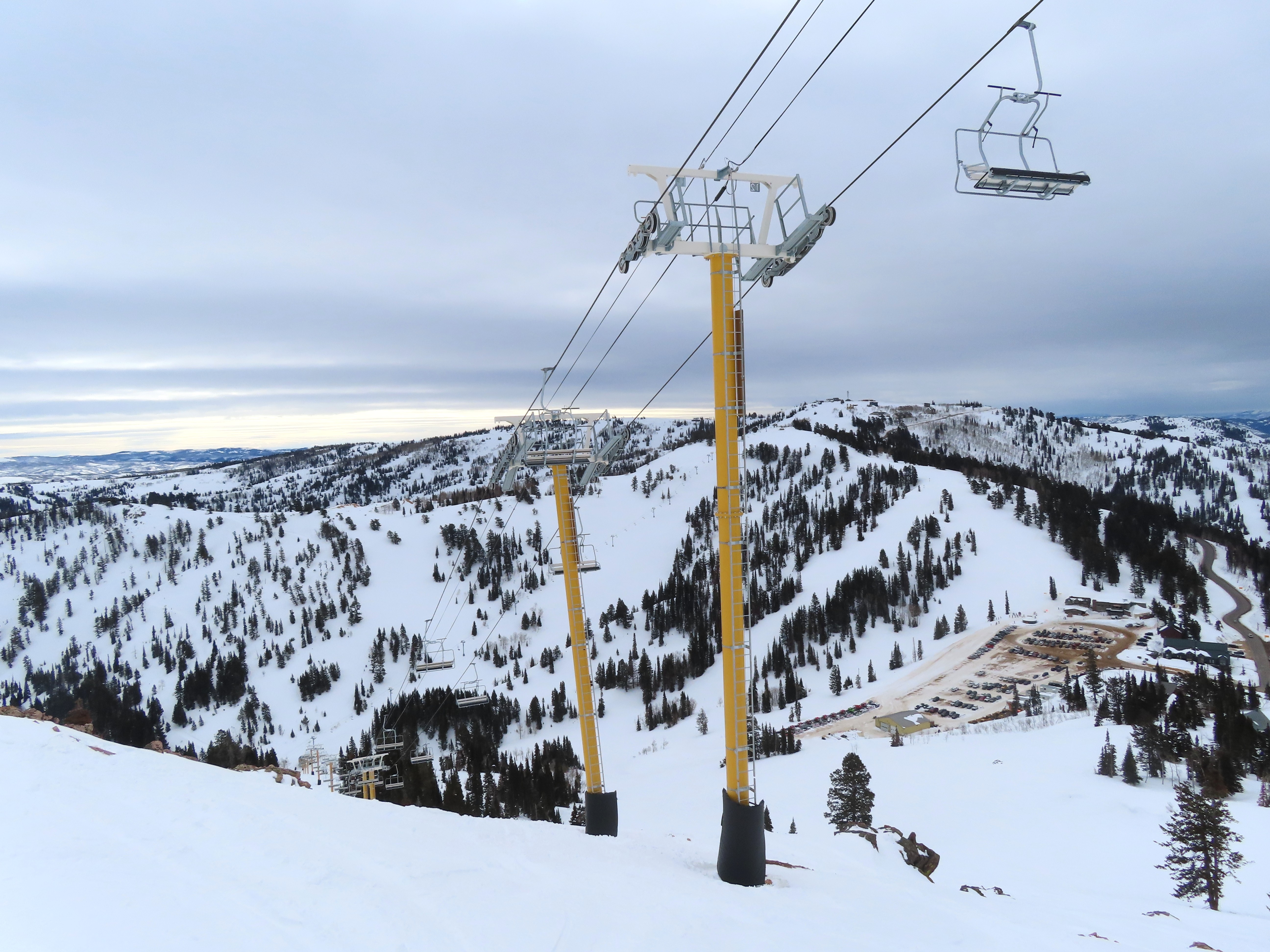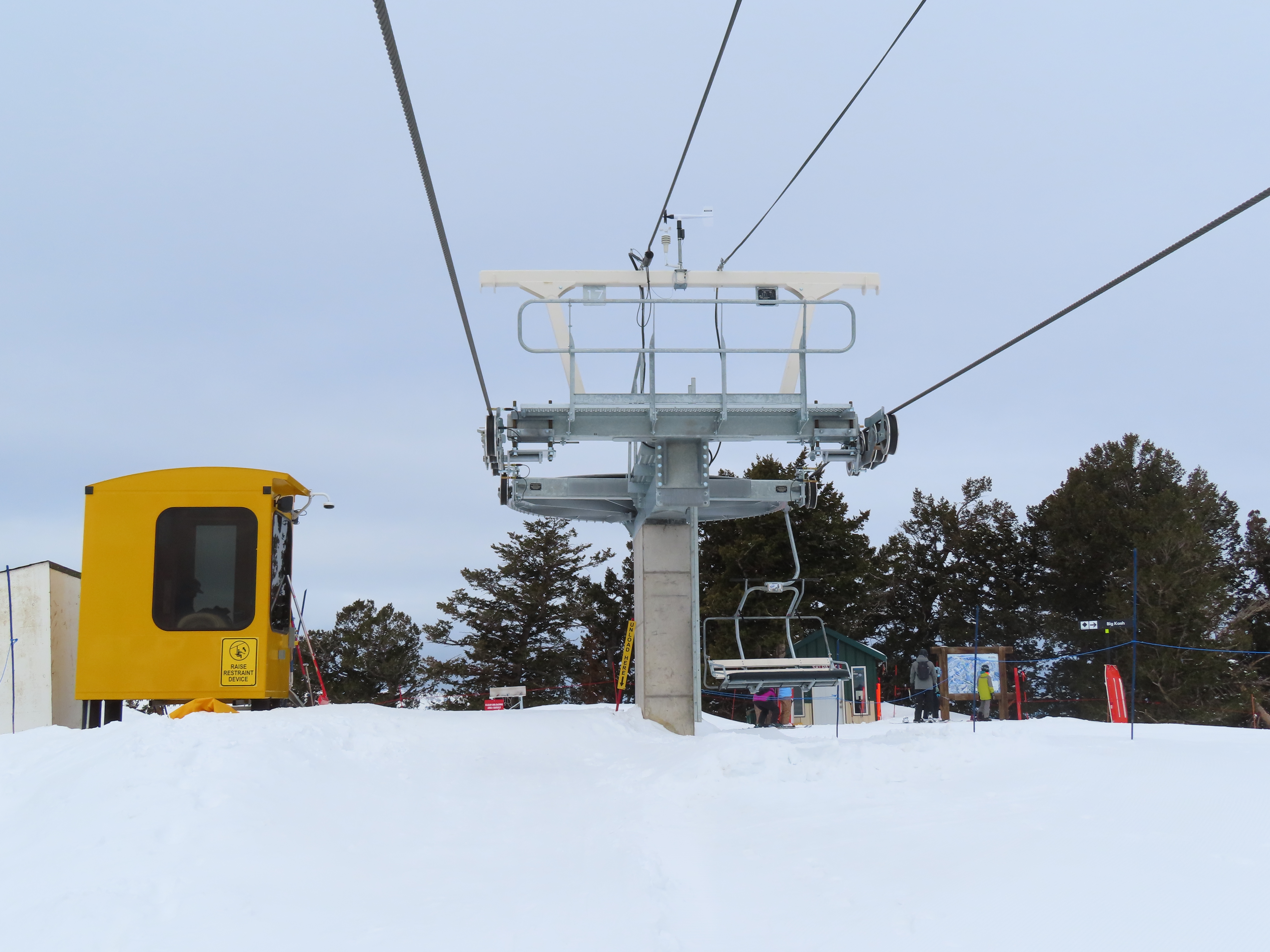 This lift services previously hike-to terrain and was one of four new lifts to open for the 2024-25 season at Powder Mountain.Unlike most lifts at PowMow, this one is bottom drive.Drive bullwheel and loading ramp.As part of new owner Reed Hastings’ art initiative, this lift was painted blue, yellow and white.White tower head.Breakover towers on Lightning Ridge.Fixed top bullwheel.Upper station overview.View from the summit.Looking down the steep lift line.Upper lift line.Lower lift line.The first few towers.Drive station seen from above.Lift overview.Arriving at the top station.View near the summit.Middle section of the line.Upper lift line.The entire lift seen from across the valley.