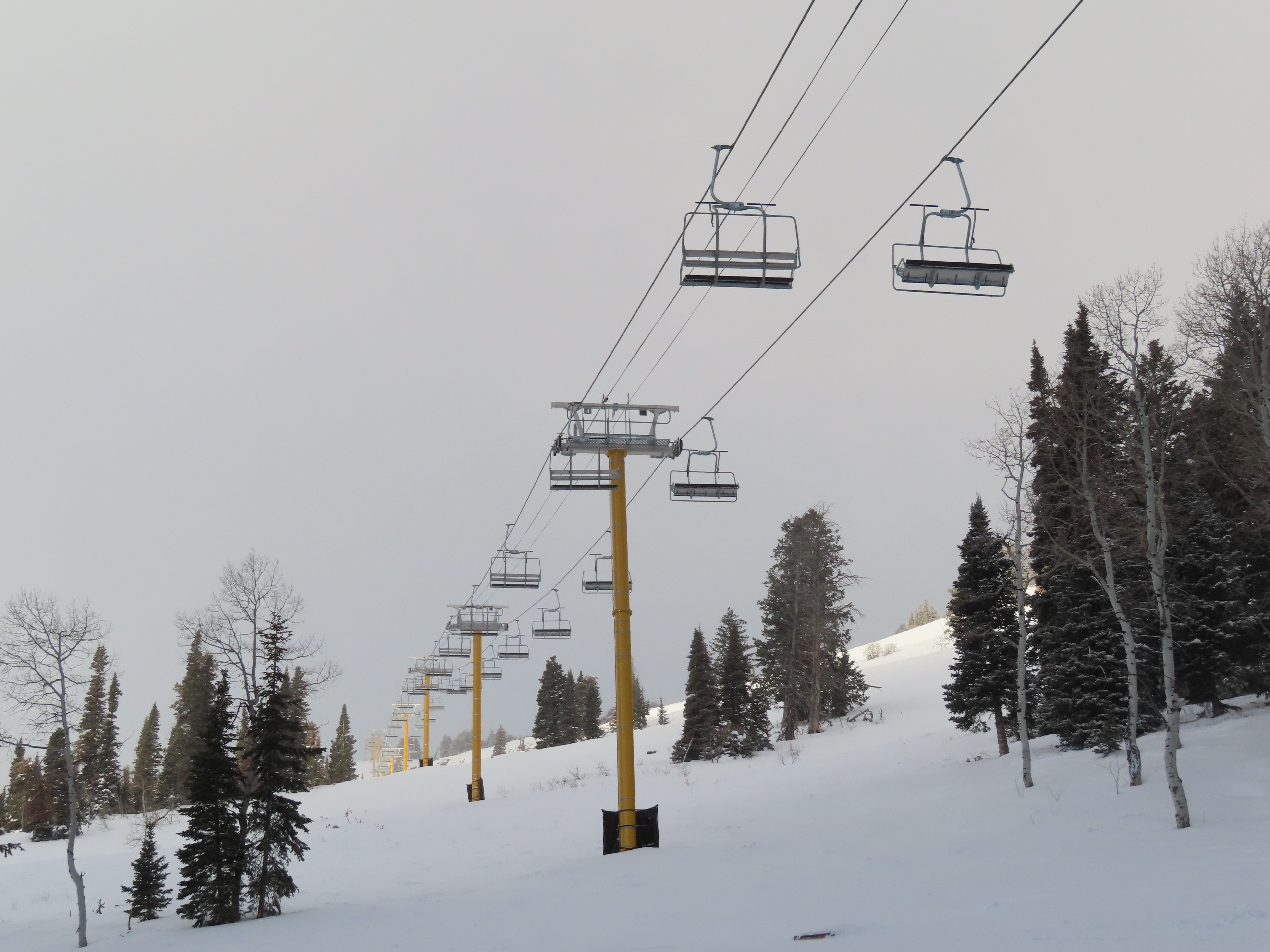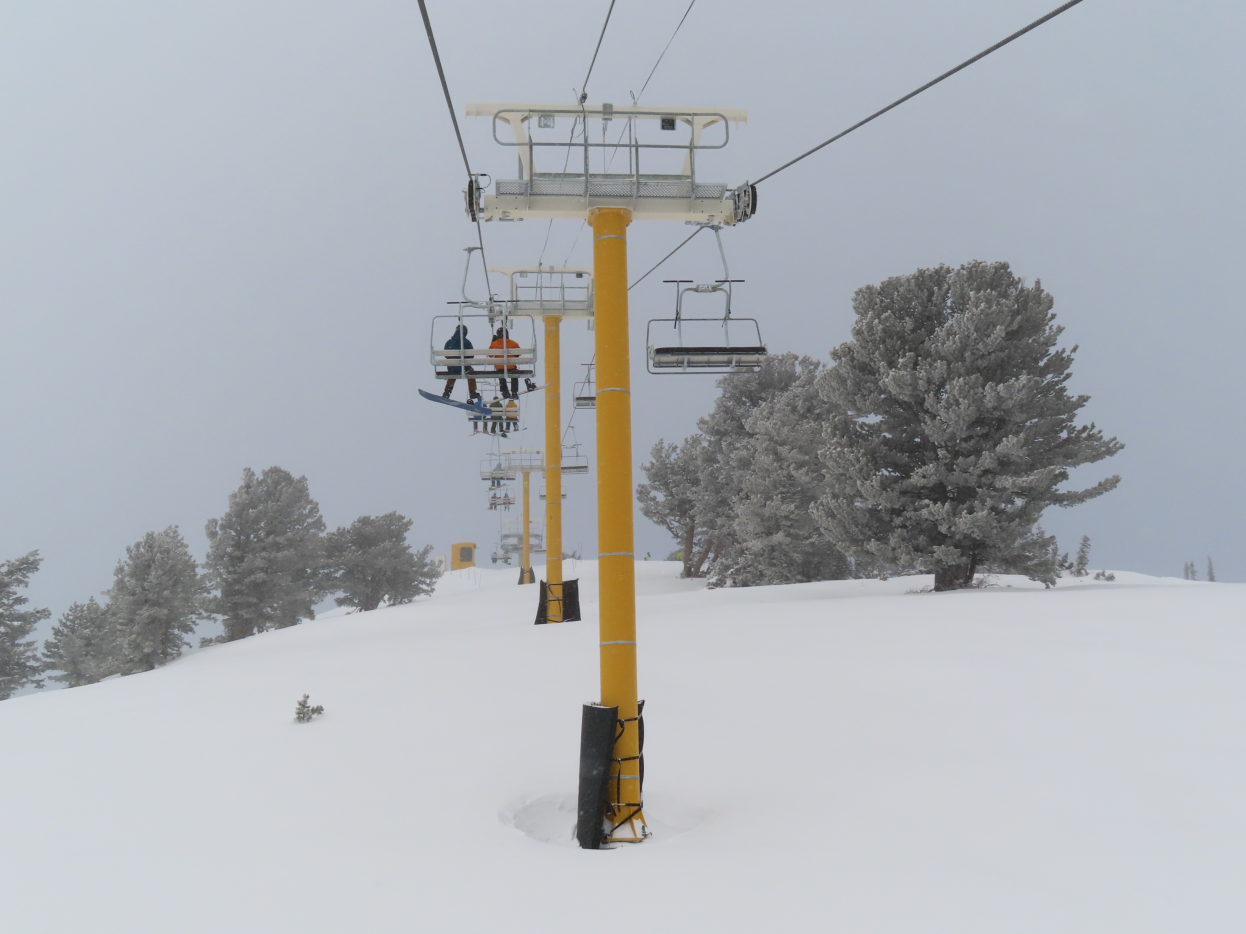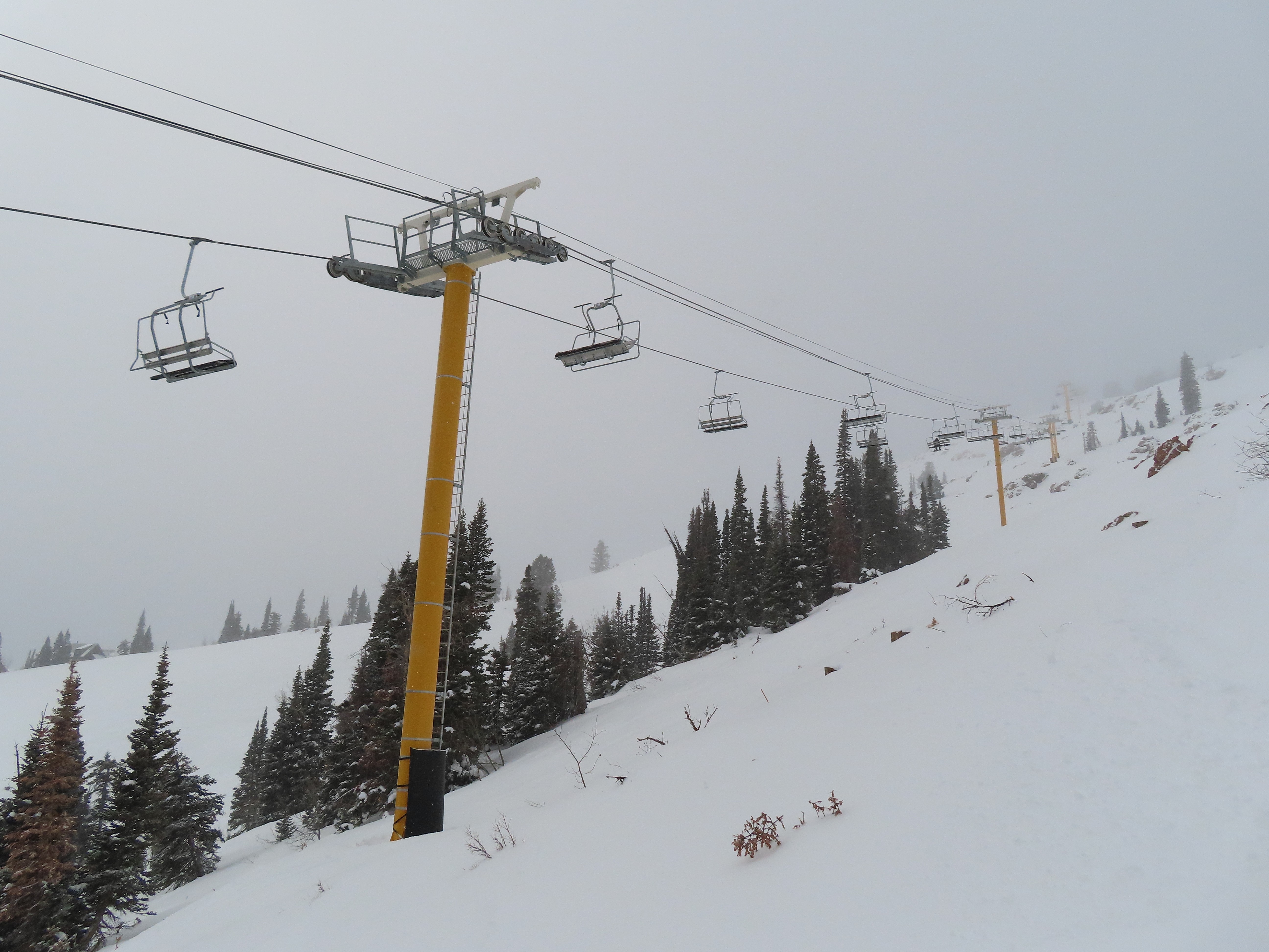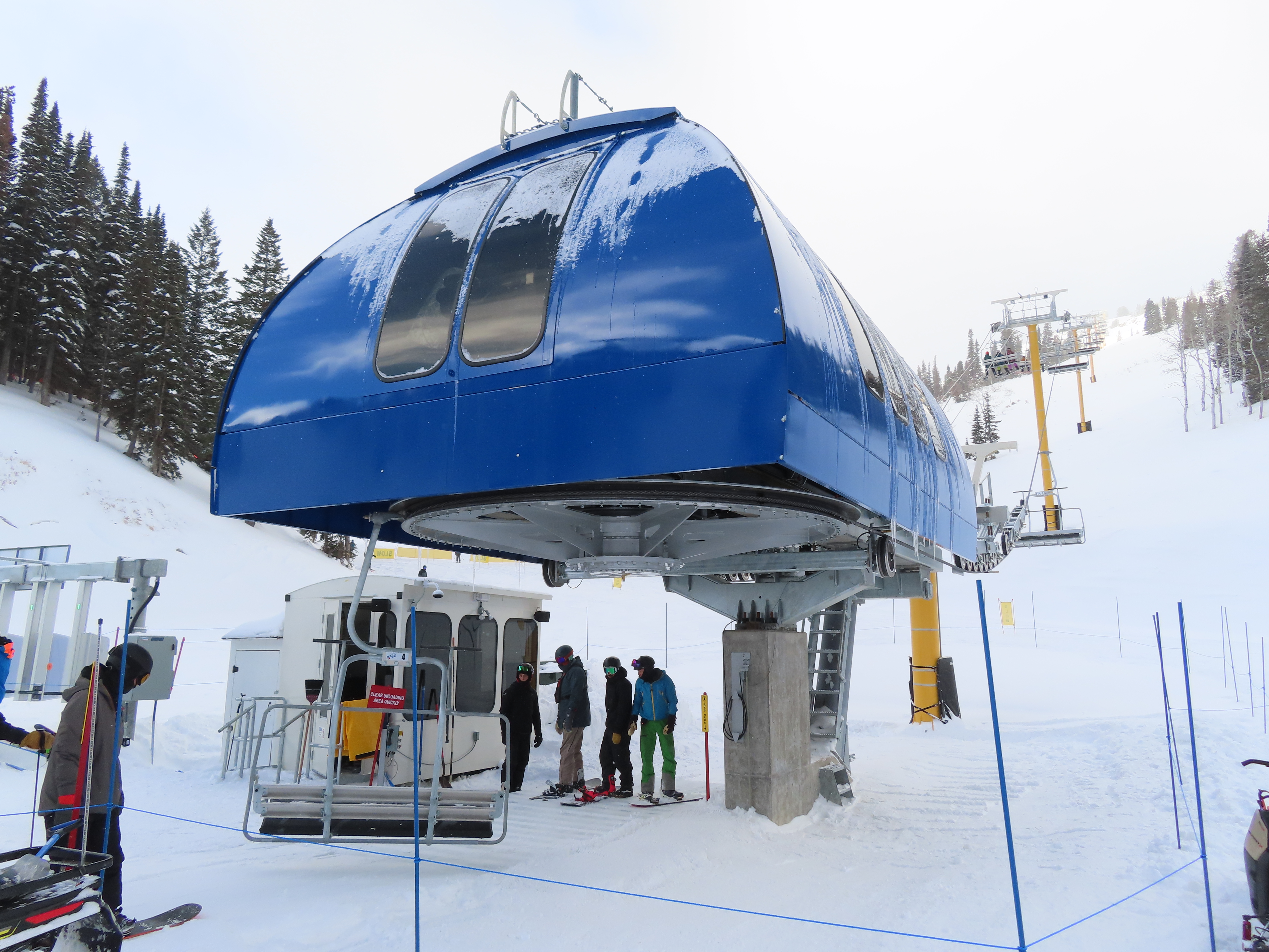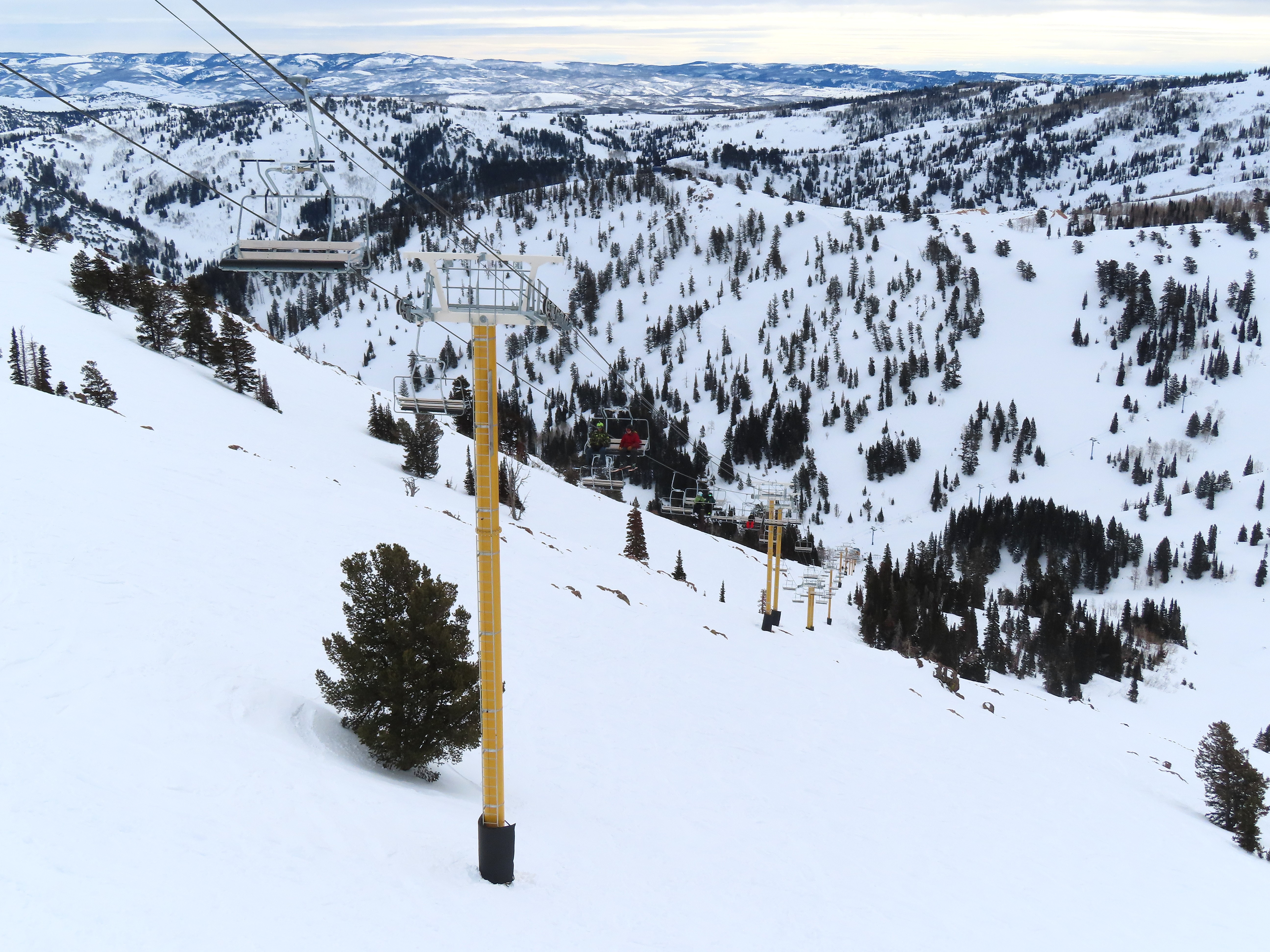 This lift services previously hike-to terrain and was one of four new lifts to open for the 2024-25 season at Powder Mountain.Unlike most lifts at PowMow, this one is bottom drive.Drive bullwheel and loading ramp.As part of new owner Reed Hastings’ art initiative, this lift was painted blue, yellow and white.White tower head.Breakover towers on Lightning Ridge.Fixed top bullwheel.Upper station overview.View from the summit.Looking down the steep lift line.Upper lift line.Lower lift line.The first few towers.Drive station seen from above.Lift overview.Arriving at the top station.View near the summit.Middle section of the line.Upper lift line.The entire lift seen from across the valley.