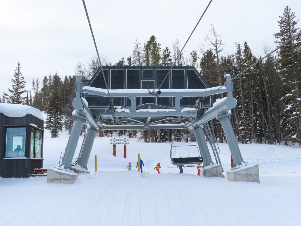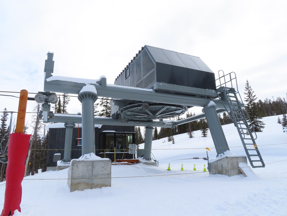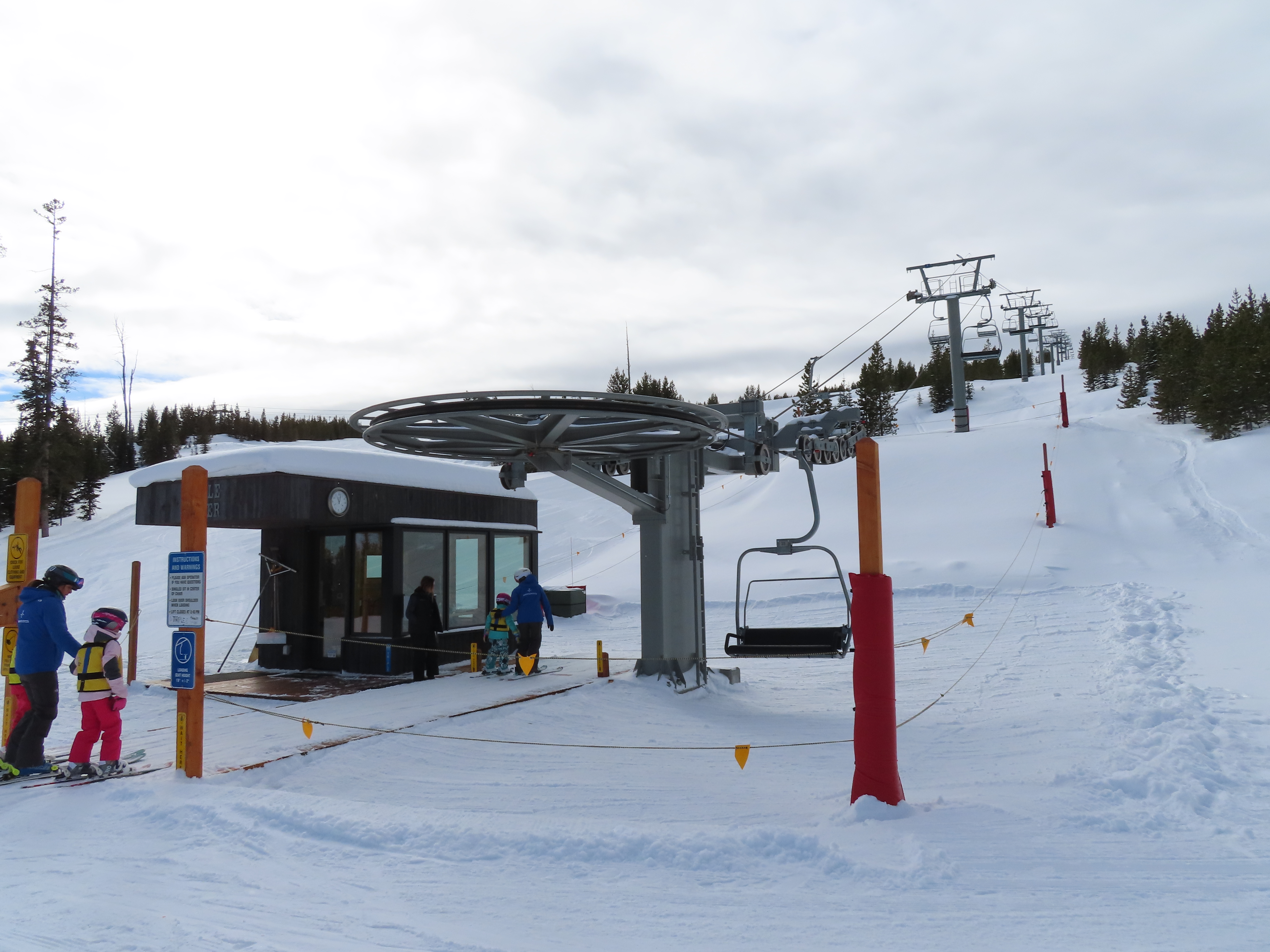 The Little Dipper lift was one of the first lifts built at YC in 2001 and was moved to this location on Eglise Rock in 2017.Unlike in its previous incarnation, there is no mid-station.Leaving the bottom terminal.Riding up the mellow lift line.View up at tower 7.Arriving at the top drive station.Unloading area and operator station.Side view of the motor room and tension carriage.View down from the top.