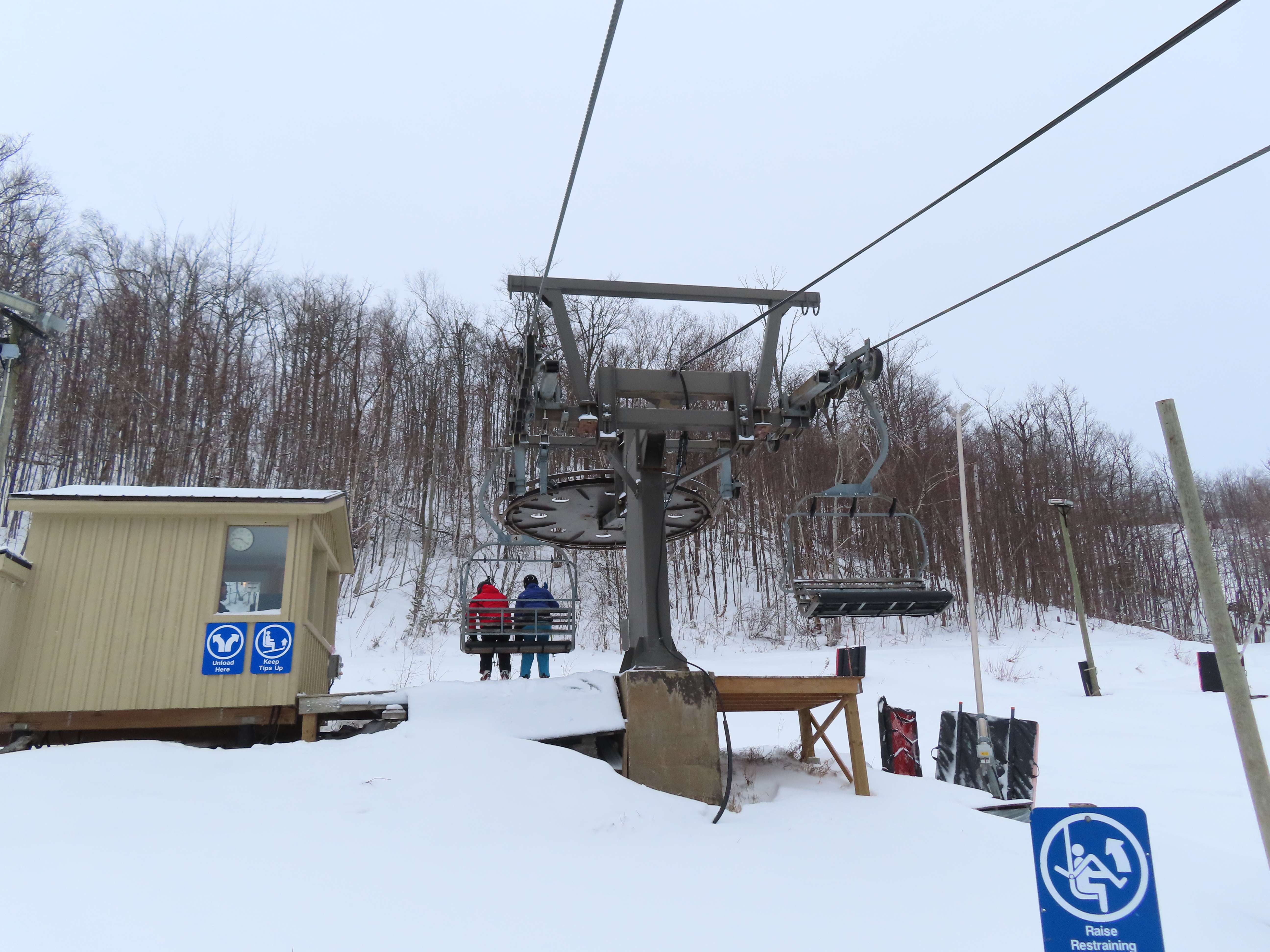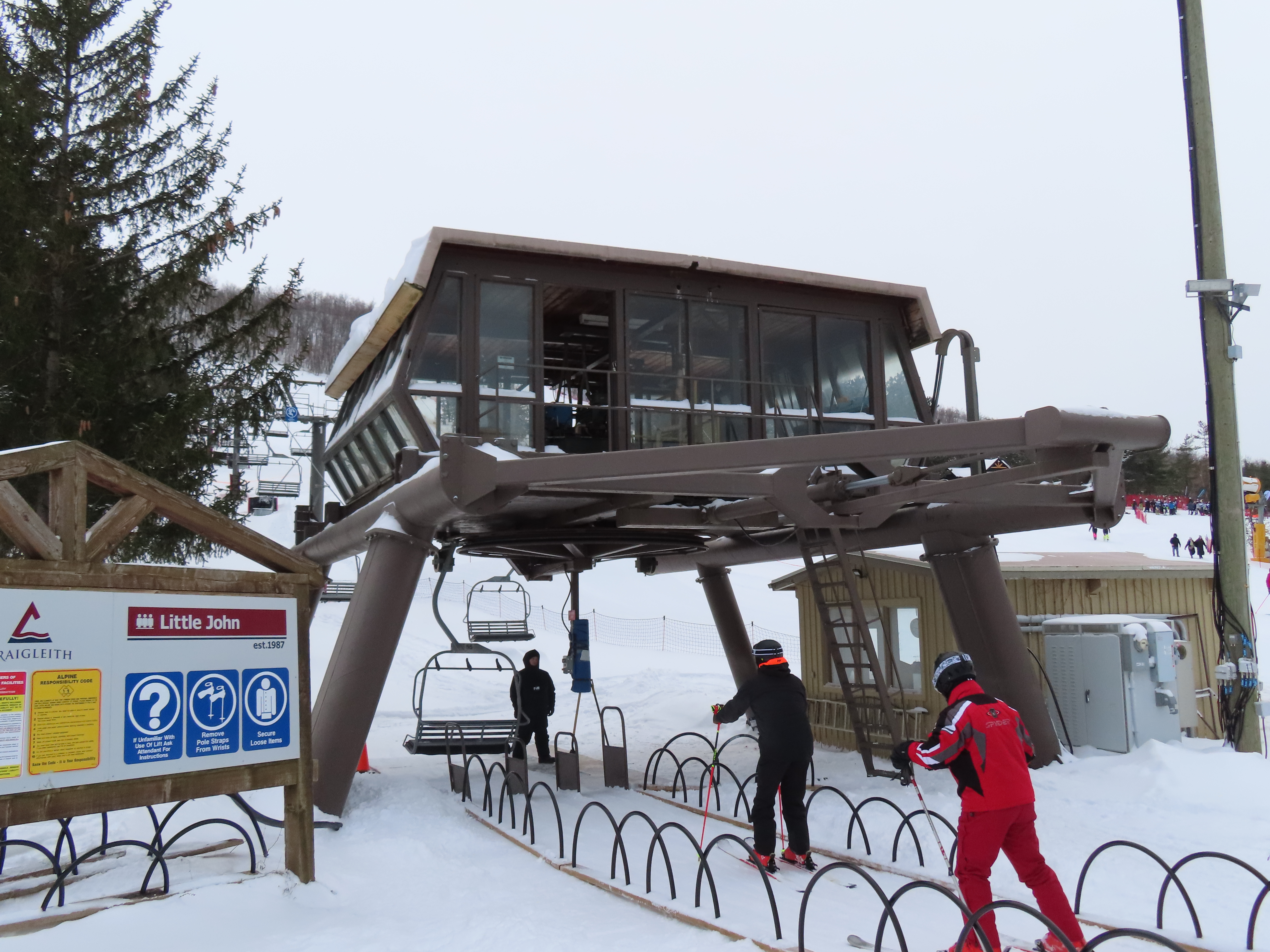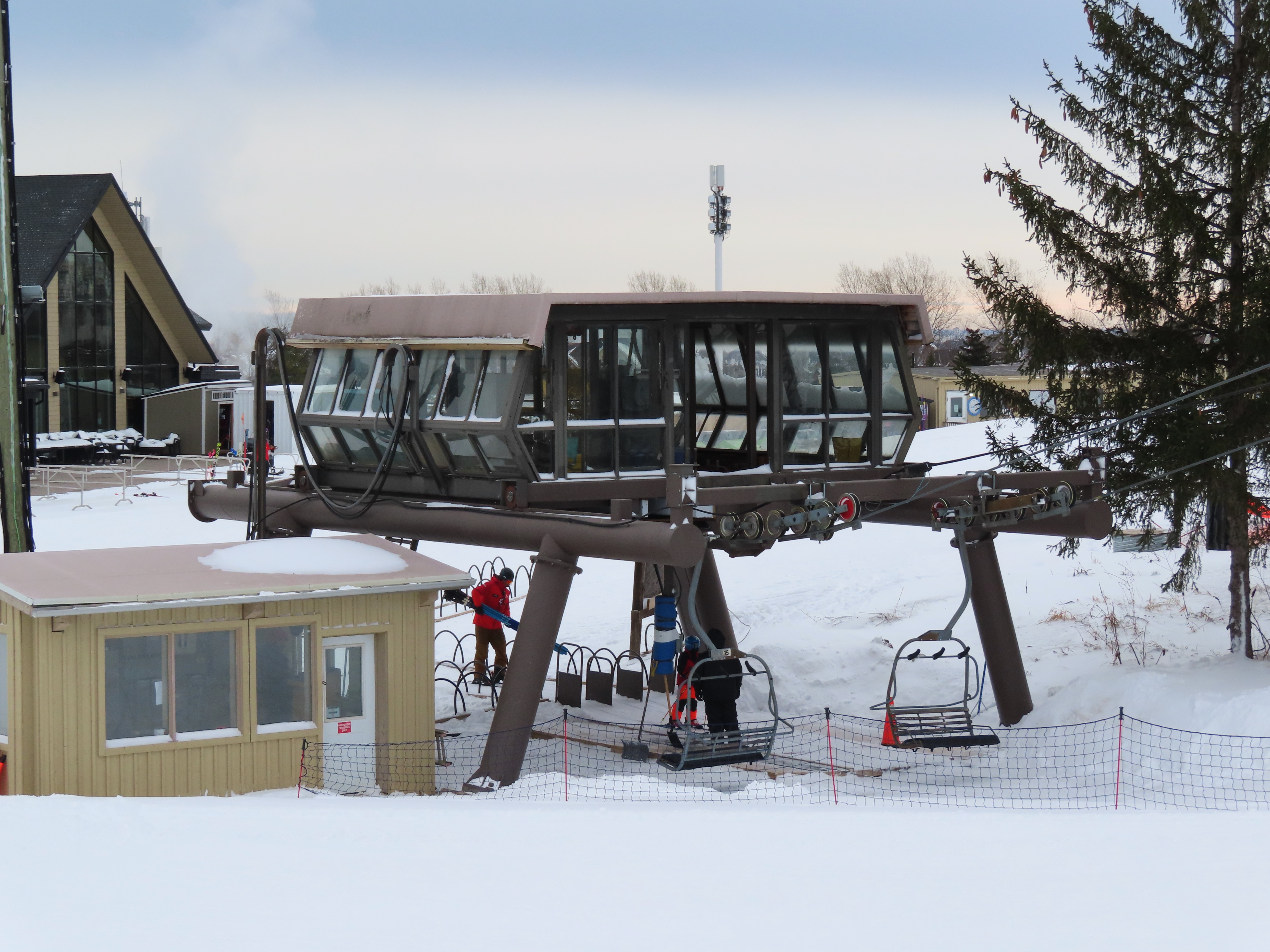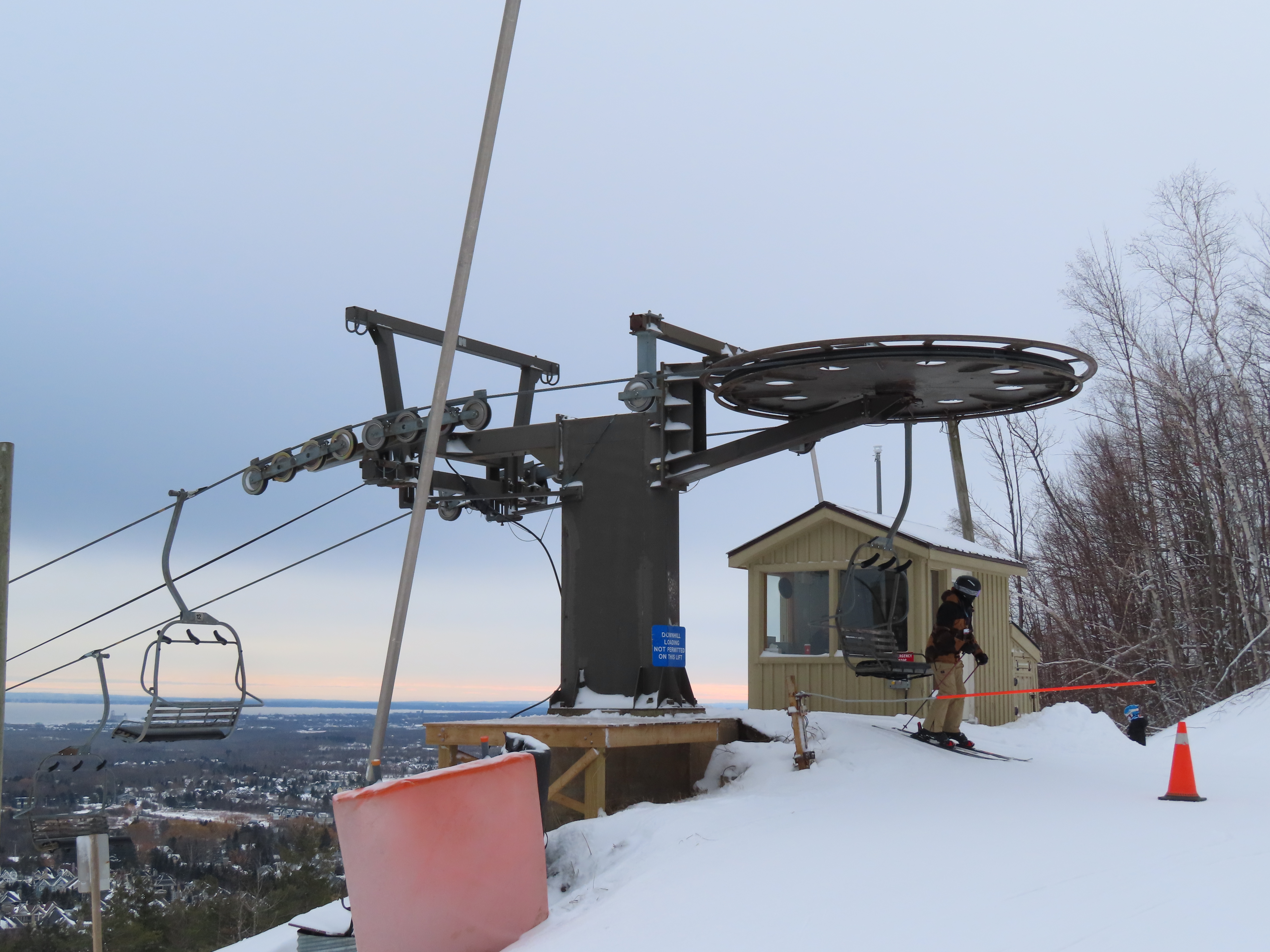 With three stations, this lift services beginner terrain as well as a race slope.Loading area and motor room.Mid-unload with portal style tower.Arriving at the summit.Fixed return bullwheel.Side view of the top station.View down the short lift line.Alignment above the middle station.Lower half of the line.View up from the base area.Another look at the drive-tension terminal.