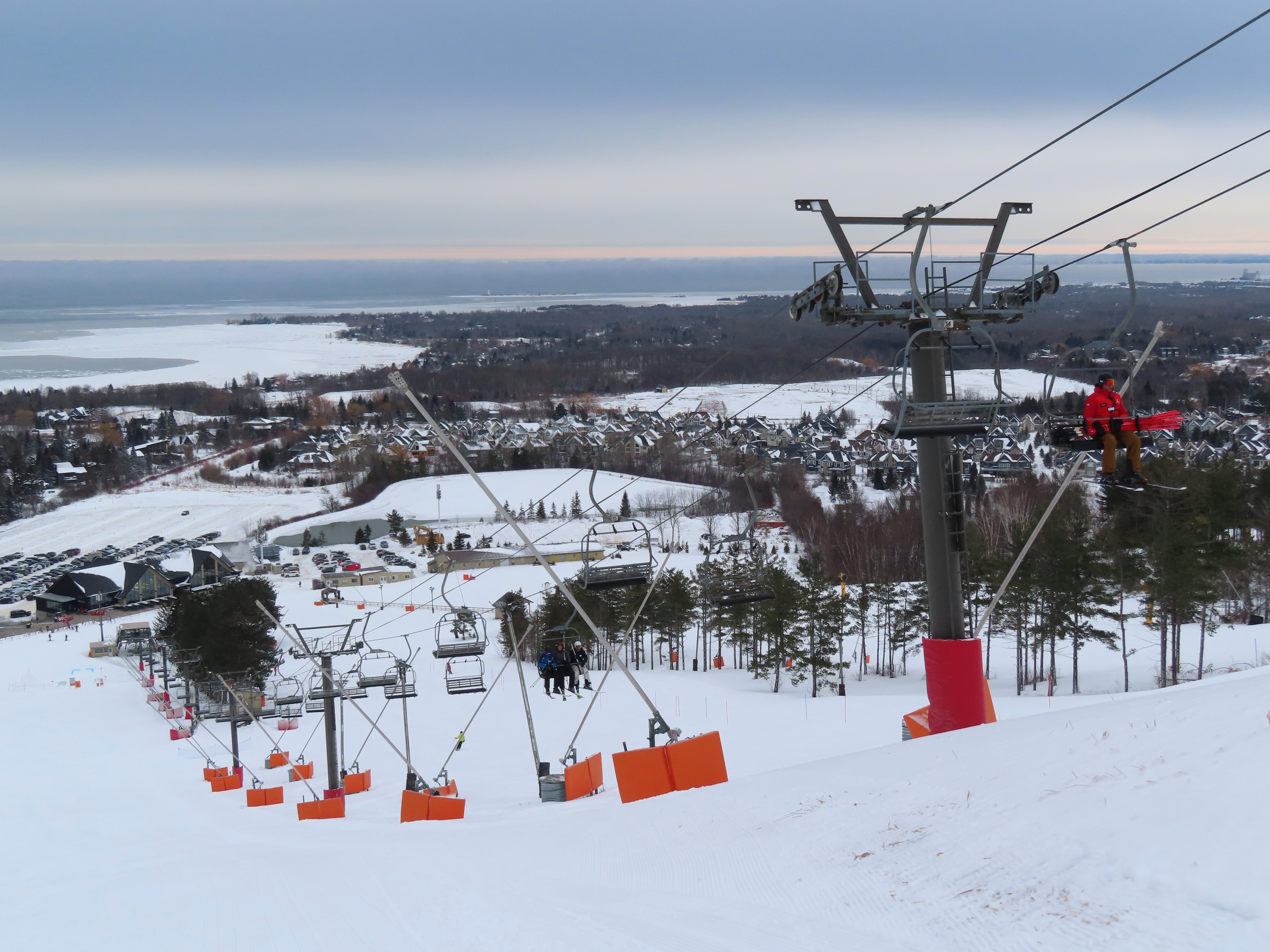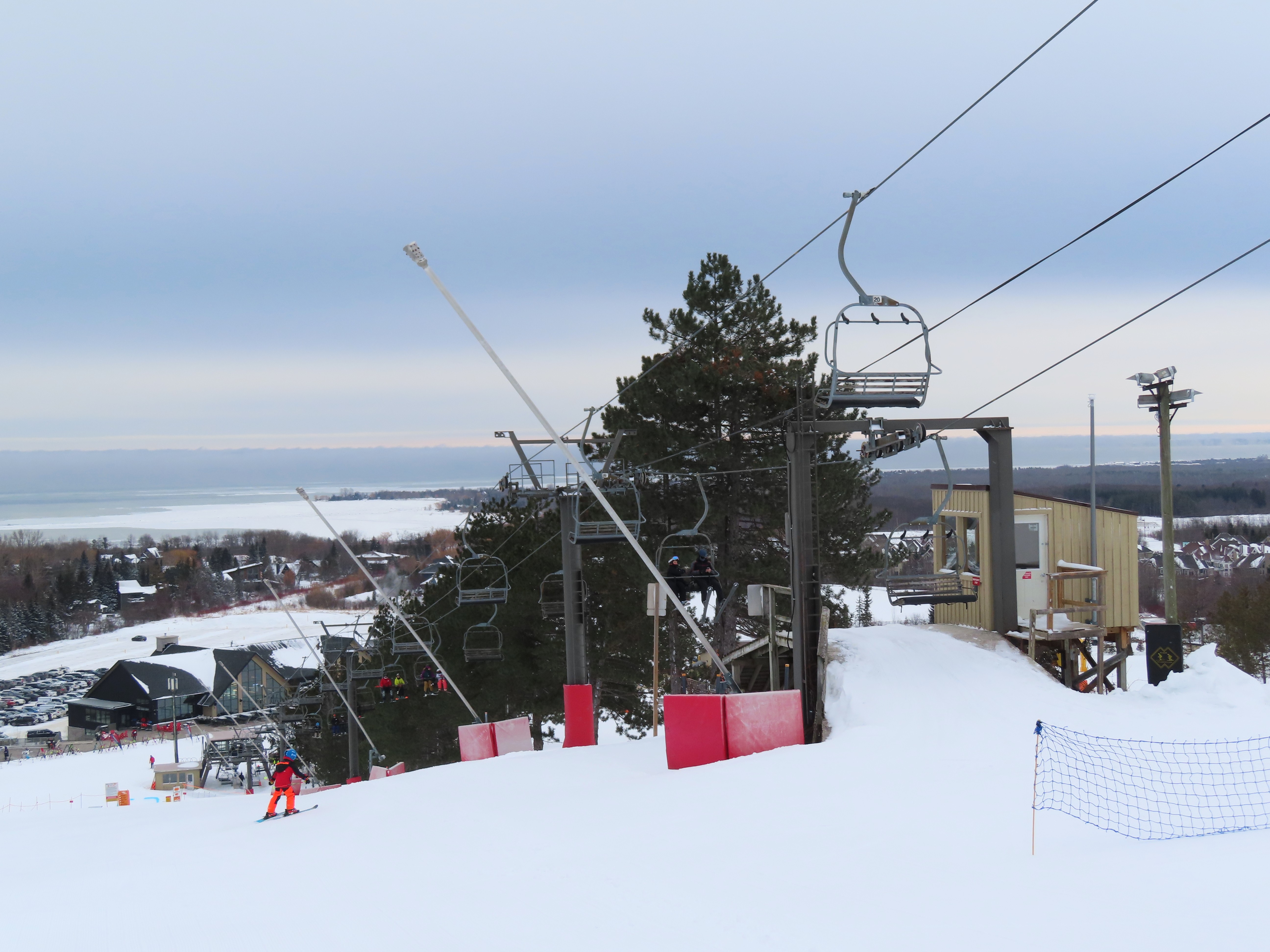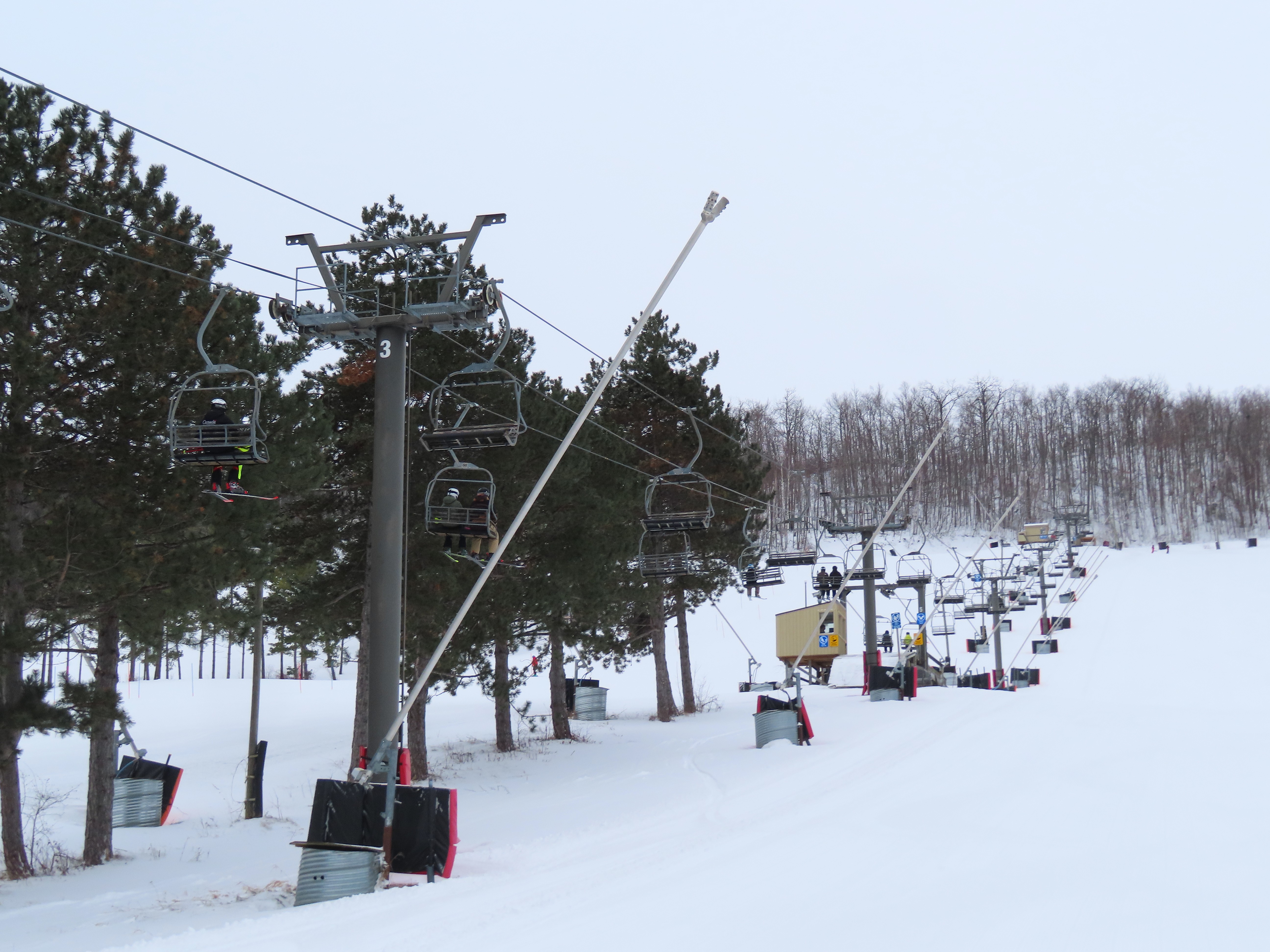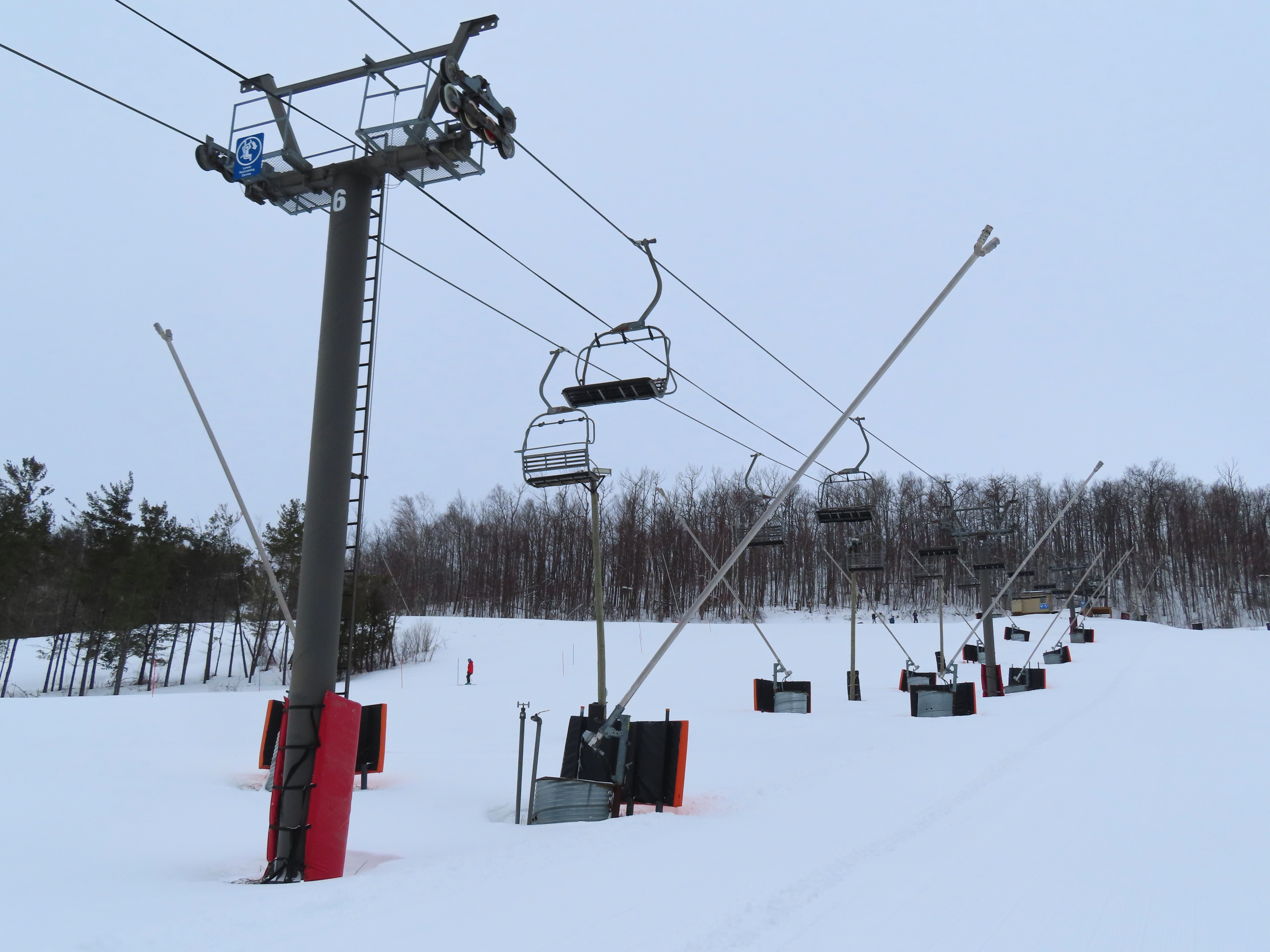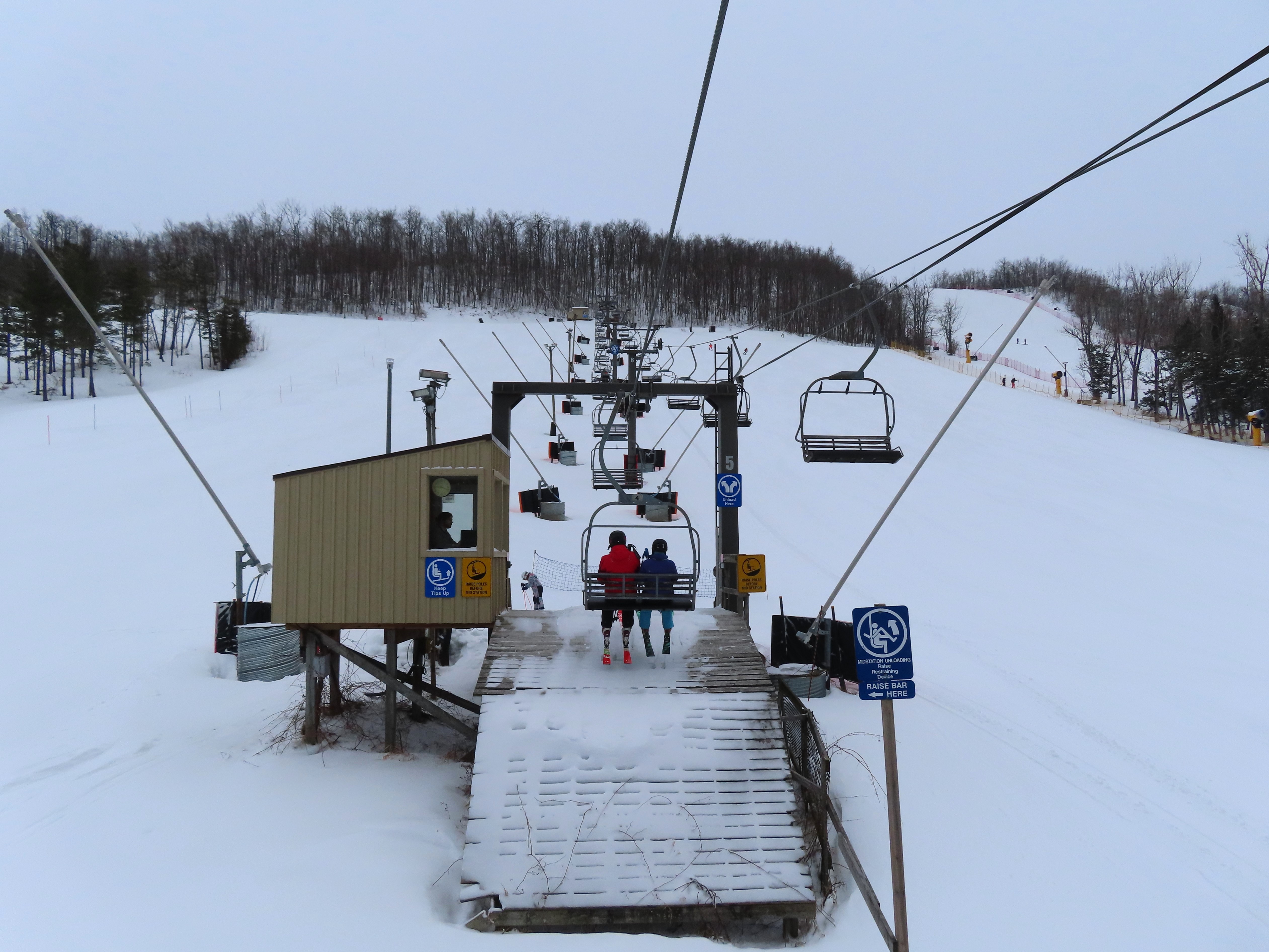 With three stations, this lift services beginner terrain as well as a race slope.Loading area and motor room.Mid-unload with portal style tower.Arriving at the summit.Fixed return bullwheel.Side view of the top station.View down the short lift line.Alignment above the middle station.Lower half of the line.View up from the base area.Another look at the drive-tension terminal.