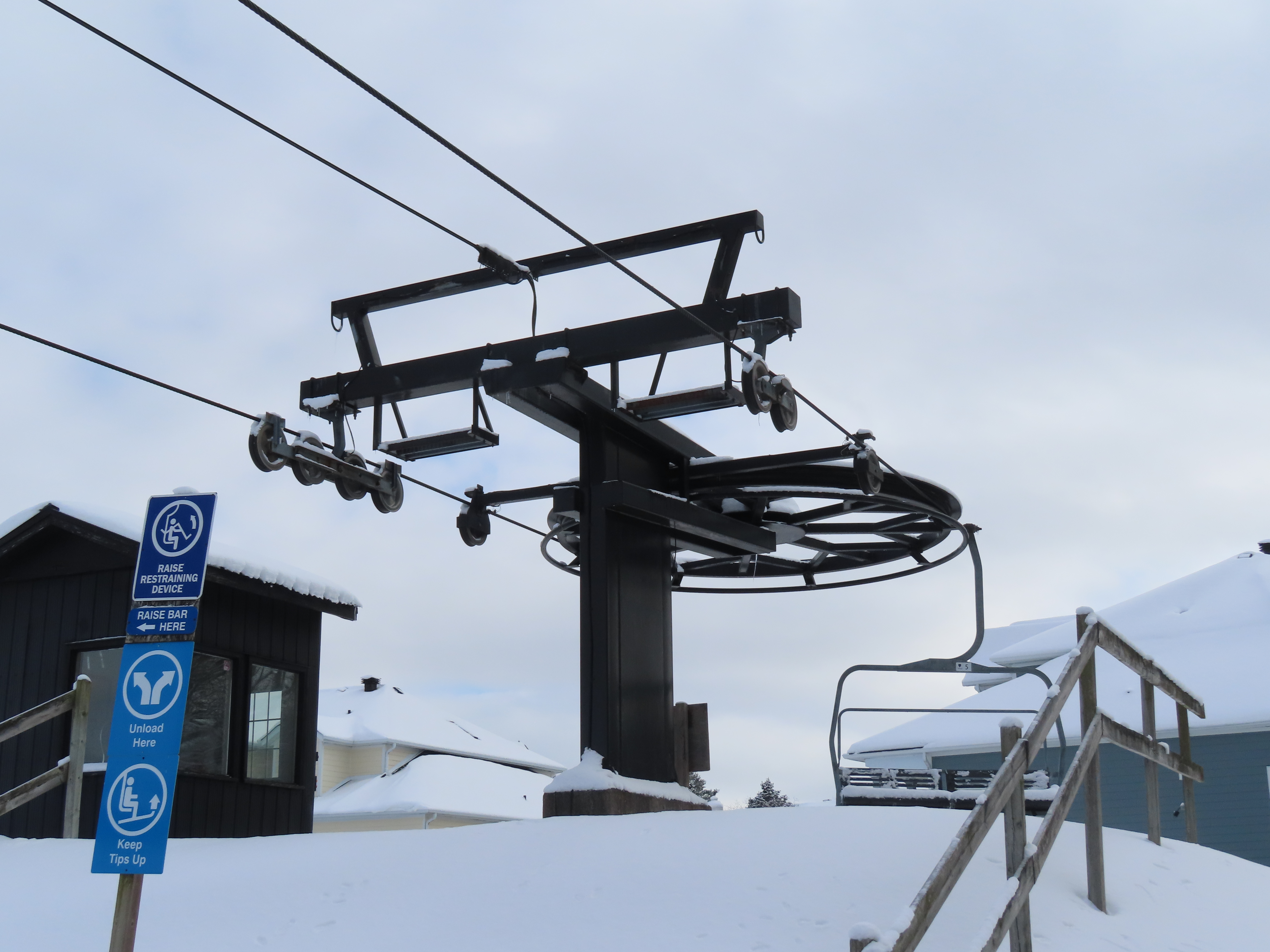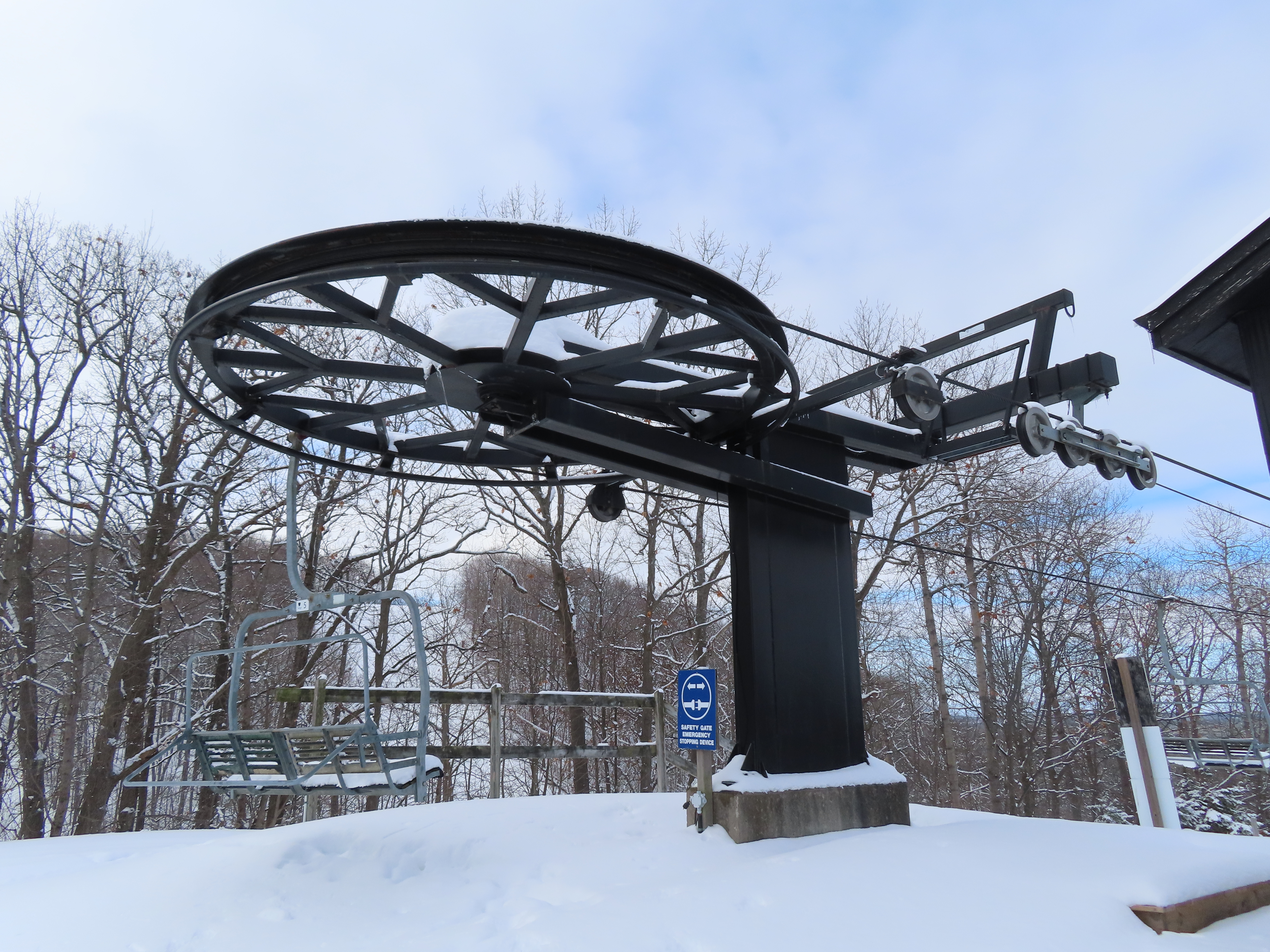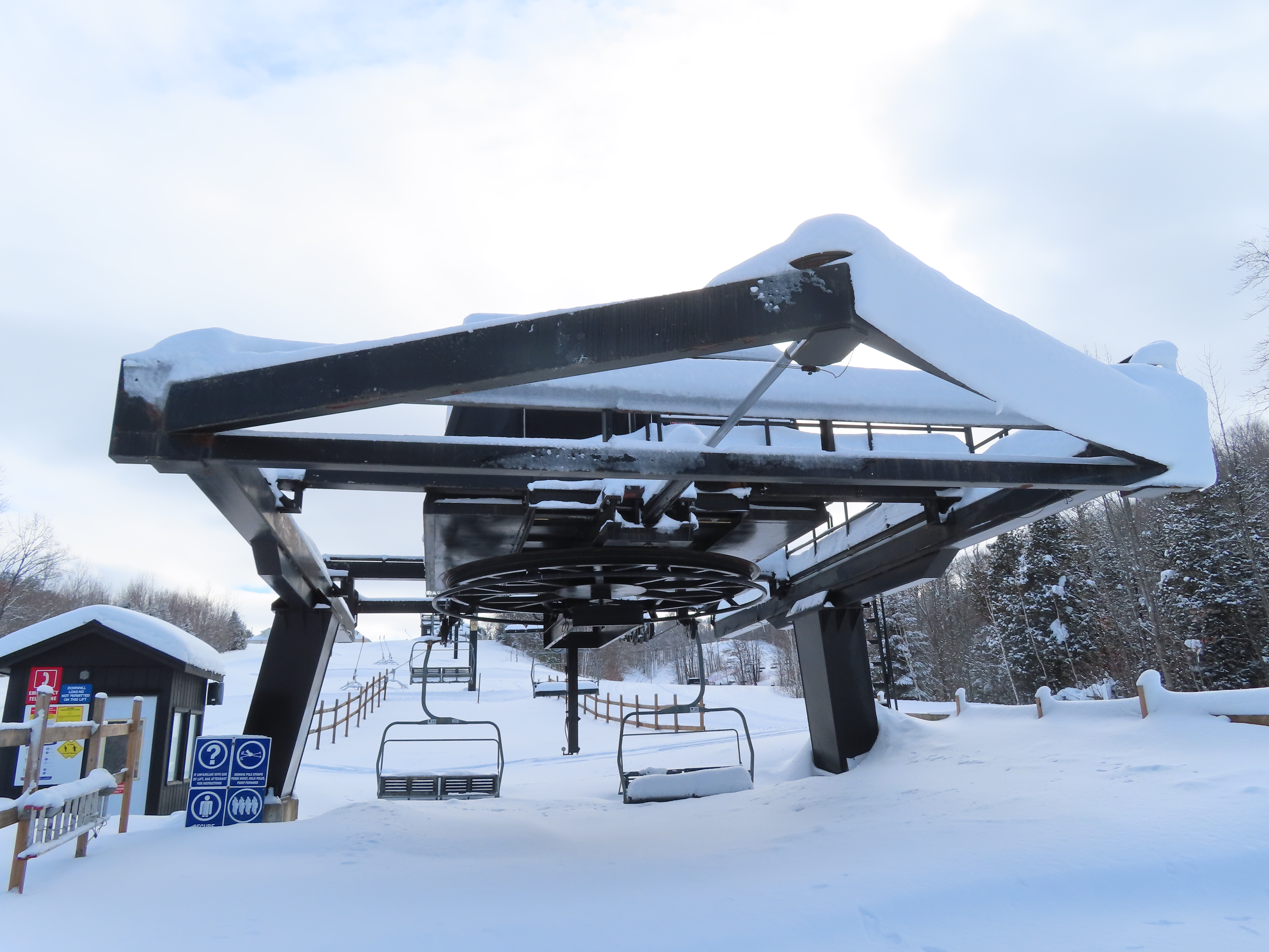 This short lift has not operated in a few years due to weather but services a beginner slope near some condominiums.The first tower and bottom station.This is one of three very similar Borvig quads built simultaneously here.Drive-tension station.Loading area.Lift overview.Top terminal with snowflake bullwheel.Upper station overview.Another view of the top station.View down at tower 3.Side view of the late model Borvig drive.