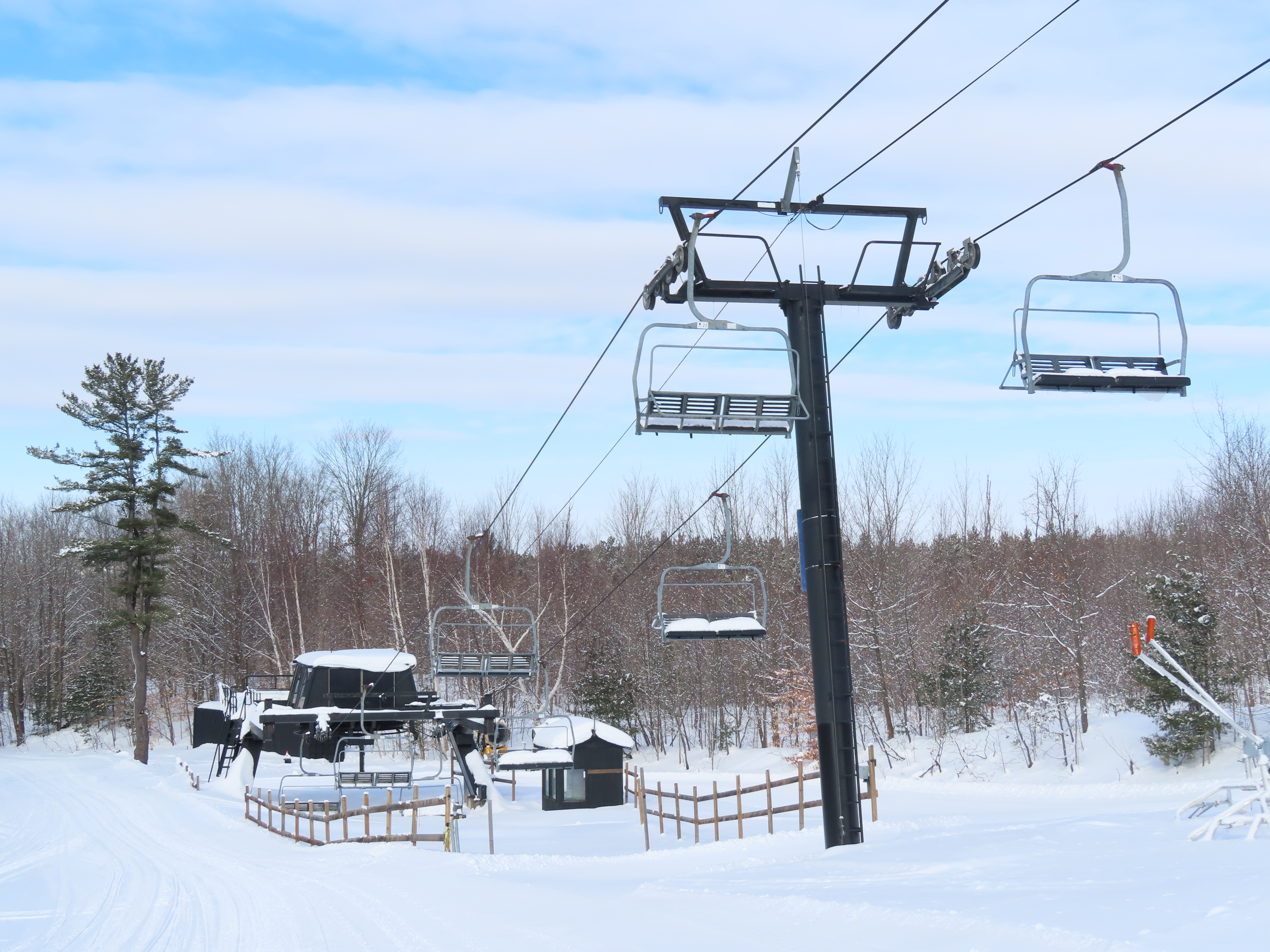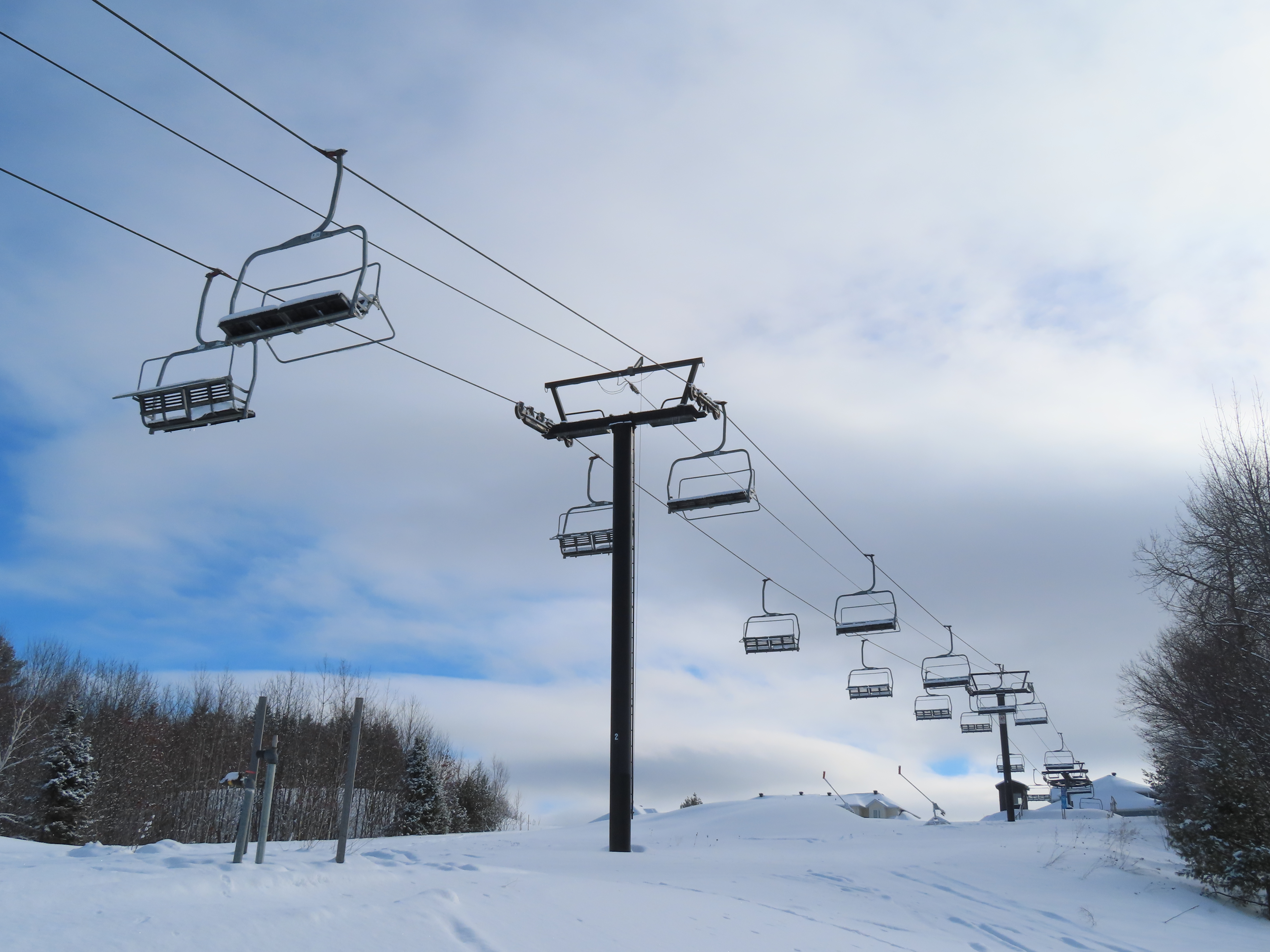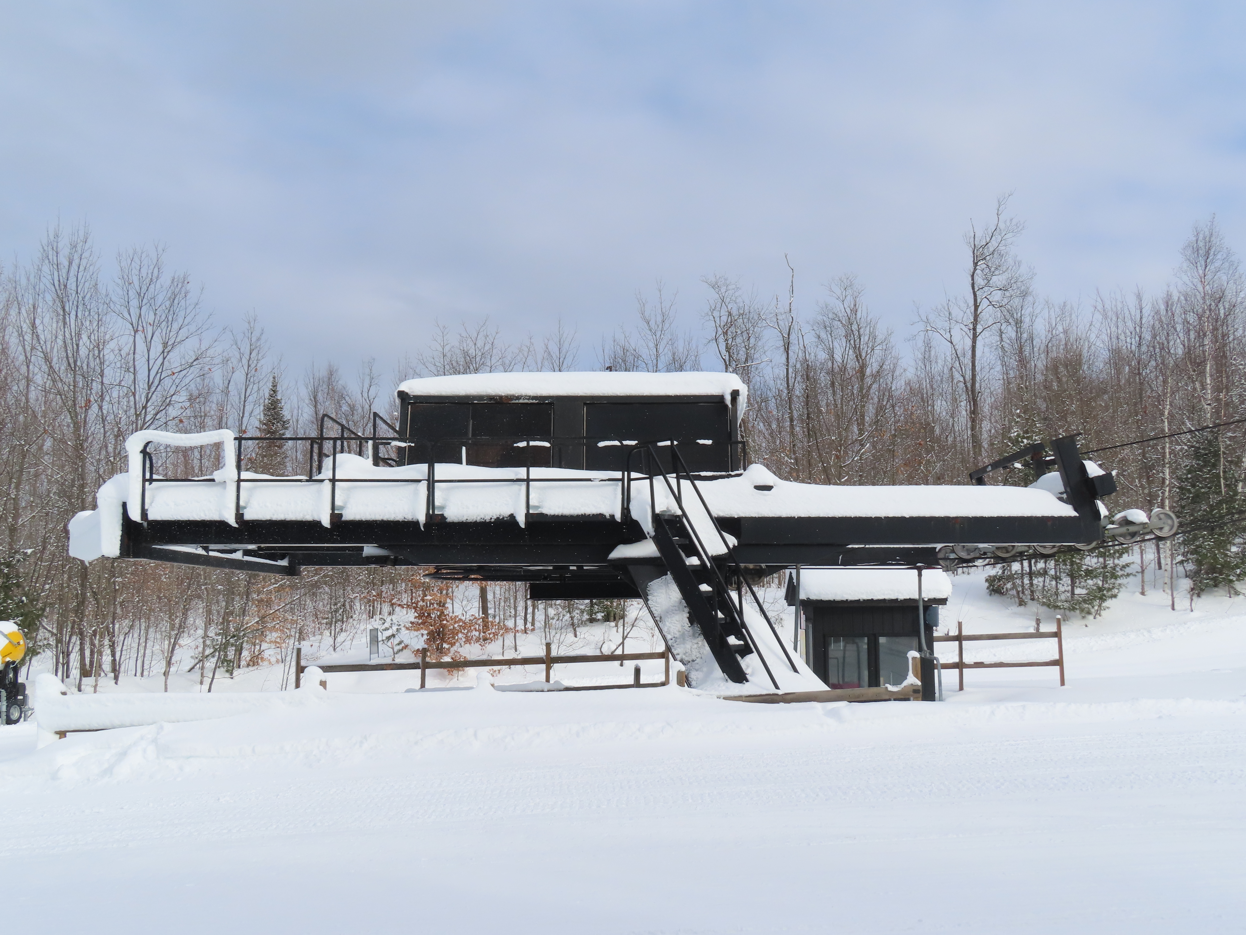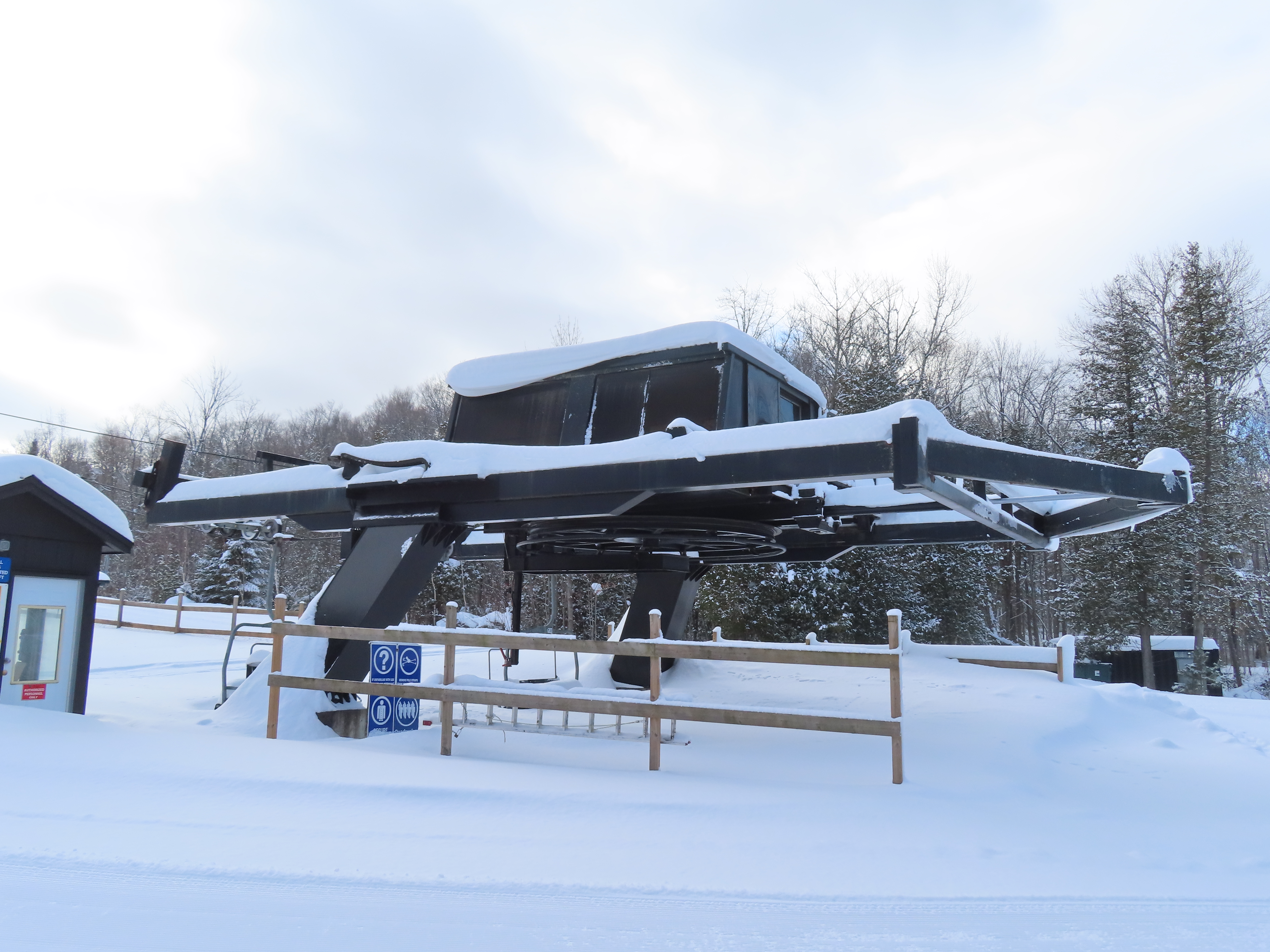 This short lift has not operated in a few years due to weather but services a beginner slope near some condominiums.The first tower and bottom station.This is one of three very similar Borvig quads built simultaneously here.Drive-tension station.Loading area.Lift overview.Top terminal with snowflake bullwheel.Upper station overview.Another view of the top station.View down at tower 3.Side view of the late model Borvig drive.