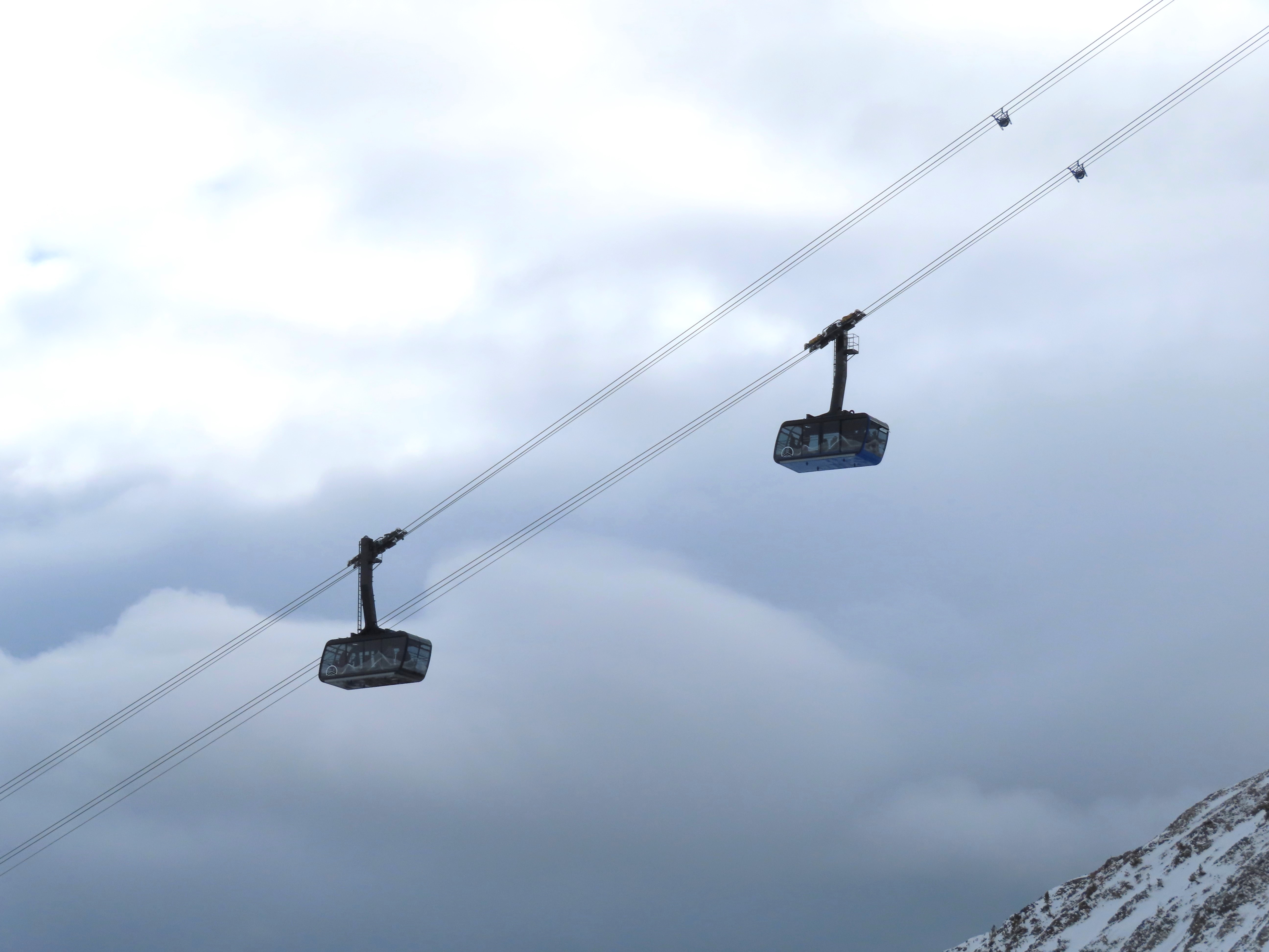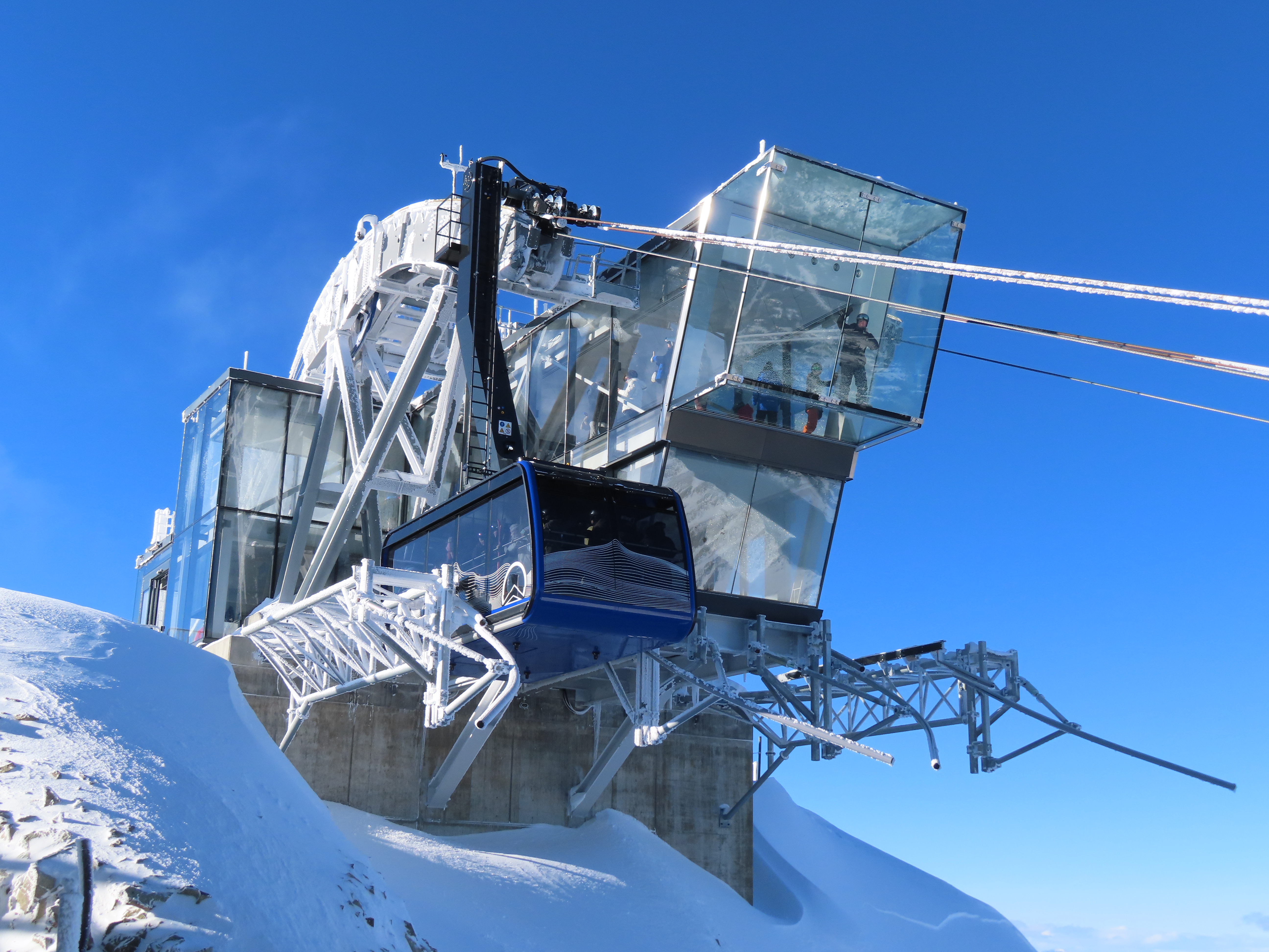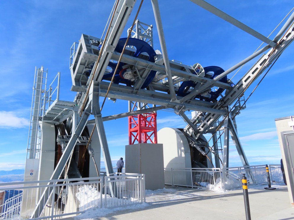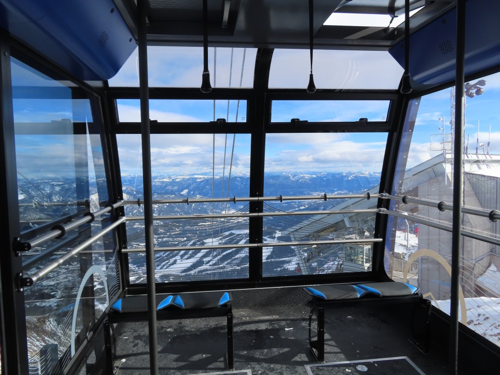 To someone who is used to a venerable old Agudio tram built in 1979 with a couple of parts missing (a seat pad, for example) and most of the cabin lights burned out, not to mention the fact that the wind speed and rope speed displays are never calibrated, this shiny new Doppelmayr tram looks like it soared out of a dream. Or Europe (which it did).