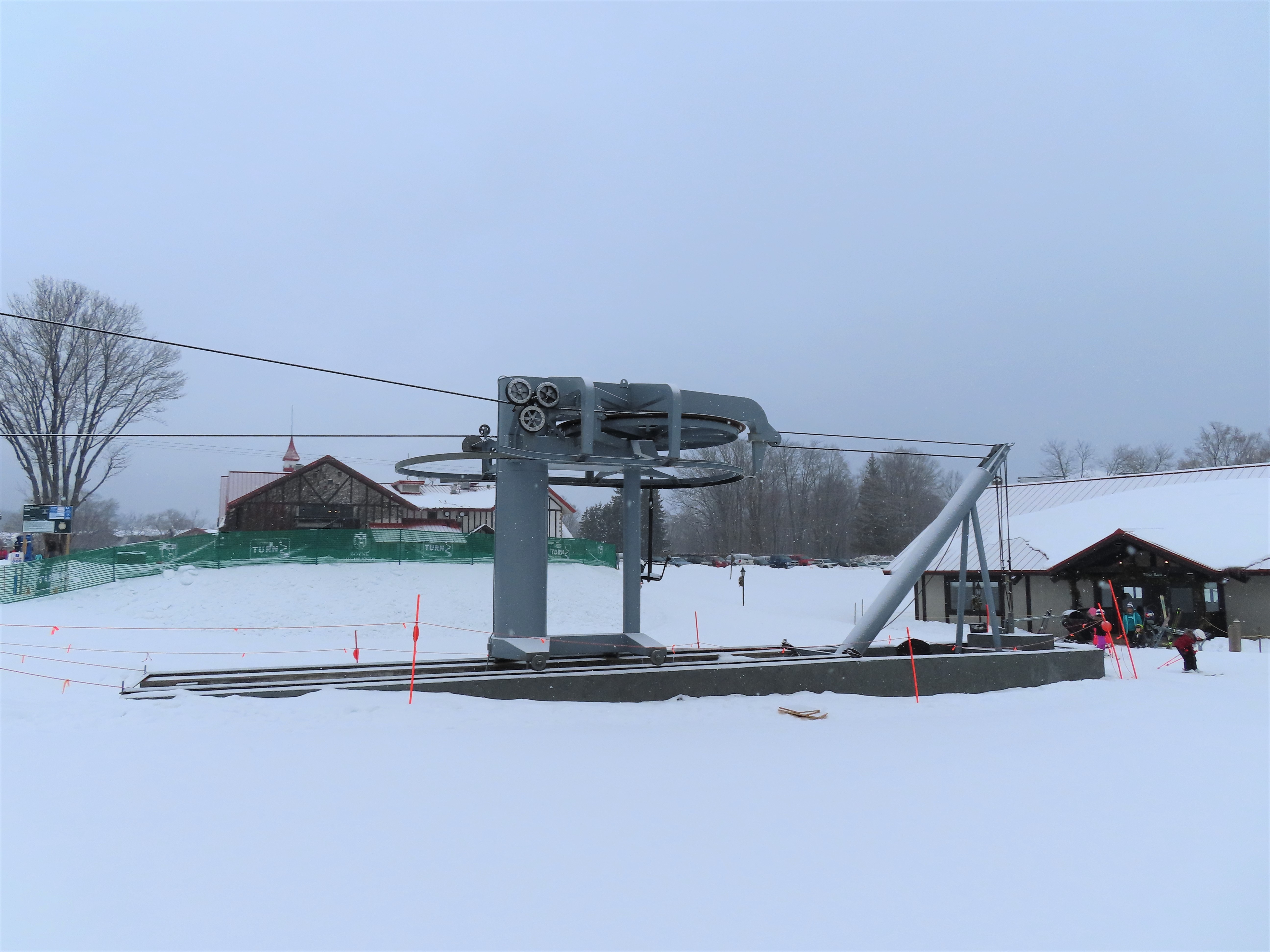 This lift is run in the summer & fall months for uphill access and downloading. For summer operations, the safety bars & bike carriers are installed and they use the platform on top of the upper terminal vault drive for loading/unloading