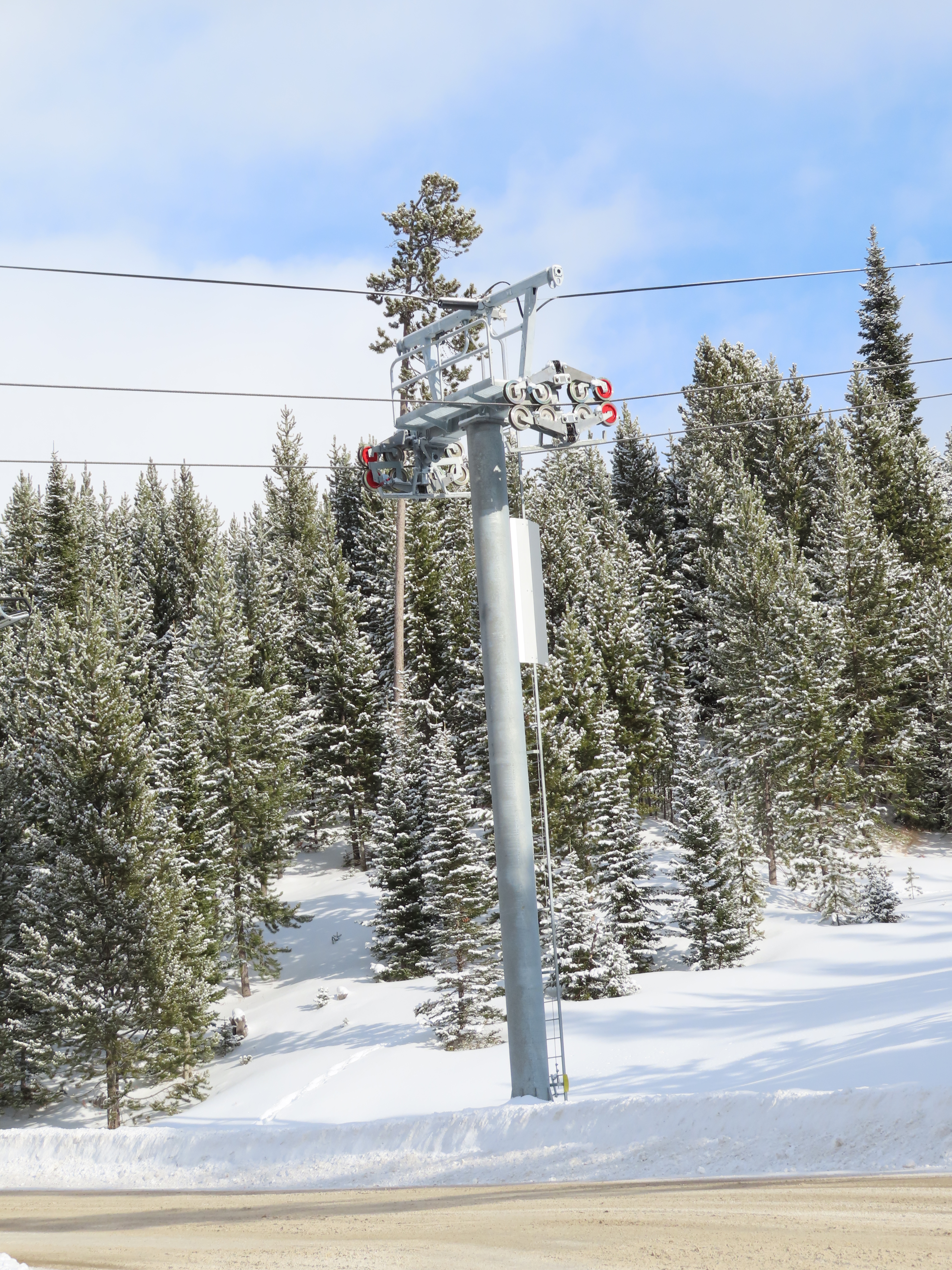 Real estate projects in 2019 at Big Sky included two new chairlifts on opposite sides of the resort. This one is in the Madison base area.Doppelmayr Alpen Star drive terminal with Doppelmayr Connect controls.Side view of the bottom station.This lift is strictly for foot passengers and connects two different neighborhoods with Madison.View up the the mid-station.This station features foot passenger loading in both directions.This part of the line is very high off the ground.First unloading area.View up at tower 8.The bottom half of the lift line is mostly flat.The line crosses over three roads and underneath power lines.Tower 9.T10.The top terminal with Doppelmayr operator house.A tower and two chairs.Side view of the return station in the Lakeview neighborhood.Unloading area.Riding out of the top terminal.Tower 9.Combo assemblies on tower 8.Approaching the middle station.Downhill side of the mid.Chair spacing is very wide with only 28 chairs total.View back up the line.Arriving at Madison via Madison.Lift overview.Tower with combo assemblies.A chair with pads on both the seat bottom and back.