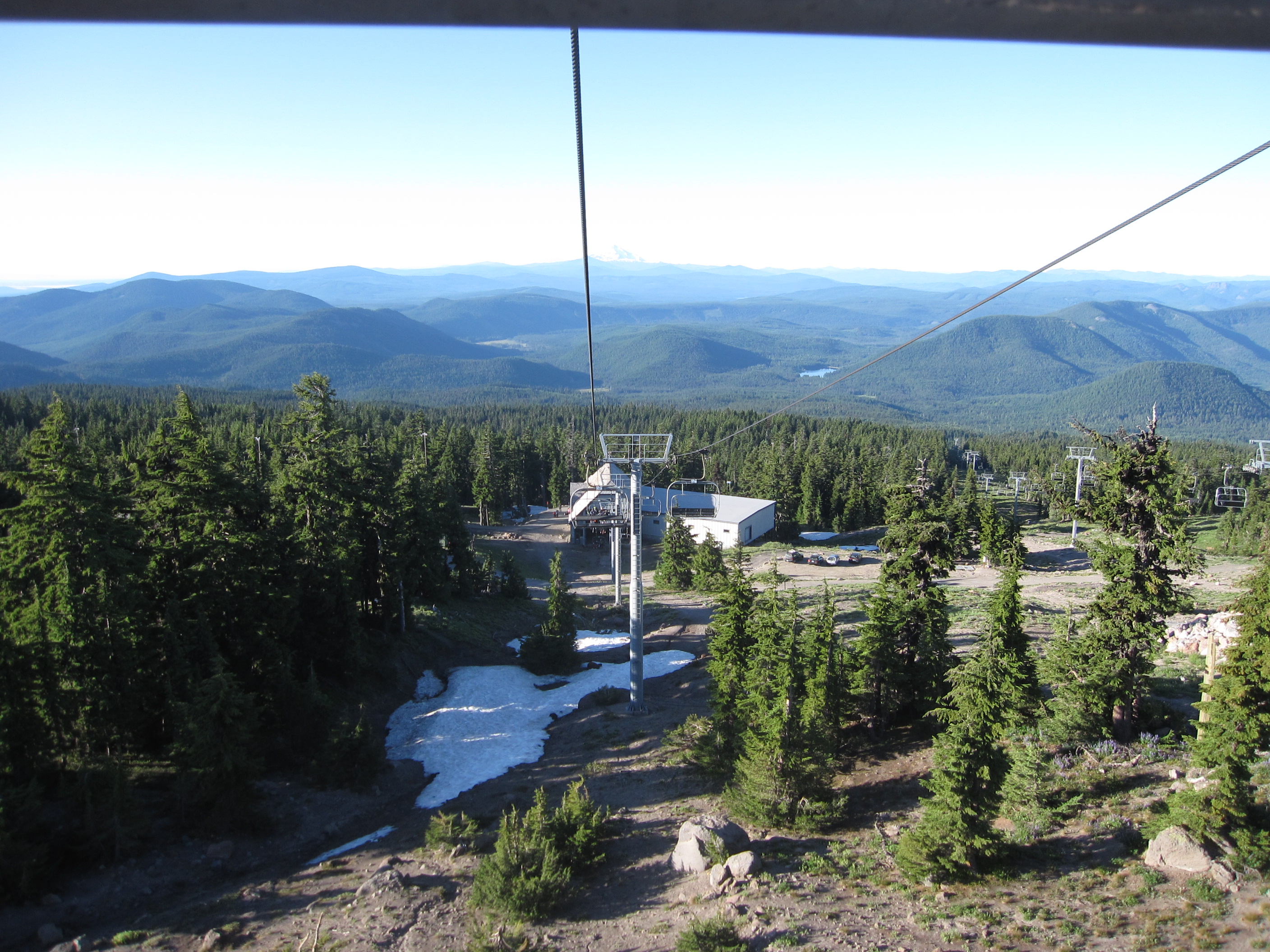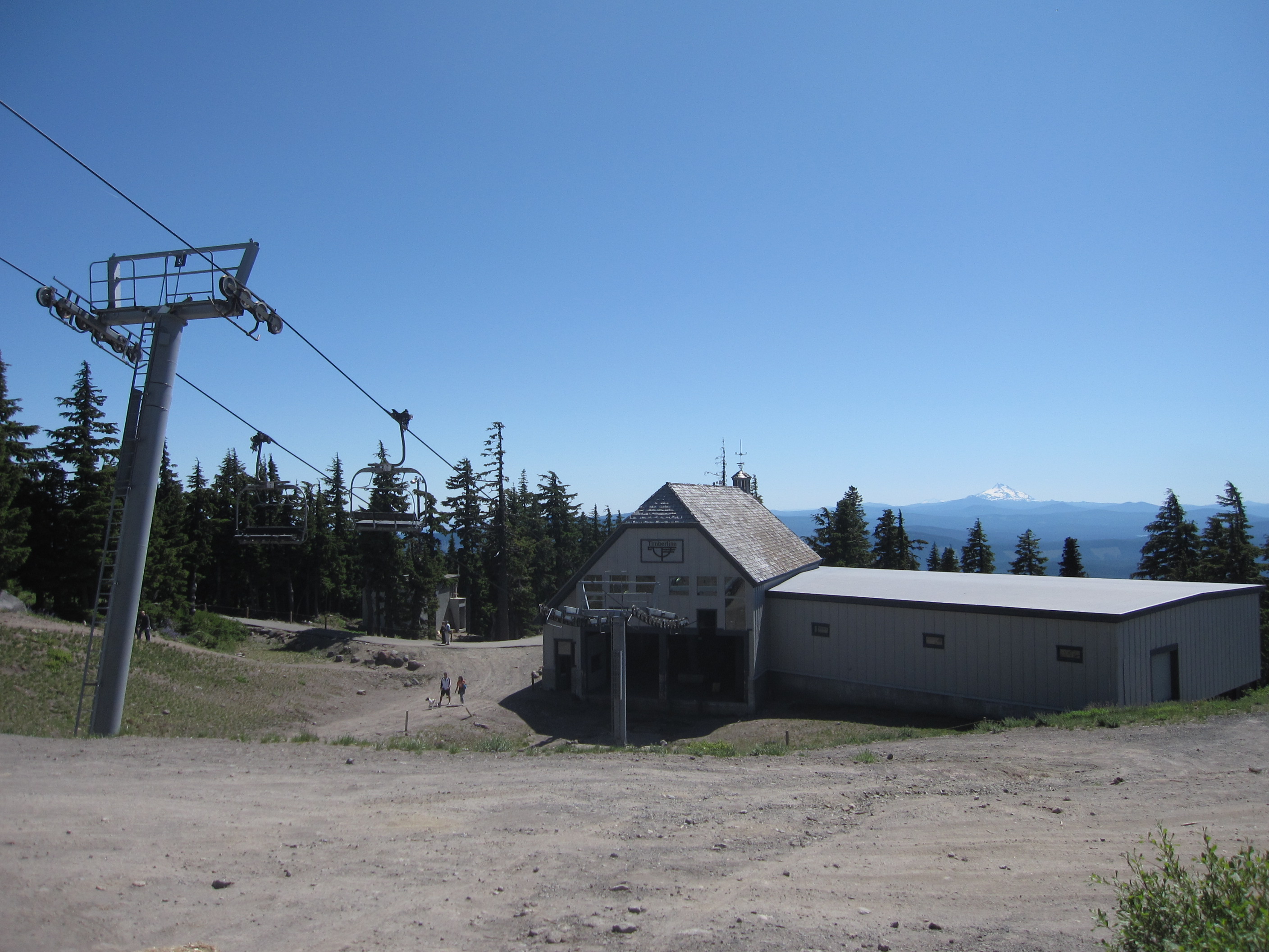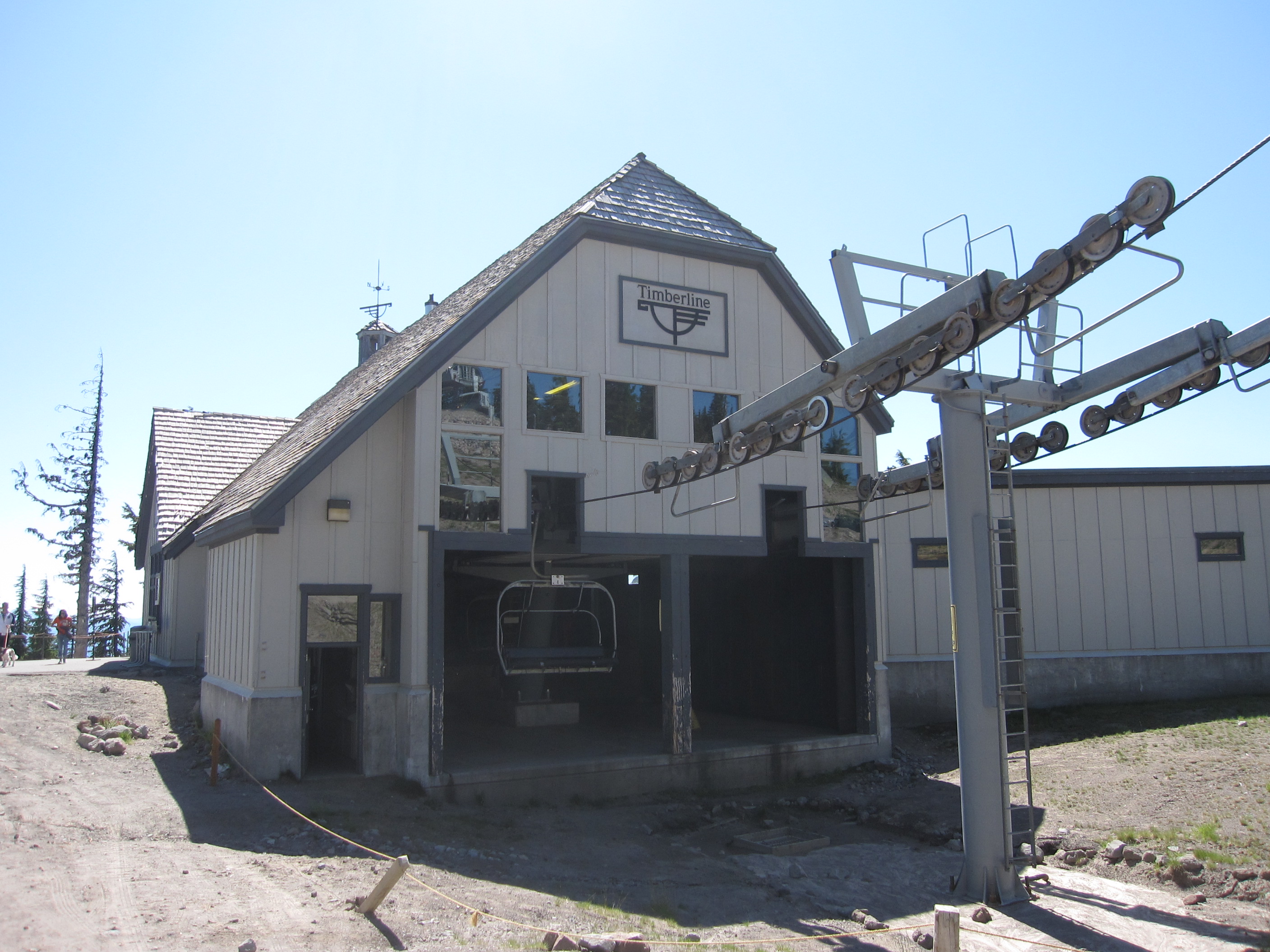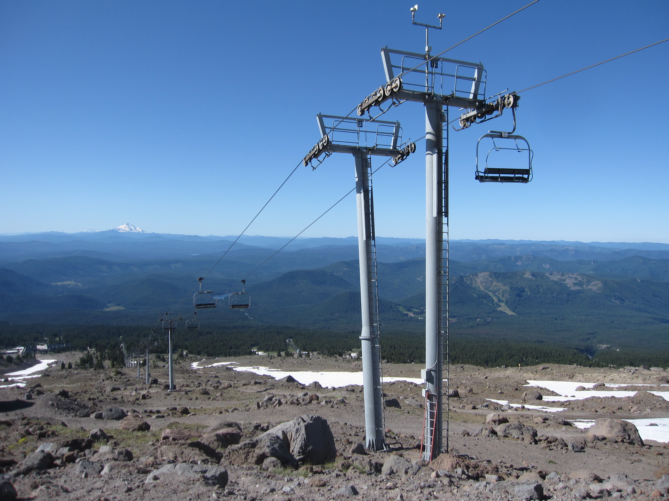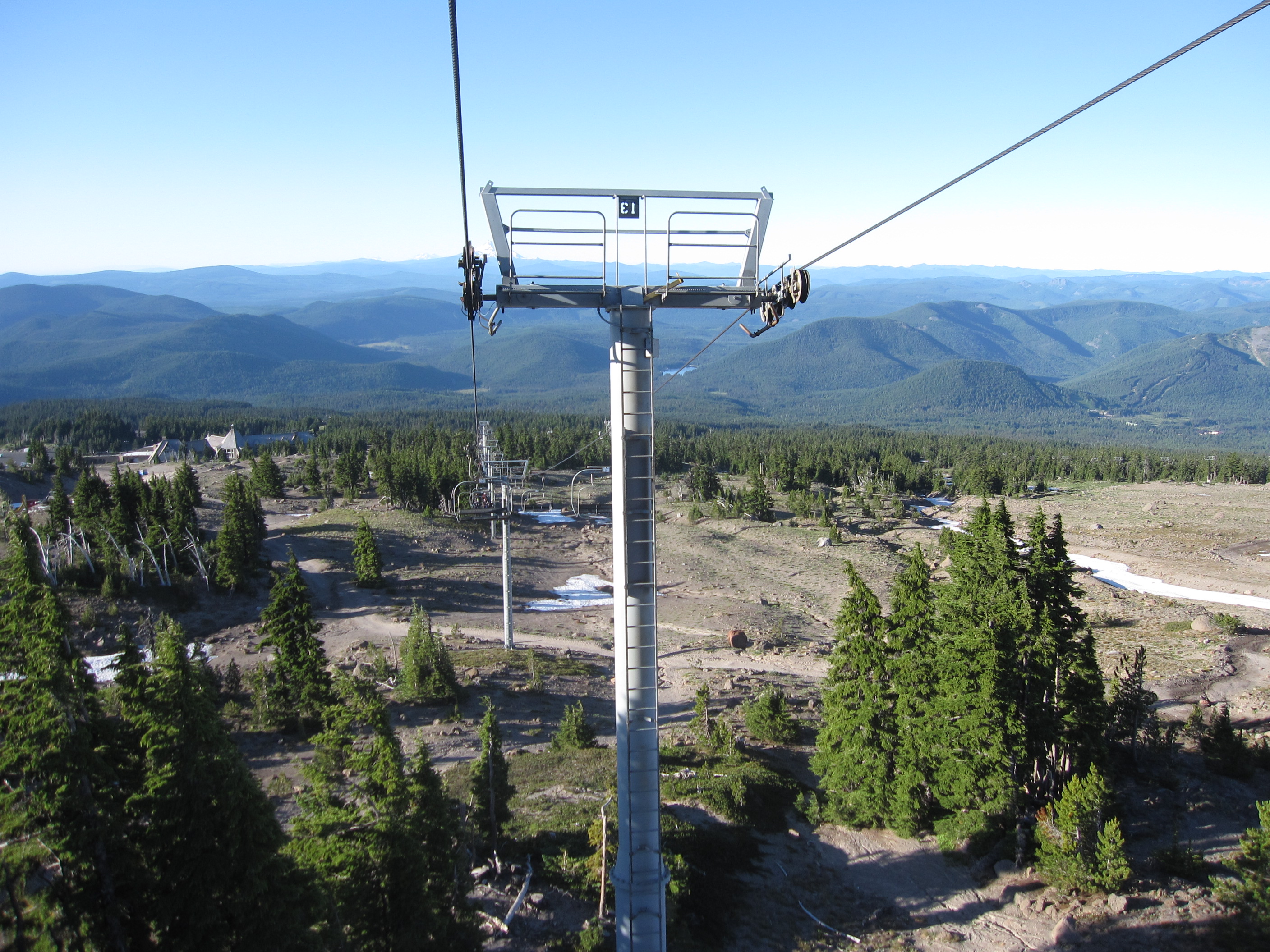 Lower lift line.Riding up at tower 6.Looking down from tower 13.Approaching the top.Mile-long lift line.The top terminal is in a building like most high-altitude lifts on Mt. Hood.Bottom terminal.Bottom with chair parking building.