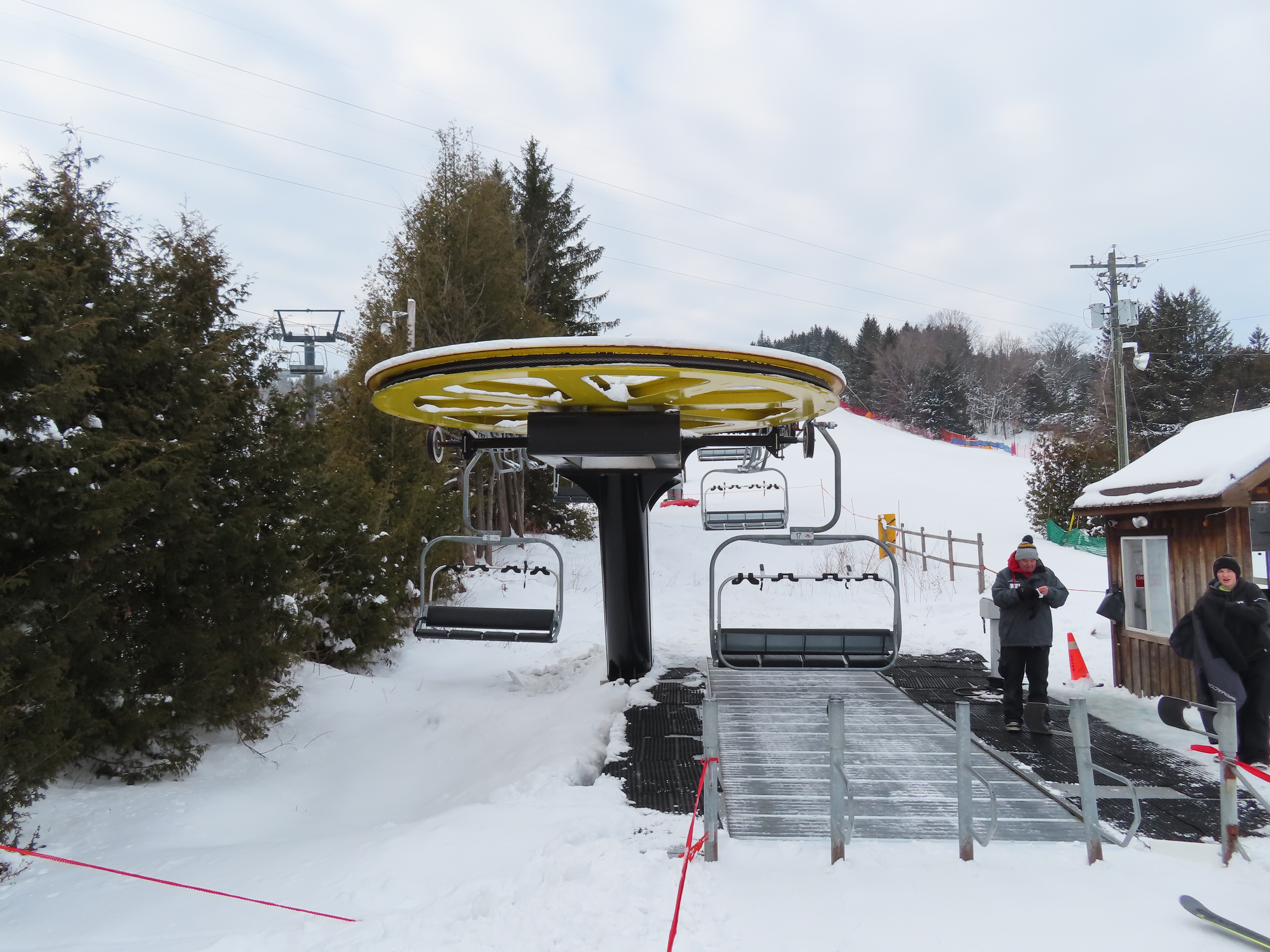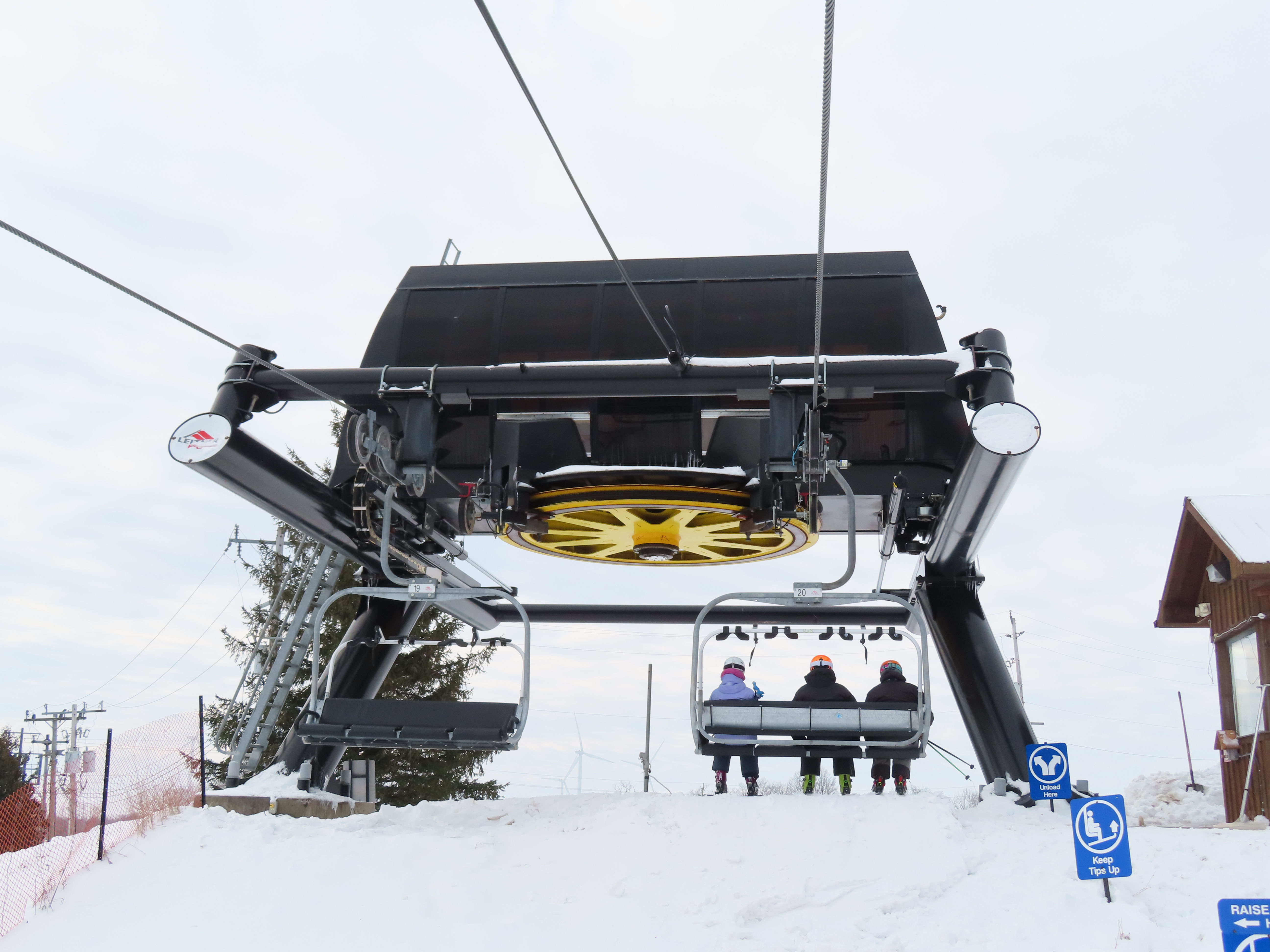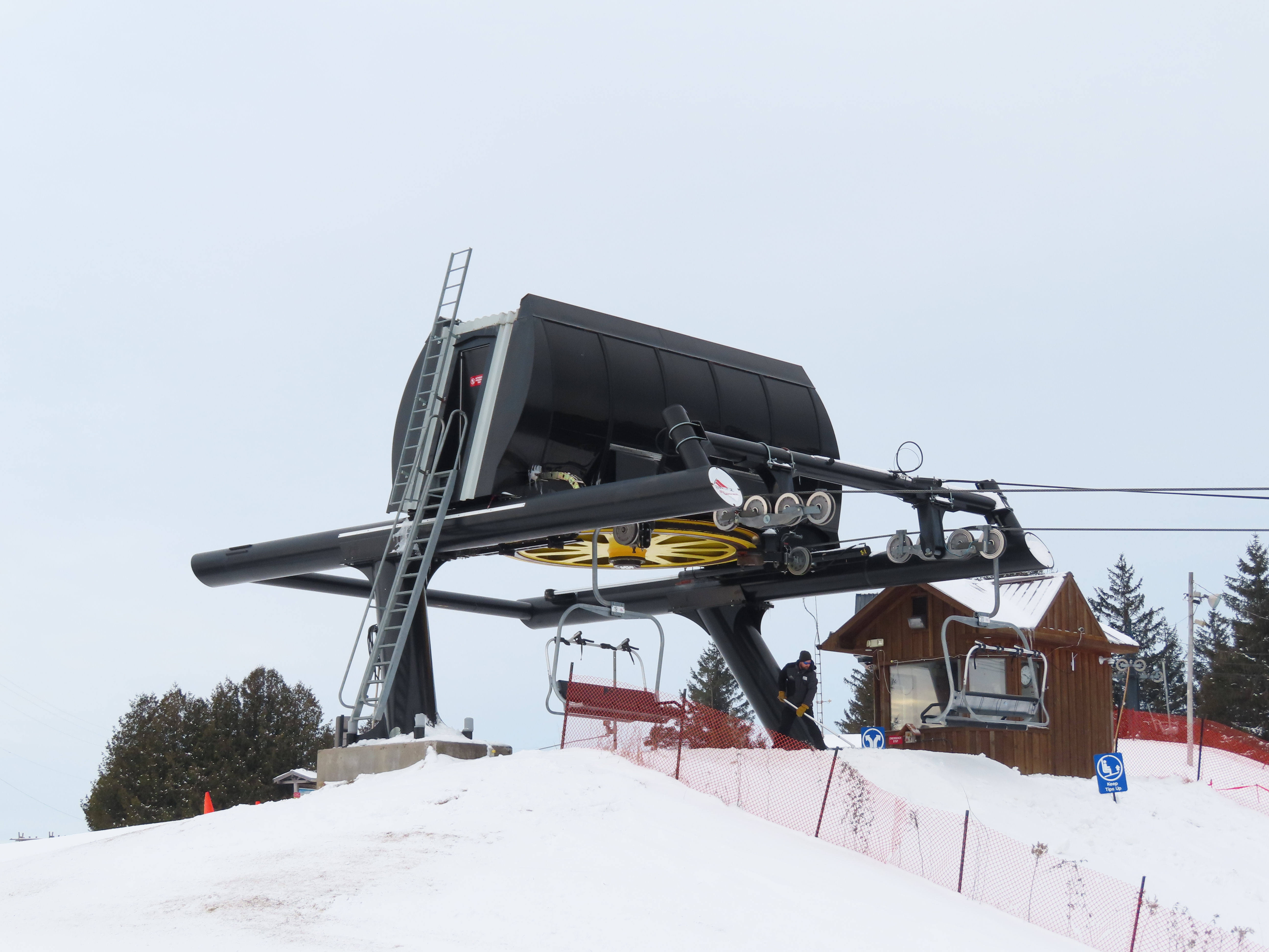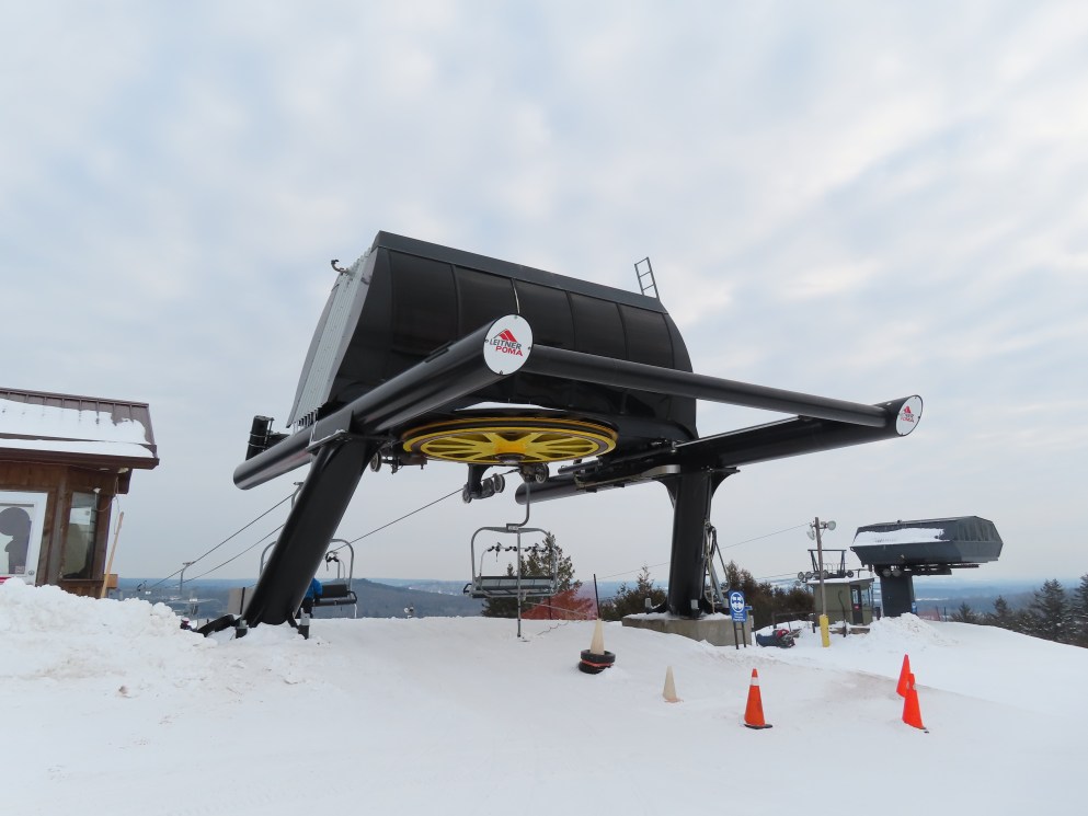 Leitner-Poma installed this quad at Brimacombe in 2012.Loading area with Emmegi conveyor.Top Alpha drive terminal.Unloading area near the Boulevard Quad.Side view of the top terminal.View from the summit.The lift line crosses under high tension power lines.Upper half of the lift line.Leitner-Poma Z terminal.