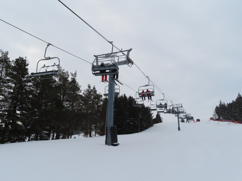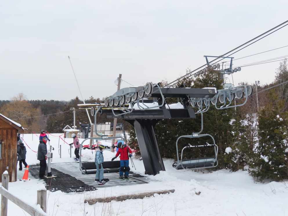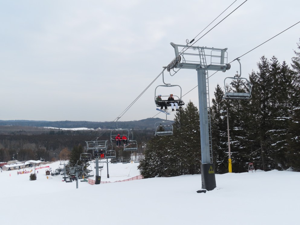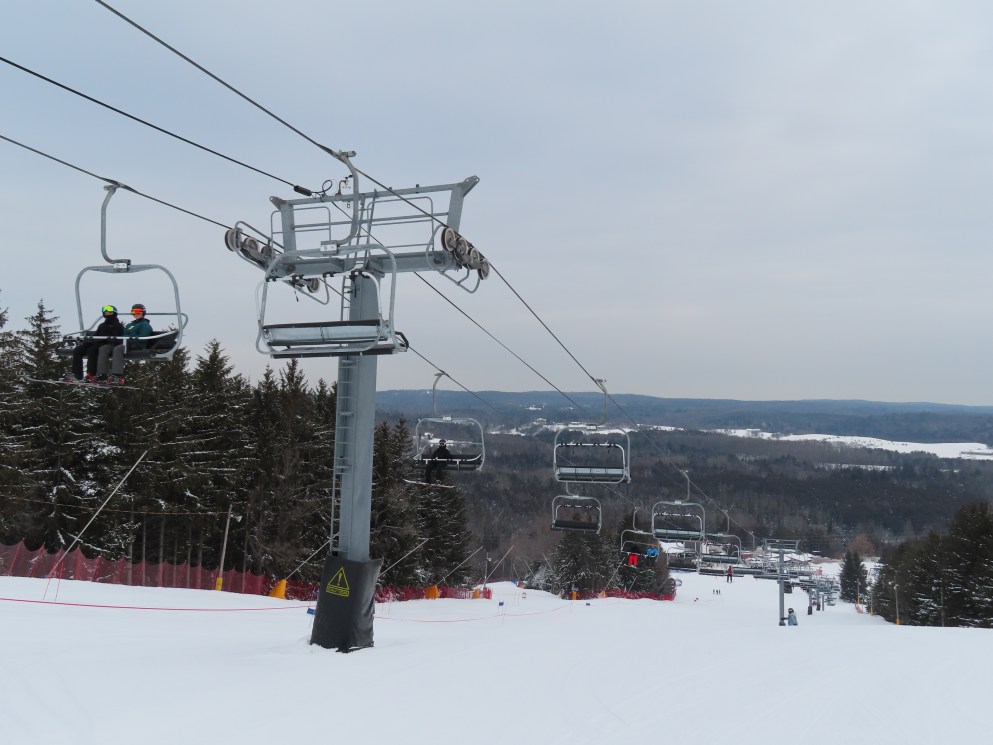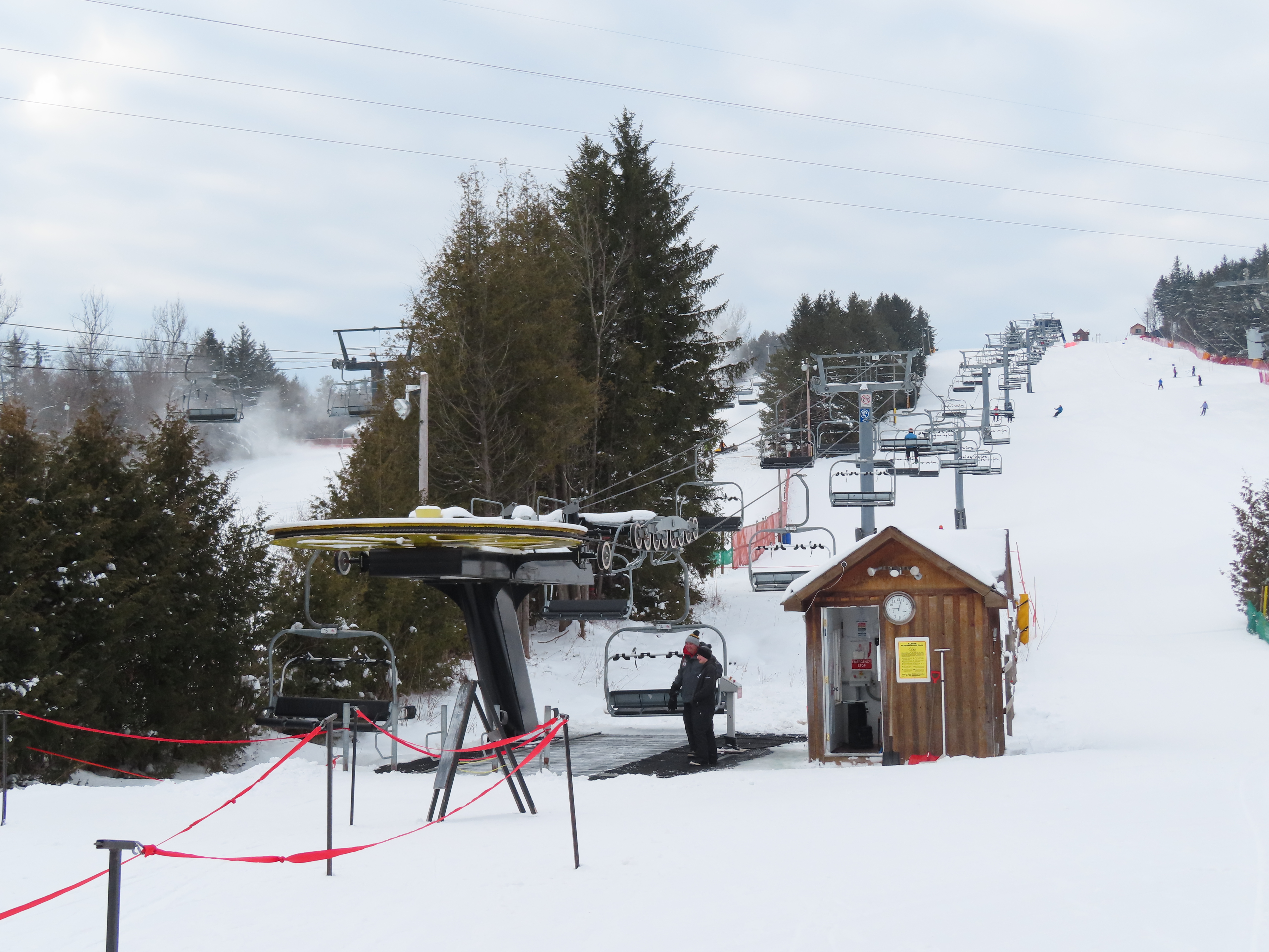 Leitner-Poma installed this quad at Brimacombe in 2012.Loading area with Emmegi conveyor.Top Alpha drive terminal.Unloading area near the Boulevard Quad.Side view of the top terminal.View from the summit.The lift line crosses under high tension power lines.Upper half of the lift line.Leitner-Poma Z terminal.