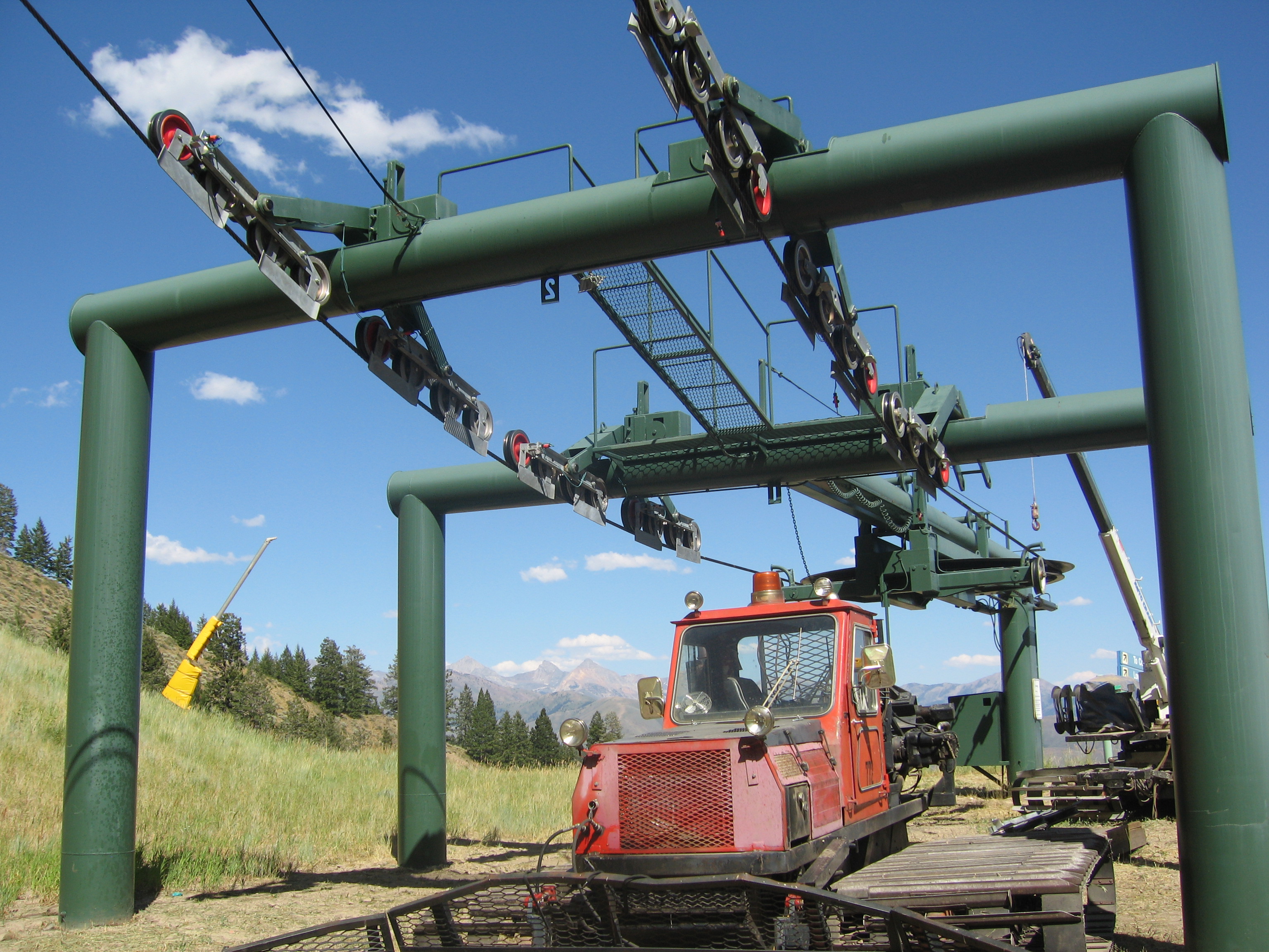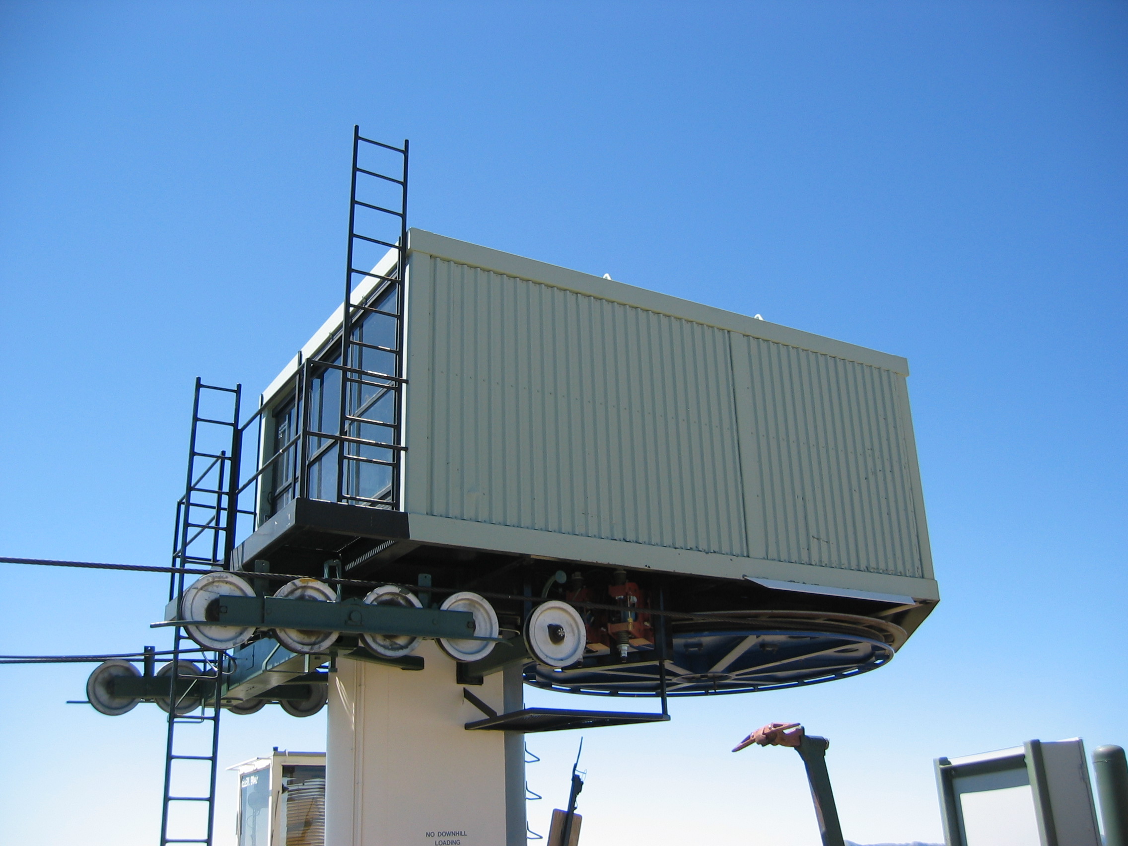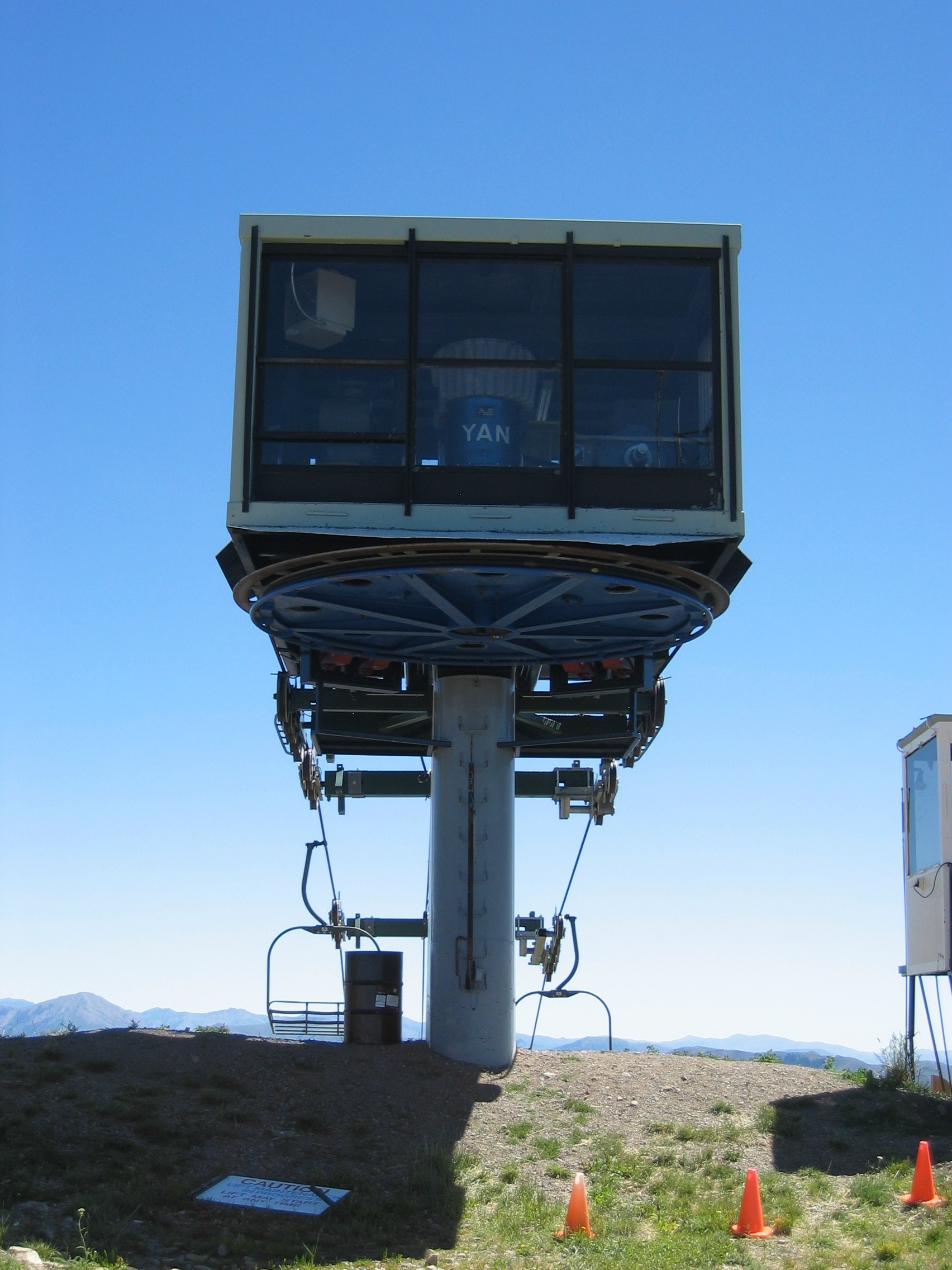 Bottom tension terminal.Portal tower.Looking up from the base.Top drive station.Looking down the line.Yan top terminal.Breakover towers near the summit.Looking down line.Yan tower with Doppelmayr combo assembly.View up the line.This terminal was originally located further downhill.