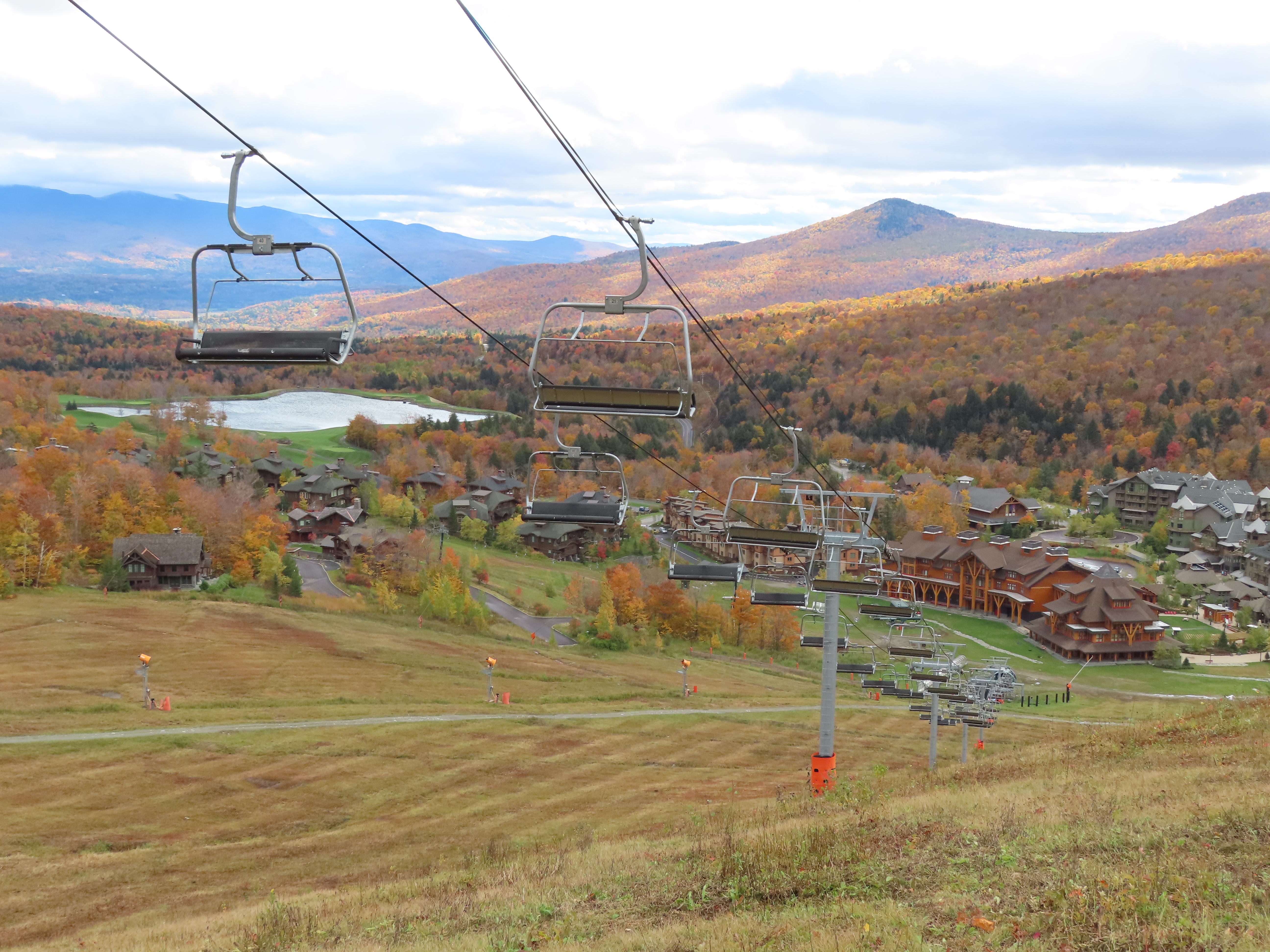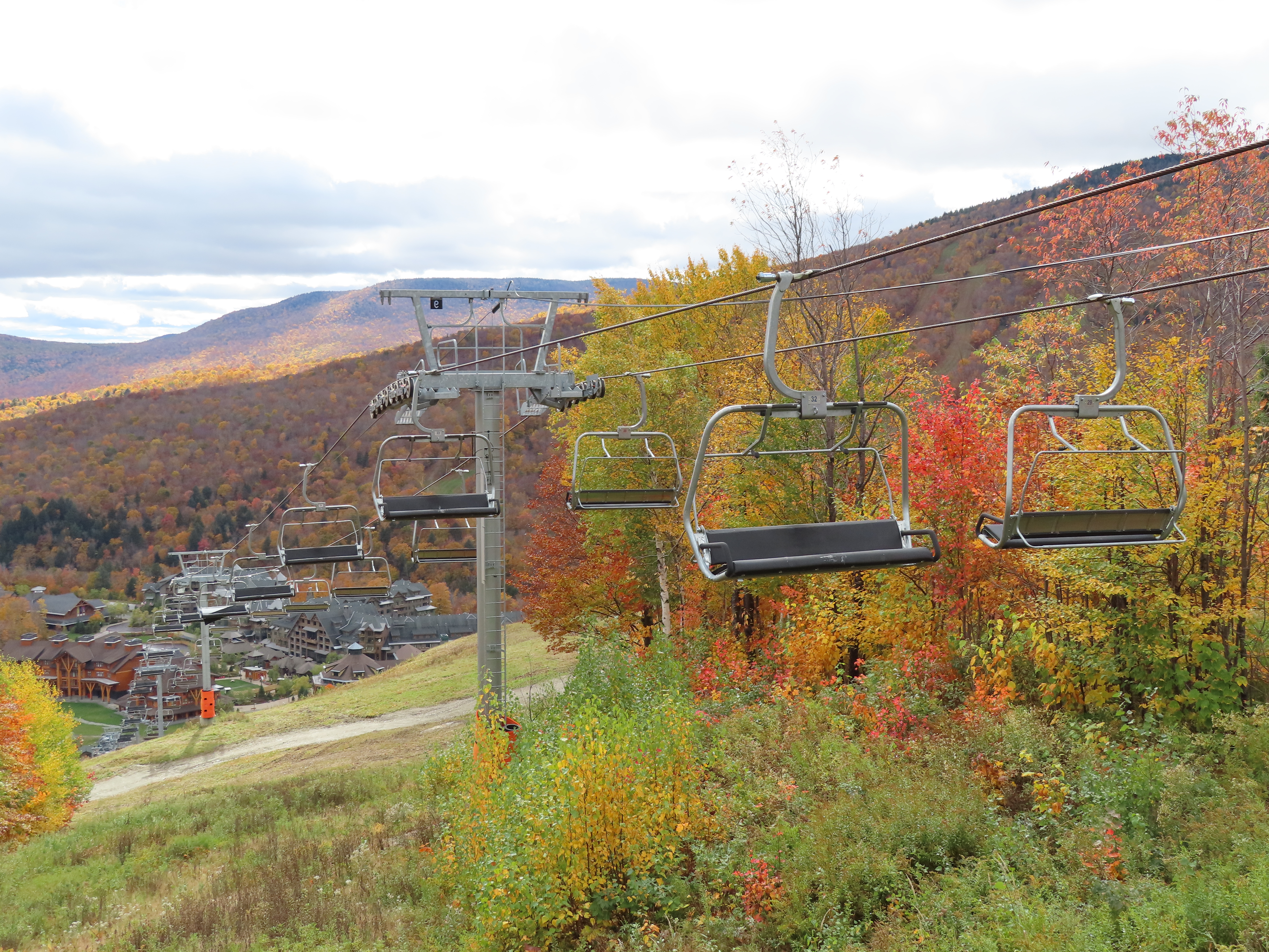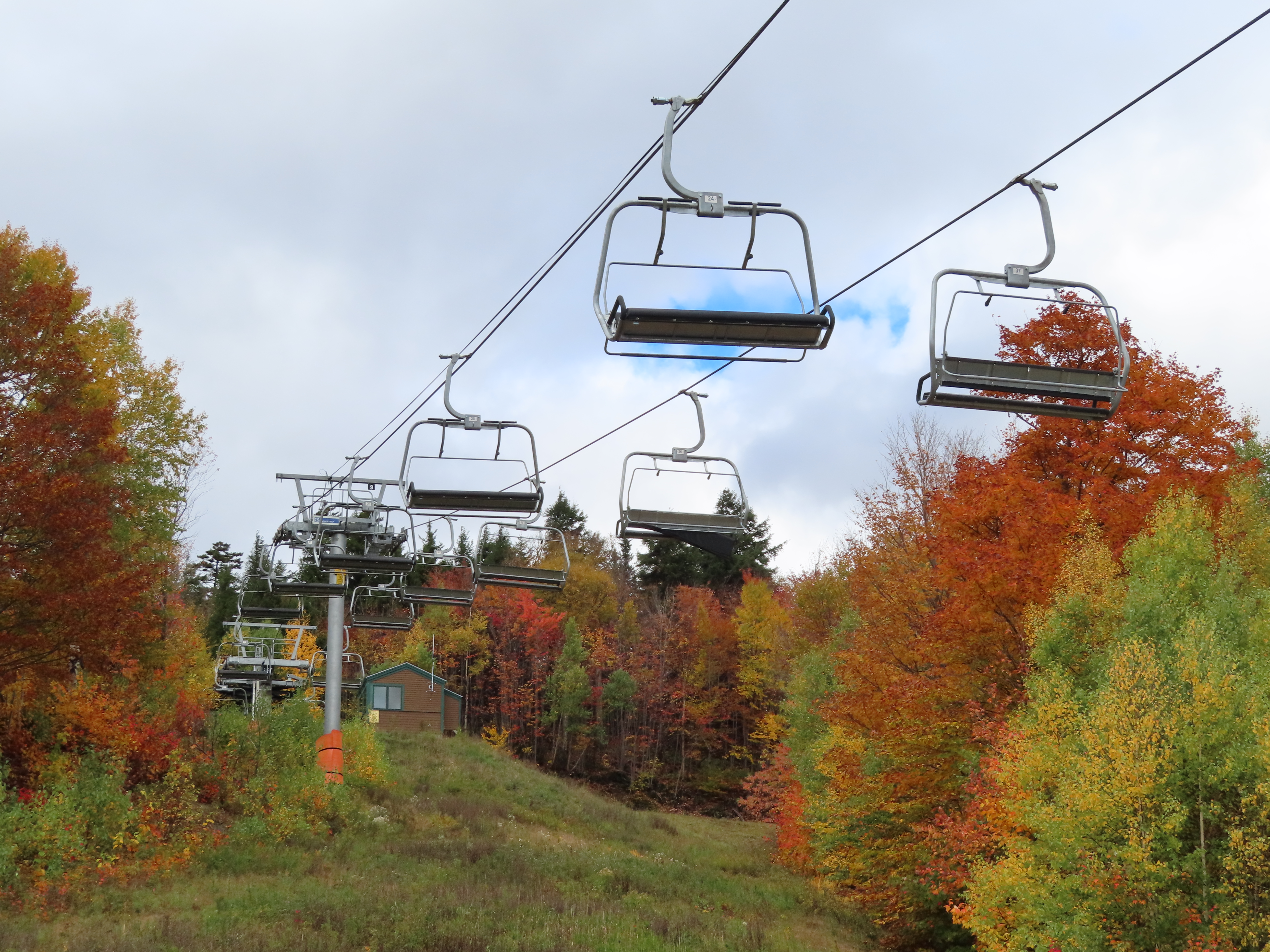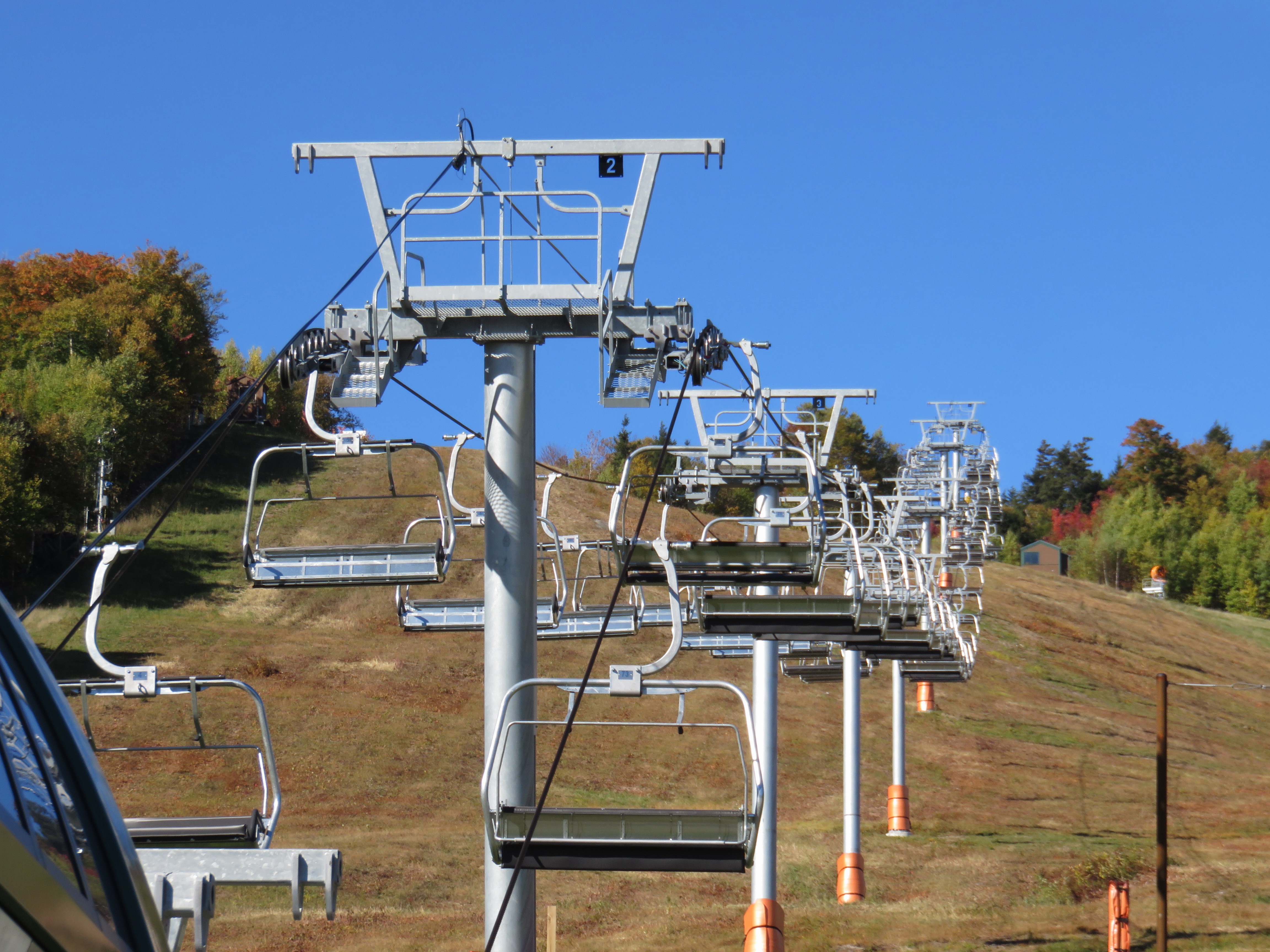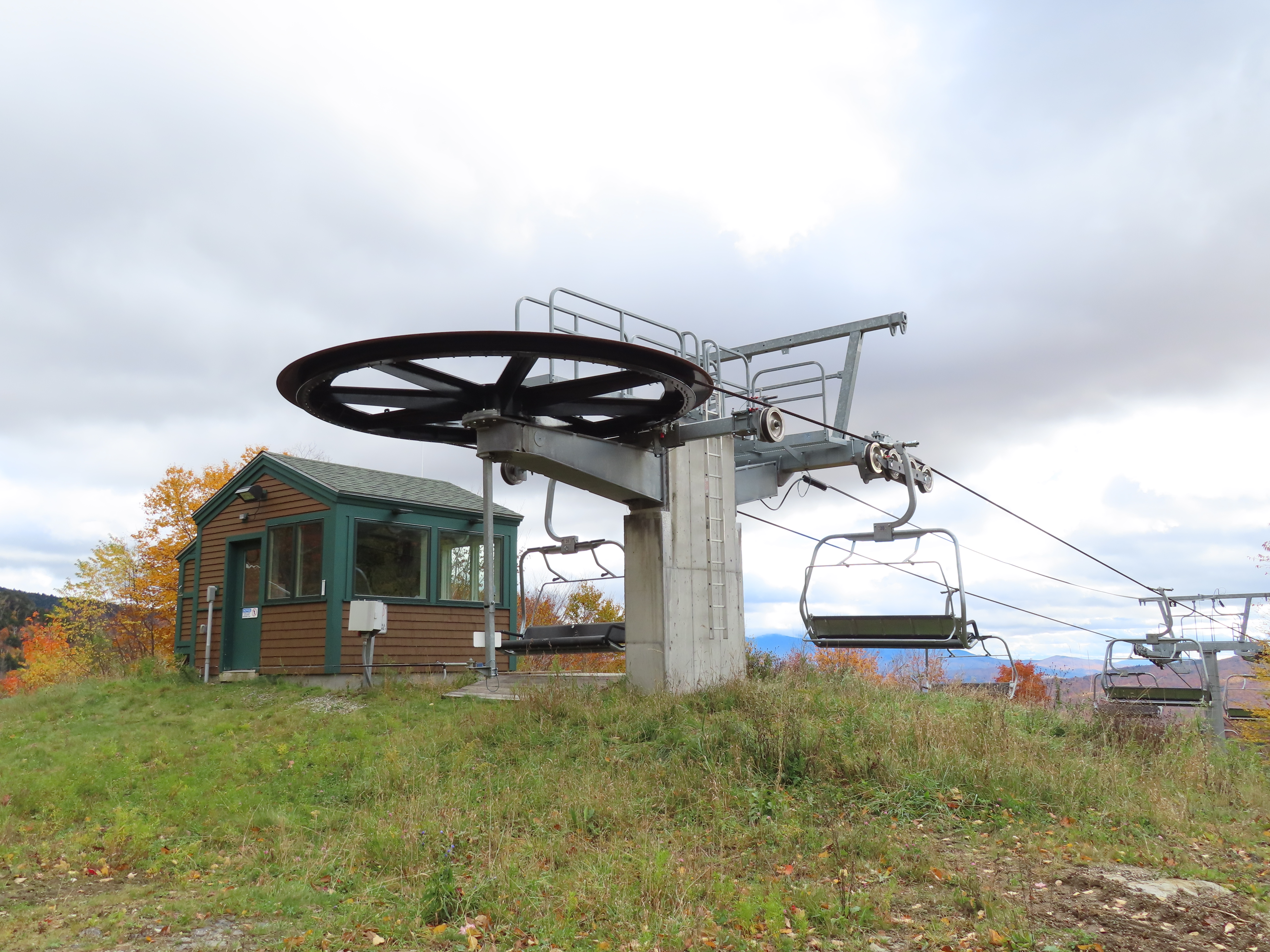 Lift line.Doppelmayr Tristar terminal with drive and tension.Loading area with Chairkit carpet.Another view up the line.Lift overview.Most of the lift seen from Mansfield.View straight up the line.Looking down to the village.Upper section of the lift.Fixed return bullwheel.Another angle on the top terminal.View from the summit.