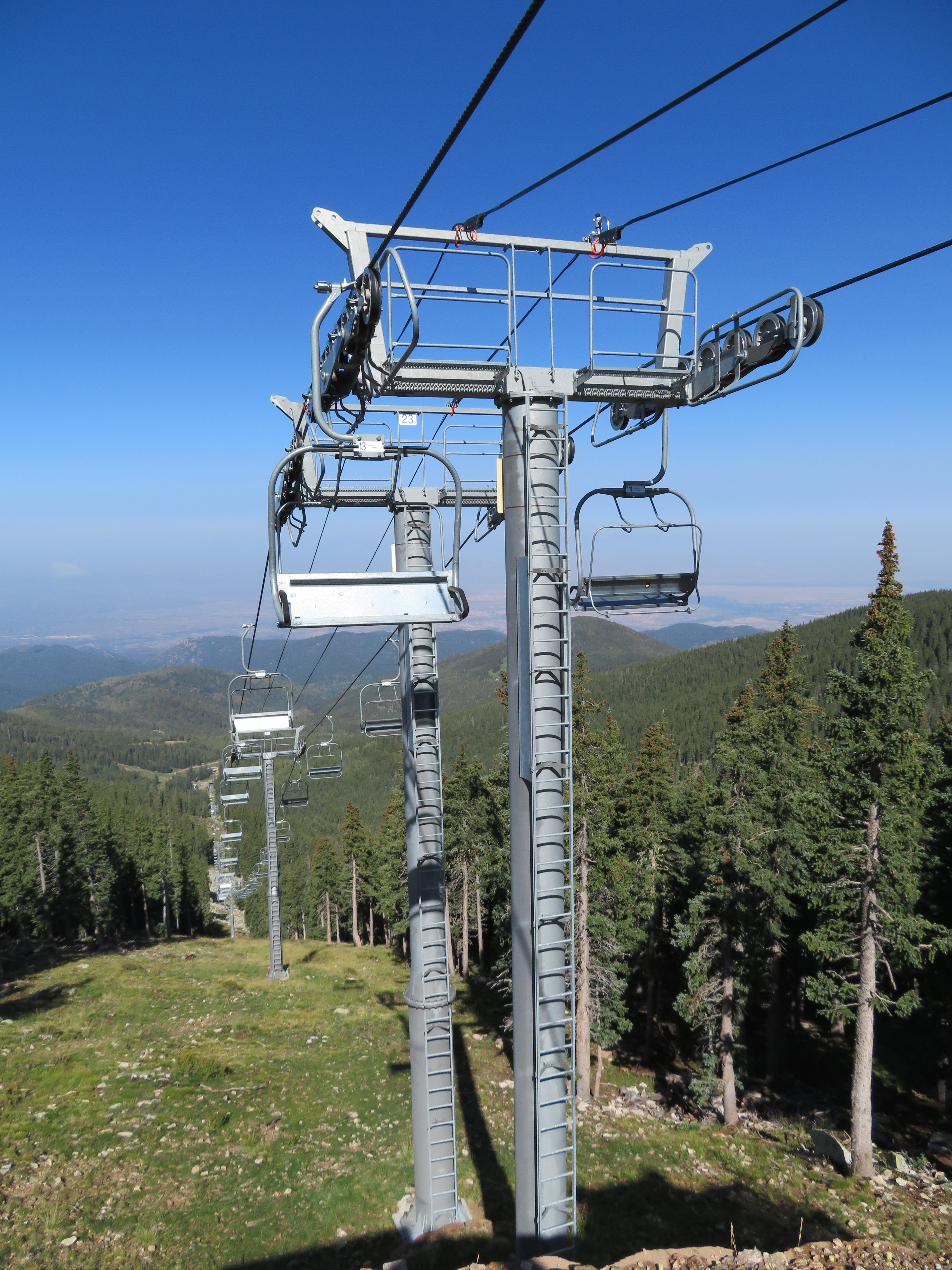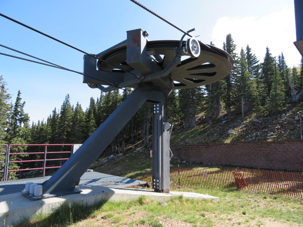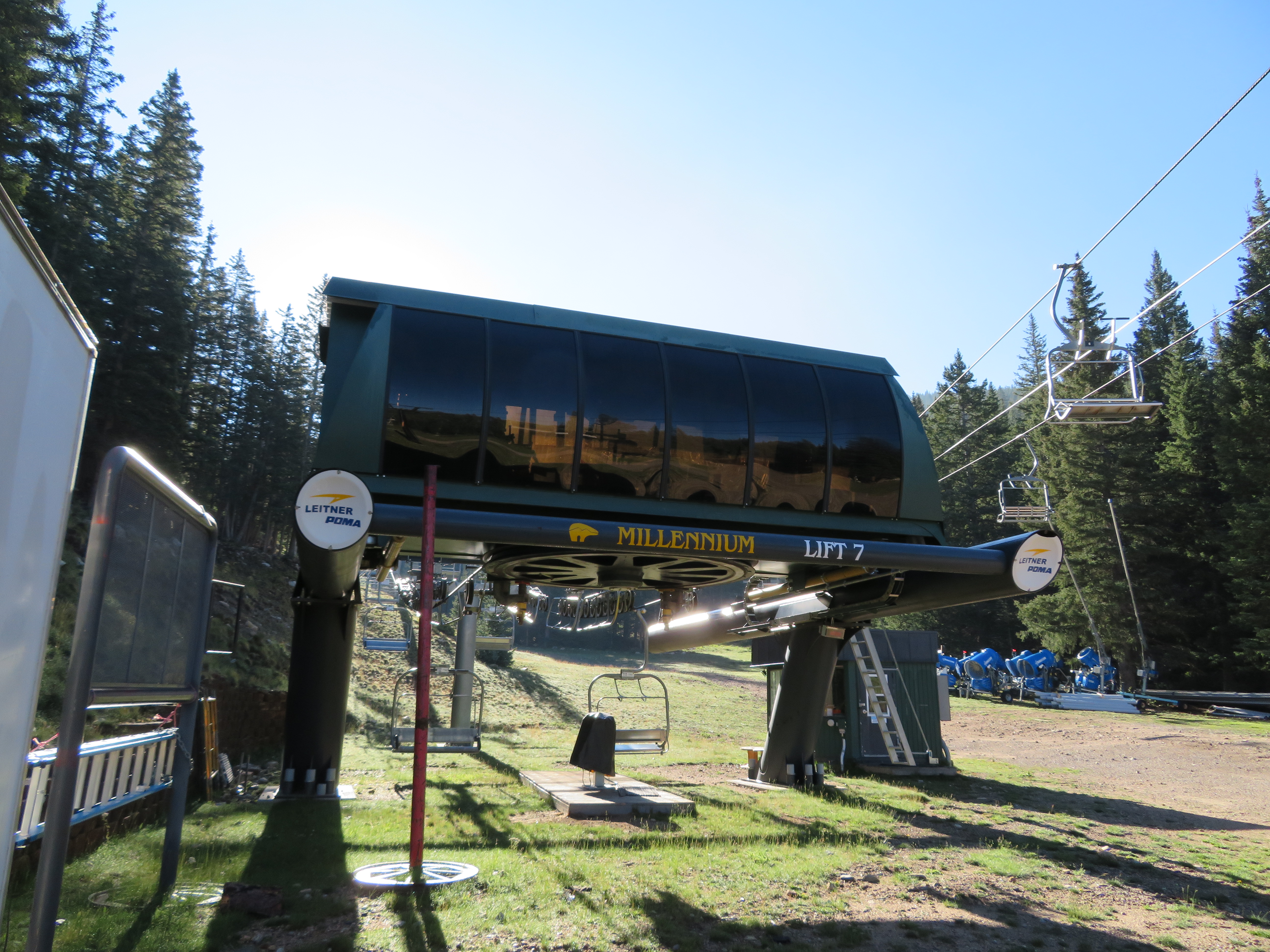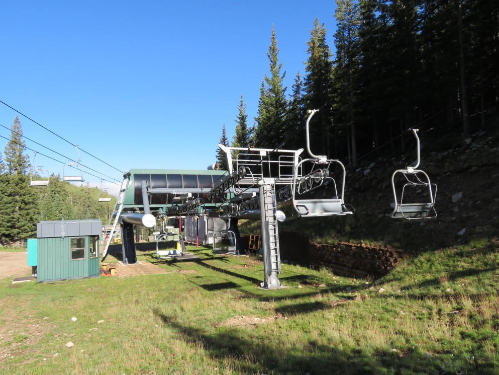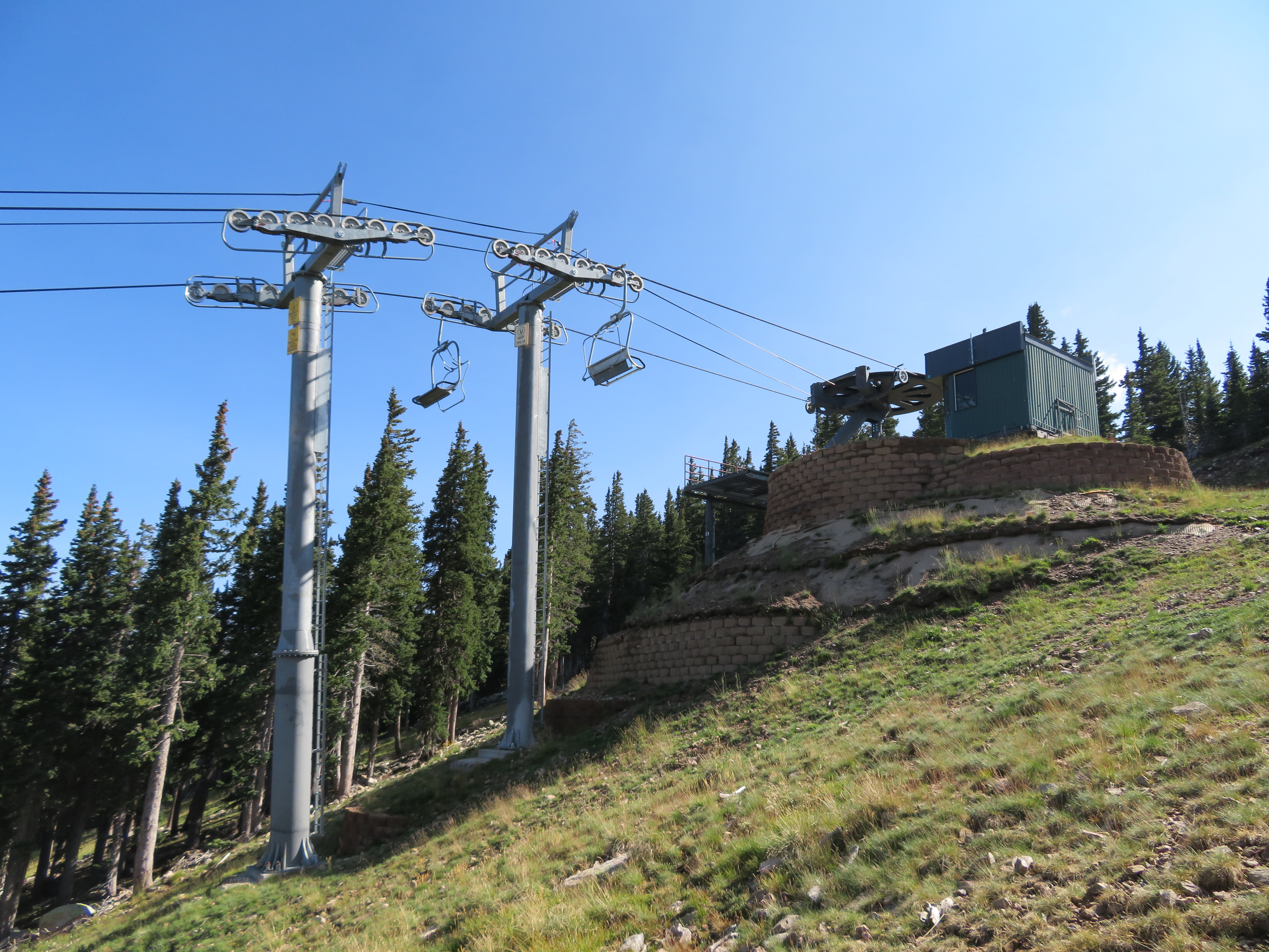 The Millennium expansion opened in 2005 and added a bit of vertical to Ski Santa Fe.The bottom station and tower 1.Another view of the Alpha drive.Side view of the lower station and operator house.Breakover towers 23 and 24.Fixed return bullwheel up top.View down from the summit.Tower 22.Upper station overview.View down the lower part of the line.Another line section.Lift overview.The upper part of the line.Riding past the first of two large water tanks along the line.View back down about half way up the line.Breakover towers 14 and 15.Upper lift line.View back down near the summit.