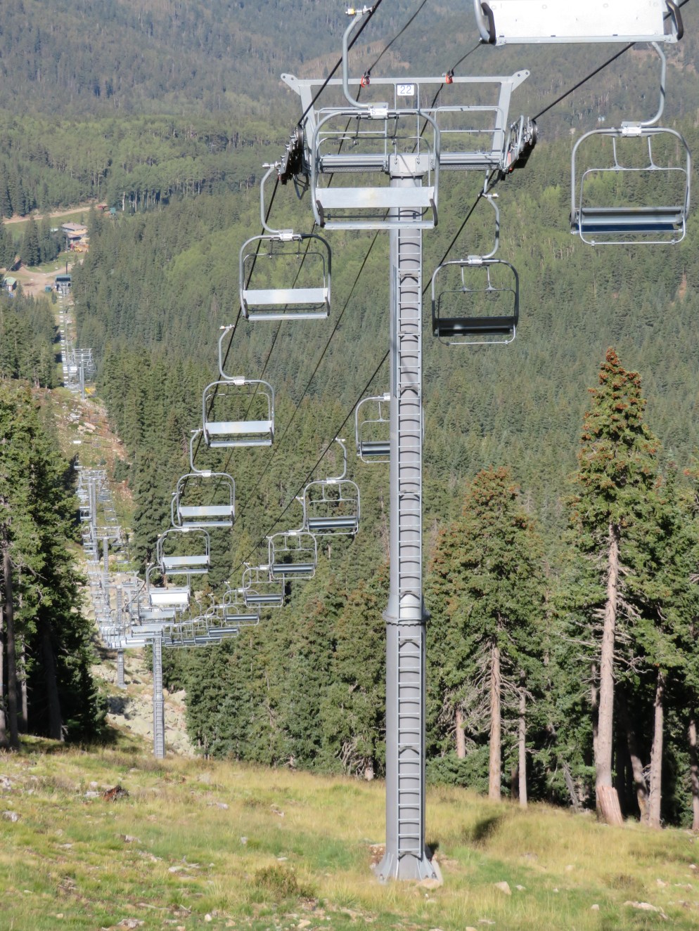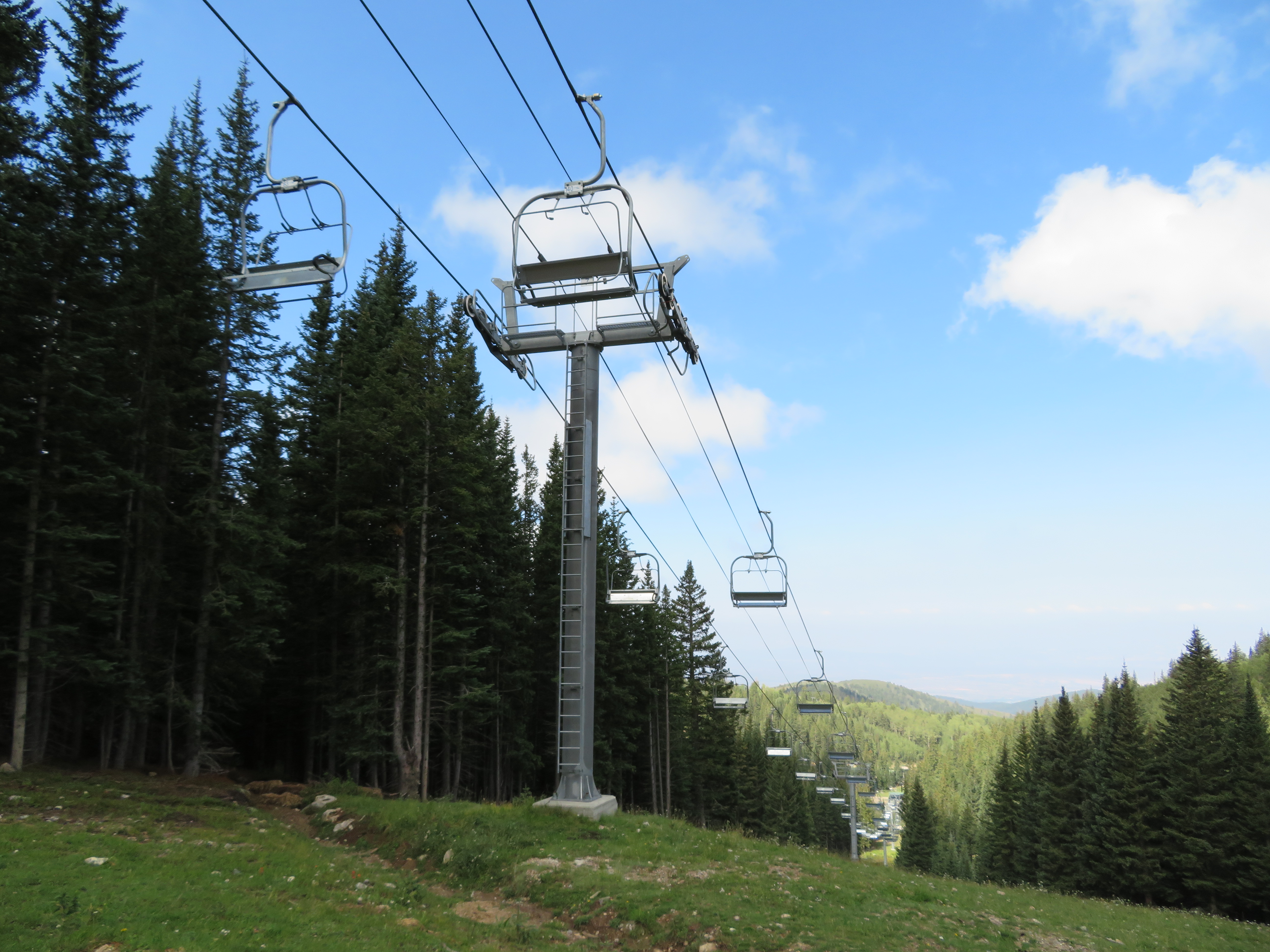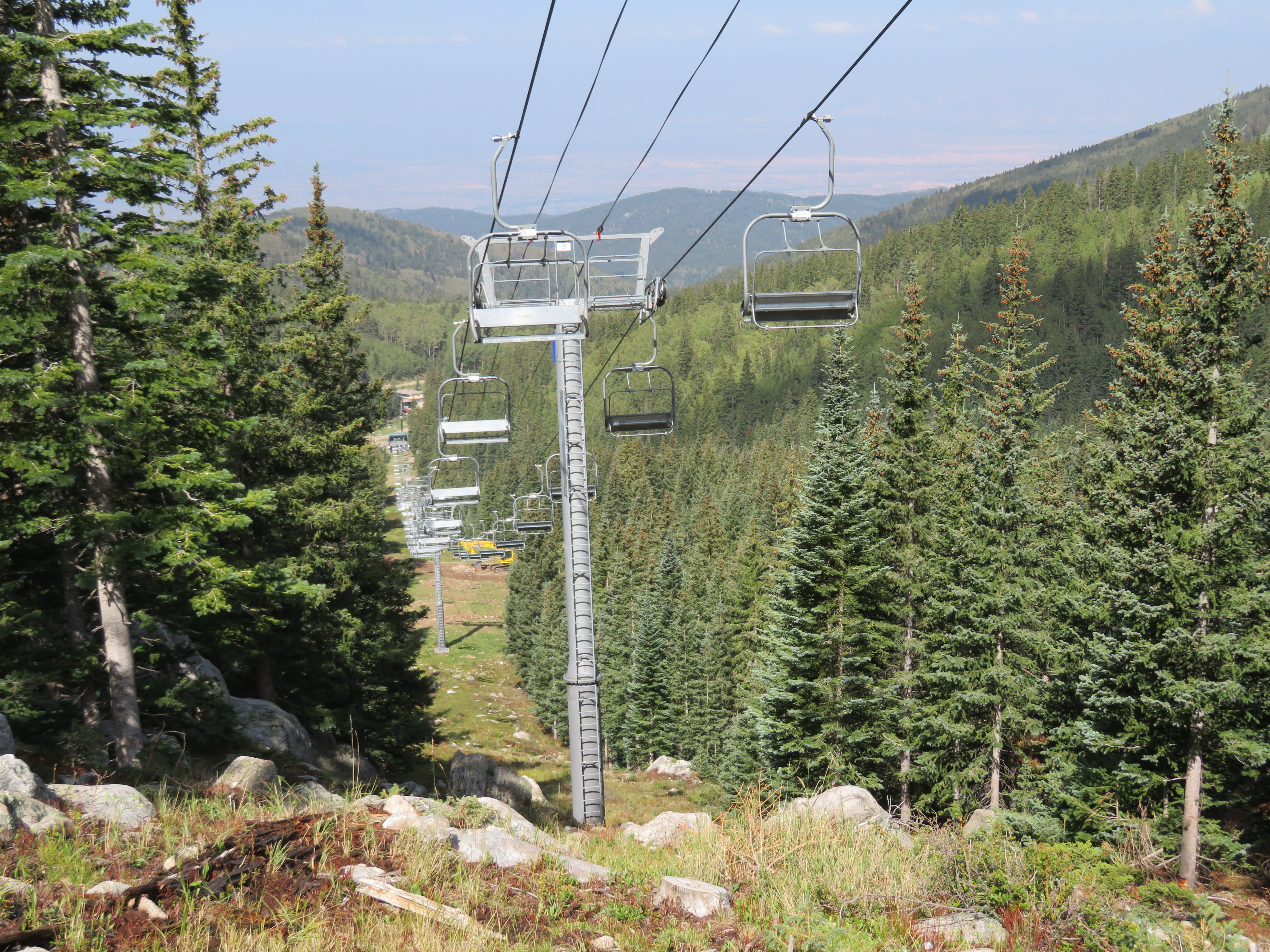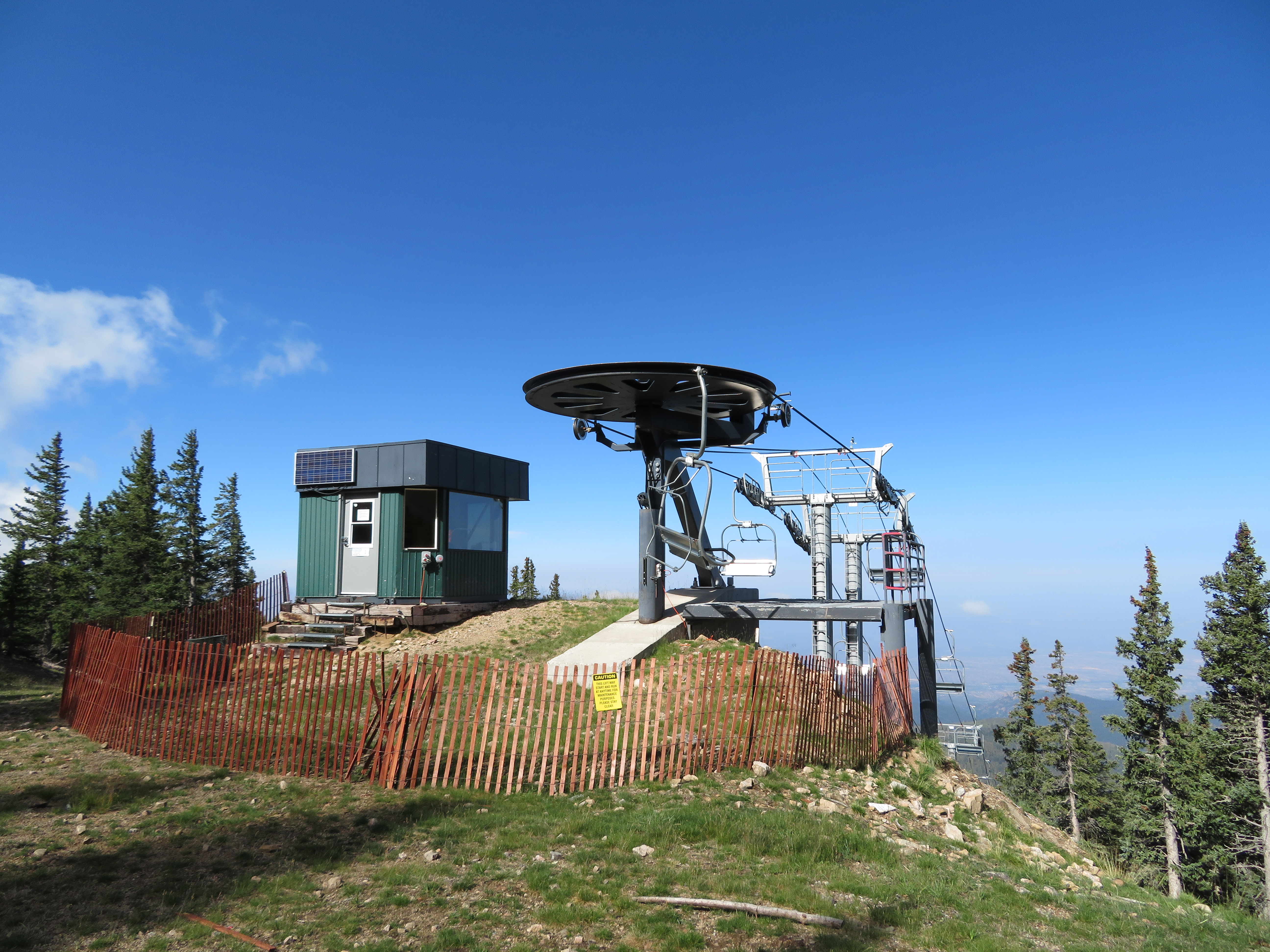 The Millennium expansion opened in 2005 and added a bit of vertical to Ski Santa Fe.The bottom station and tower 1.Another view of the Alpha drive.Side view of the lower station and operator house.Breakover towers 23 and 24.Fixed return bullwheel up top.View down from the summit.Tower 22.Upper station overview.View down the lower part of the line.Another line section.Lift overview.The upper part of the line.Riding past the first of two large water tanks along the line.View back down about half way up the line.Breakover towers 14 and 15.Upper lift line.View back down near the summit.