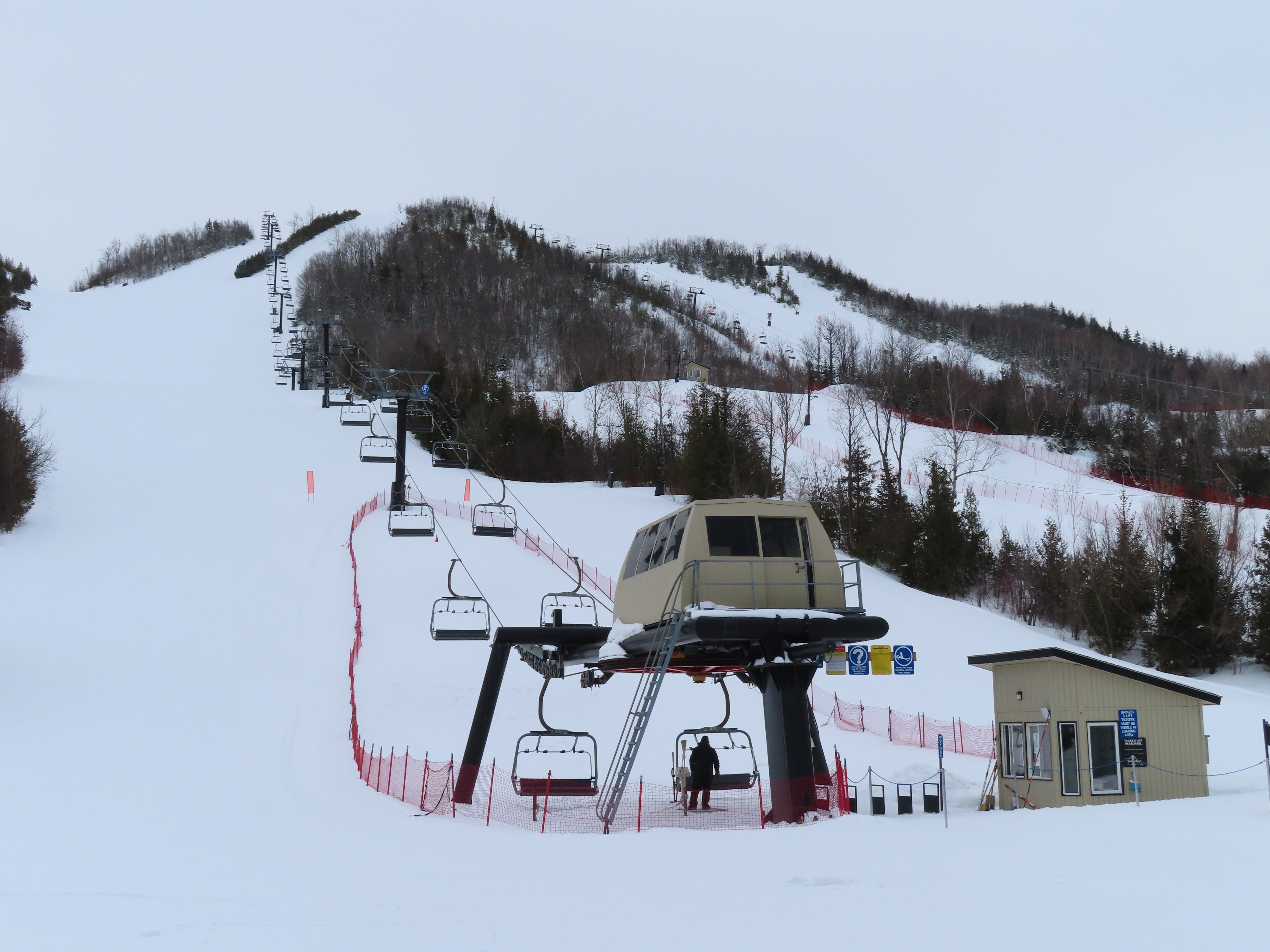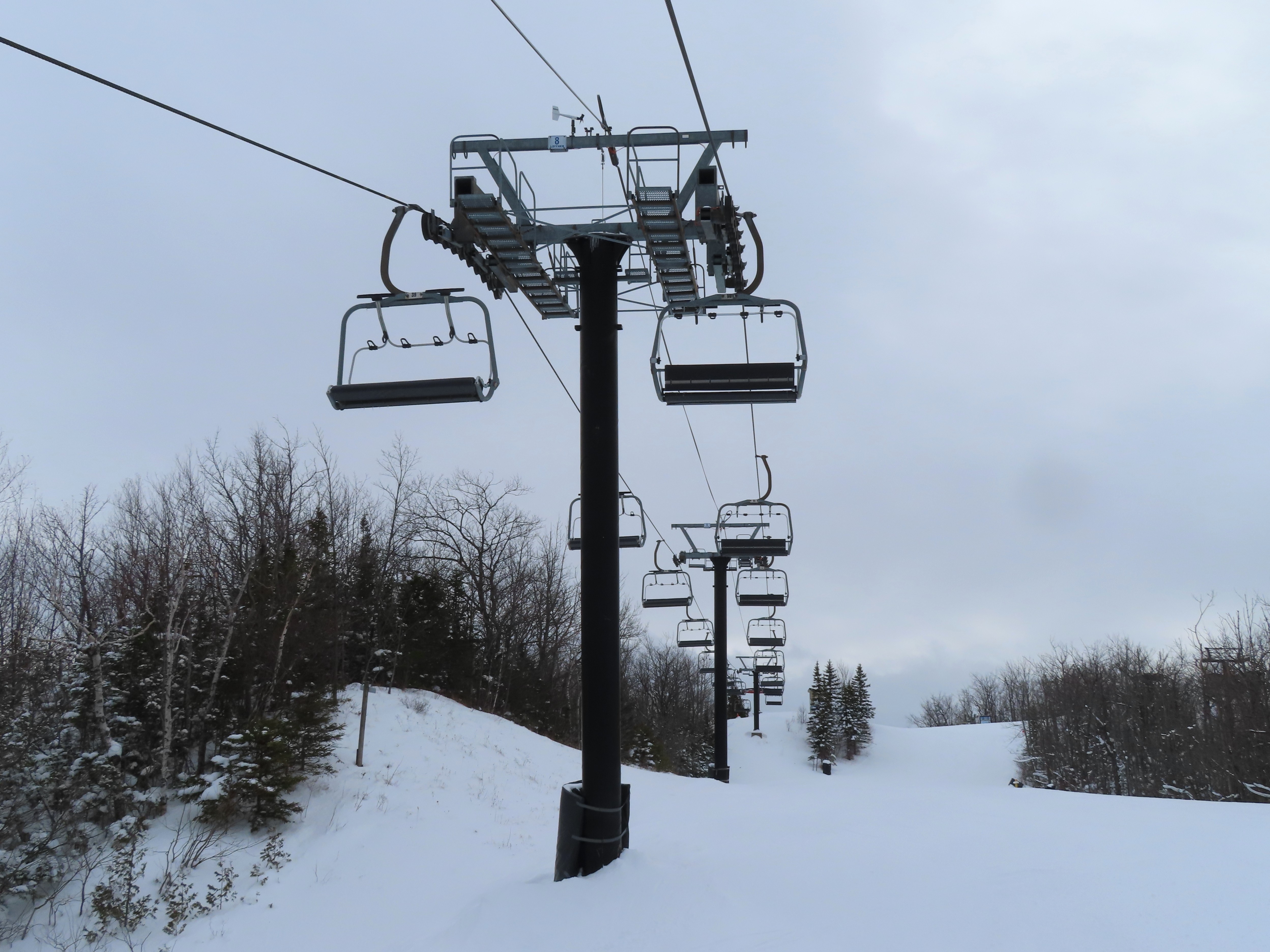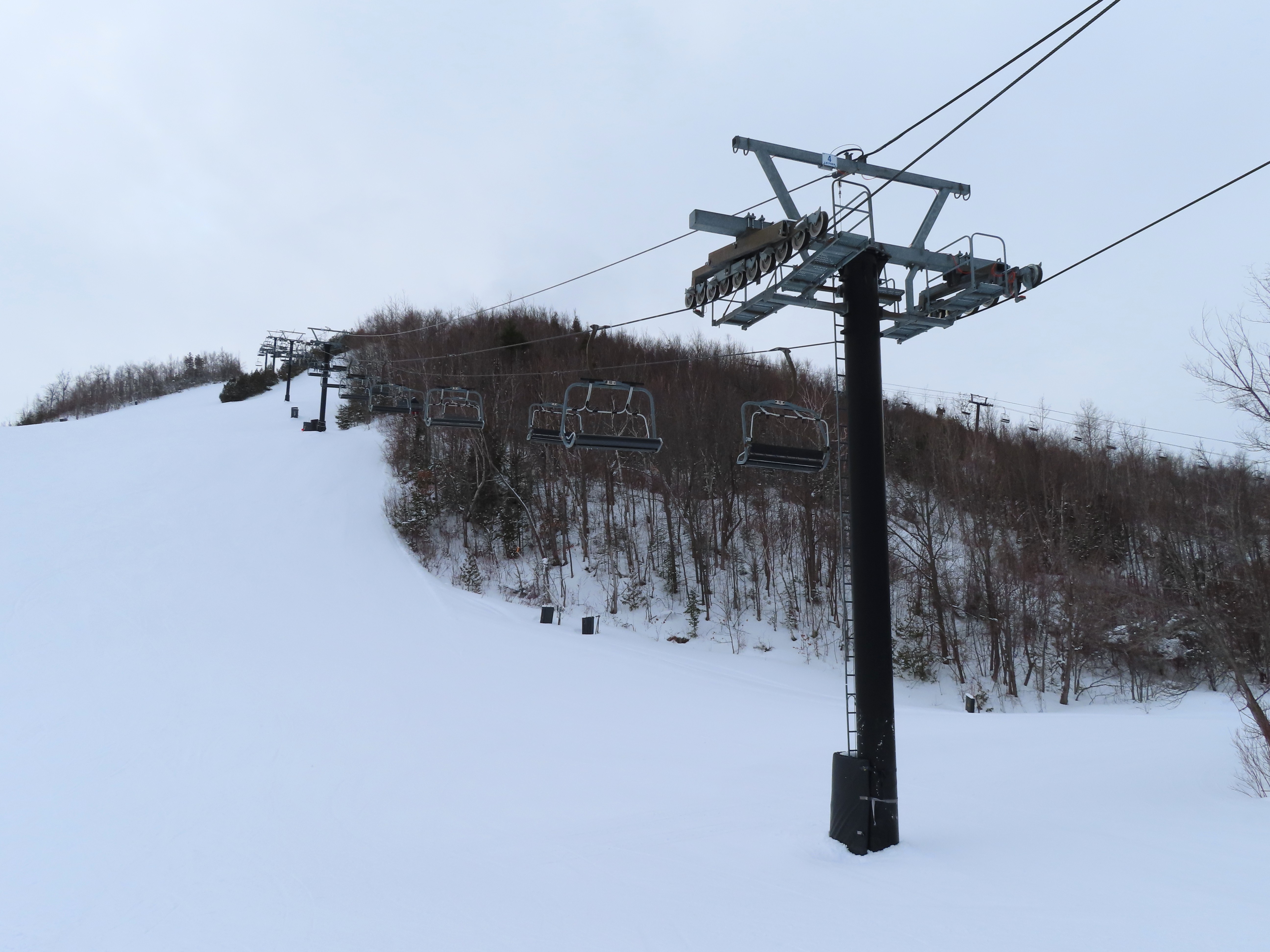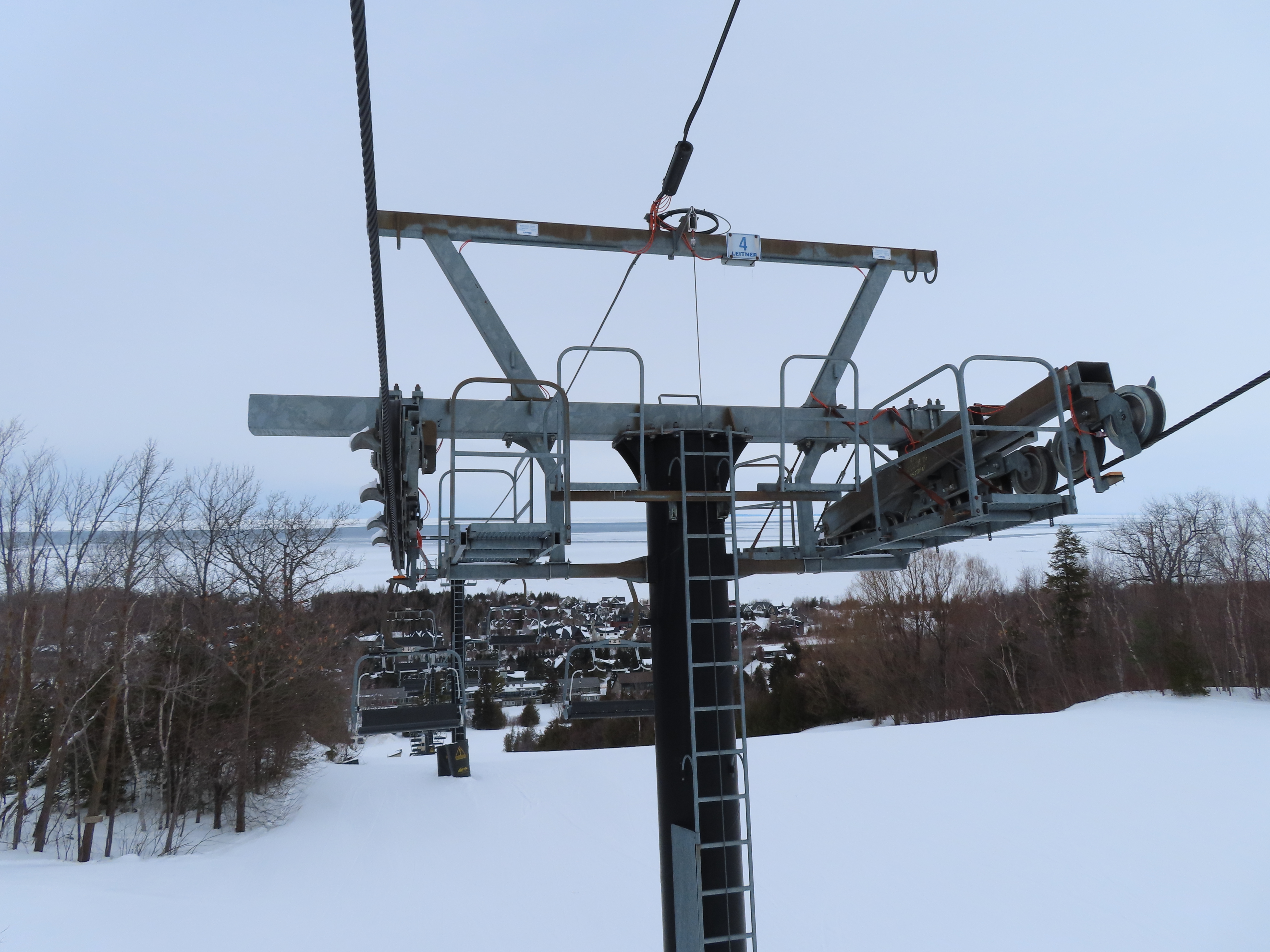 This fixed quad services uncrowded advanced terrain at the east end of the mountain.A heavily-loaded supprt tower.Leitner constructed this lift at the same time as the mountain’s workhorse detachable quad.Flat section of the line.View up the steepest part of the line.Lower lift line above Georgian Bay.Rare Leitner fixed grip terminal in North America.Loading area and motor room.View riding up the line.View back down at T7.Nearing the summit.Leitner chair with foot rests.Arriving at the top.Snowflake style return bullwheel.Lift overview.Hold down tower 4.Breakover towers 8 and 9.Leitner Report entry.