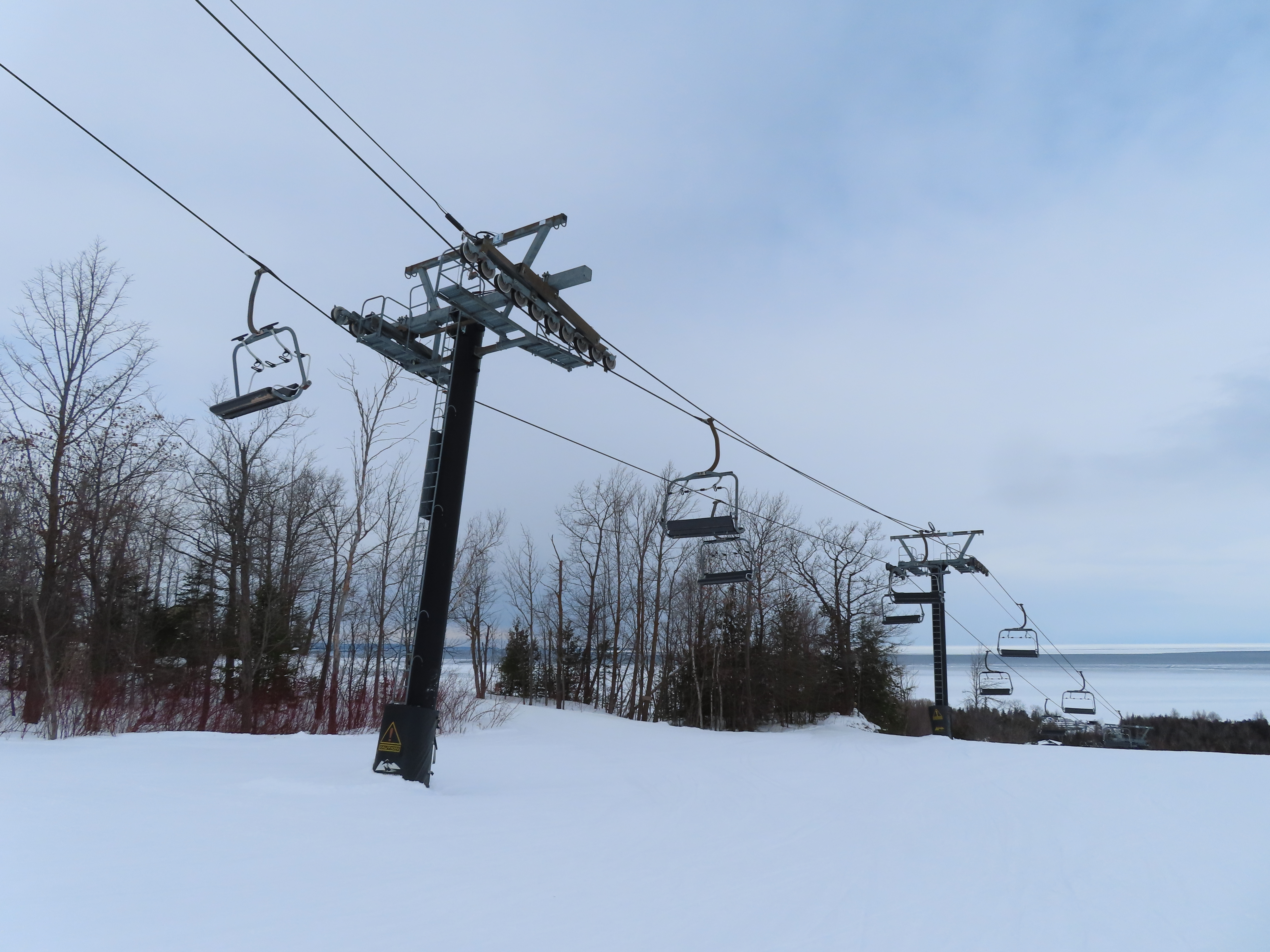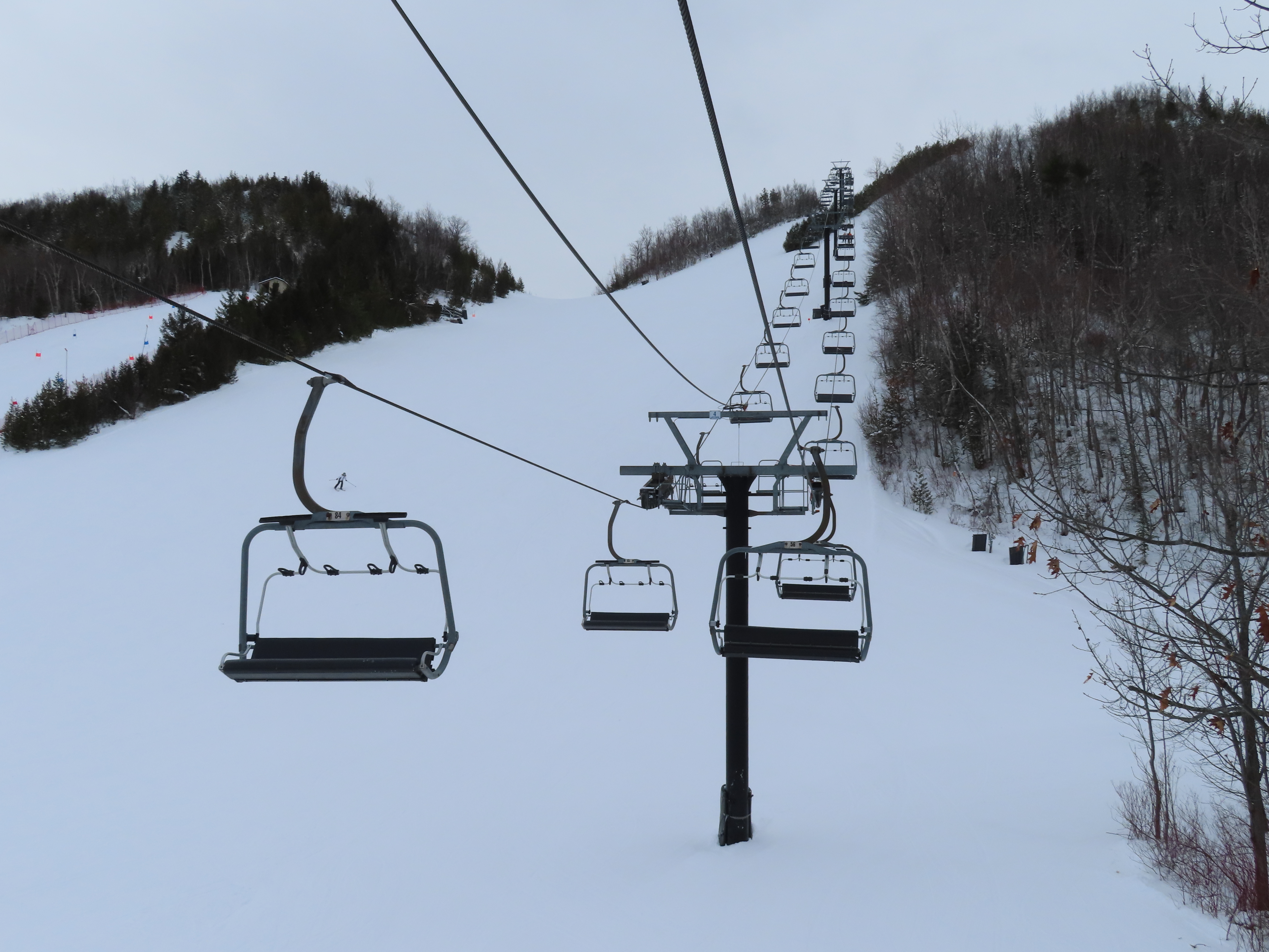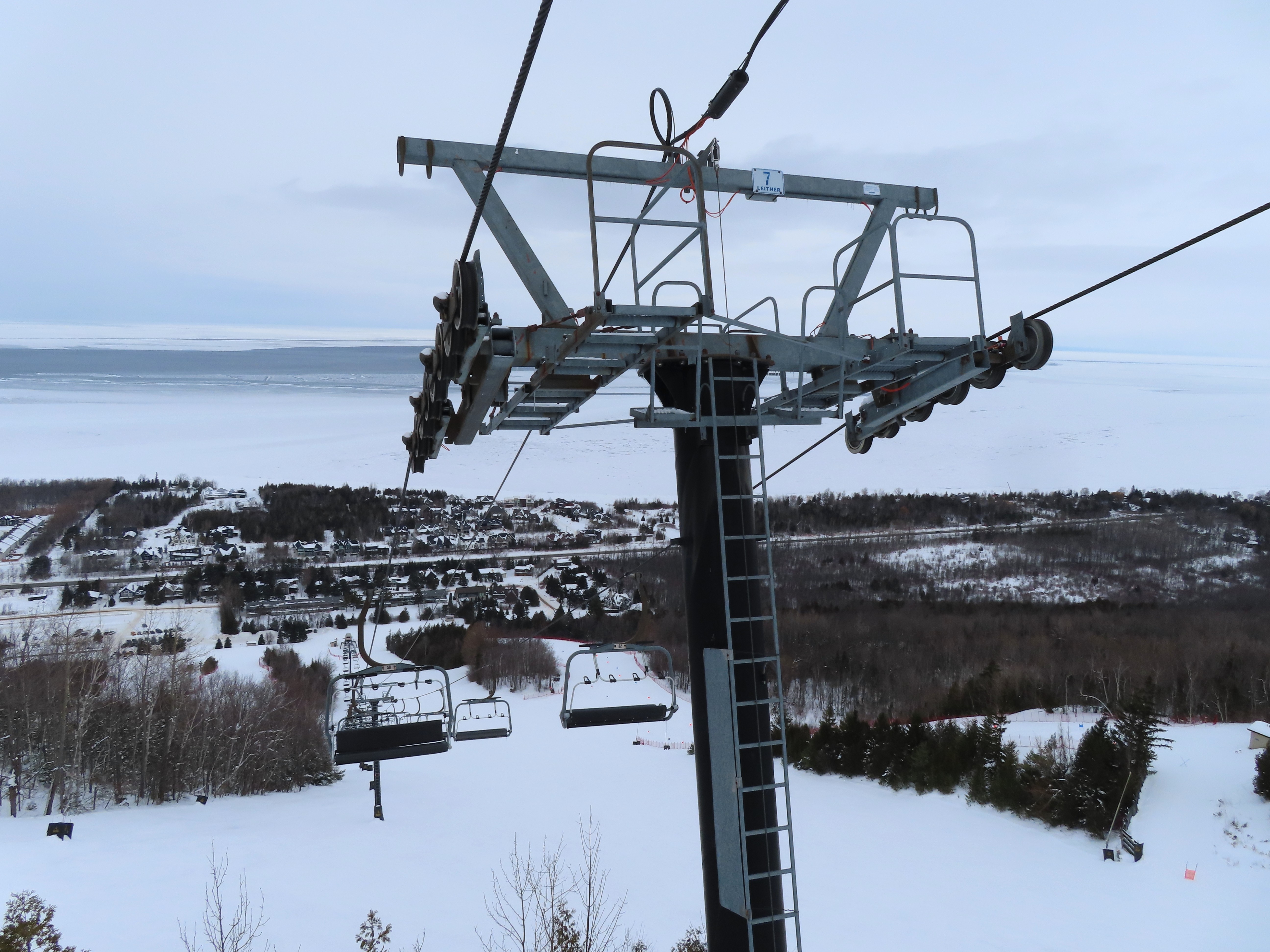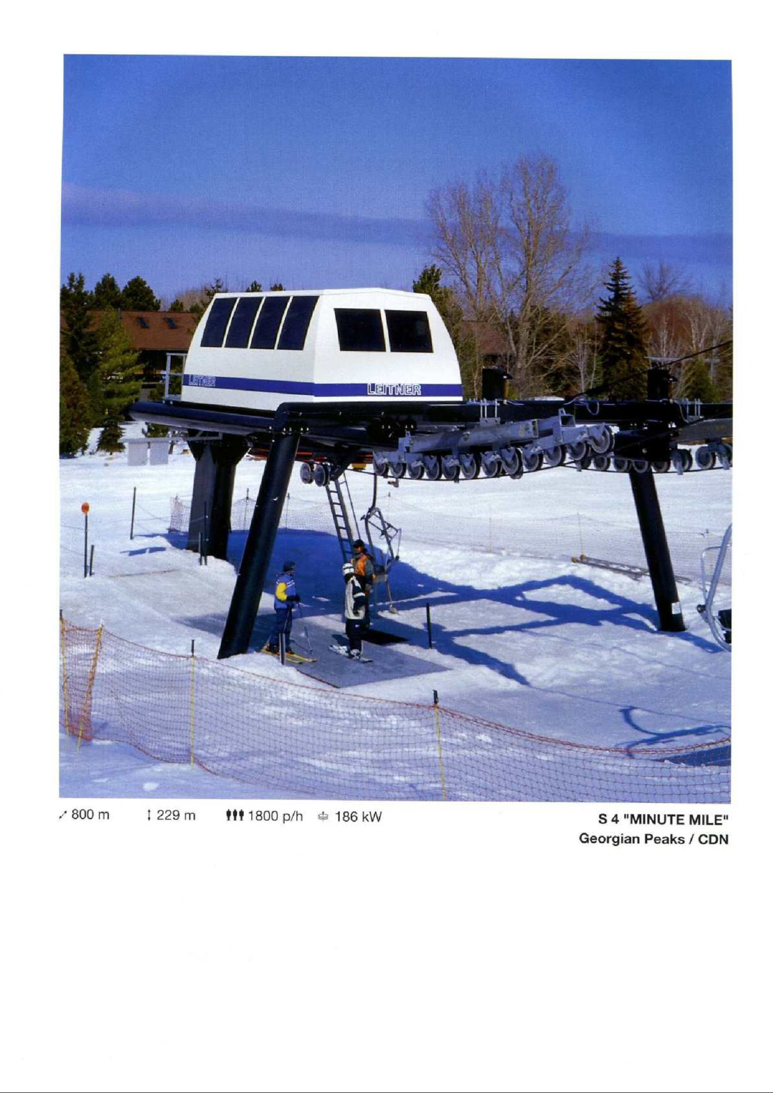 This fixed quad services uncrowded advanced terrain at the east end of the mountain.A heavily-loaded supprt tower.Leitner constructed this lift at the same time as the mountain’s workhorse detachable quad.Flat section of the line.View up the steepest part of the line.Lower lift line above Georgian Bay.Rare Leitner fixed grip terminal in North America.Loading area and motor room.View riding up the line.View back down at T7.Nearing the summit.Leitner chair with foot rests.Arriving at the top.Snowflake style return bullwheel.Lift overview.Hold down tower 4.Breakover towers 8 and 9.Leitner Report entry.