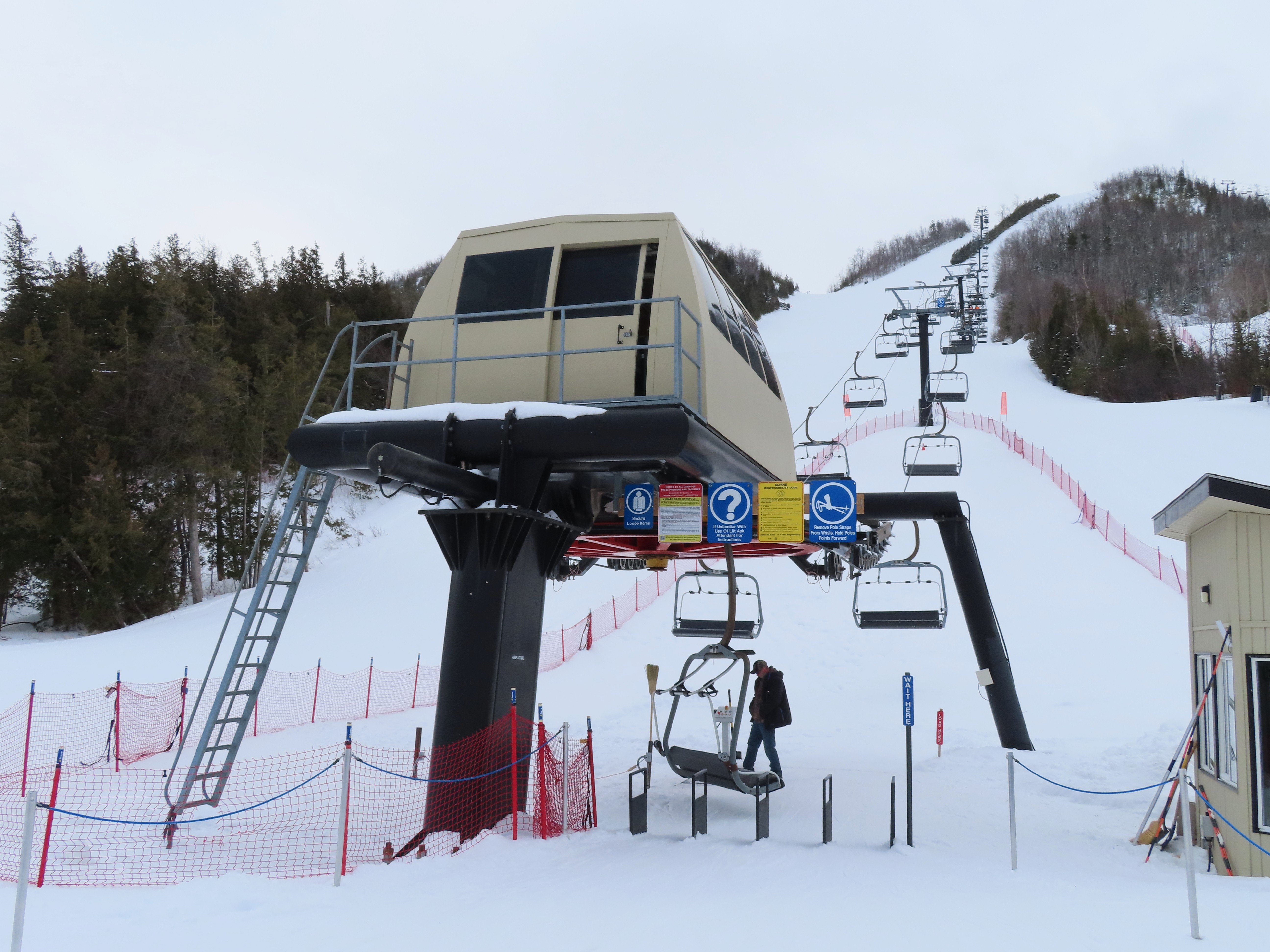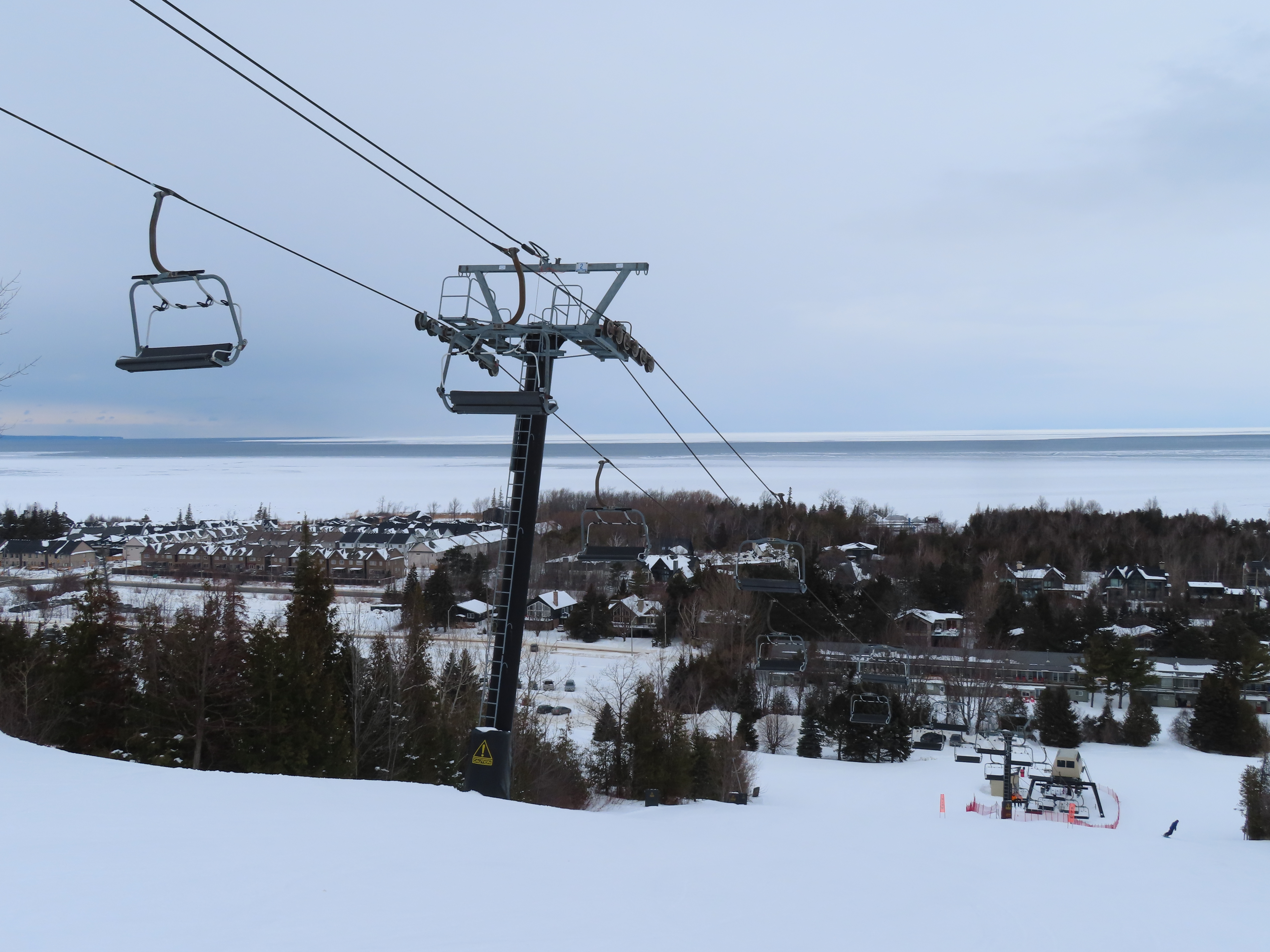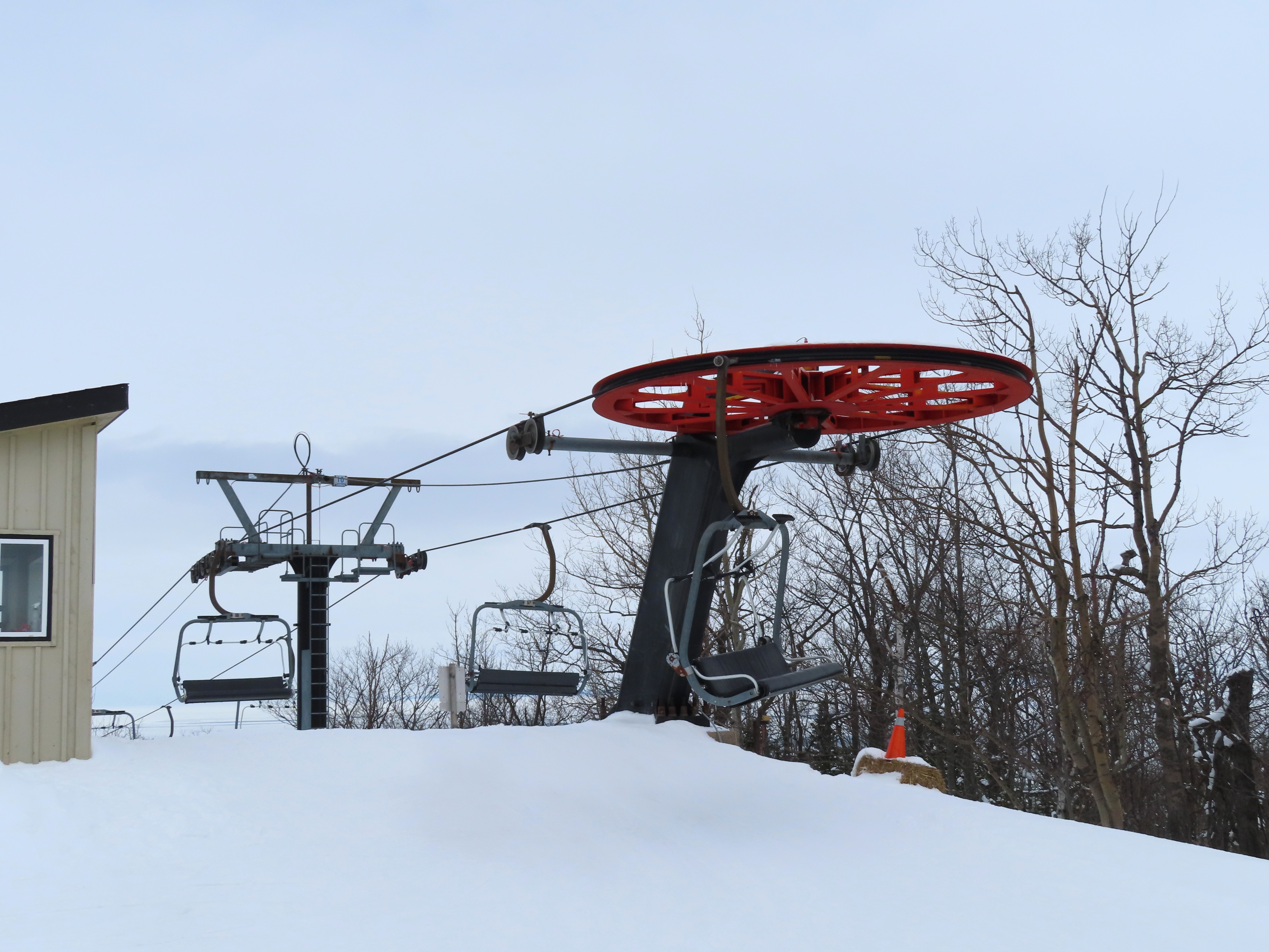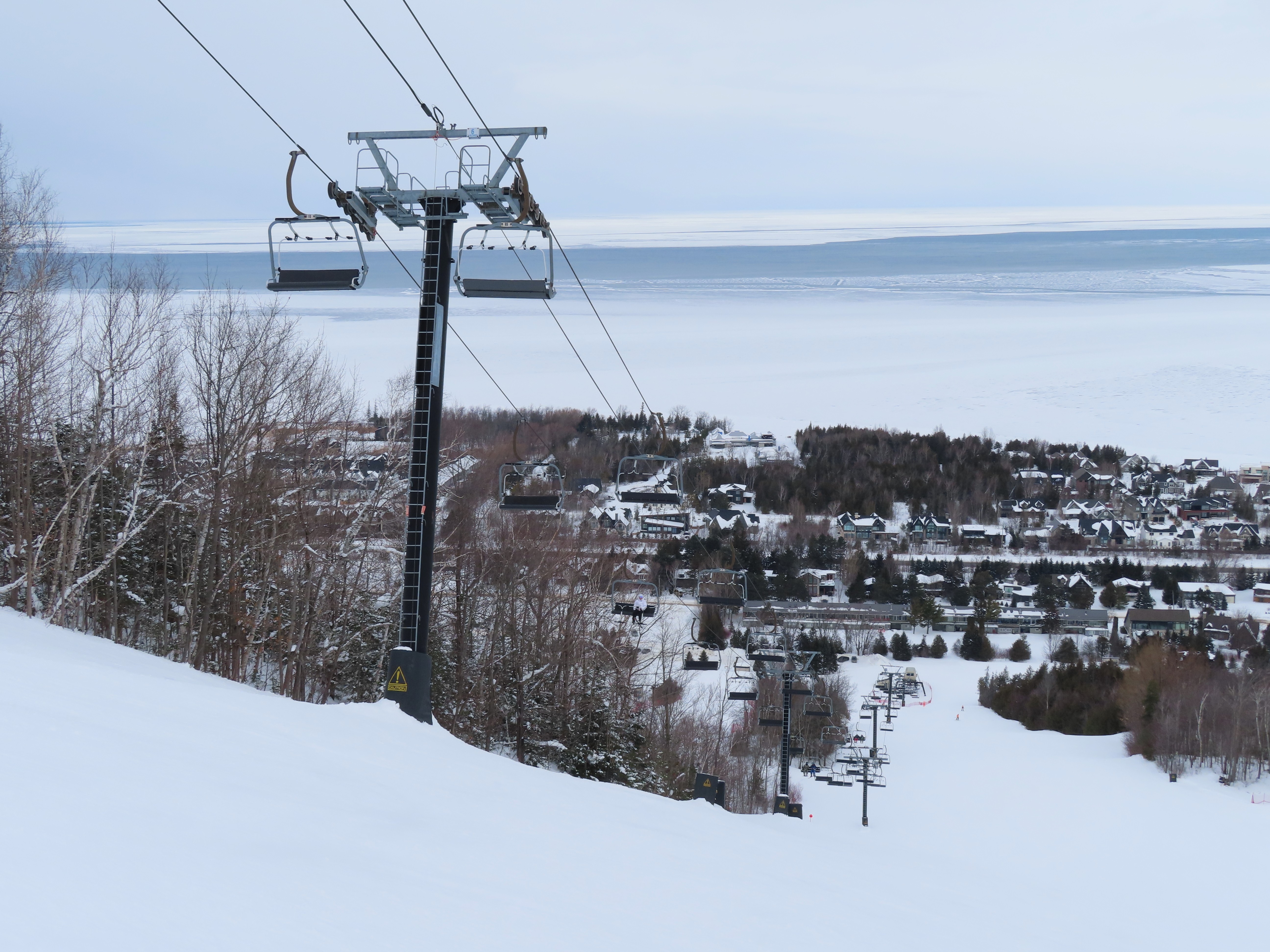 This fixed quad services uncrowded advanced terrain at the east end of the mountain.A heavily-loaded supprt tower.Leitner constructed this lift at the same time as the mountain’s workhorse detachable quad.Flat section of the line.View up the steepest part of the line.Lower lift line above Georgian Bay.Rare Leitner fixed grip terminal in North America.Loading area and motor room.View riding up the line.View back down at T7.Nearing the summit.Leitner chair with foot rests.Arriving at the top.Snowflake style return bullwheel.Lift overview.Hold down tower 4.Breakover towers 8 and 9.Leitner Report entry.