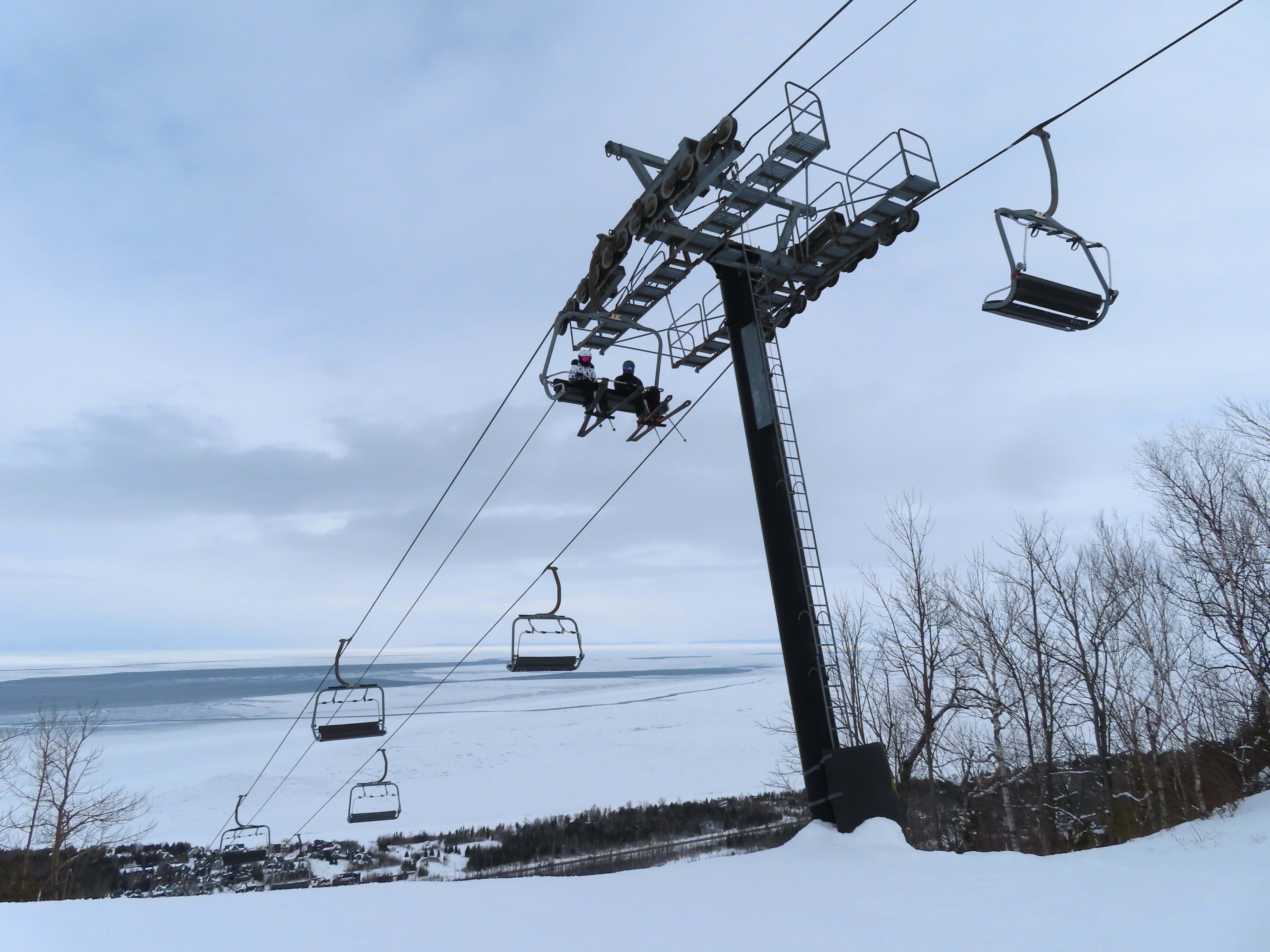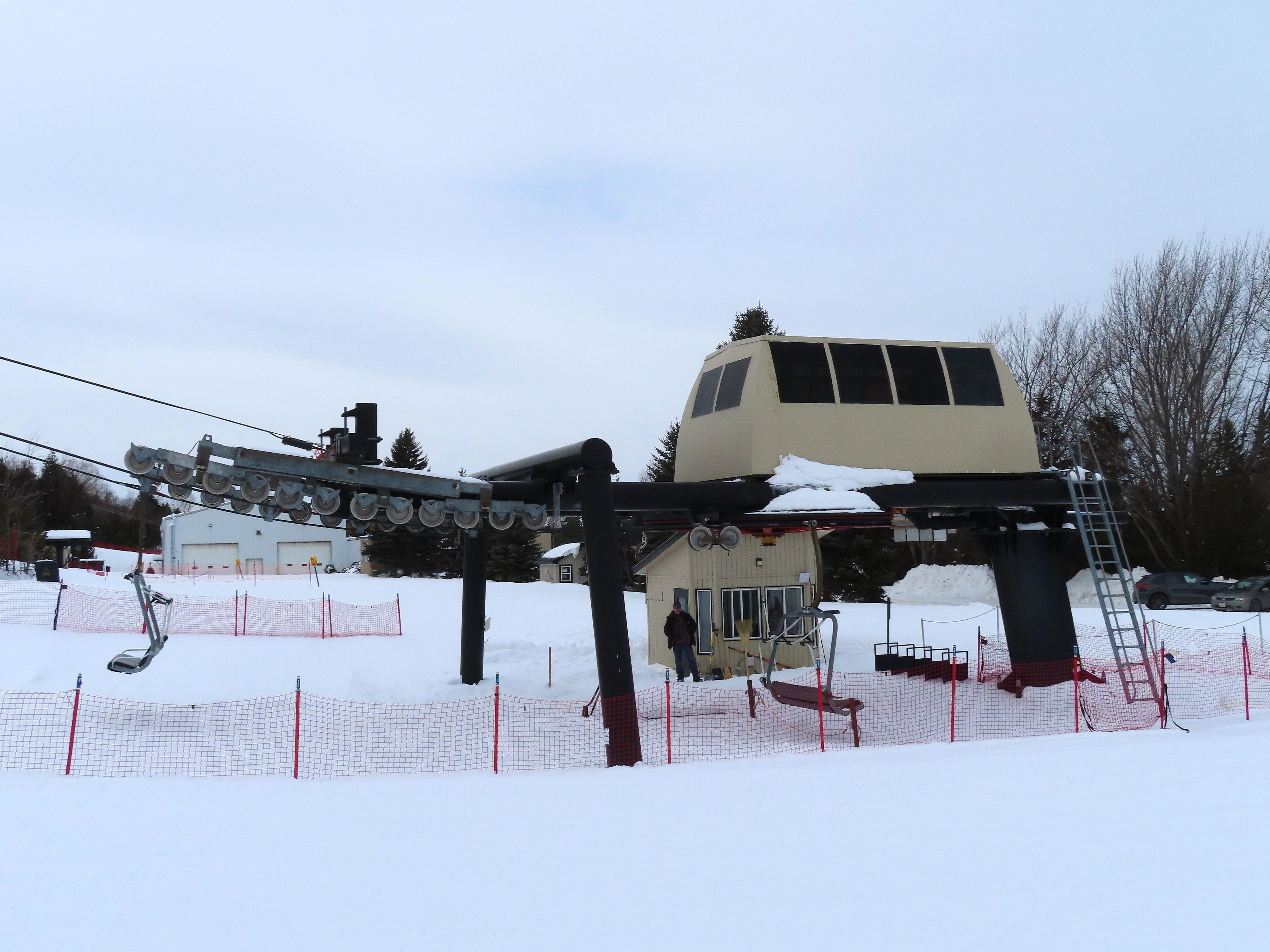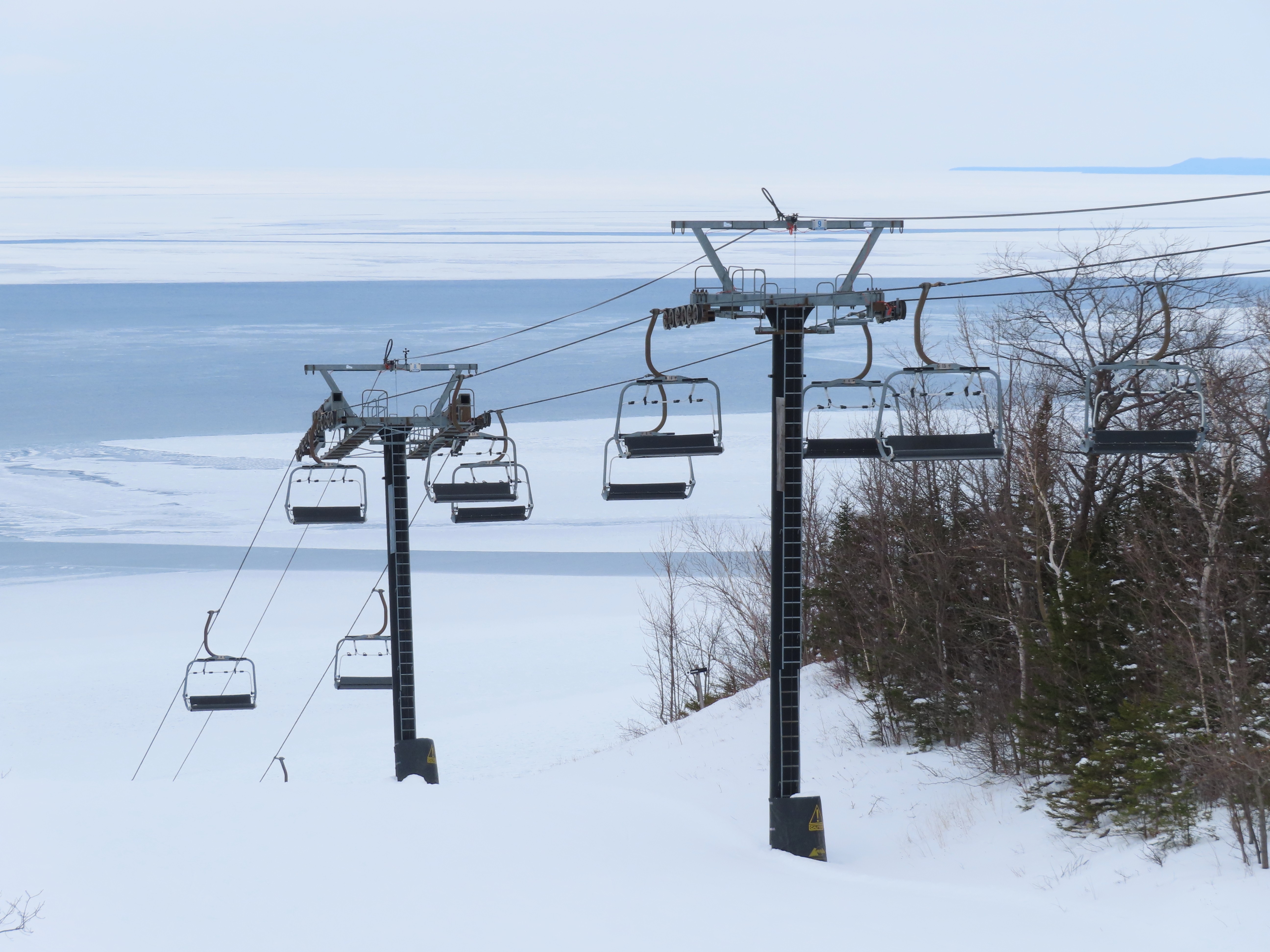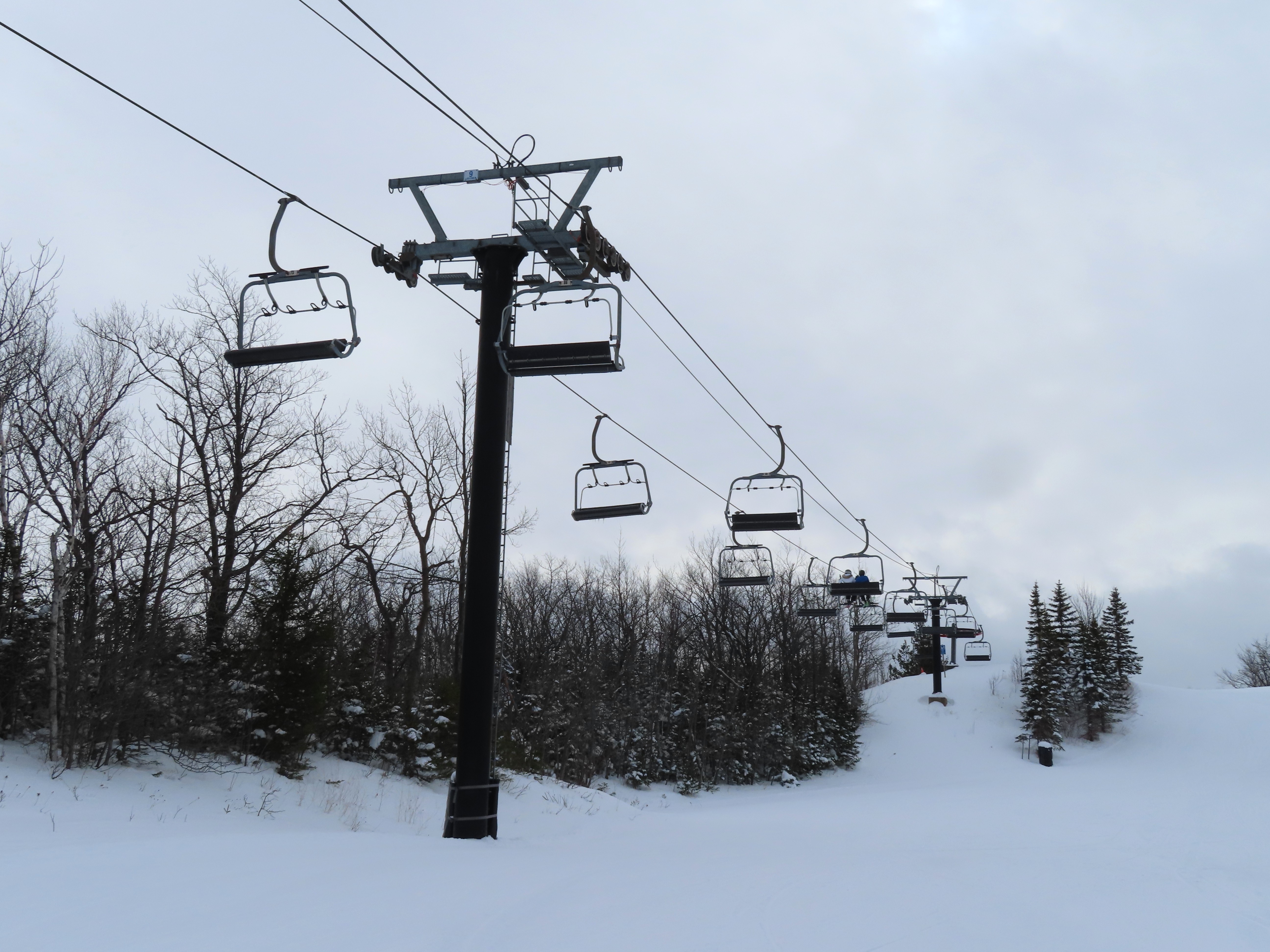 This fixed quad services uncrowded advanced terrain at the east end of the mountain.A heavily-loaded supprt tower.Leitner constructed this lift at the same time as the mountain’s workhorse detachable quad.Flat section of the line.View up the steepest part of the line.Lower lift line above Georgian Bay.Rare Leitner fixed grip terminal in North America.Loading area and motor room.View riding up the line.View back down at T7.Nearing the summit.Leitner chair with foot rests.Arriving at the top.Snowflake style return bullwheel.Lift overview.Hold down tower 4.Breakover towers 8 and 9.Leitner Report entry.