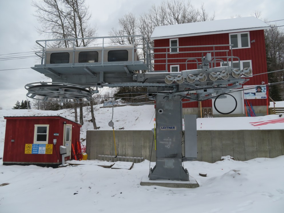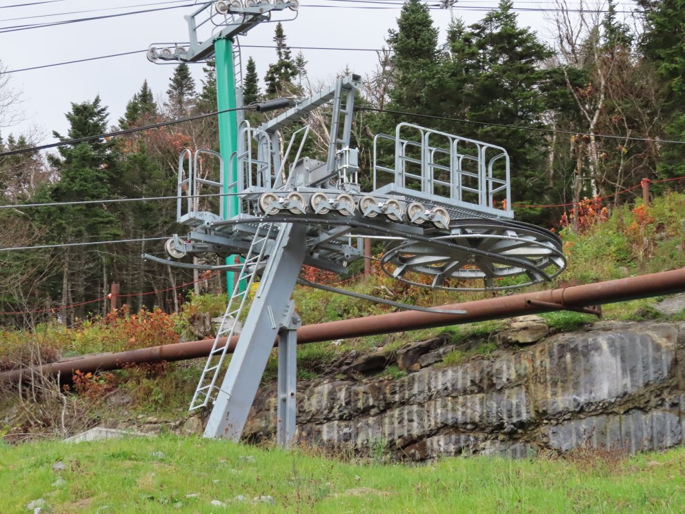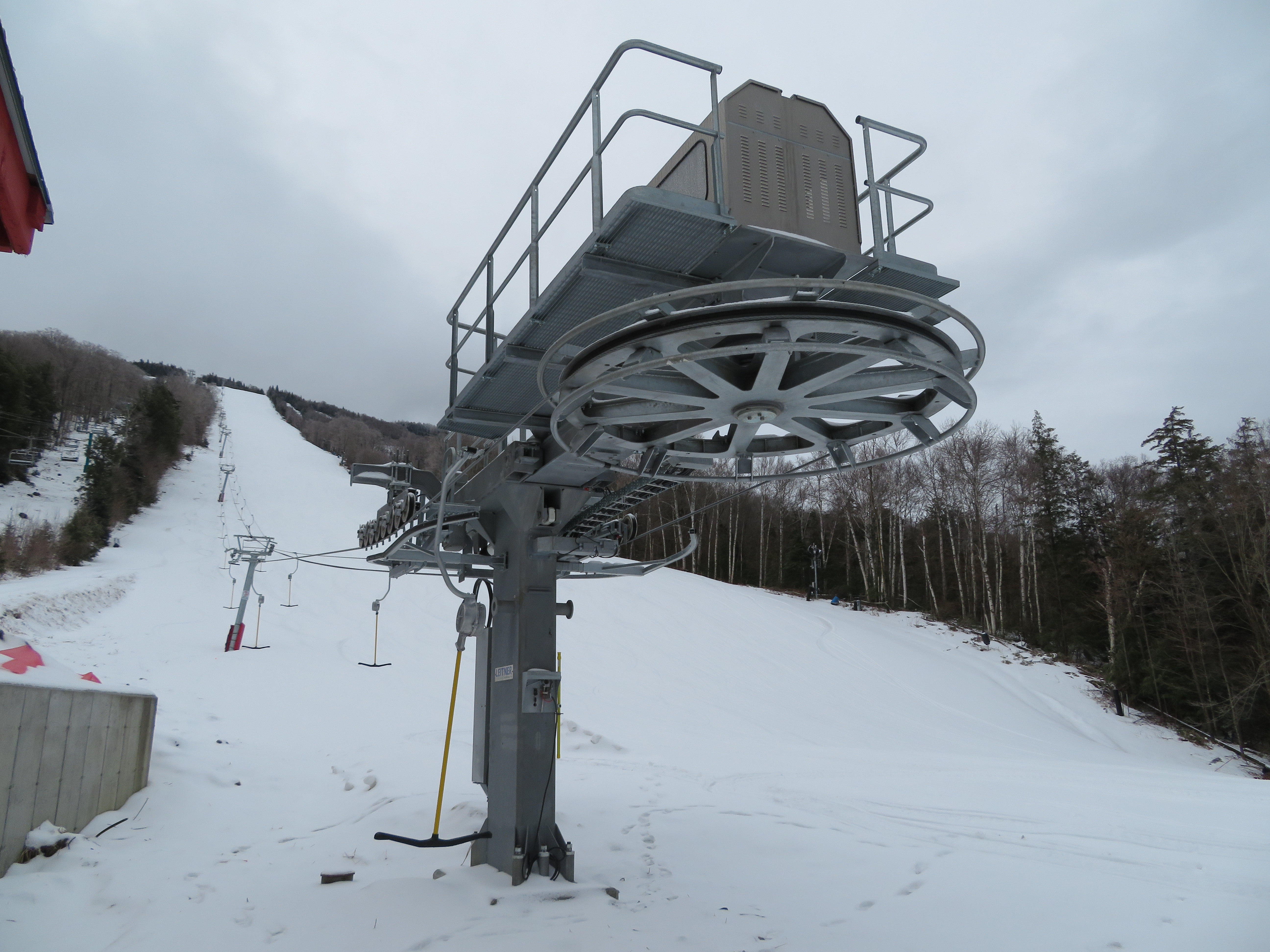 This lift was paid for with settlement money from a financial firm accused of wrongdoing related to the Jay/Burke developments.It was imported from Europe but has Leitner-Poma of America controls.View up the lift line.Bottom terminal.Vertical is just over a thousand feet.Drive bullwheel.The top terminal with Leitner sheave assemblies.View down from the top.Steep lift line.Close up of a tower head.Another view of the top station.The upper terminal next to the retired Willoughby quad.