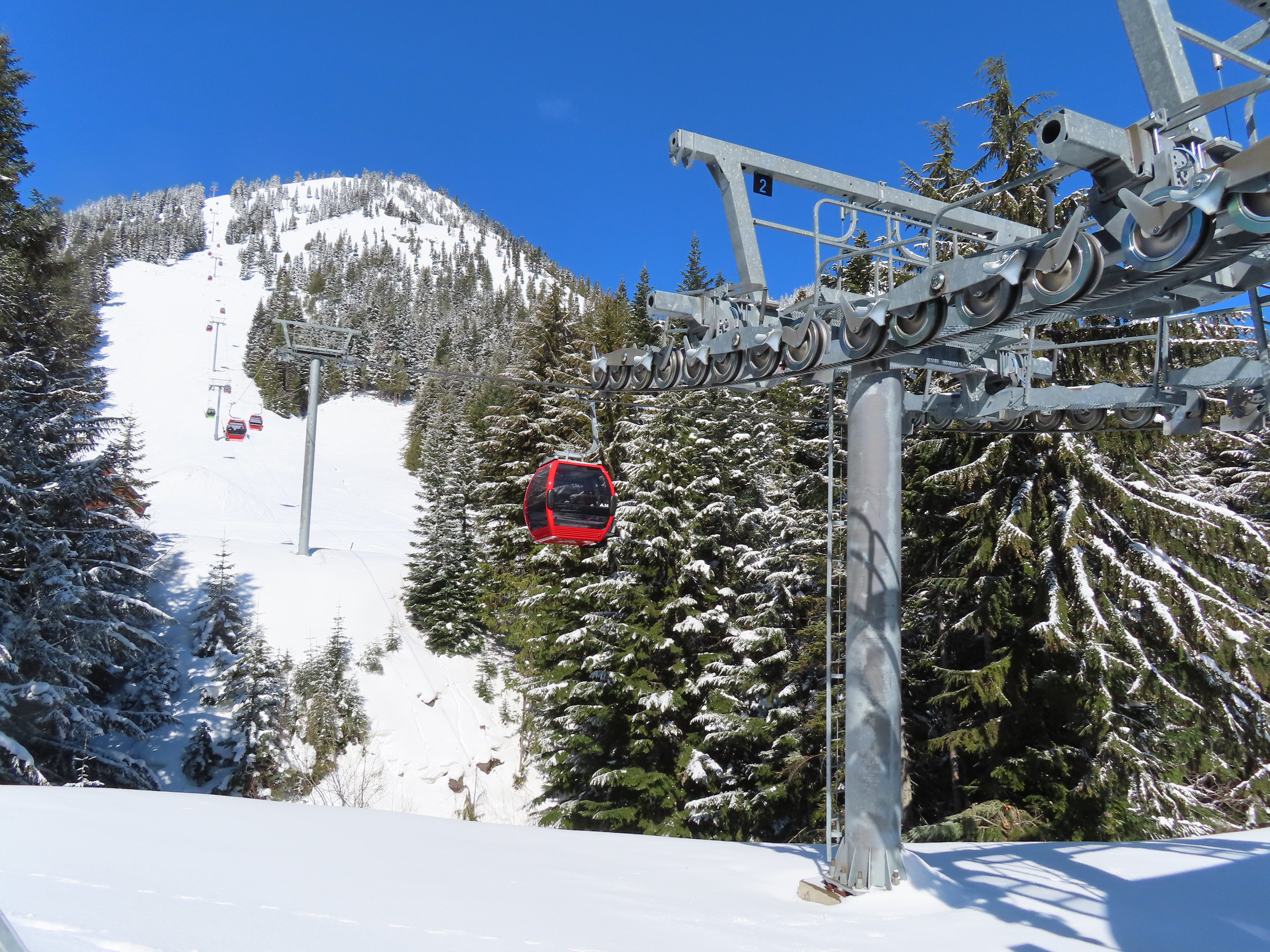 I’m very curious where y’all have heard the Riblet rumour. They never built a detachable tramway; the best I could see them having designed is a 750-FPM pulse lift with four to eight (most likely eight) pulses of a few gondola cabins apiece. I was in operations at Crystal during the formative years of what wound up as the current MRG and I never once heard any Riblet mentioned as a contender. Garaventa, Poma, and Doppelmayr were all in the mix; as we know, Garaventa and Doppelmayr merged (after I left there) so it was down to two manufacturers by the time this was built.