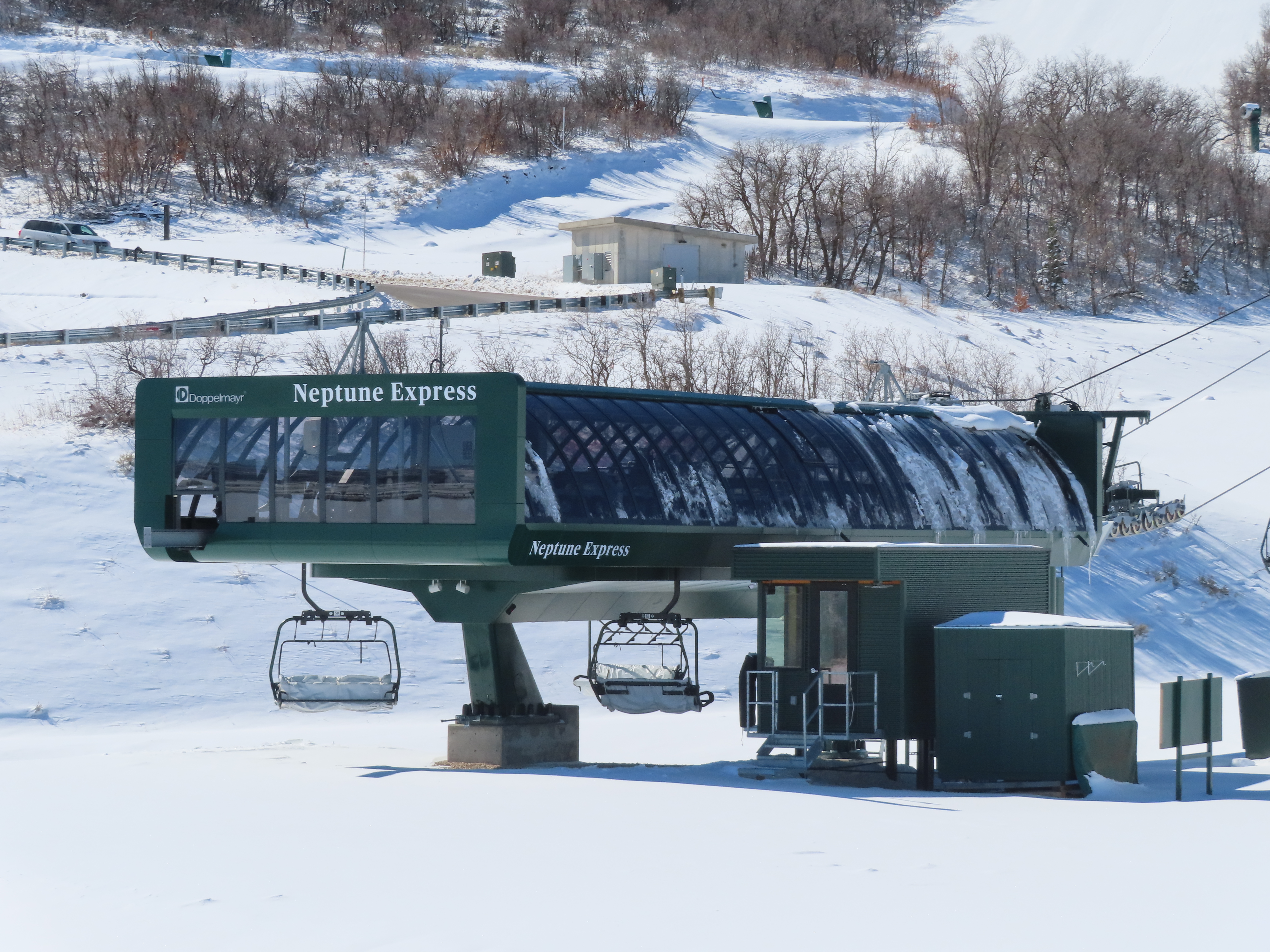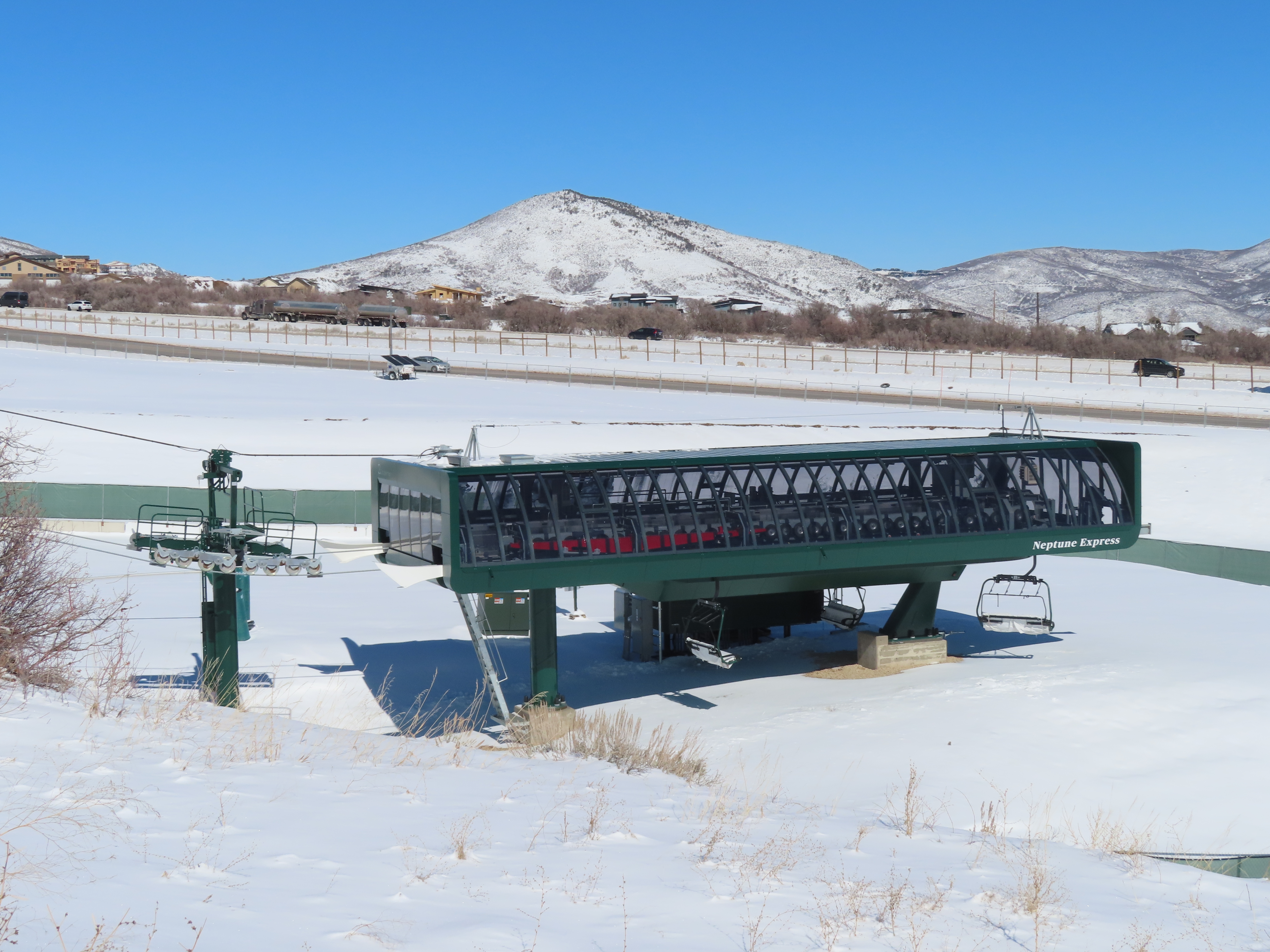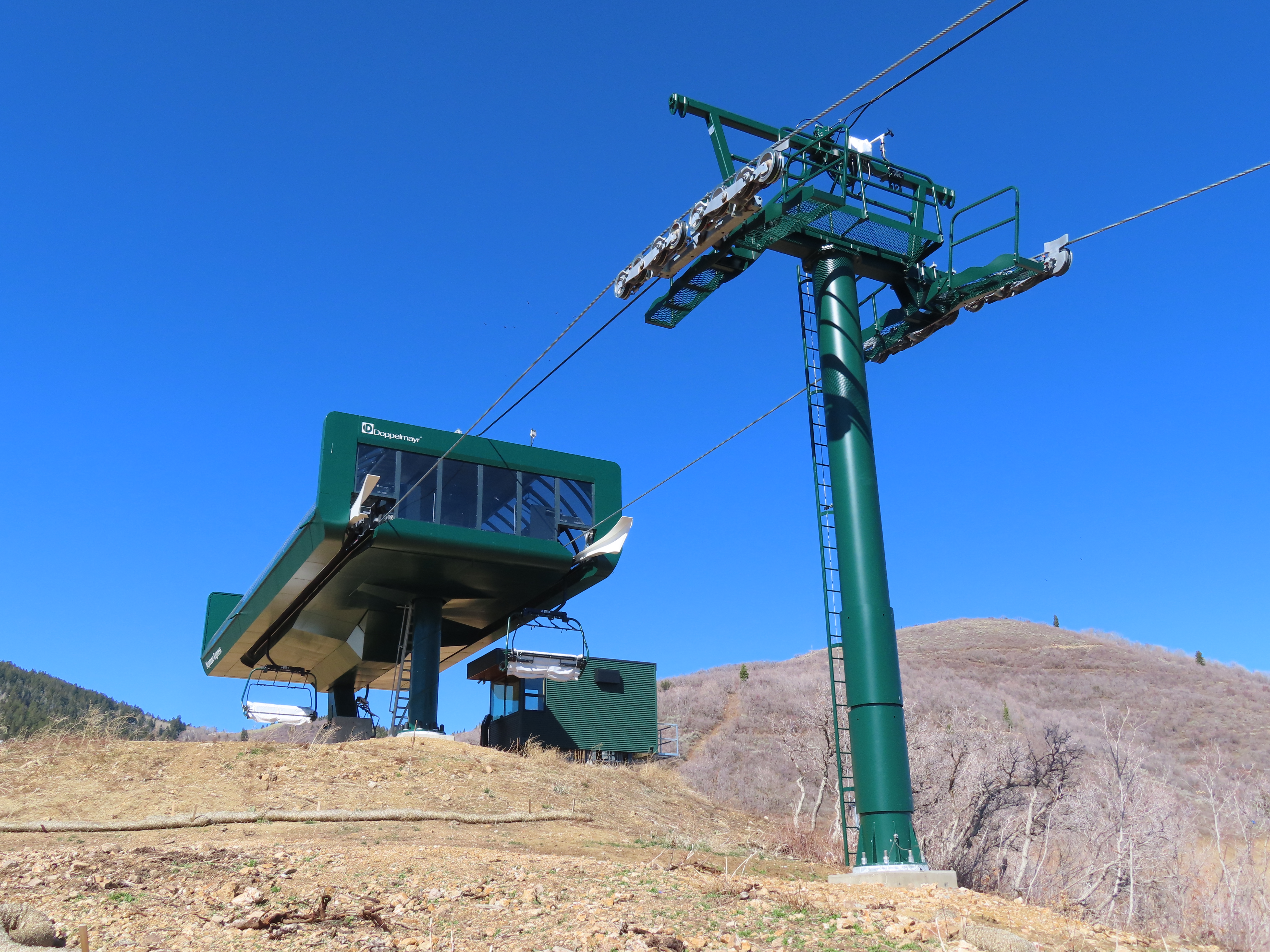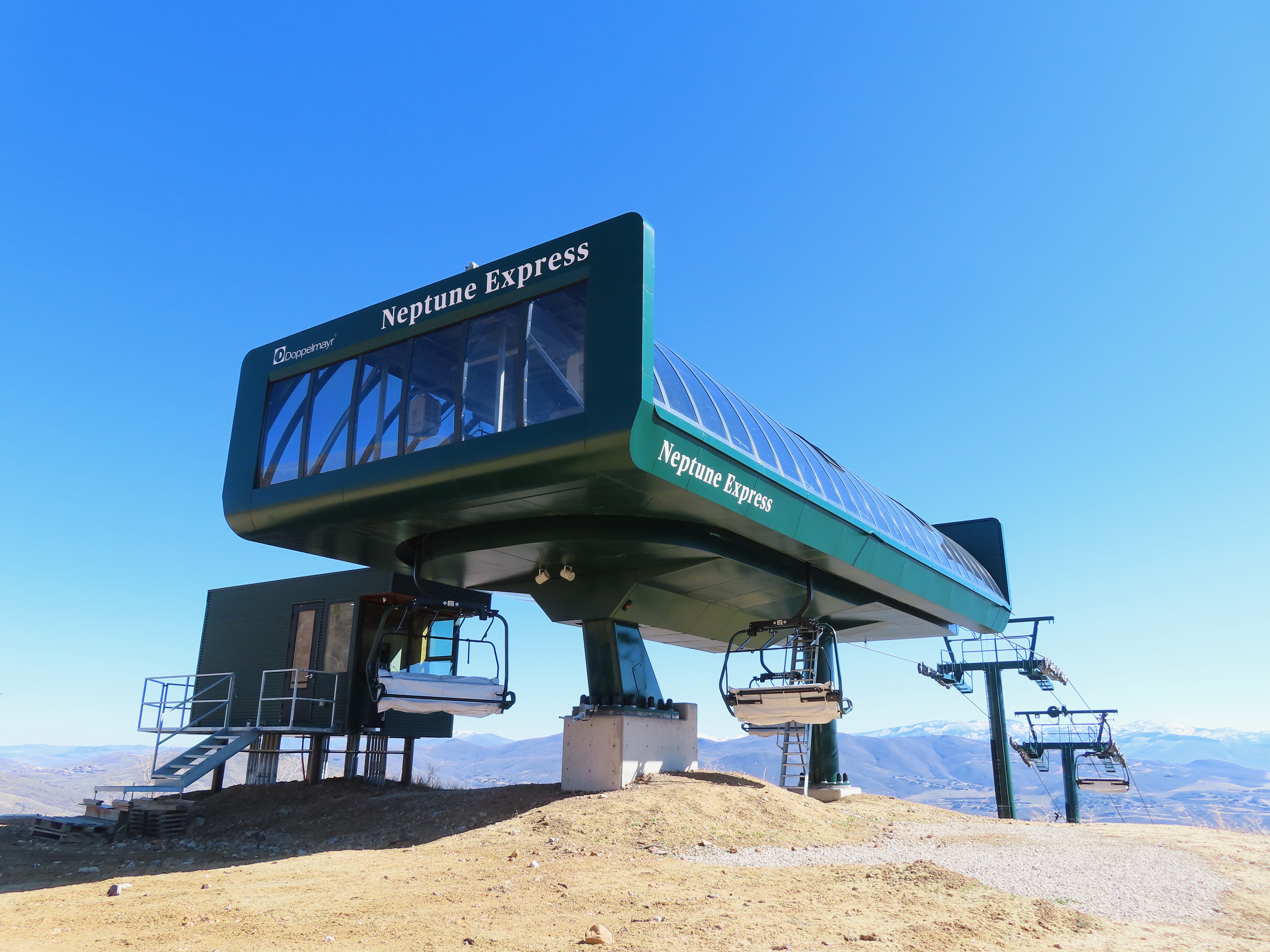 This relatively short detachable services the Velvaere neighborhood.Lift overview.Upper half of the line with Pioche Express in the background.UNI-G terminal made to look like D-Line.Side view of the bottom terminal and tower 1.Pioche Point with Pioche Express, left, and Neptune Express, right.The top terminal during the first season, when this lift did not open due to snow and real estate development status.View from the top breakover.Tower 12 and the upper station.View down the line.Drive station overview.