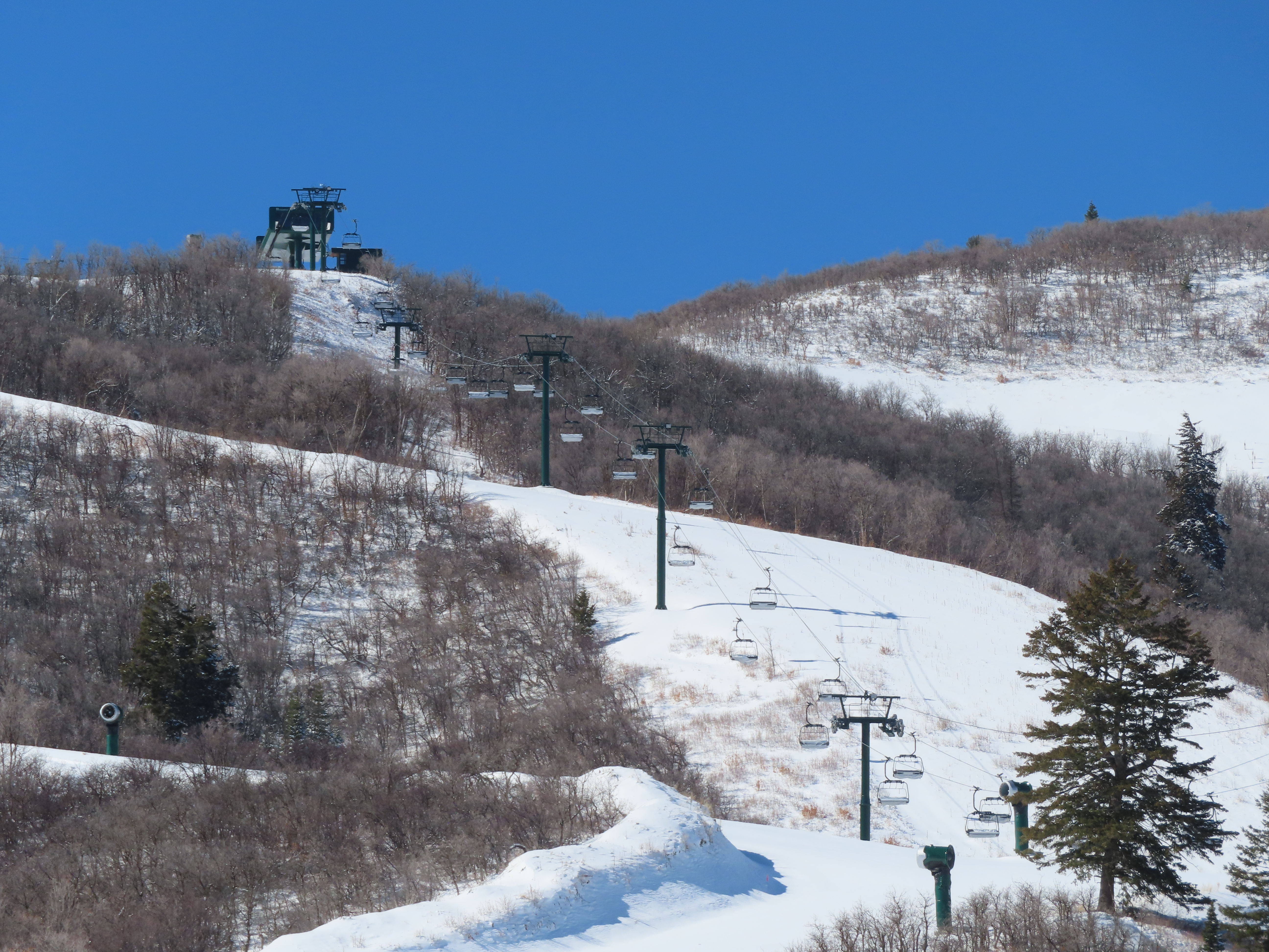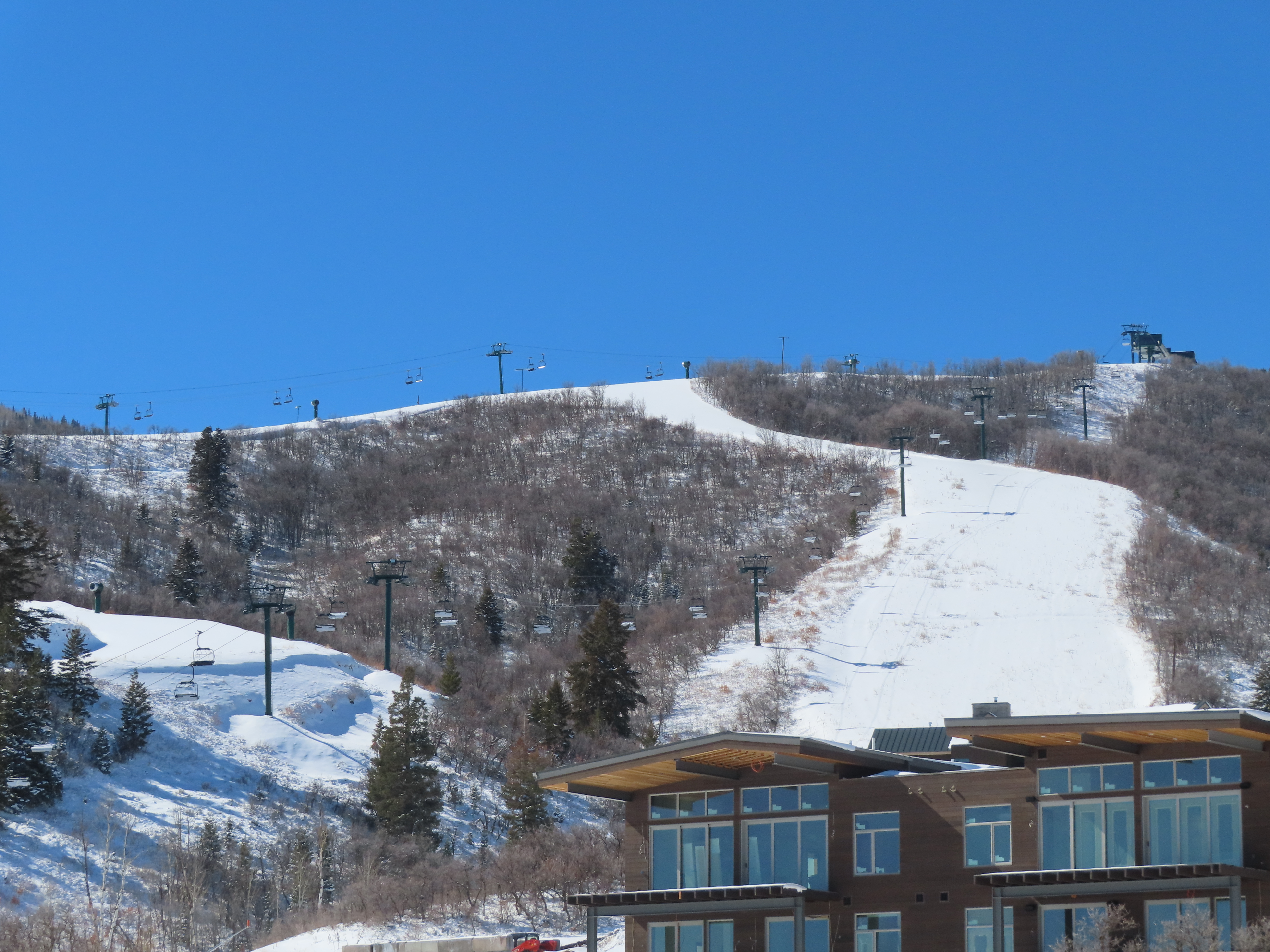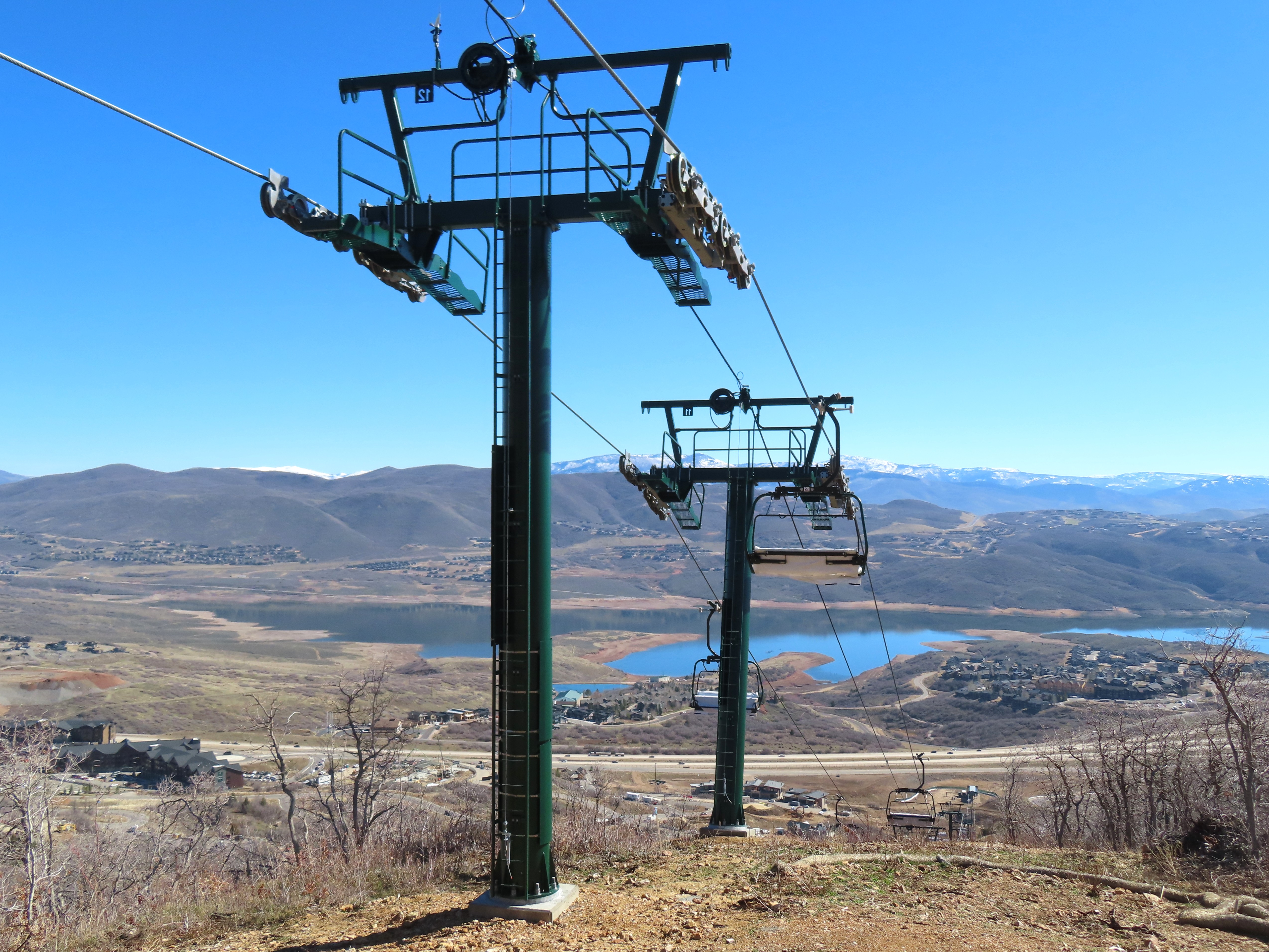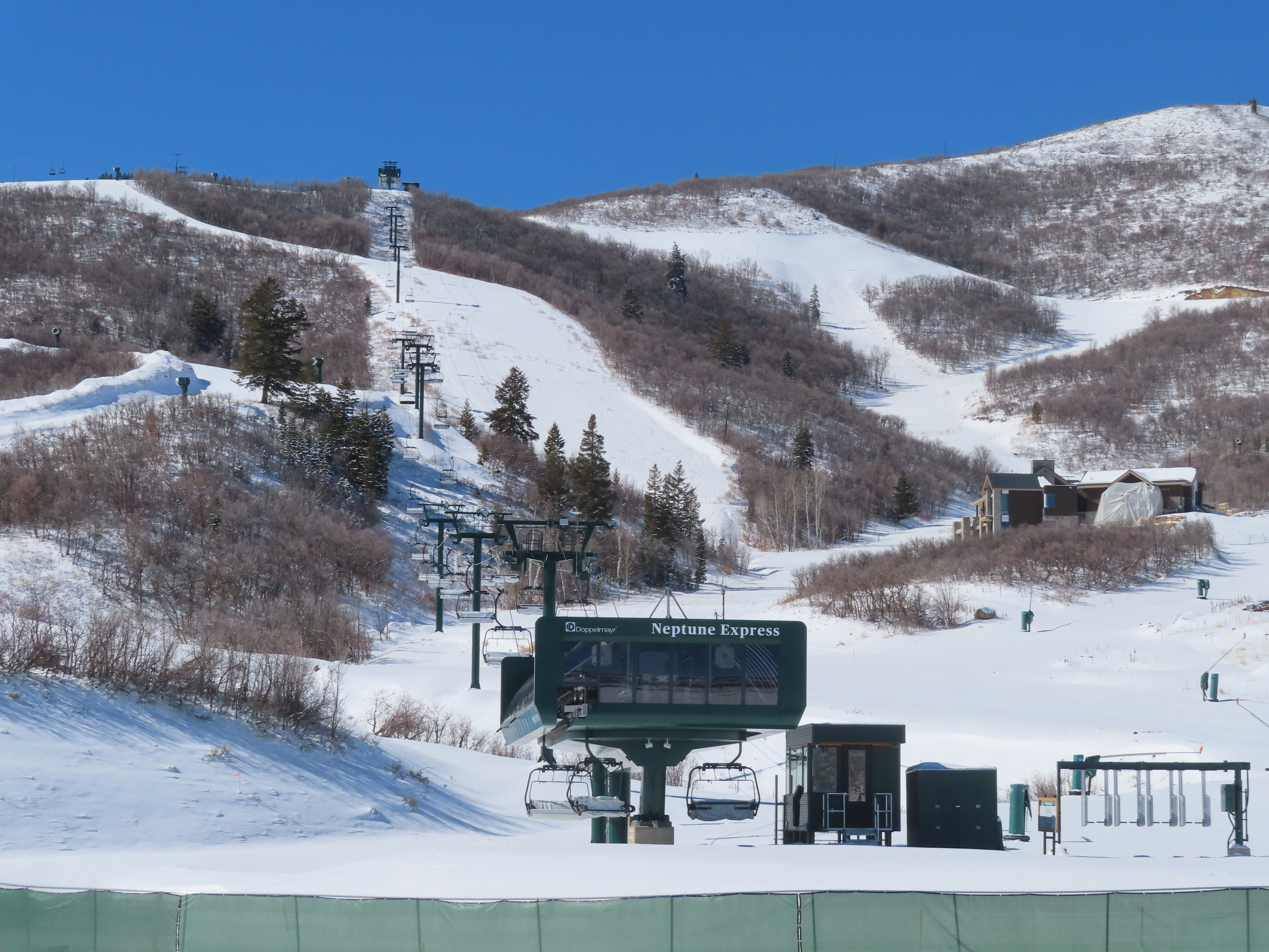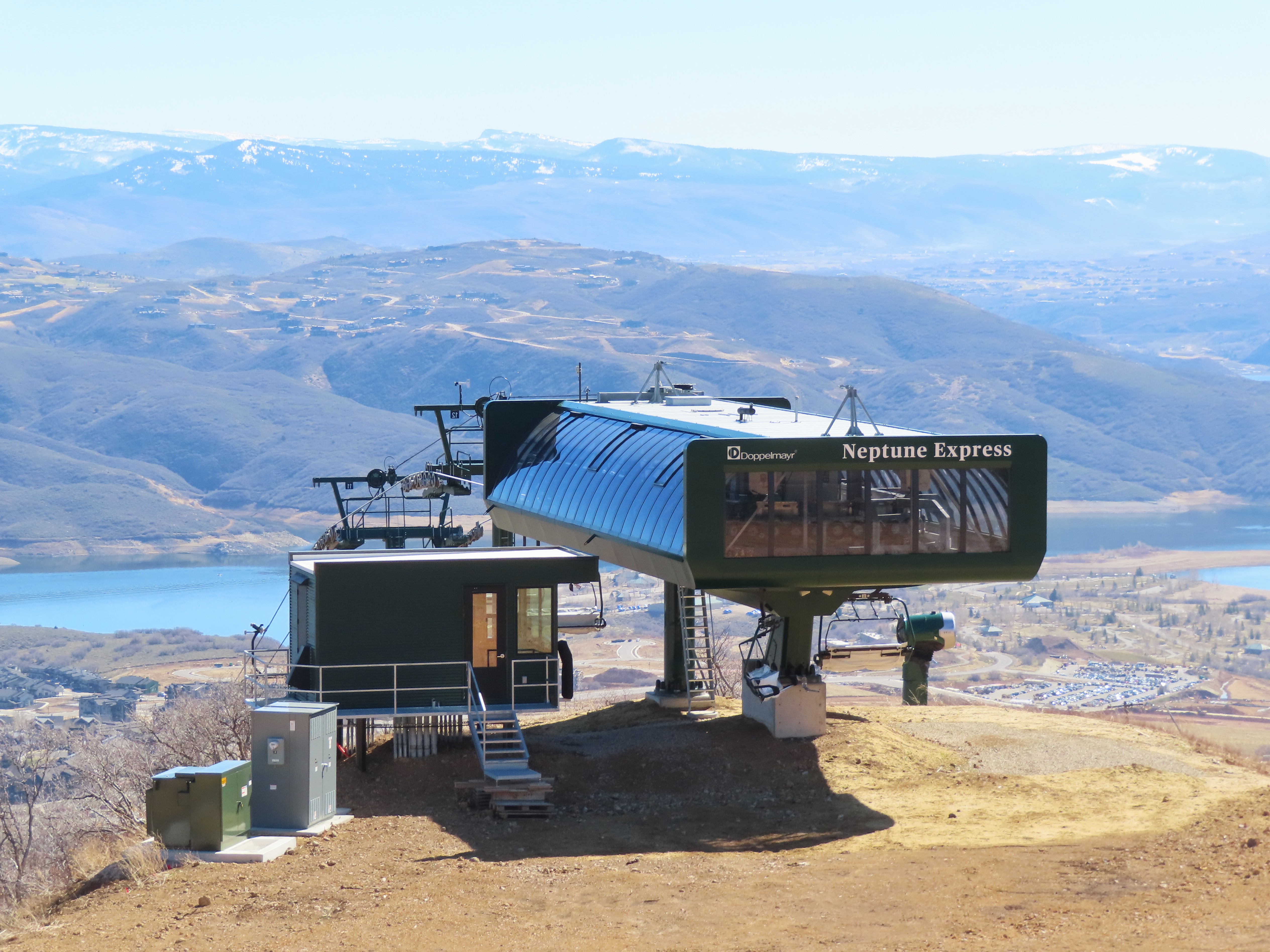 This relatively short detachable services the Velvaere neighborhood.Lift overview.Upper half of the line with Pioche Express in the background.UNI-G terminal made to look like D-Line.Side view of the bottom terminal and tower 1.Pioche Point with Pioche Express, left, and Neptune Express, right.The top terminal during the first season, when this lift did not open due to snow and real estate development status.View from the top breakover.Tower 12 and the upper station.View down the line.Drive station overview.