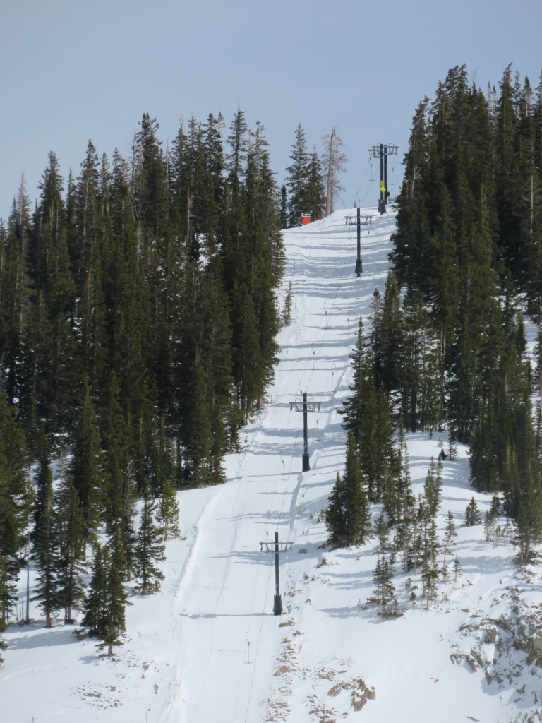 The original High Lift was a detachable platter which was replaced by this Italian-built T-Bar.There are only 7 towers.Loading area.Drive system.Bottom terminal and track seen from below.Tower 2.Upper part of the line.The top terminal.Unloading area and operator house.View down the track.Fixed top bullwheel.