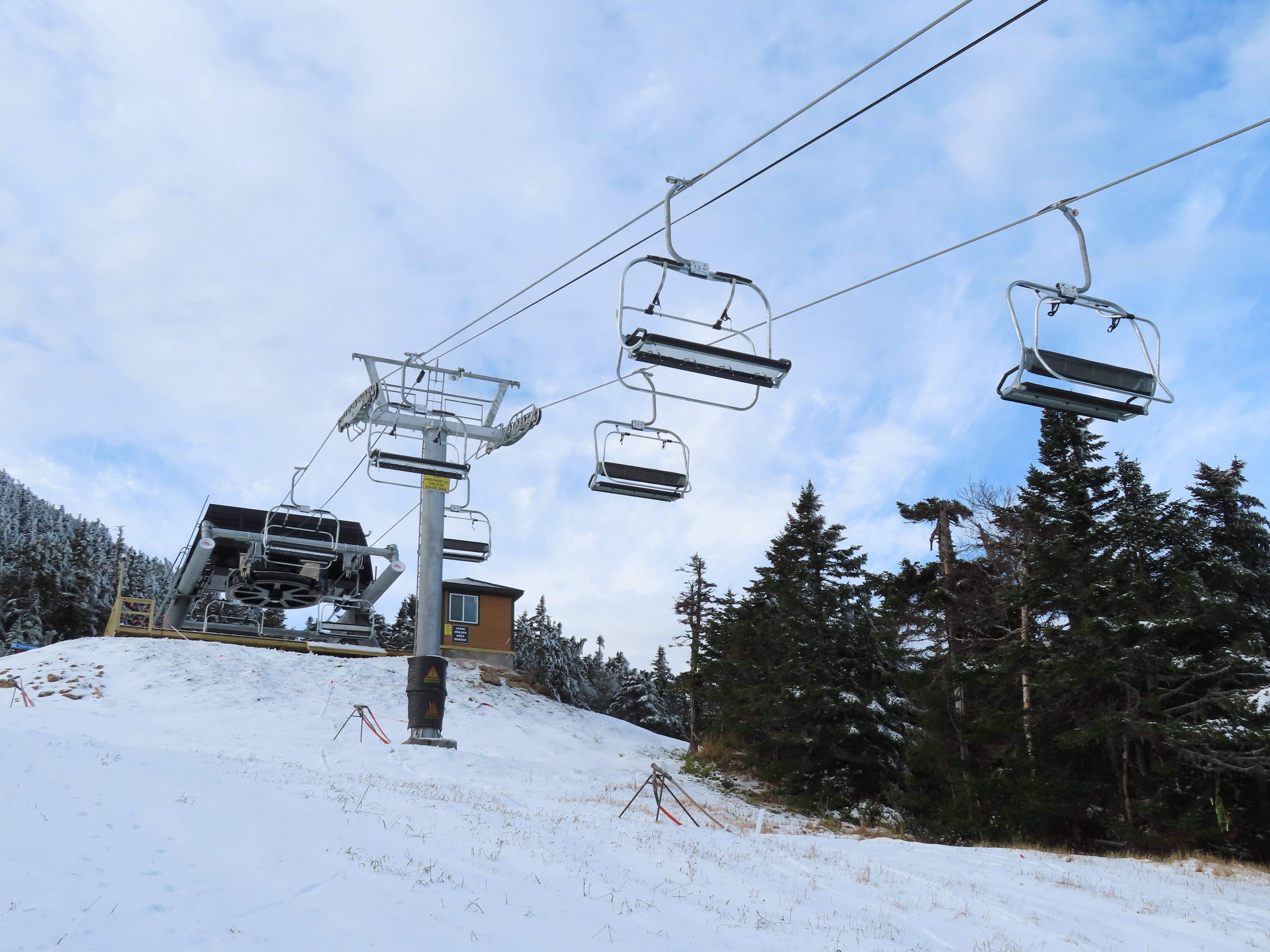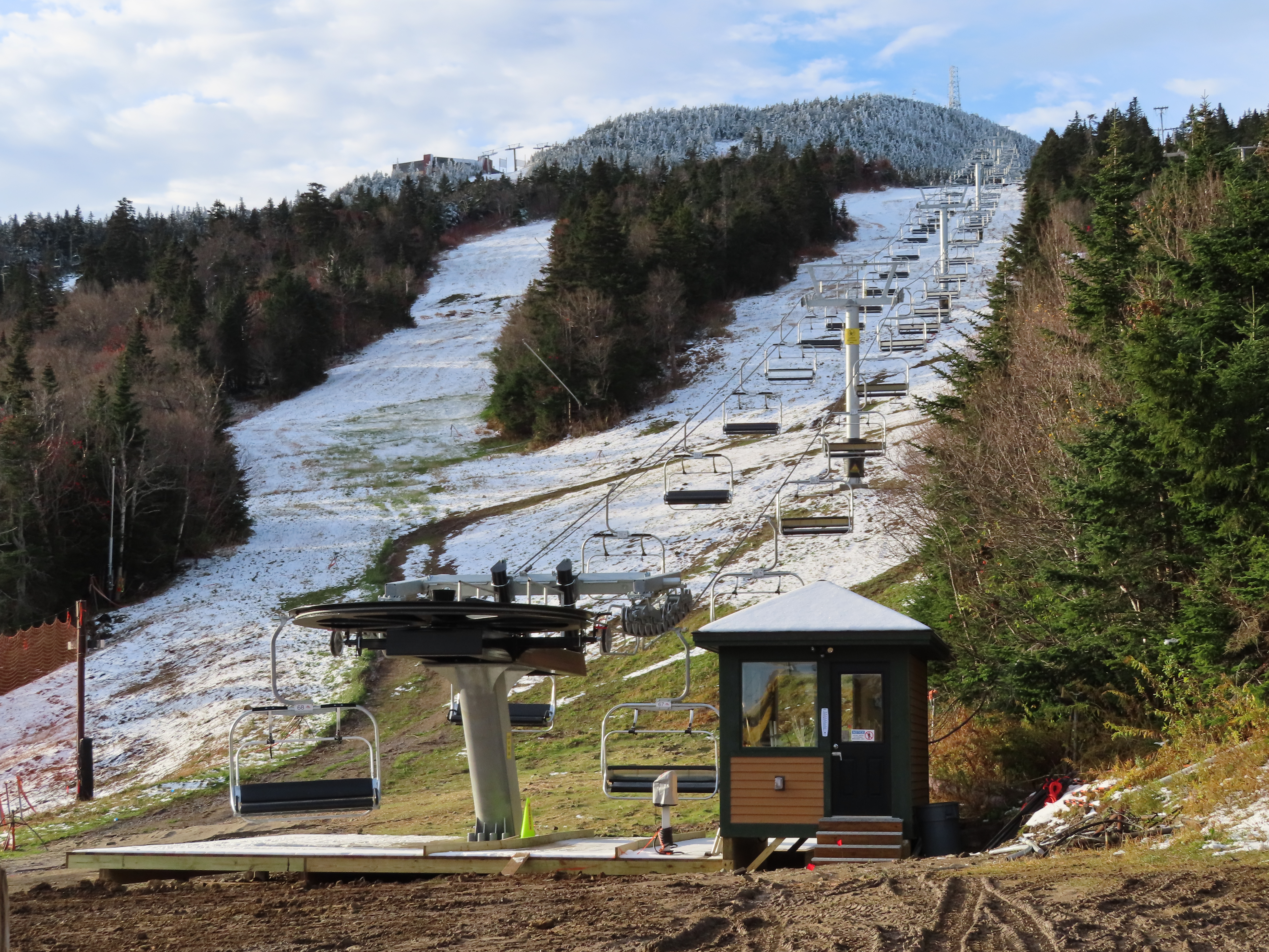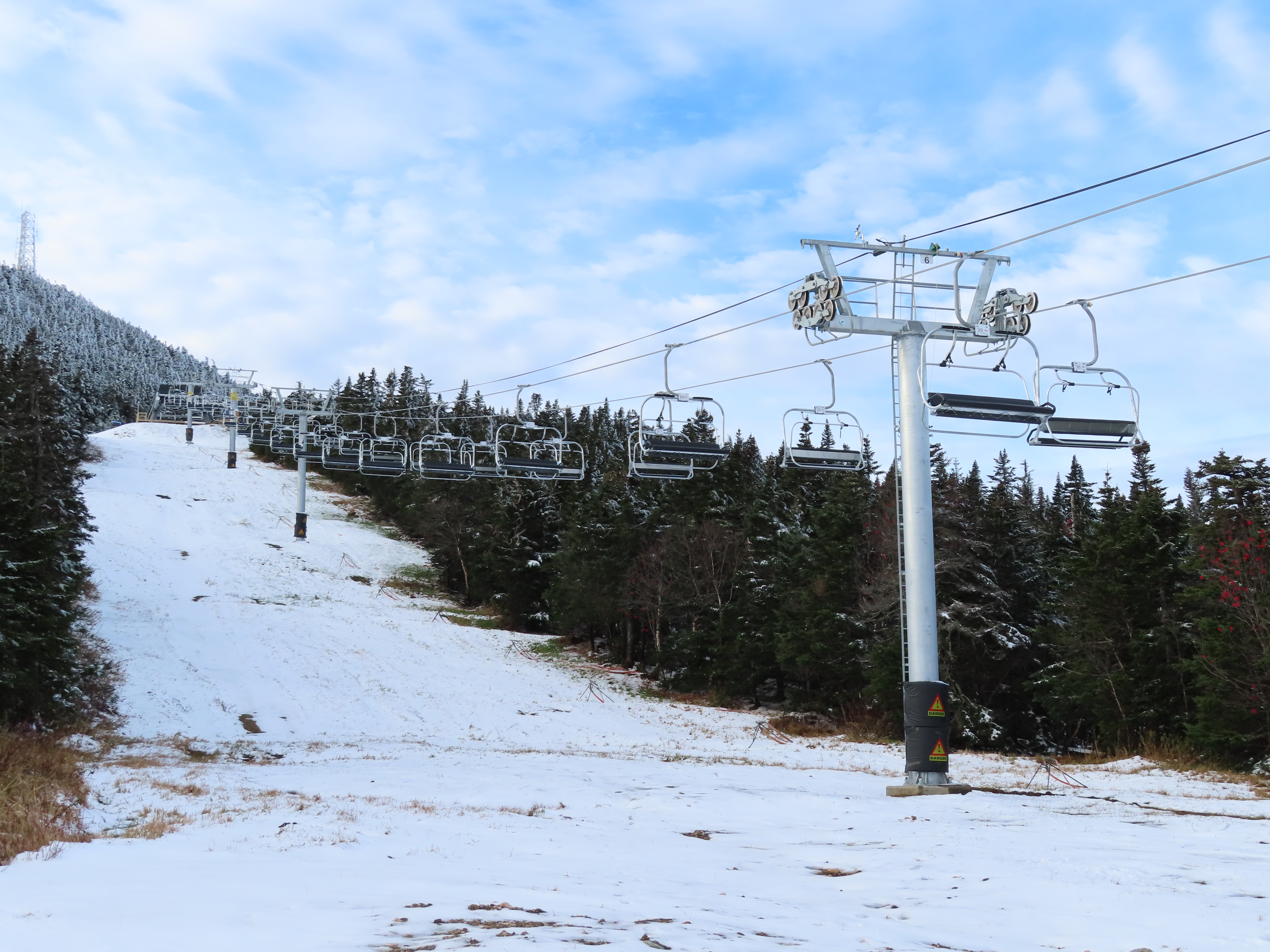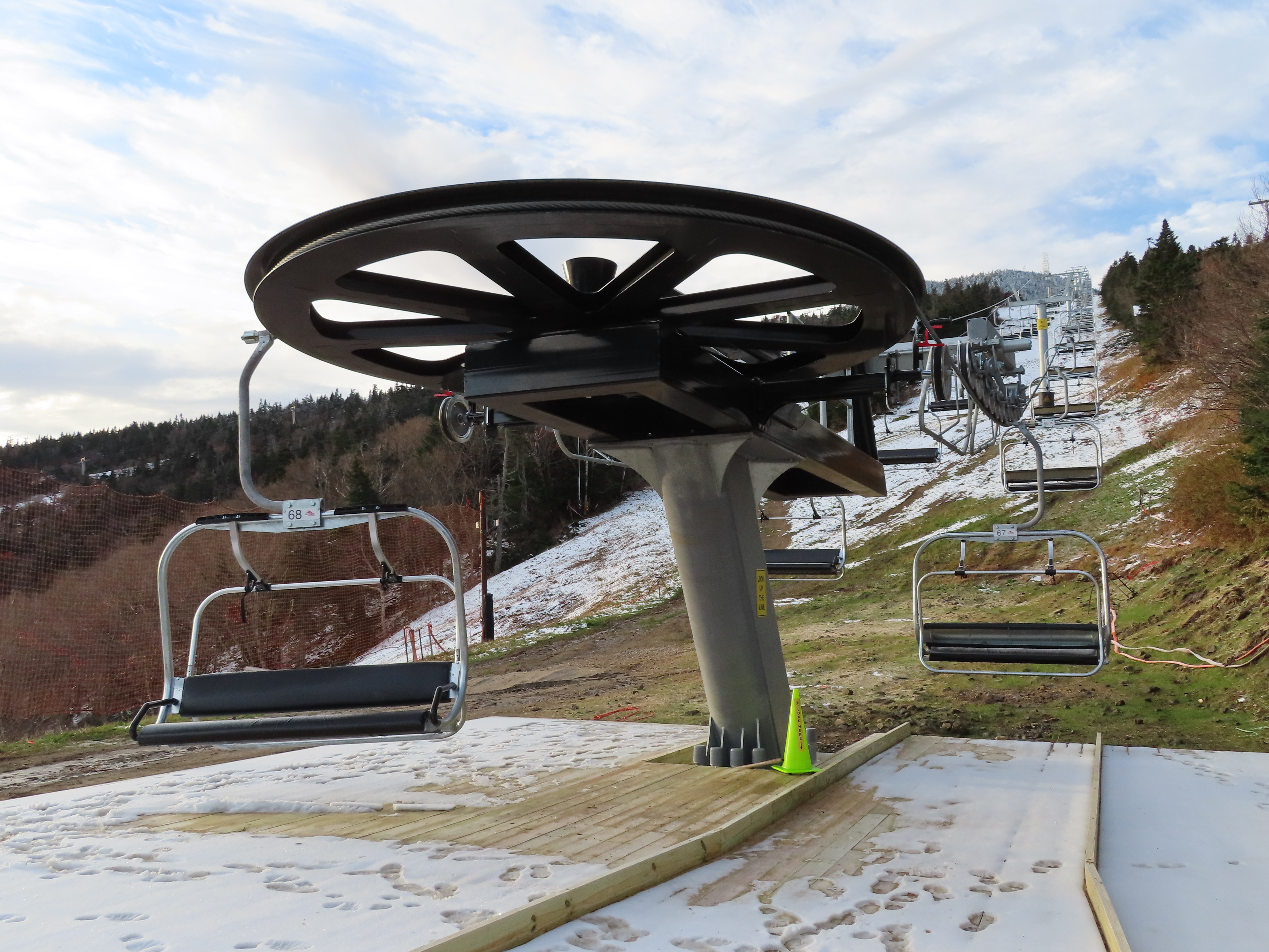 This Leitner-Poma quad replaced a Heron-Poma triple in 2019.Loading area shortly after the lift was load tested.View up the first half of the lift line.Tower 1 and closely-spaced Omega chairs.View down the line at tower 2.This lift is typically the first or second to open in the Eastern United States each season.The first part of the line is the steepest.Near the top station.View down near the summit.The top station is a Leitner-Poma Alpha drive/tension model.Looking down from the unload point.A quad chair.Drive bullwheel and tensioning system.The top terminal.Another view of the drive station.Lift line overview.Upper station and motor room.View up at tower 6.A chair at T4.Lift overview.Leitner-Poma Z model station.Upper part of the line seen from Snowden.The entire lift line.