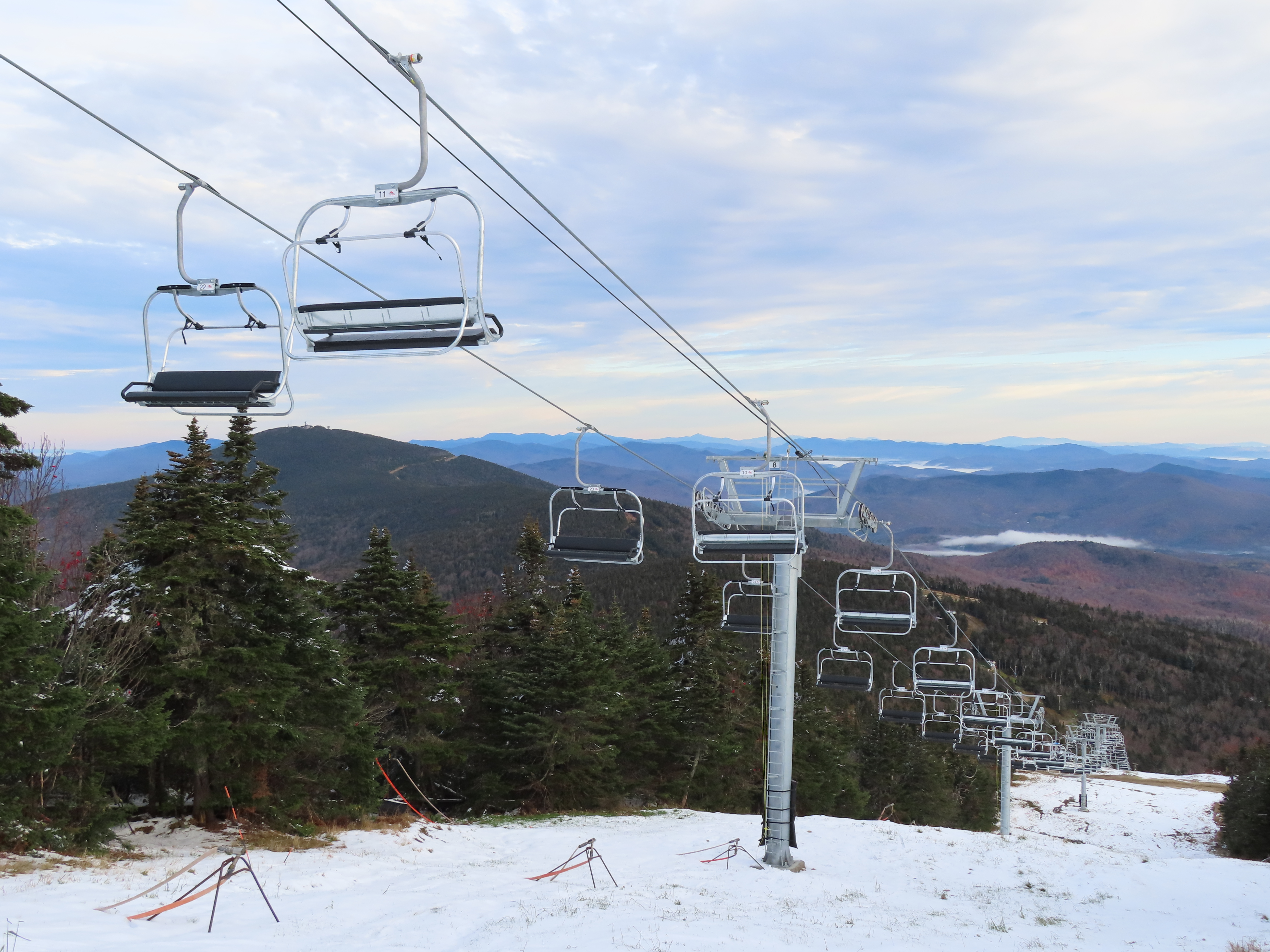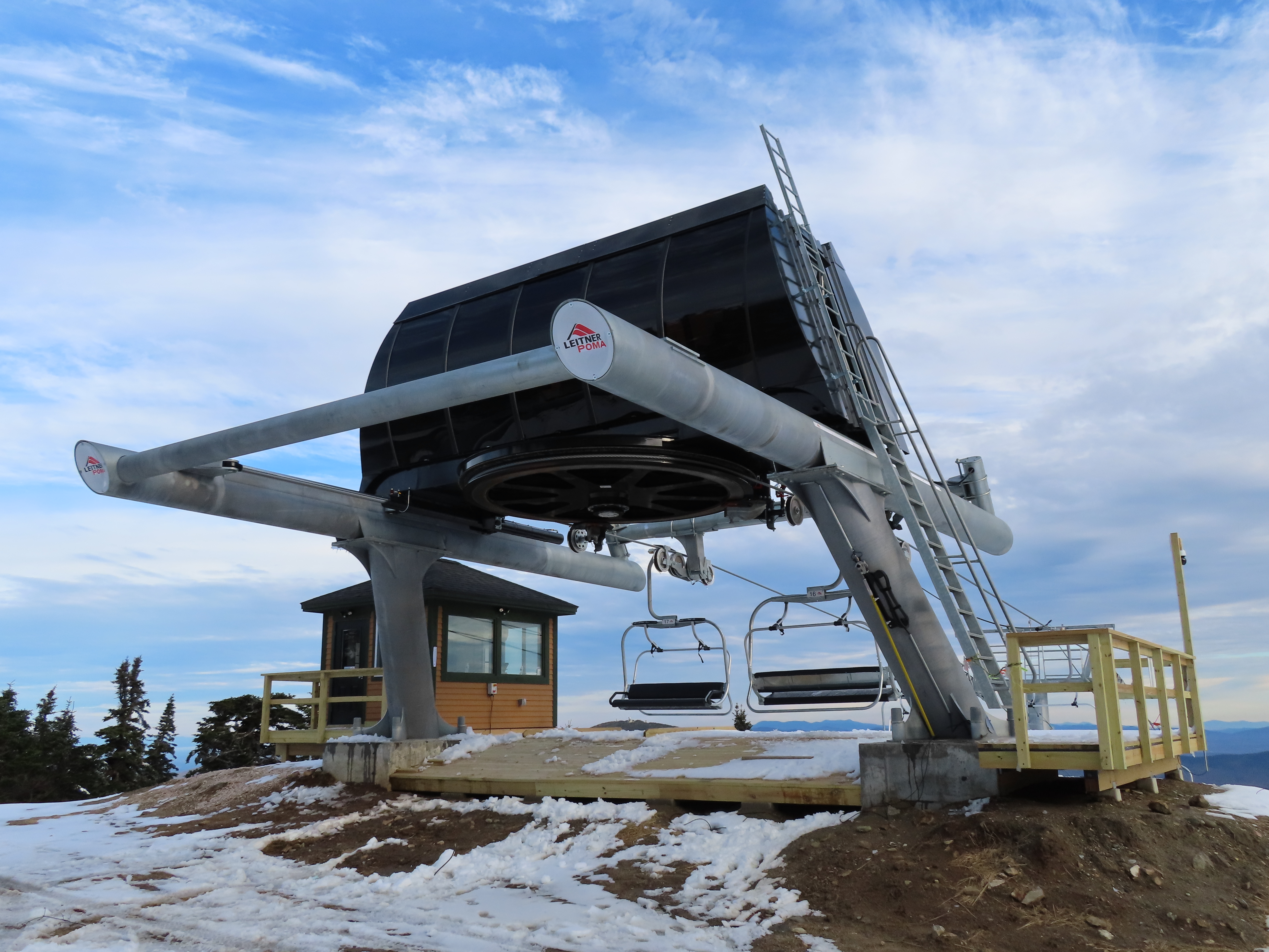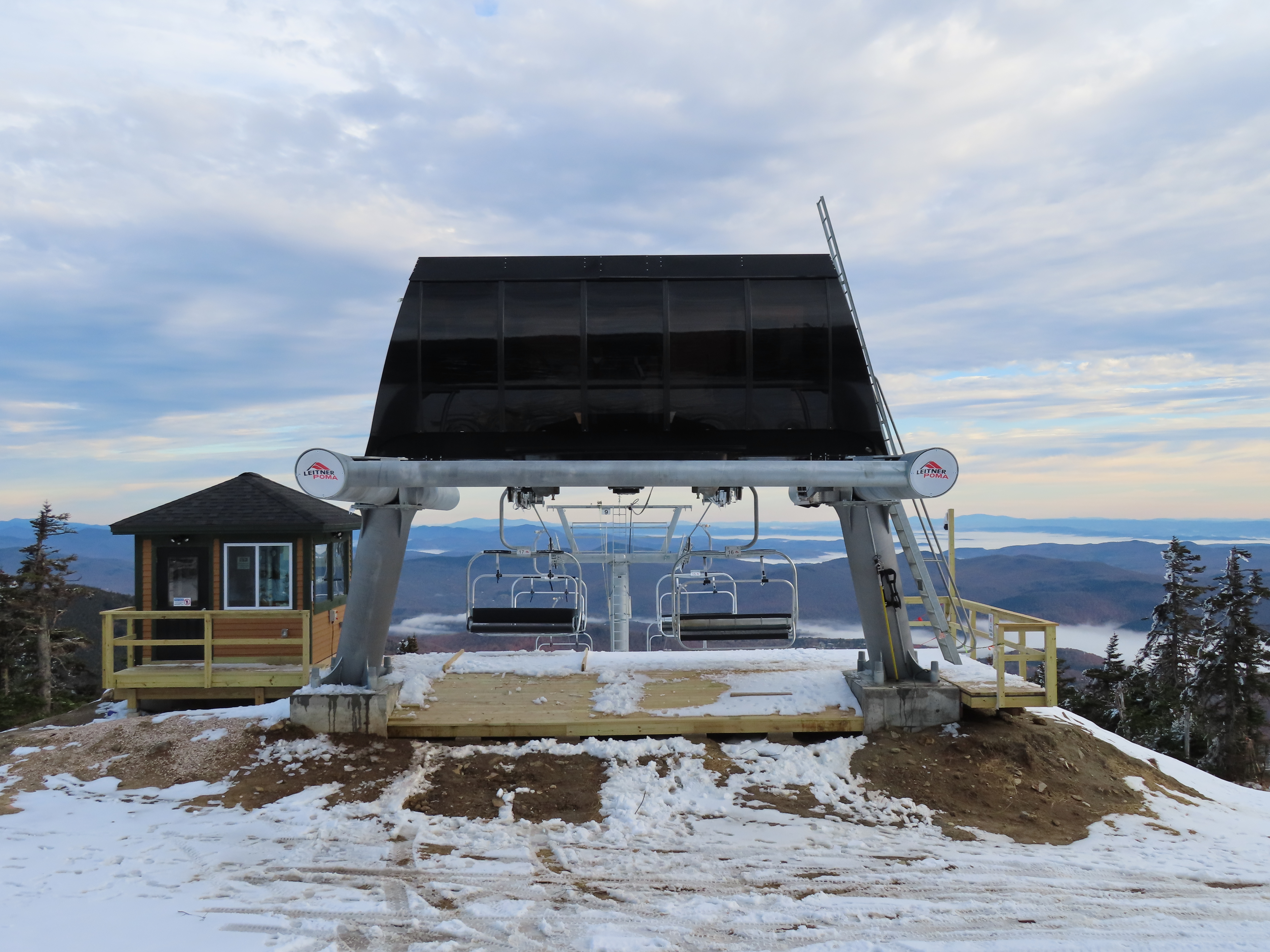 This Leitner-Poma quad replaced a Heron-Poma triple in 2019.Loading area shortly after the lift was load tested.View up the first half of the lift line.Tower 1 and closely-spaced Omega chairs.View down the line at tower 2.This lift is typically the first or second to open in the Eastern United States each season.The first part of the line is the steepest.Near the top station.View down near the summit.The top station is a Leitner-Poma Alpha drive/tension model.Looking down from the unload point.A quad chair.Drive bullwheel and tensioning system.The top terminal.Another view of the drive station.Lift line overview.Upper station and motor room.View up at tower 6.A chair at T4.Lift overview.Leitner-Poma Z model station.Upper part of the line seen from Snowden.The entire lift line.