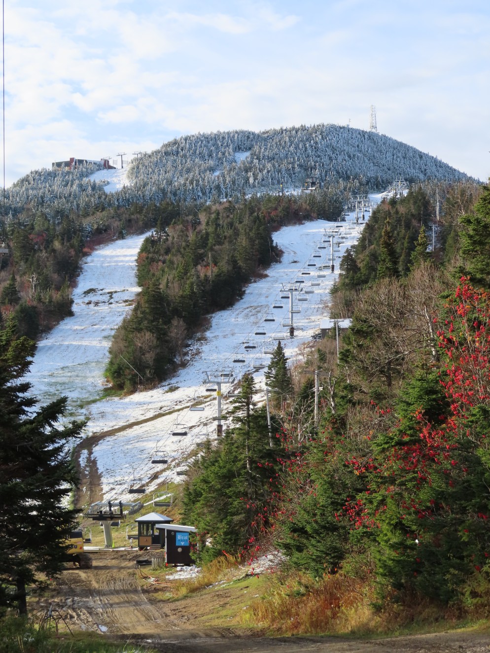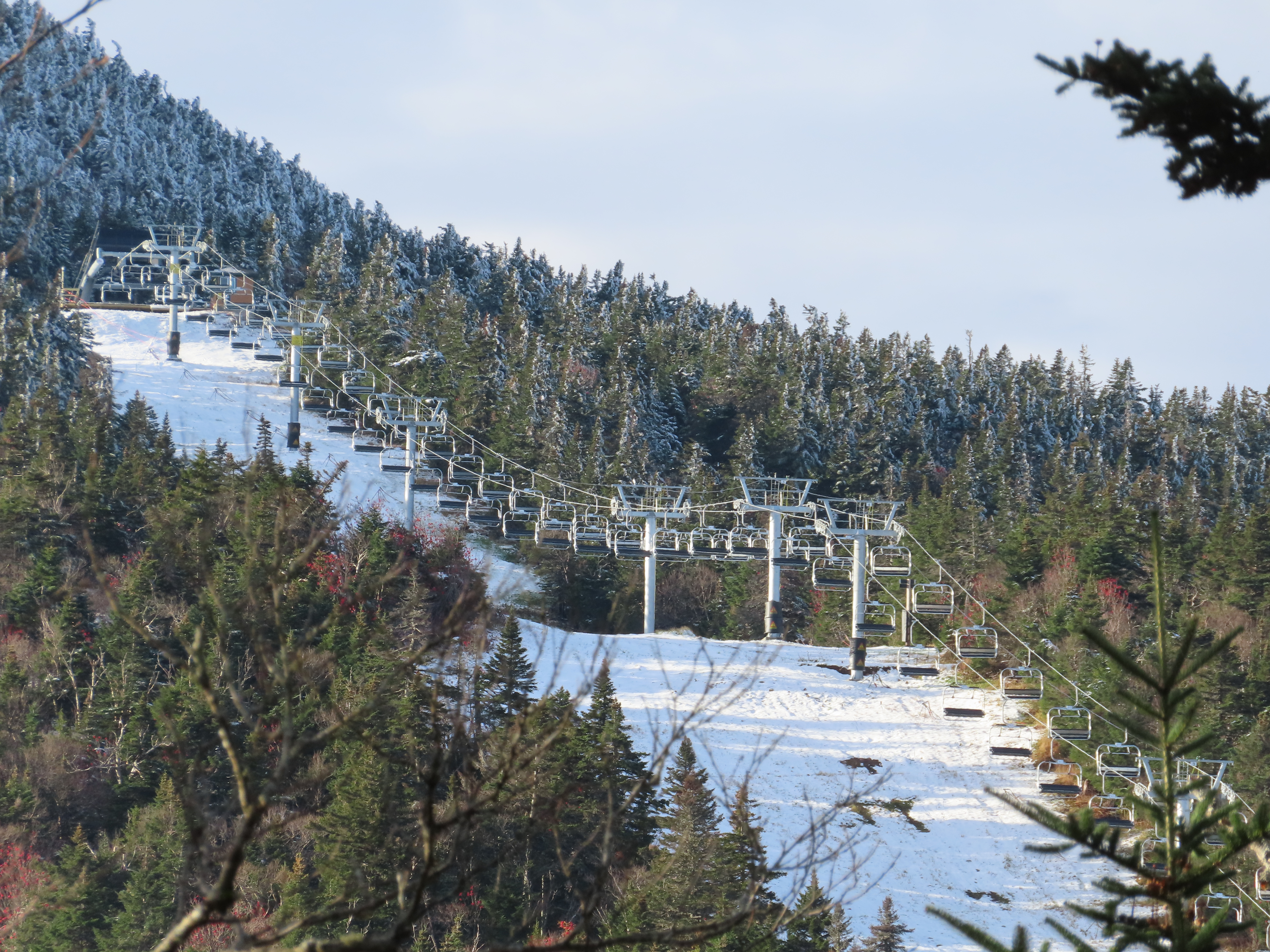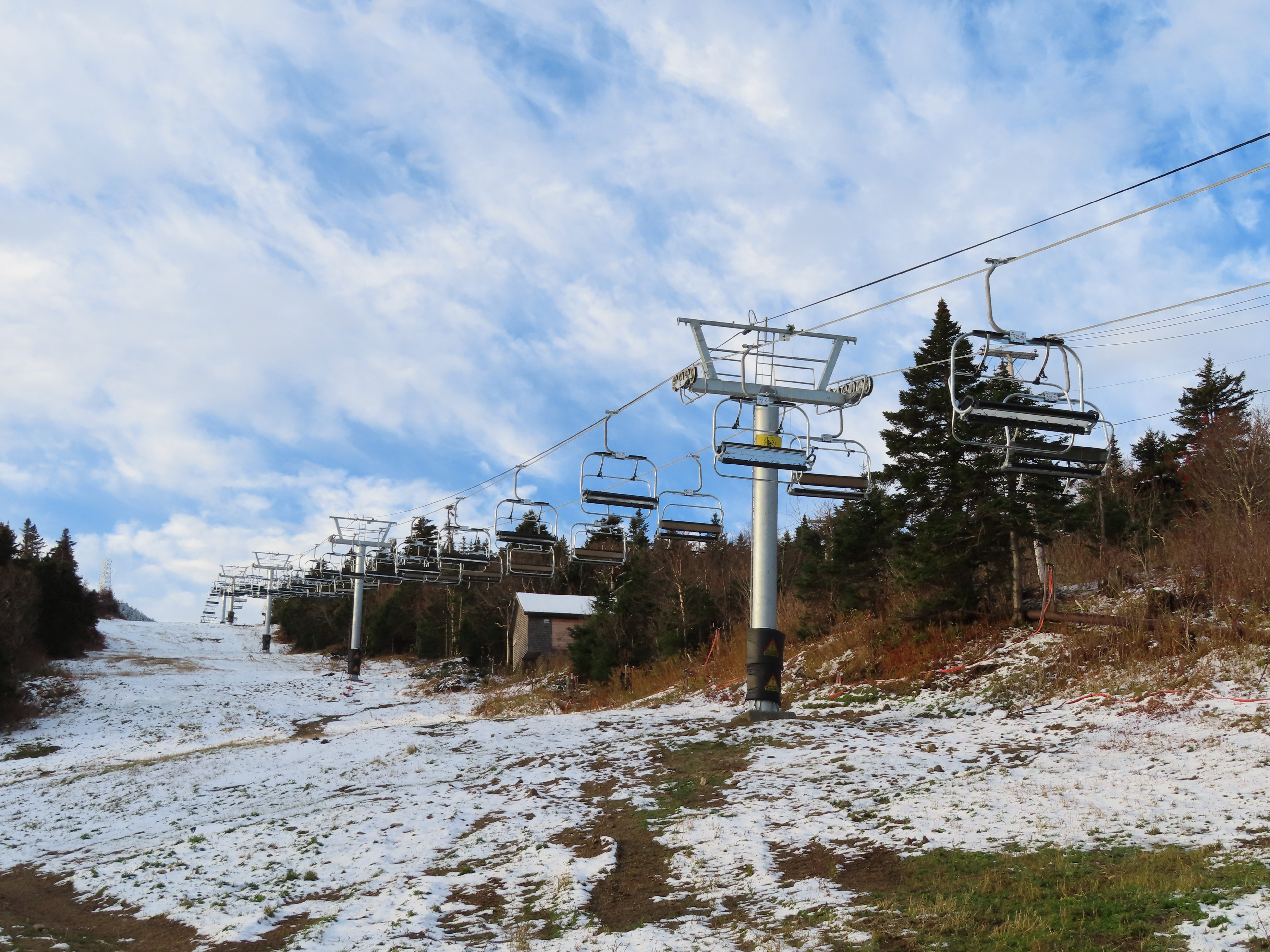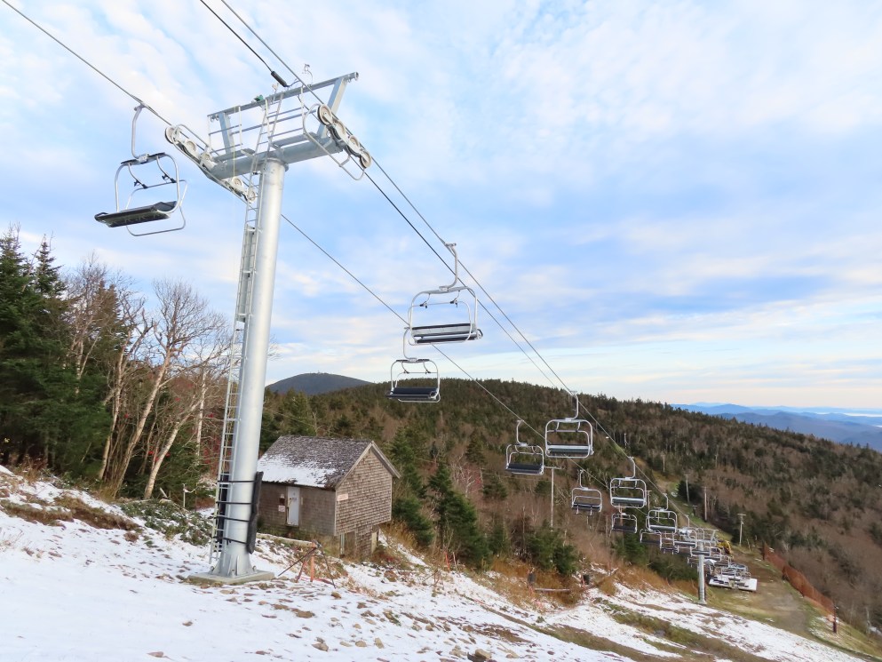 This Leitner-Poma quad replaced a Heron-Poma triple in 2019.Loading area shortly after the lift was load tested.View up the first half of the lift line.Tower 1 and closely-spaced Omega chairs.View down the line at tower 2.This lift is typically the first or second to open in the Eastern United States each season.The first part of the line is the steepest.Near the top station.View down near the summit.The top station is a Leitner-Poma Alpha drive/tension model.Looking down from the unload point.A quad chair.Drive bullwheel and tensioning system.The top terminal.Another view of the drive station.Lift line overview.Upper station and motor room.View up at tower 6.A chair at T4.Lift overview.Leitner-Poma Z model station.Upper part of the line seen from Snowden.The entire lift line.