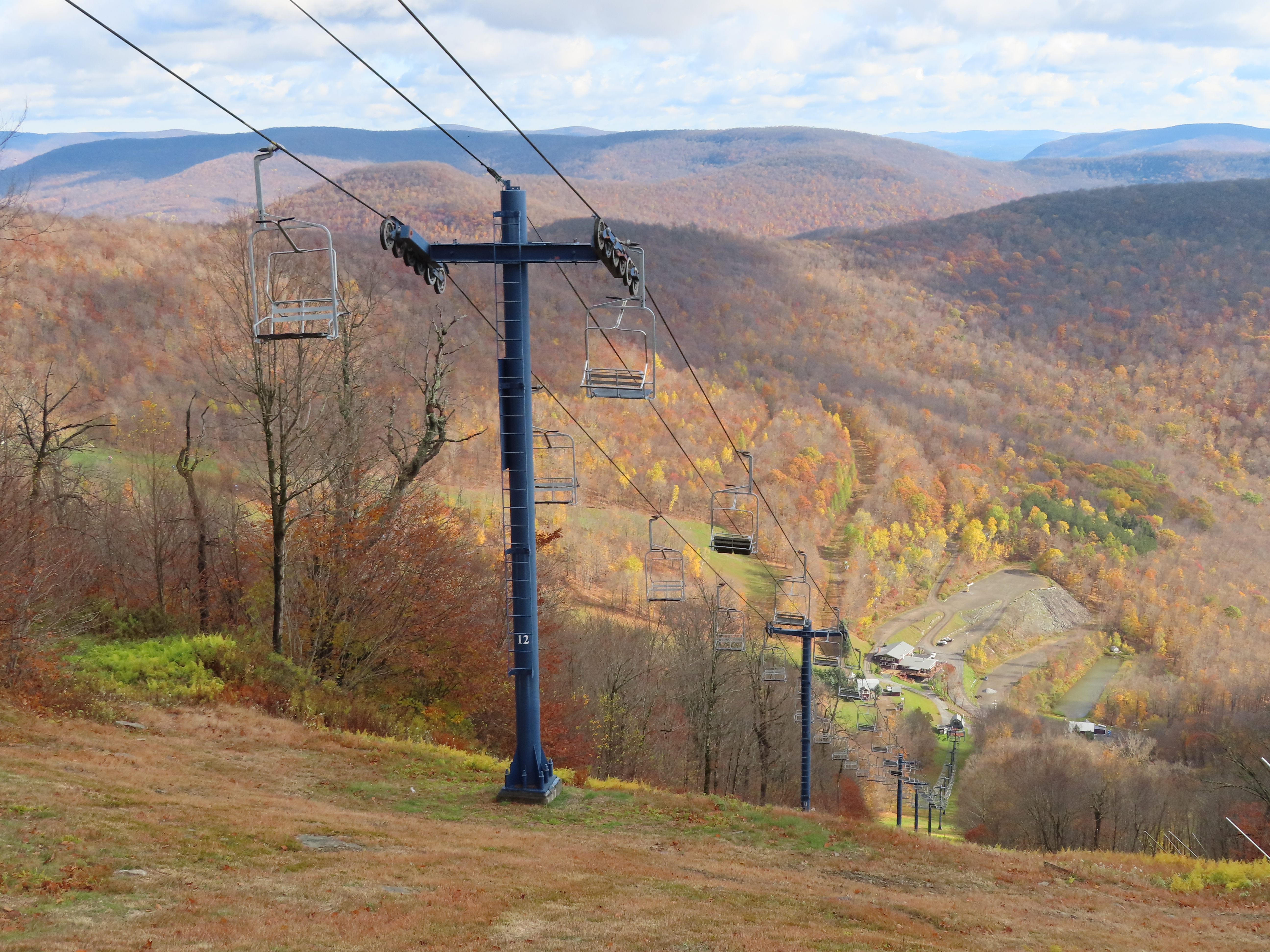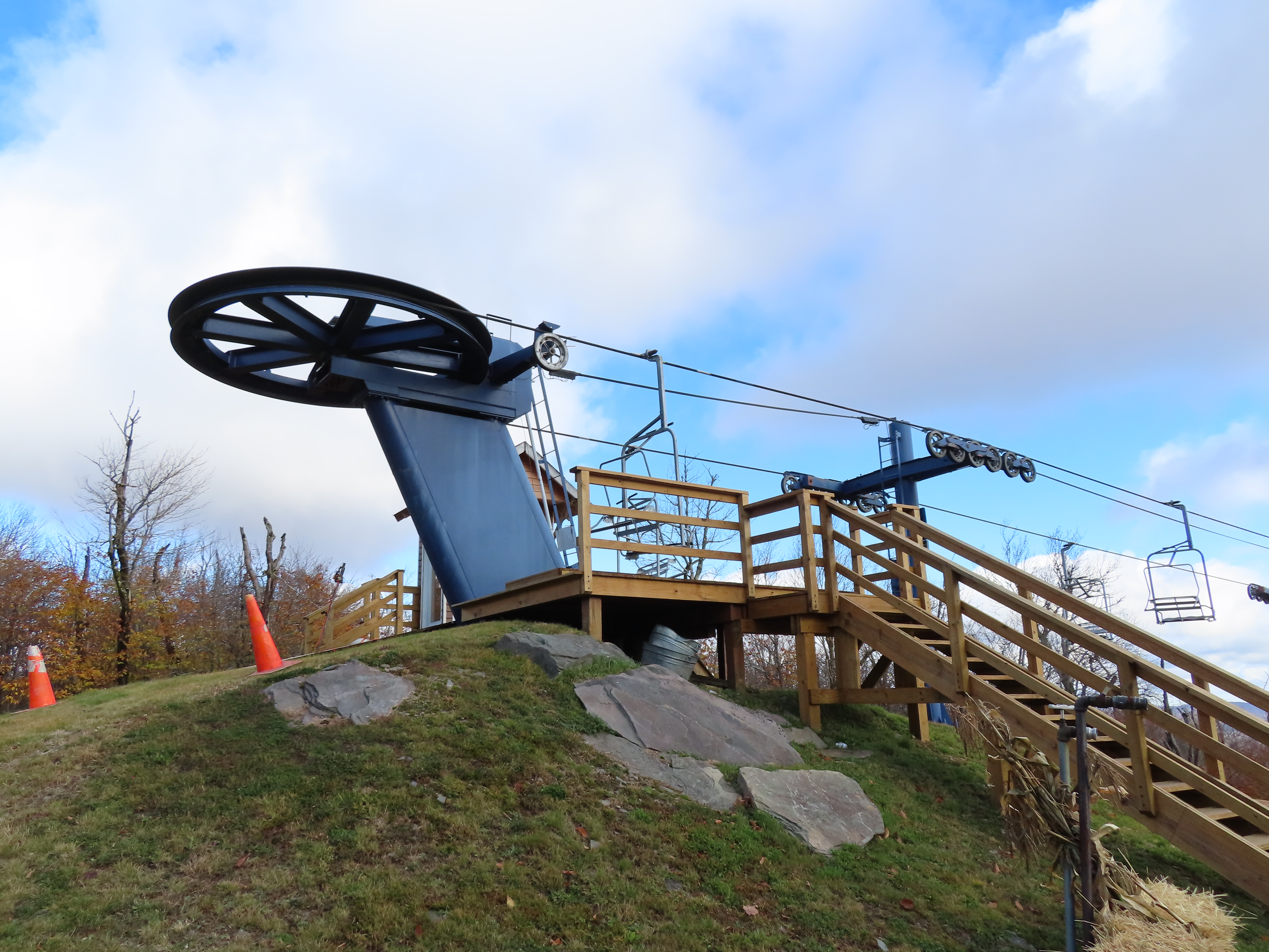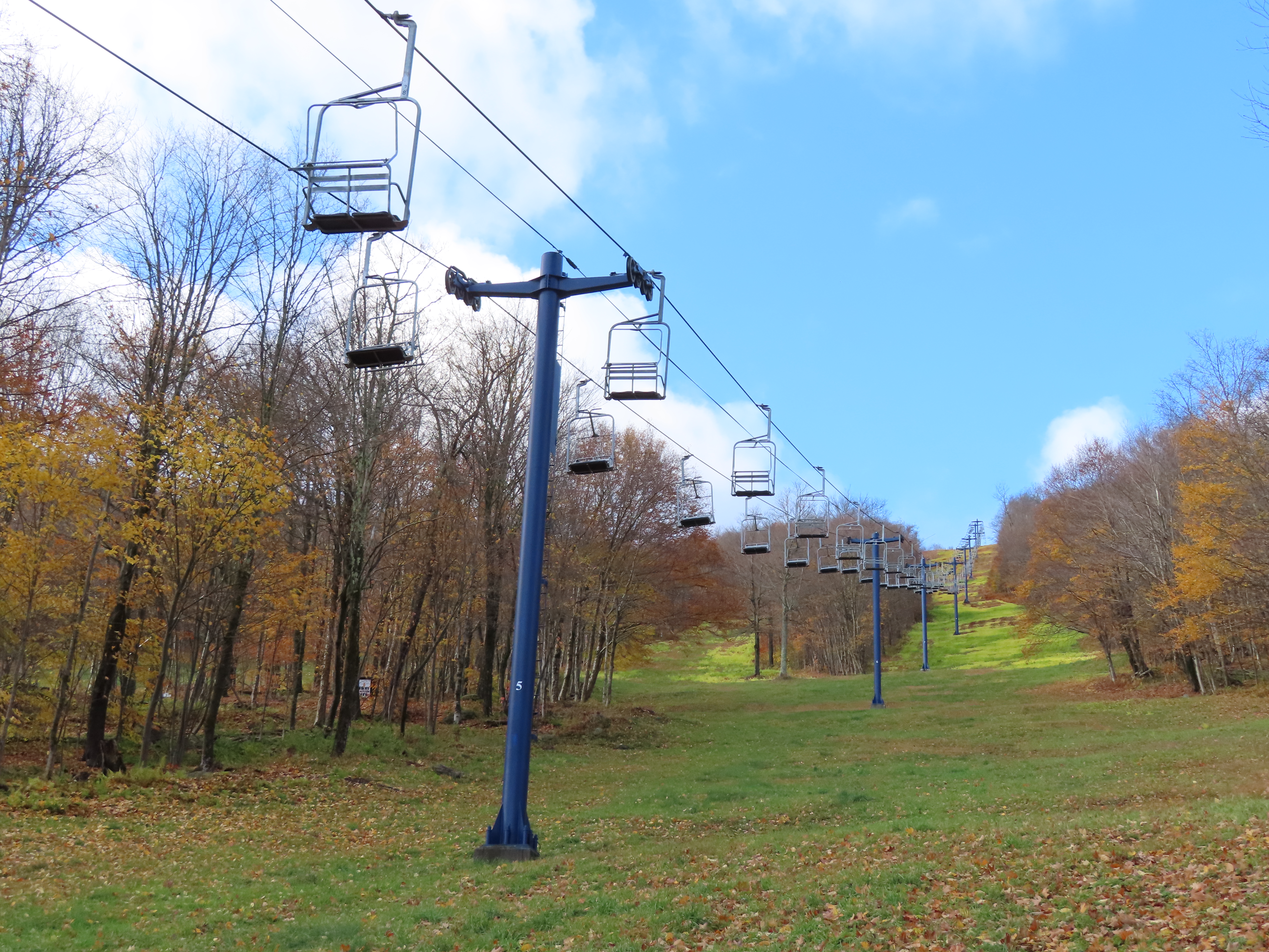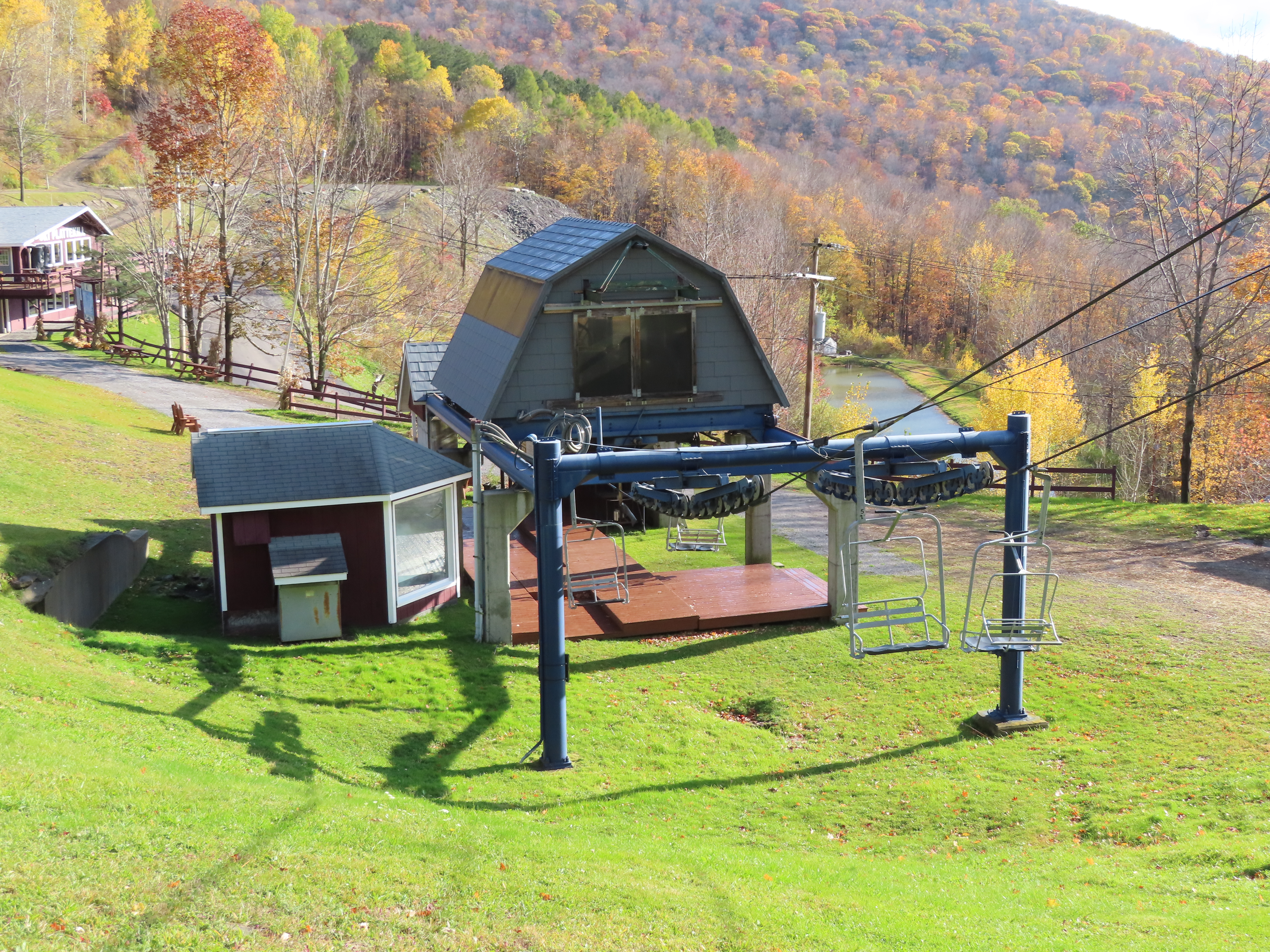 This Hall double came used from nearby Belleayre and replaced a T-Bar.Side view of the bottom terminal.Portal tower 1.View up the steep lift line.The first few towers.Middle lift line.View down.Upper lift line.View from tower 12.Breakover towers below the summit.Top bullwheel setup for summer operations.Unloading area.