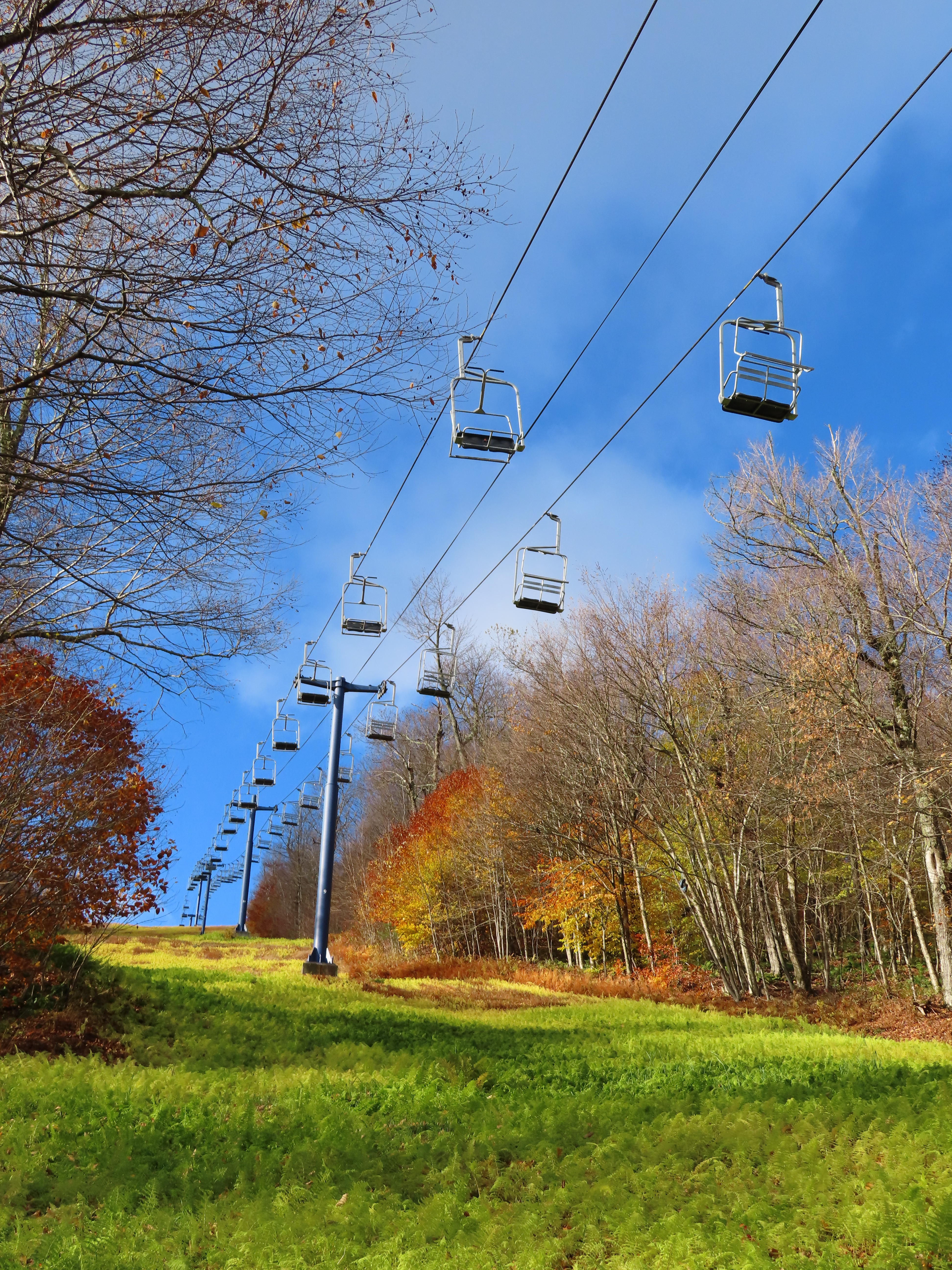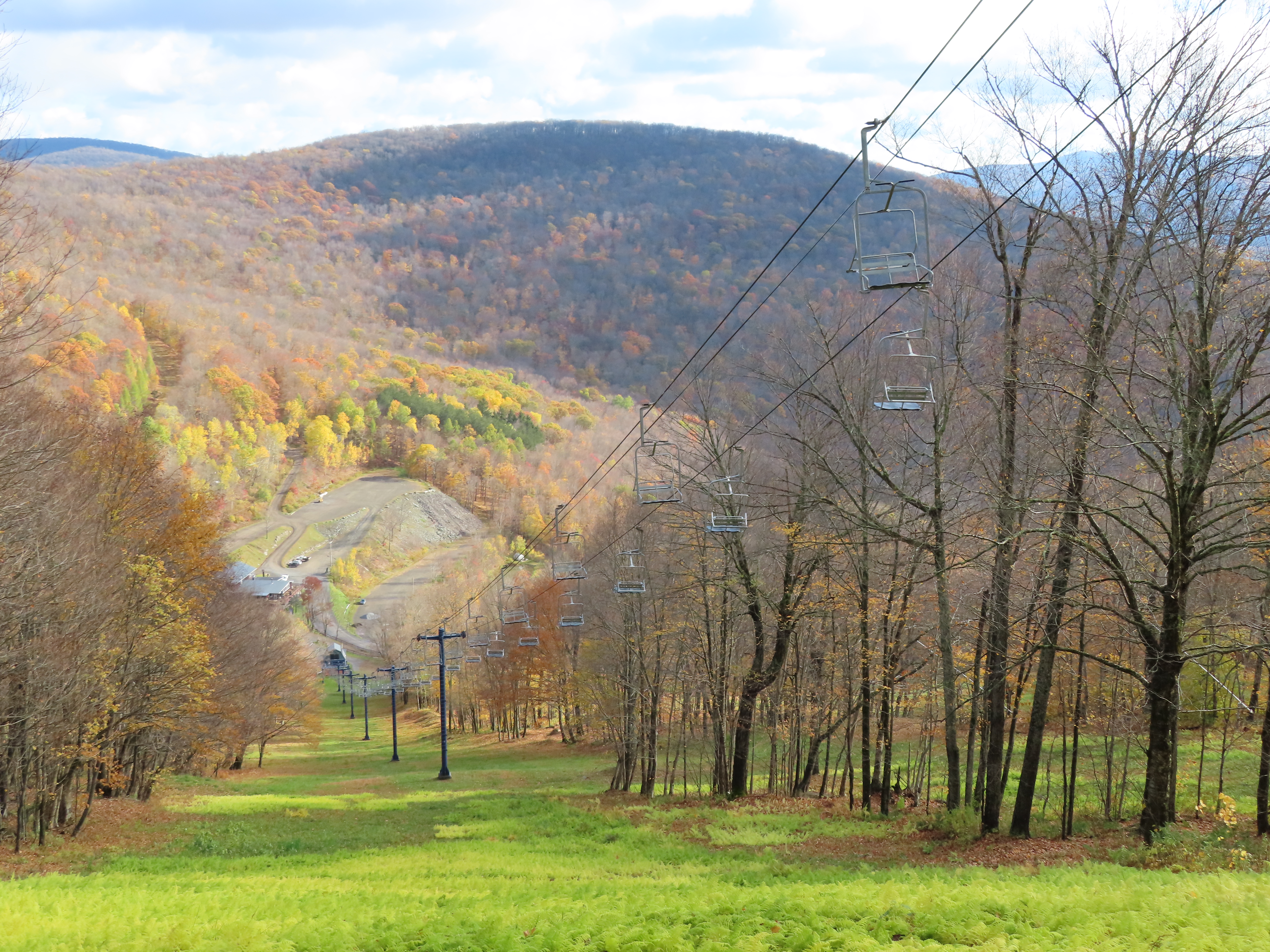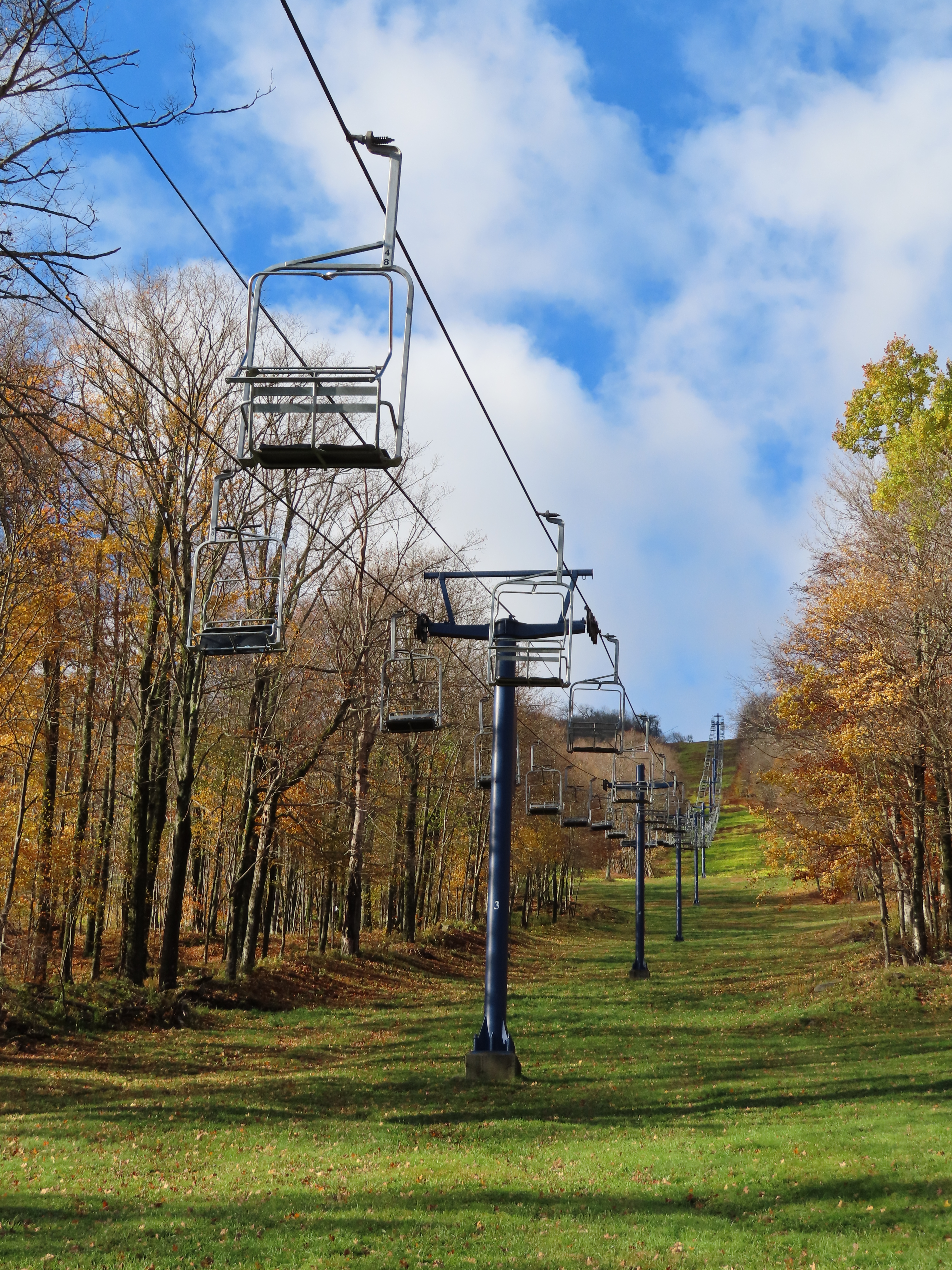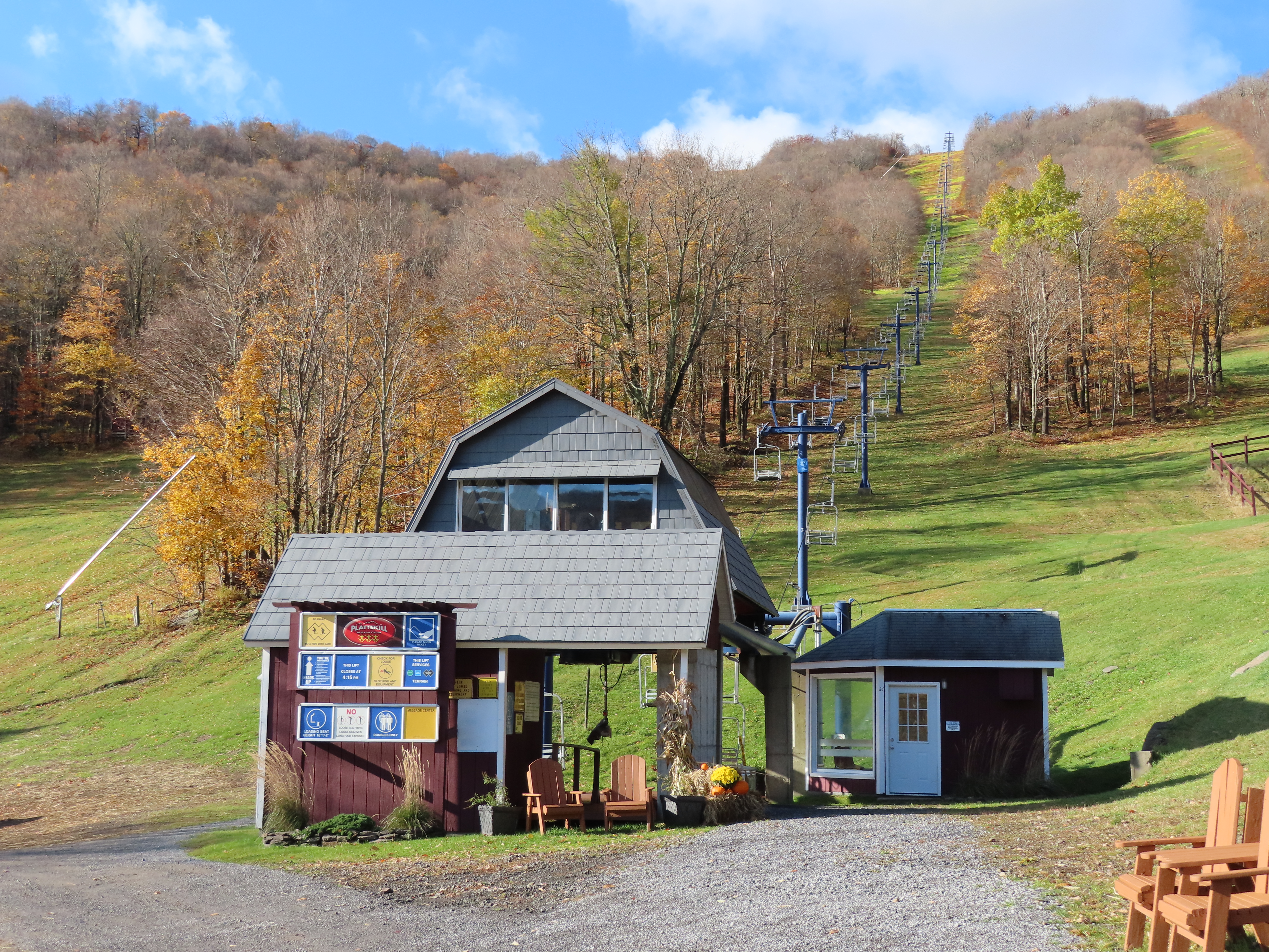 This Hall double came used from nearby Belleayre and replaced a T-Bar.Side view of the bottom terminal.Portal tower 1.View up the steep lift line.The first few towers.Middle lift line.View down.Upper lift line.View from tower 12.Breakover towers below the summit.Top bullwheel setup for summer operations.Unloading area.